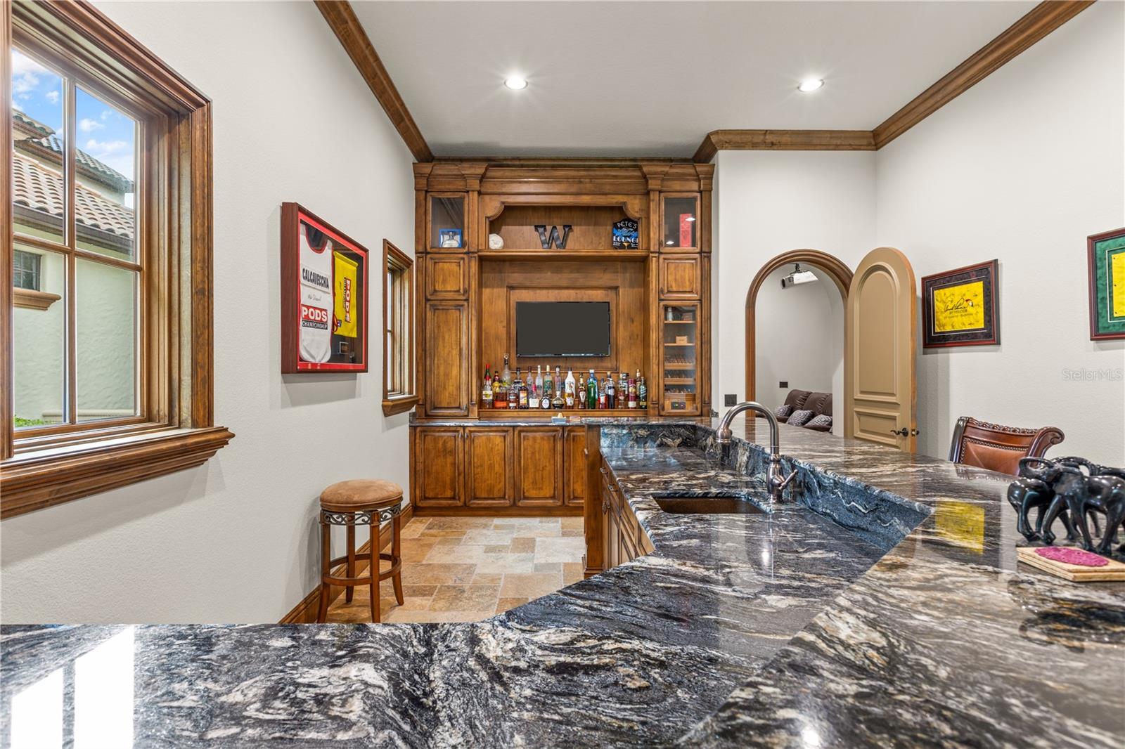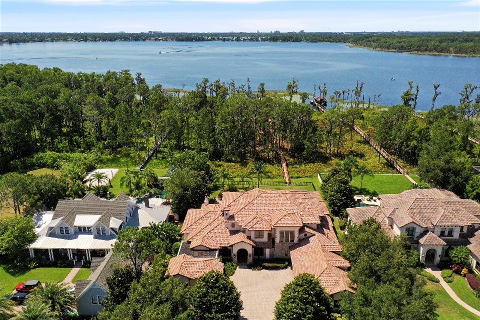 BEST BUY ON THE BUTLER CHAIN OF LAKES!! Rarely do you find VALUE and LUXURY in one place! At $479 a sq ft, this extraordinary J.RICHARD WATSON custom-built LAKEFRONT estate provides both VALUE and LUXURY + PLUS fantastic location within the guard gated golf course community of Keene's Pointe in Windermere, Florida. The Estate sparkles with fresh interior and exterior paint and all new LED lights throughout the home which accent the custom woodworking, cast stone trim, warm chisel edged travertine and hard wood floors throughout. Impeccably maintained by original owners, the estate features 6 Oversized ENSUITE Bedrooms, first floor home theatre, game room and study, plus TWO upstairs bonus rooms. As you step through the solid mahogany double entry doors, your eyes are drawn to the huge picture window with views of the large open pool, big backyard and lakefront beyond. The main floor hosts the primary retreat, a guest bedroom suite, an oversized living room, classic study with wood inlaid ceiling, dining room with hospitality bar, a custom built wine cellar, and vast kitchen-family room combination. The main floor seamlessly flows into an expansive game room and home theater, with panoramic views of this sprawling 2-acre property located on Lake Tibet Butler, the second largest of the highly sought after Butler Chain of Lakes. To the front of the home you can enjoy complete privacy as you gaze upon a beautiful pond with lighted fountain which adds the perfect ambiance to this serene location. Ascending the wide wooden staircase to the second floor, the soaring wood-inlaid ceilings, reaching heights of 30+ feet, captivate the senses. The upstairs gathering room which opens to a balcony serves as the focal point of the second floor, surrounded by FOUR huge ENSUITE bedrooms, each offering privacy and luxury. A mid-level bonus room provides versatile space for various purposes, adding another layer of flexibility to this exceptional residence! The exterior, bathed in the radiant glow of sunshine, mirrors the warmth within, with an impressively large outdoor living space that can be screen enclosed at the touch of a button. A deluxe summer kitchen and entertainment area, complete with a fireplace and walk-up bar, make this outdoor haven perfect for socializing. The south-facing open pool brings an abundance of light into the home throughout the day! A fully fenced yard, and boardwalk invites a scenic nature stroll down to the dock and covered boathouse on Lake Tibet Butler. Other unique amenities of this home include a full 3-car garage PLUS a detached single car garage currently modified as a personal gym with space sectioned off for golf cart parking. It also has an electric car charging station conveniently built in. This single garage is connected to the primary retreat through a private open courtyard with hot tub, fireplace and sauna for the owner’s exclusive use. With endless possibilities and a design that invites many interpretations, this amazing floor plan must be seen in person to be fully appreciated. Come, tour, and let your dreams find your forever home in this impressive Tuscan-inspired Estate built by Master Custom Builder, J. Richard Watson, one of top premier builders in the area, renown for his exceptional quality construction and design.