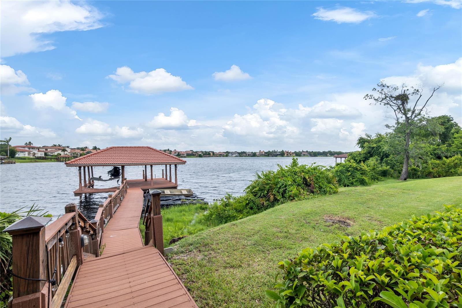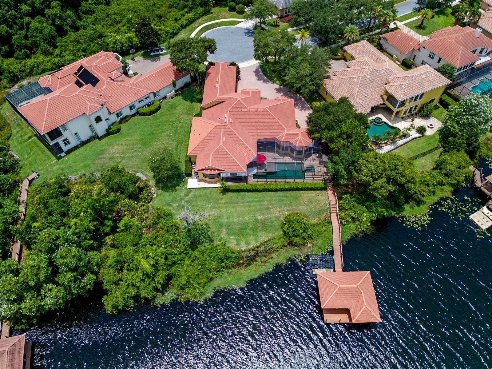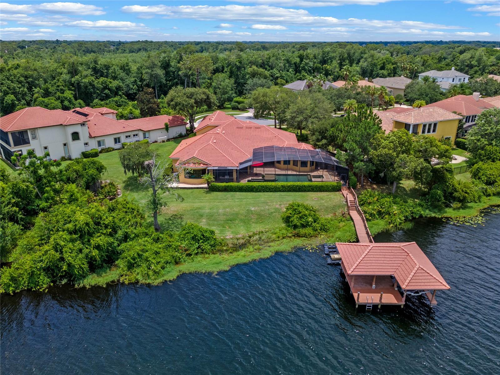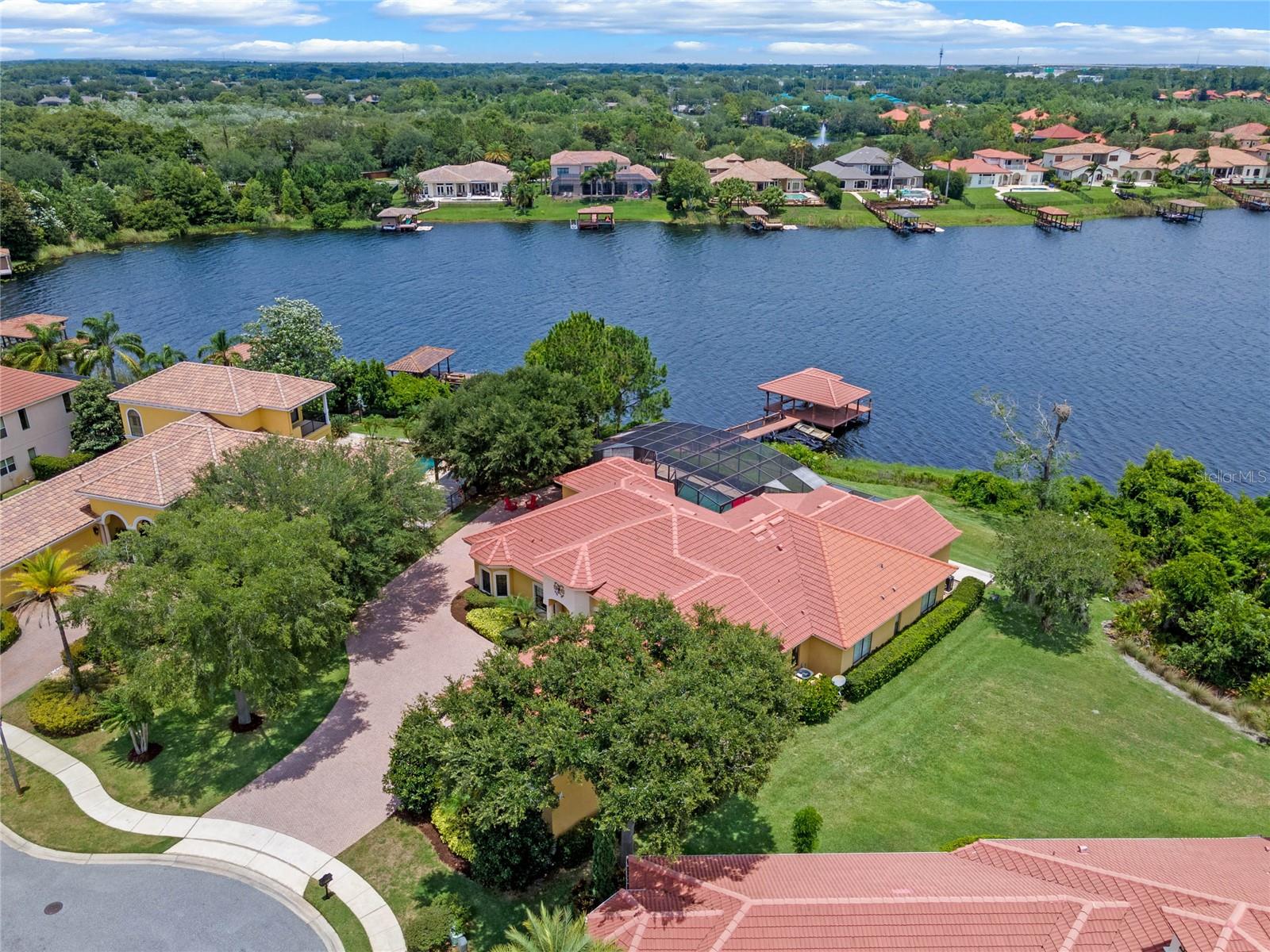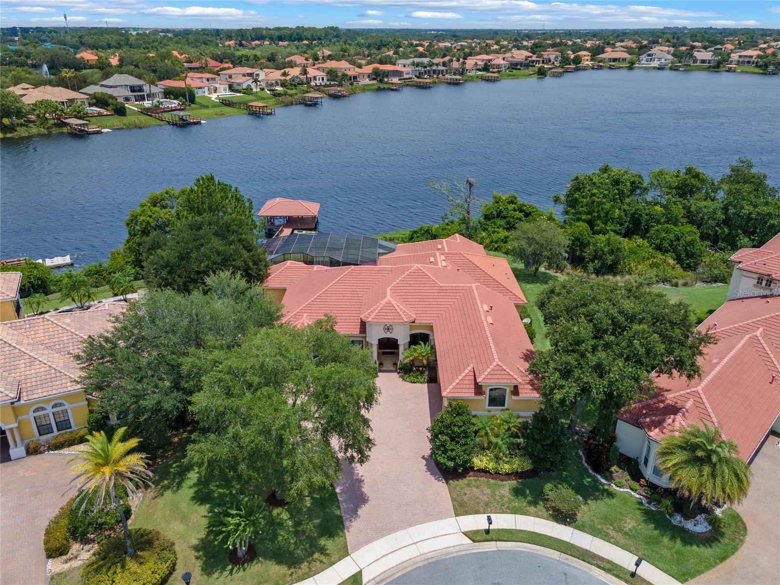 Luxurious Lakefront Oasis with Private Pool and Spa in Exclusive Windermere Community. Nestled within the prestigious gates of the Reserve at Belmere, this masterfully crafted Arthur Rutenberg estate graces the shimmering shores of Lake Whitney. Indulge in breathtaking sunsets from your own private retreat, complete with direct lake access, a private boat dock, and an expansive pool and spa designed for unparalleled relaxation, perfect for entertaining or serene Florida living, this home redefines sophistication and leisure in the heart of Windermere. As you approach this custom-designed home, you are welcomed by tropical landscaping, a durable and stylish tile roof, an expansive driveway, and a prime cul-de-sac location, offering both privacy and curb appeal. Step through the stately double front doors and into a grand marble foyer, where rich dark wood flooring and a stunning panorama of Lake Whitney immediately captivate your senses. Beyond the front office, the formal dining room, and the living room, an expansive and beautifully designed family living area awaits, seamlessly blending comfort with luxury. The gourmet kitchen is a masterpiece of design and functionality, featuring 42-inch custom cabinetry, gleaming granite countertops, and a suite of premium GE Monogram Stainless Steel Appliances, including a double oven, warming drawer, and a Wolf gas cooktop complemented by a Sub-Zero refrigerator. The backsplash adds a touch of artistry, while a wine refrigerator, expansive island with built-in storage, and elegant pendant lighting elevate the space. Adjacent, is a breakfast nook that offers unobstructed lake views. The family room showcases a blend of functionality and style, with custom-built cabinetry, tray ceiling, and 2 full walls of glass sliders that frame breathtaking views of the lake and provide seamless access to the outdoor living area. The screened lanai offers a spacious pool and spa, complemented by a summer kitchen featuring a natural gas grill, sink, and a wood-paneled ceiling—ideal for both grilling and relaxation. A pavered pathway leads to the private covered boat dock, which includes a tile roof and two jet ski pads, providing easy access to the water. Back inside, you’ll discover a game room/flex space with rich dark wood beam ceilings, and an expansive picture window that offers stunning lake views. The owner’s suite features a cozy sitting area, tray ceilings, and access to an adjoining private exercise room/office. The suite’s luxurious en-suite bathroom includes an island, garden tub, dbl vanity, and two spacious walk-in closets with custom shelving. Two of the secondary bedrooms are thoughtfully designed with separate adjacent rooms, perfect for creating personal spaces such as desks, reading areas, or vanity. Upstairs, you'll find a bonus room complete with a full bathroom, providing a flexible space for various uses. Additional highlights include crown molding, exquisite custom woodwork throughout, a central vacuum system, resurfaced and sealed pavers, and 3 A/C units (2 recently replaced units).The Reserve at Belmere offers guard gated access, a gym, tennis/basketball/volleyball courts, playground, fishing pier - plus A-rated schools. In addition to its picturesque topography, Lake Whitney offers stable water levels throughout both heavy rain and dry seasons with a depth ranging from 30 feet in the middle to 4 – 6 feet on its edges. Must see to appreciate the attention to detail on this custom home!