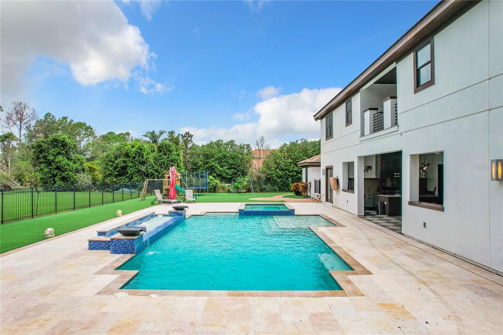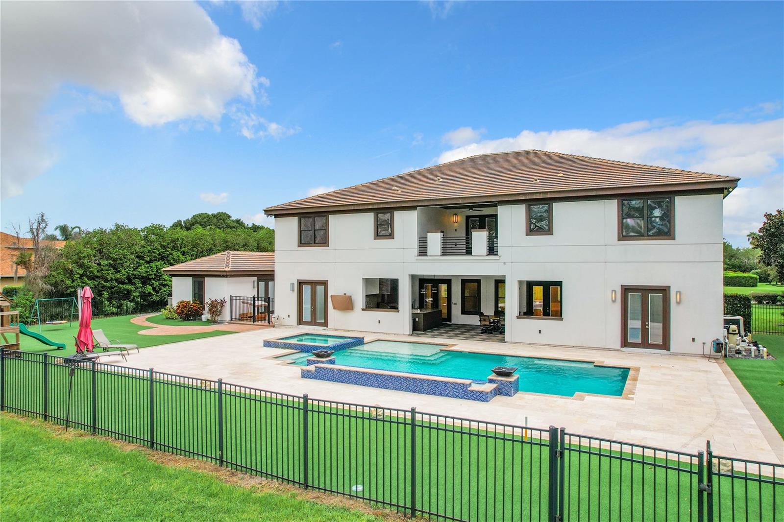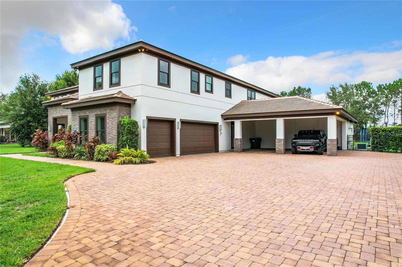 An beautiful and luxury house on a one acre lot in exclusive Lake Cawood Estates in a quiet and convenient small community in Windermere. Built from ICF insulated concrete blocks for superior energy efficiency and hurricane protection with foam roof insulation, barrel tile roof and $25k whole house generator included. Built in 2017, this home features the latest in technology and designer trends-whole house zoned audio system, multi point camera security system, 4 tankless energy efficient hot water heaters, three top of the line American Standard a/c units, designer light fixtures, wood plank effect ceramic tile flooring to all common areas, luxury bathrooms to ALL bedrooms. Triple attached garage and attached carport for plenty of parking spaces and storage. The huge block paved driveway at the front of home leaves plenty of space for guests too. The home features multiple living spaces-the formal sitting room to the front of house with faux fireplace, the large family room that acts as the hub of the home and den off the kitchen as an ideal informal hang out or playroom. The formal dining room features a custom ceiling with LED lights, silver tile feature wall and plenty of space to seat 12 in comfort. Butler’s pantry just off the dining room has sink, beverage fridge and cabinets. The kitchen is a chef’s dream with GE Monogram appliances throughout including a built-in pizza oven, two dishwashers, gas range and electric double wall oven. Huge kitchen island with waterfall edge granite worktop. The informal breakfast area has a custom table with matching granite top included in the sale. Large walk-in pantry with separate ‘mud room’ with dual beverage fridges, washer and dryer and ample storage as well as access to carport. All 6 bedrooms have private baths, walk-in closets-Two bedrooms have custom closets by California Closets. Large guest suite downstairs with direct pool access, all other bedrooms upstairs. Multipurpose room also features its own bathroom upstairs. Huge loft area with bar including two refrigerators, dishwasher, ice machine, and sink is a great entertaining space. Access to the south balcony where you can view Disney fireworks from the comfort of your home. Second laundry room upstairs with washer, dryer, ample cabinets and Belfast sink. Outside the home really wows-A huge lanai houses a custom built summer kitchen with waterproof cabinets-48” DSC grill, separate teppanyaki cooking surface, multiple fridges including a beer tap, ice maker and so much more. Undercover dining space and seating area. Leading from the lanai is the fantastic pool, custom designed and built by well-respected Artisan Pools. Water feature powered by separate pump, LED lighting, separate raised spa. Top of the line electric and gas water heaters installed. Synthetic grass surrounds the pool area leading to fire pit patio. Separate gym / multipurpose room accessed via courtyard with rubber flooring and mirrored wall. The level acre lot affords a huge yard for anything you can dream of. Located less tha a mile from Publix and multiple restaurants the location cannot be beat and zoned for new Windermere High School. Too many features to mention in this beautiful home. Newly installed Gemstone permanent roofline lighting system. PERMANENT OUTDOOR YEAR - ROUND LIGHTING!