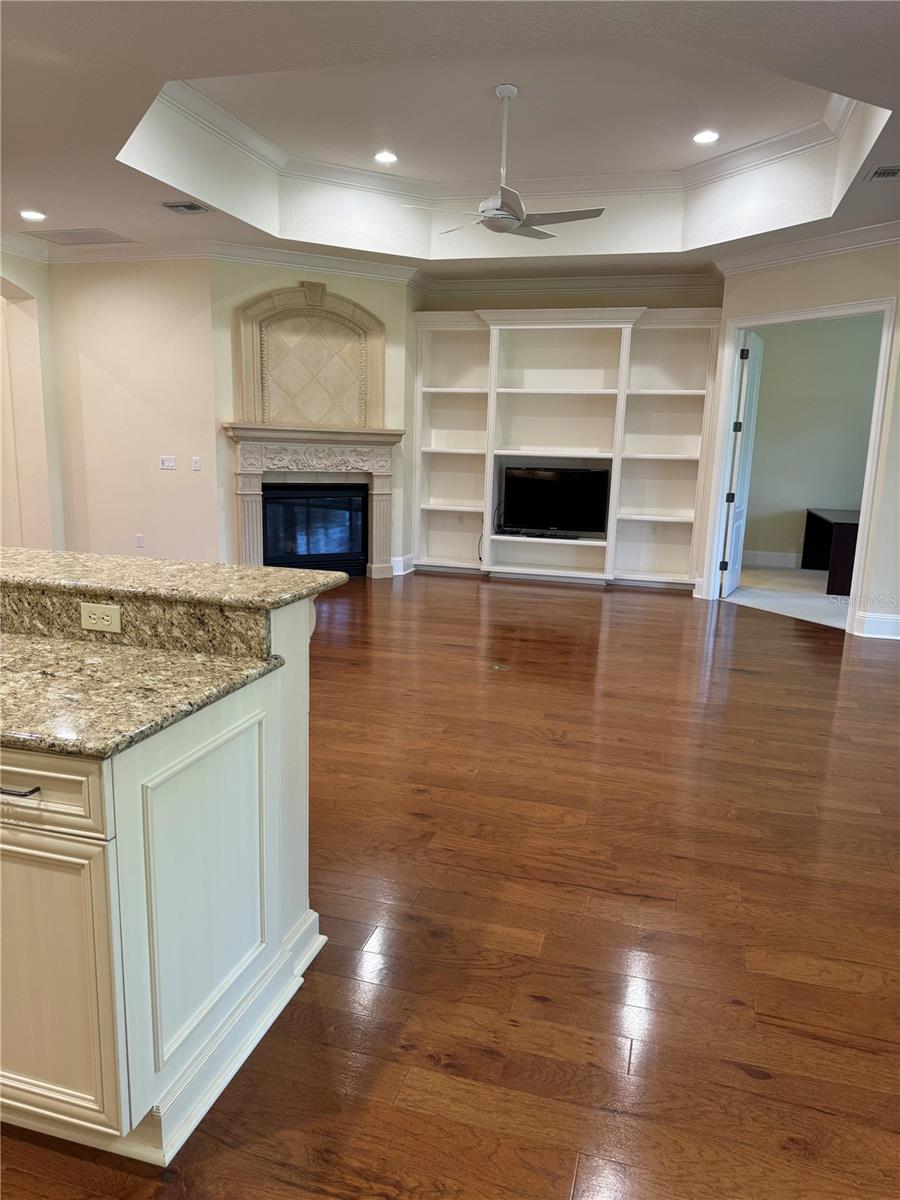 Welcome to this charming 3BR/3Bath Golf Villa located on the 14th tee box of the Jack Nicklaus Signature Golf Course at Keene's Pointe. Meticulously maintained by original owners, this home features a popular "Great Room" open floor plan along with home office a formal dining room and a 2 CAR garage with additional golf cart bay. Enjoy the golfing lifestyle in this desirable one story home designed to make your Florida living easy! As you step through the double glass front entry doors, your eyes are drawn to the beautiful warm oak wood floors as you step into the surprisingly spacious Great Room rotunda with impressive cathedral ceiling and vast green views of the spacious backyard and golf course beyond. Made all the cozier with the gorgeous cast stone fireplace anchoring this heart of the home, it connects effortlessly to the Kitchen with a large gathering area ideal for entertaining. Great storage space is afforded in this well equipped kitchen featuring stainless steel appliances and a huge walk in pantry. Enormous Primary Bedroom Suite and Bath area consume the north side of the home with the other two bedroom suites and office on the south side -- the ideal split bedroom concept made into perfection! This custom Golf Villa built by Osprey Custom Homes is situated on .41 acre lot, which is a rare find on the golf course.