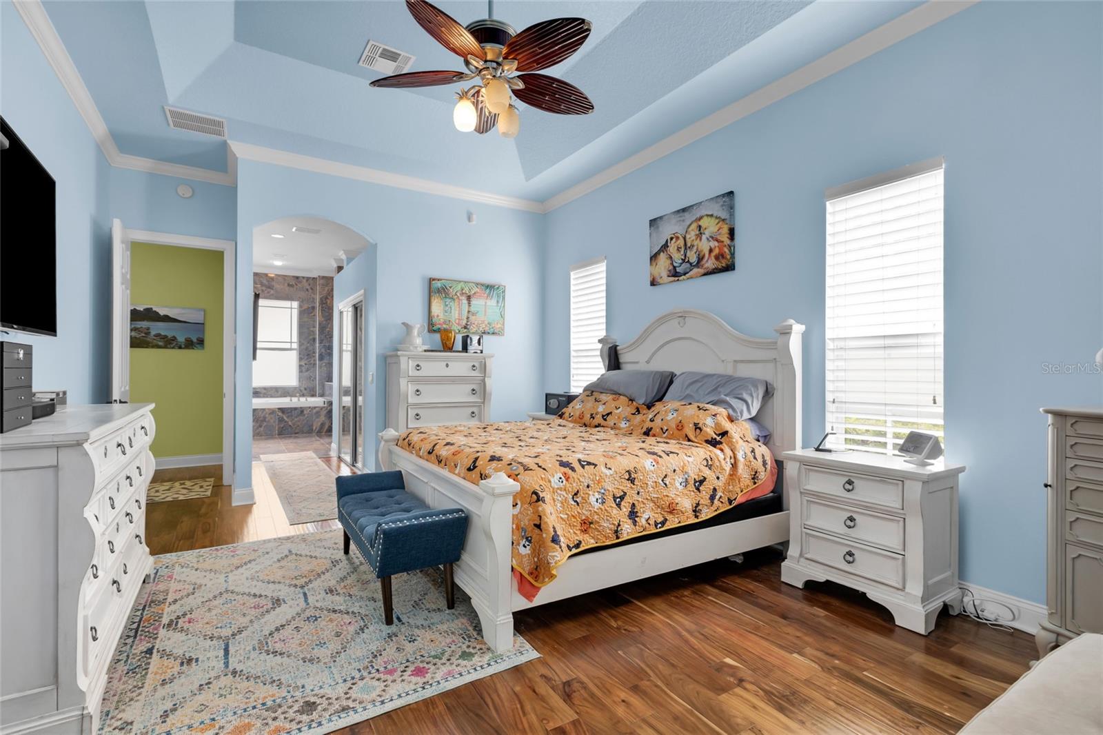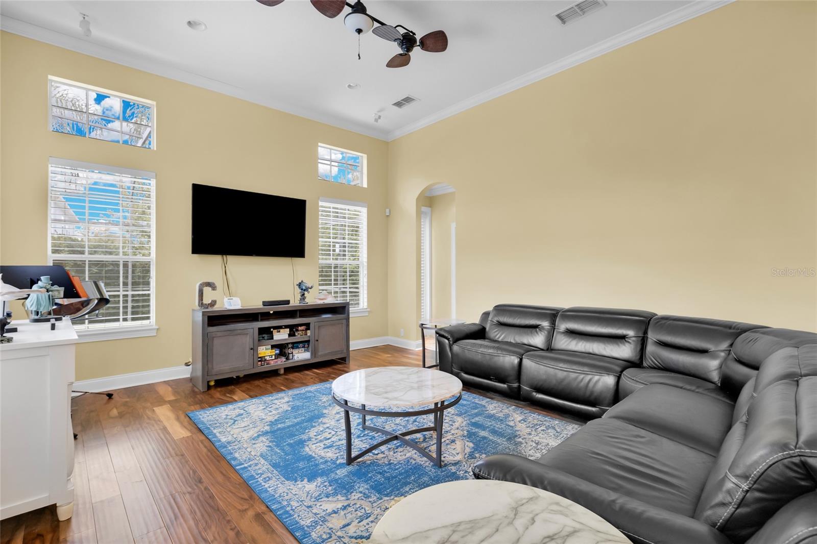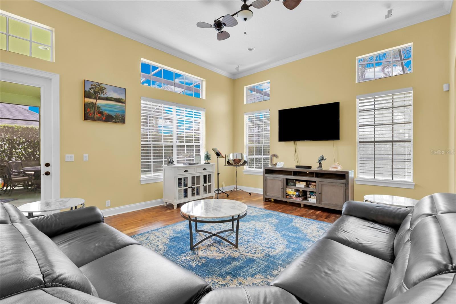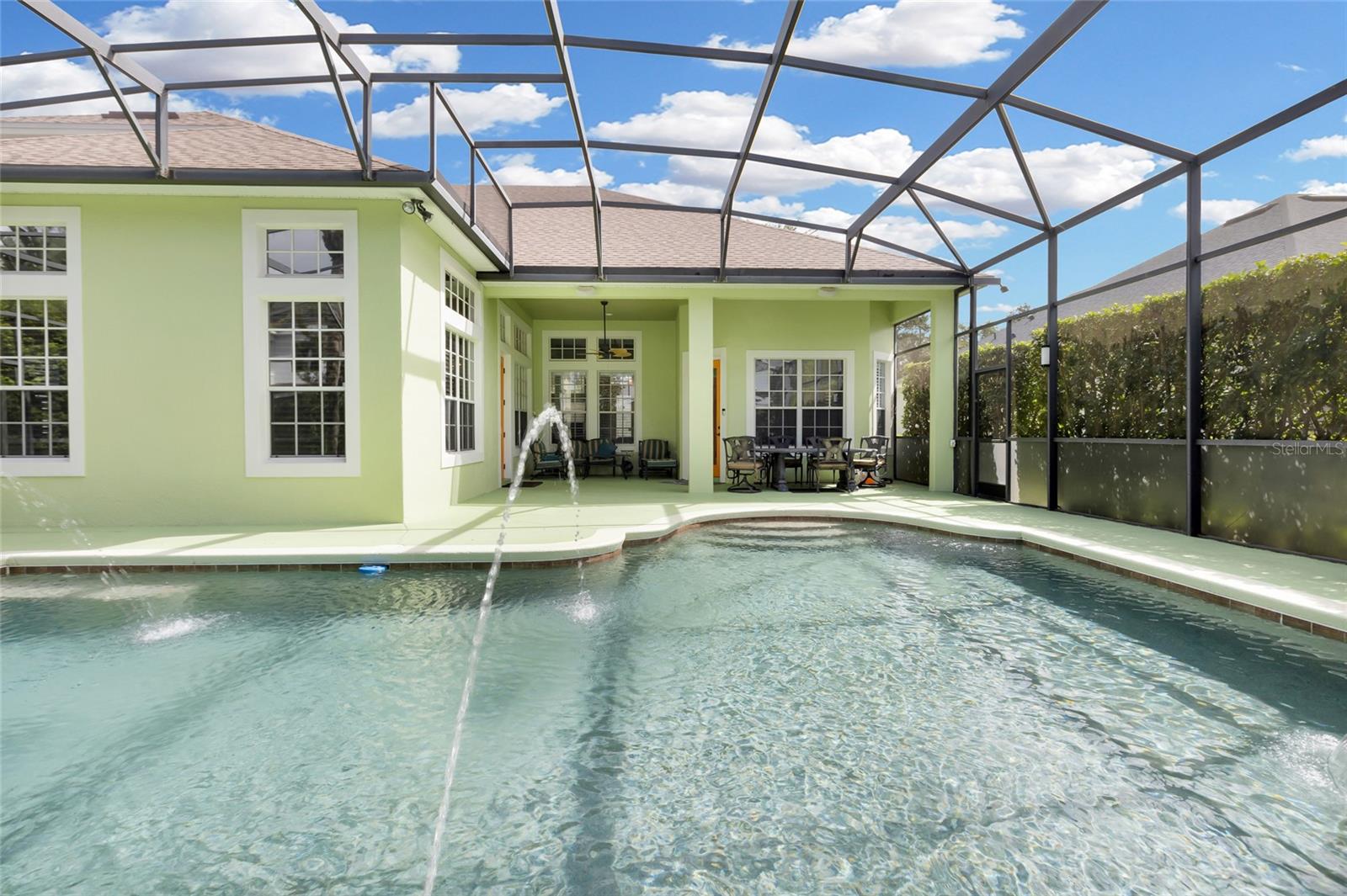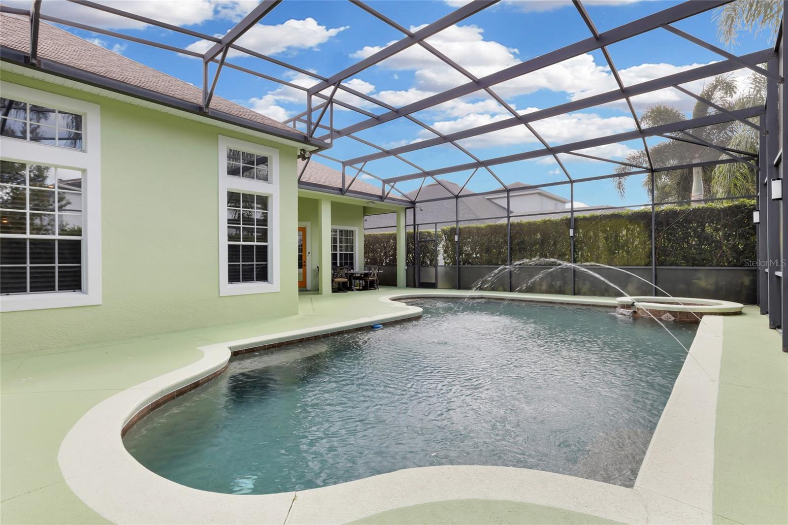 Keene's Pointe - Gated/24-hour attended community centered around The Golden Bear Club, an 18-hole golf course designed by Jack Nicklaus featuring golf, tennis, fitness, swimming and dining. This sought after Glenmore model offers 5 bedrooms, 4 baths, formal living and dining rooms, spacious kitchen and family room and upstairs bonus area with 5th bedroom and bath. The first floor features beautiful rustic hardwood flooring throughout, and a split bedroom floor plan. The owner's suite is privately situated on one side of the house and offers an updated bath with large shower, soaker tub and dual vanities with storage, as well as a walk-in closet. The other three bedrooms downstairs are located on the opposite side of the home, two with shared bath and the fourth with separate bath that doubles as the pool bath. The kitchen has been updated and is open to the spacious family room and offers 42" cabinets, breakfast bar, island, and lots of storage. The upstairs has a large bonus room, full bath and fifth bedroom - perfect for guests. Off the family room is the oversized swimming pool and spa with pebbletec finish, new Aqua Cal heater and screen enclosure, and large lanai - perfect for entertaining. The back yard has a fenced area with turf, perfect for pets. The roof was replaced in 2023 and new water heater in 2024. There is also an oversized 3-car garage with extensive overhead storage, epoxy flooring and paved driveway. There are many other great features in this home just waiting for you to see. Call for your private viewing today.