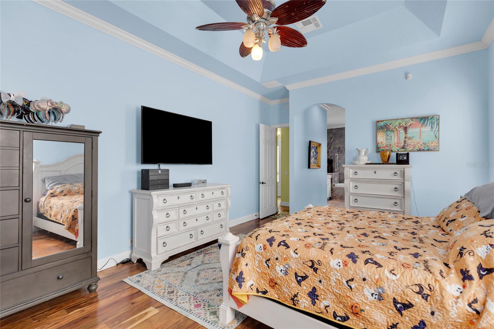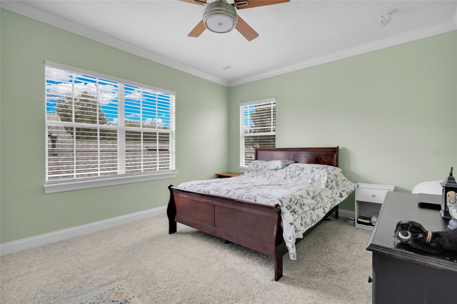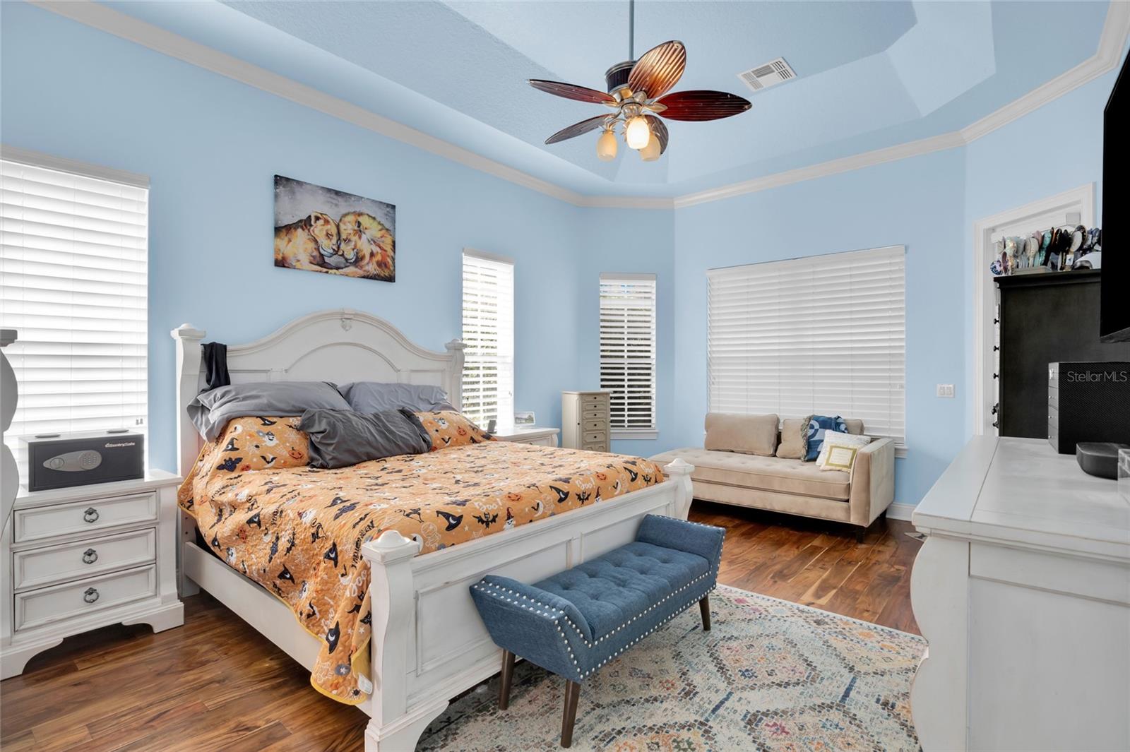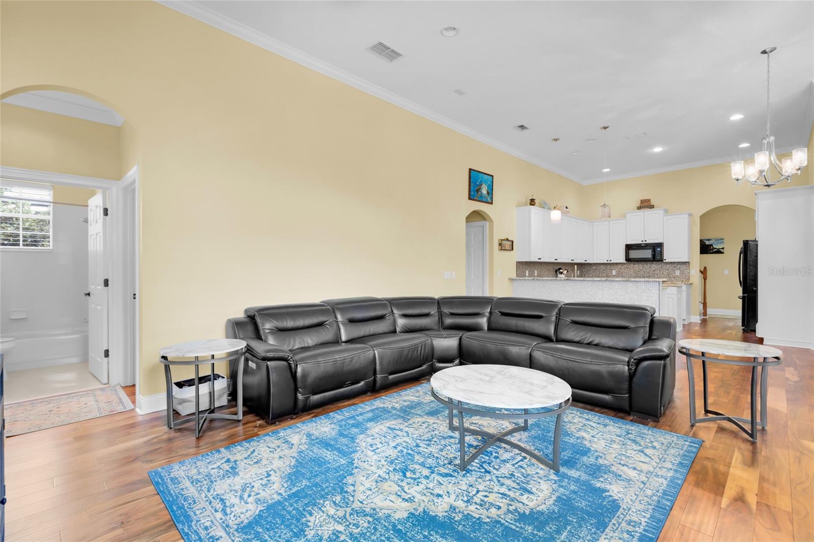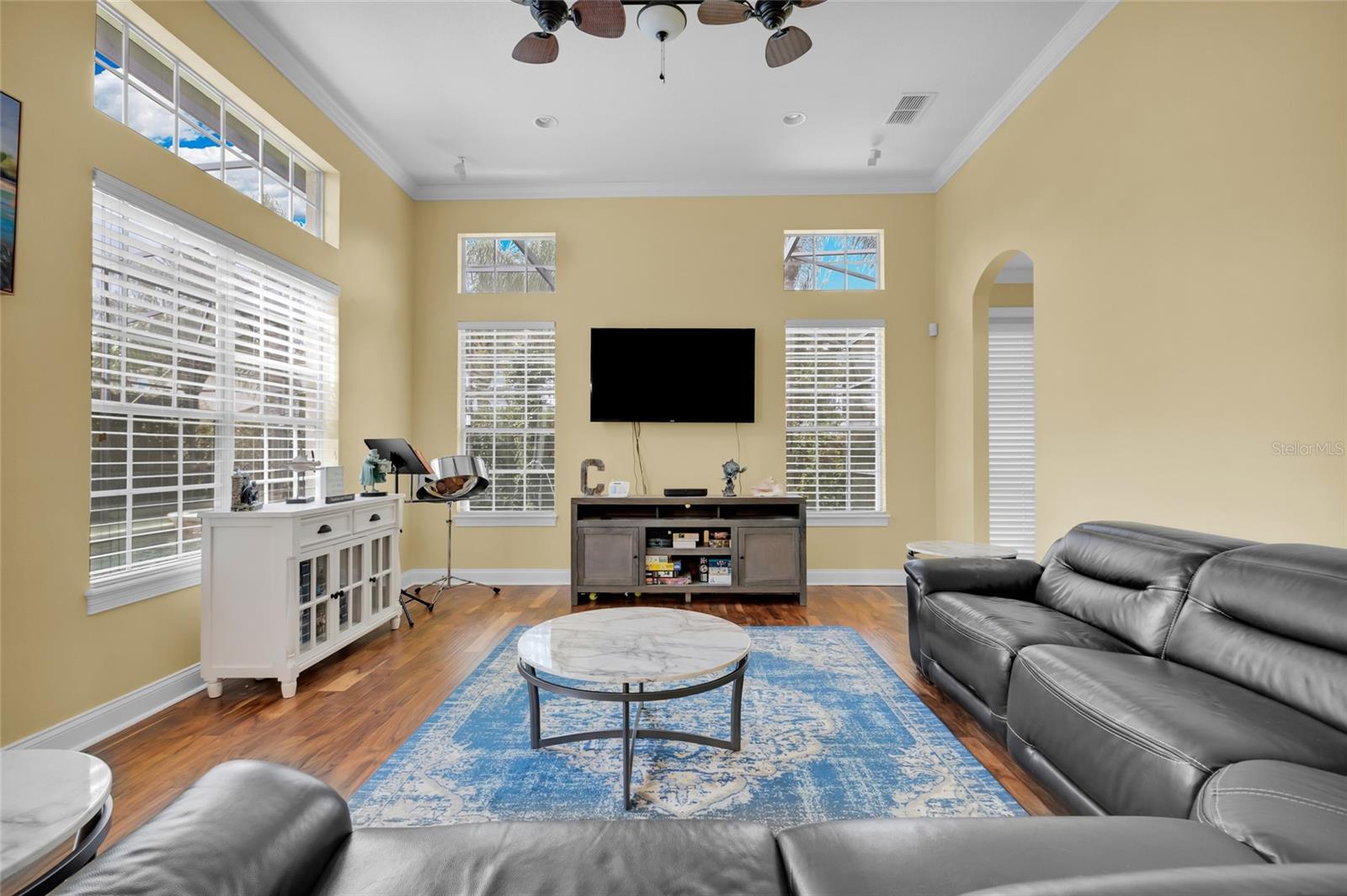 Keene's Pointe - Gated/24-hour attended community centered around The Golden Bear Club, an 18-hole golf course designed by Jack Nicklaus featuring golf, tennis, fitness, swimming and dining. This sought after Glenmore model offers 5 bedrooms, 4 baths, formal living and dining rooms, spacious kitchen and family room and upstairs bonus area with 5th bedroom and bath. The first floor features beautiful rustic hardwood flooring throughout, and a split bedroom floor plan. The owner's suite is privately situated on one side of the house and offers an updated bath with large shower, soaker tub and dual vanities with storage, as well as a walk-in closet. The other three bedrooms downstairs are located on the opposite side of the home, two with shared bath and the fourth with separate bath that doubles as the pool bath. The kitchen has been updated and is open to the spacious family room and offers 42" cabinets, breakfast bar, island, and lots of storage. The upstairs has a large bonus room, full bath and fifth bedroom - perfect for guests. Off the family room is the oversized swimming pool and spa with pebbletec finish, new Aqua Cal heater and screen enclosure, and large lanai - perfect for entertaining. The back yard has a fenced area with turf, perfect for pets. The roof was replaced in 2023 and new water heater in 2024. There is also an oversized 3-car garage with extensive overhead storage, epoxy flooring and paved driveway. There are many other great features in this home just waiting for you to see. Call for your private viewing today.