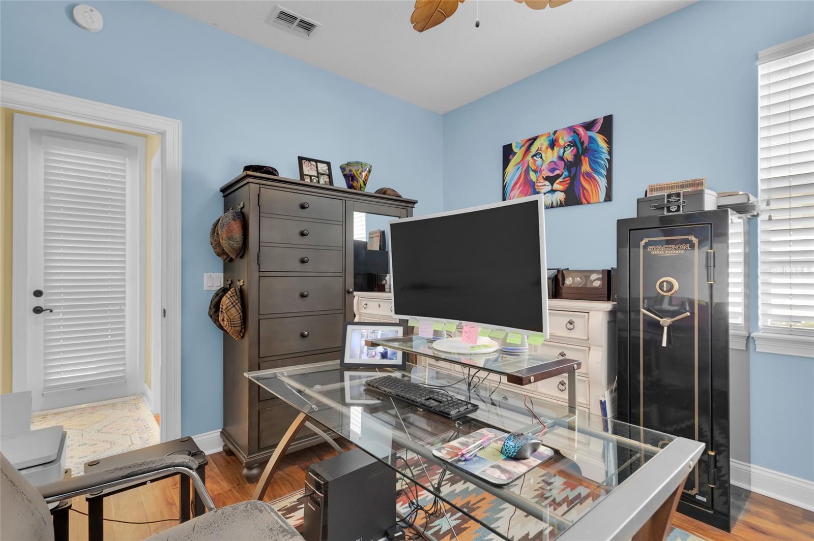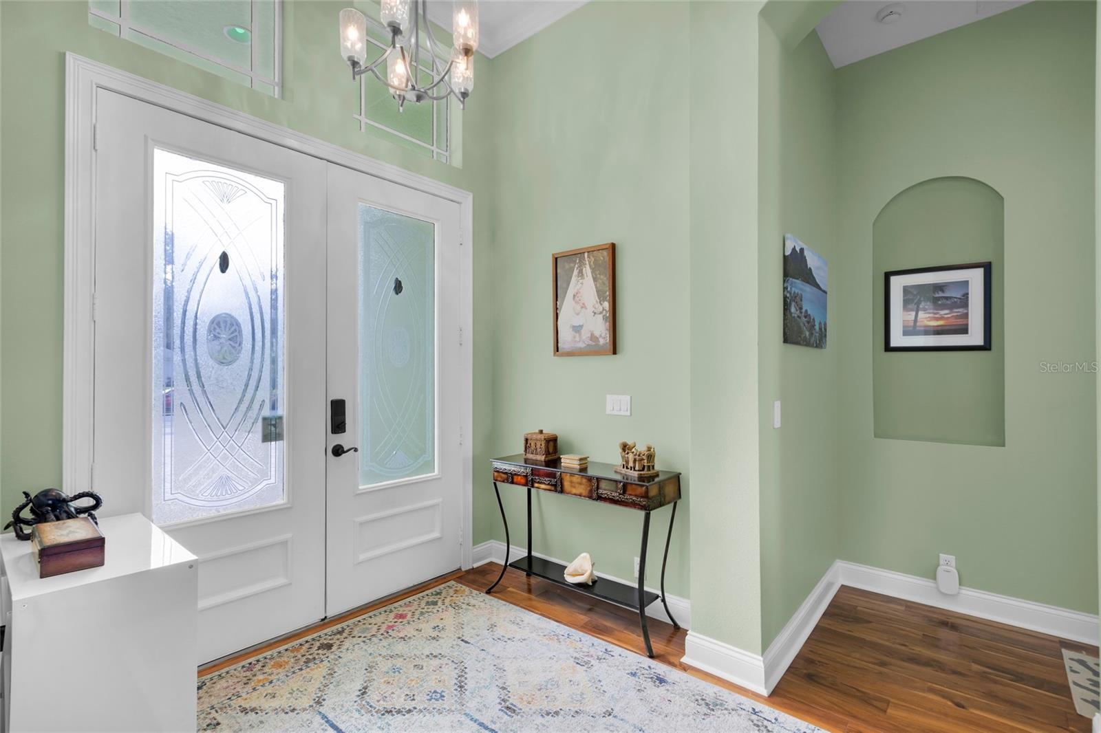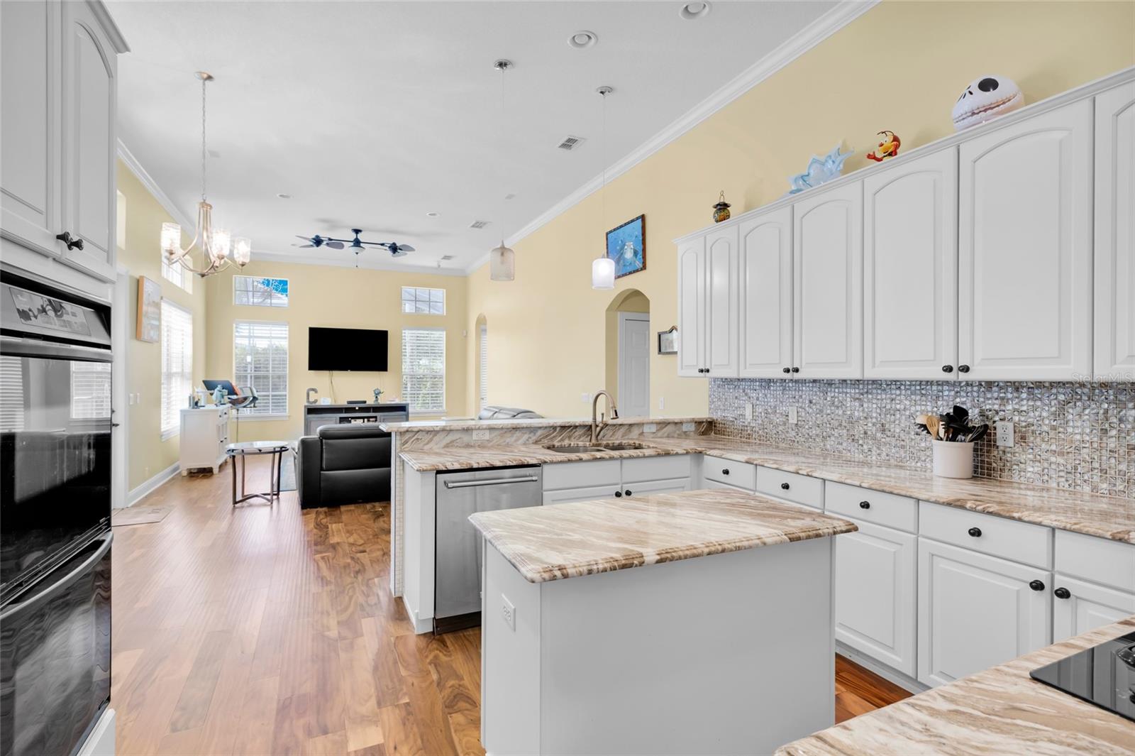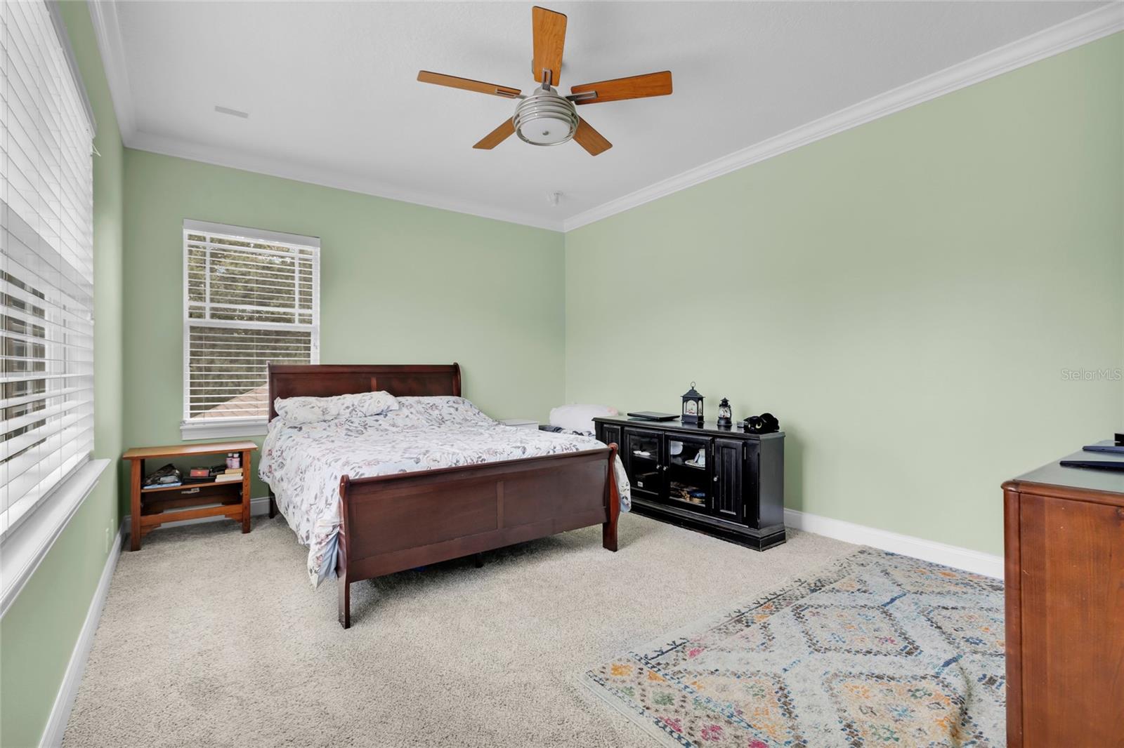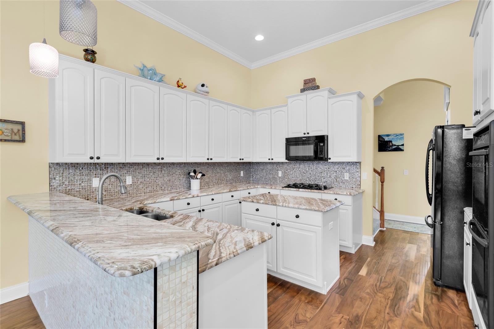 Keene's Pointe - Gated/24-hour attended community centered around The Golden Bear Club, an 18-hole golf course designed by Jack Nicklaus featuring golf, tennis, fitness, swimming and dining. This sought after Glenmore model offers 5 bedrooms, 4 baths, formal living and dining rooms, spacious kitchen and family room and upstairs bonus area with 5th bedroom and bath. The first floor features beautiful rustic hardwood flooring throughout, and a split bedroom floor plan. The owner's suite is privately situated on one side of the house and offers an updated bath with large shower, soaker tub and dual vanities with storage, as well as a walk-in closet. The other three bedrooms downstairs are located on the opposite side of the home, two with shared bath and the fourth with separate bath that doubles as the pool bath. The kitchen has been updated and is open to the spacious family room and offers 42" cabinets, breakfast bar, island, and lots of storage. The upstairs has a large bonus room, full bath and fifth bedroom - perfect for guests. Off the family room is the oversized swimming pool and spa with pebbletec finish, new Aqua Cal heater and screen enclosure, and large lanai - perfect for entertaining. The back yard has a fenced area with turf, perfect for pets. The roof was replaced in 2023 and new water heater in 2024. There is also an oversized 3-car garage with extensive overhead storage, epoxy flooring and paved driveway. There are many other great features in this home just waiting for you to see. Call for your private viewing today.