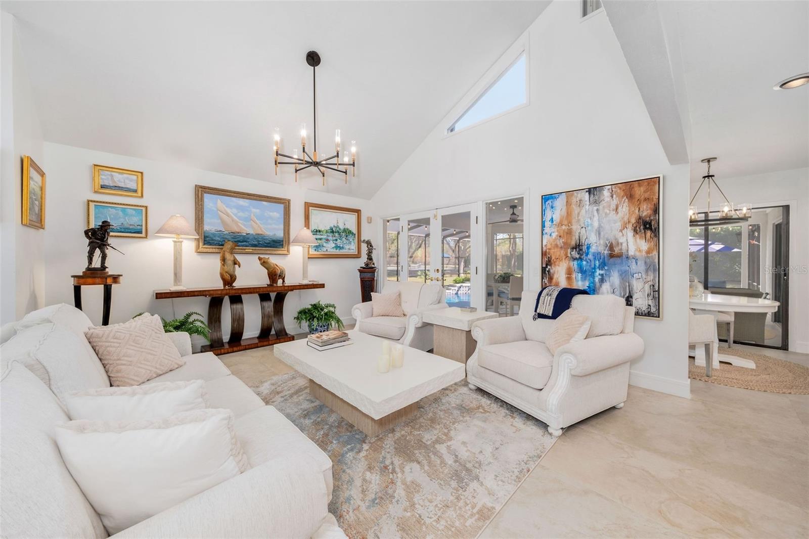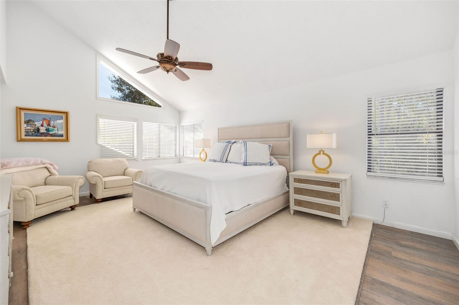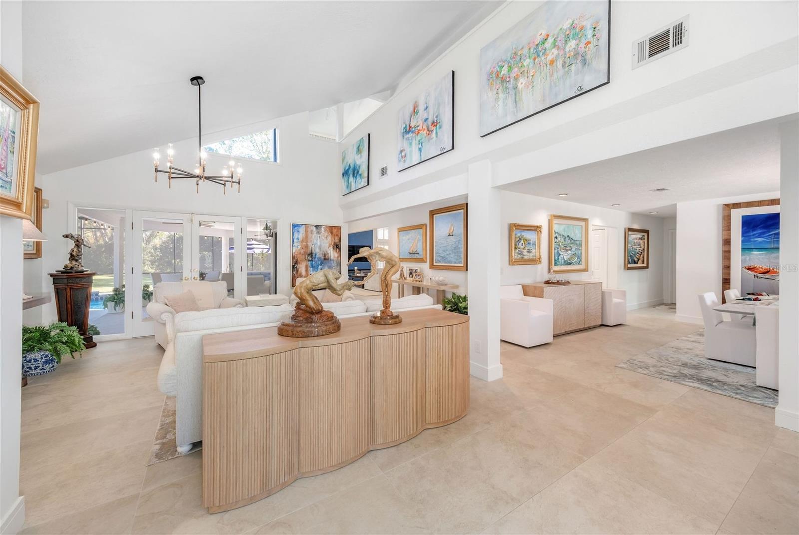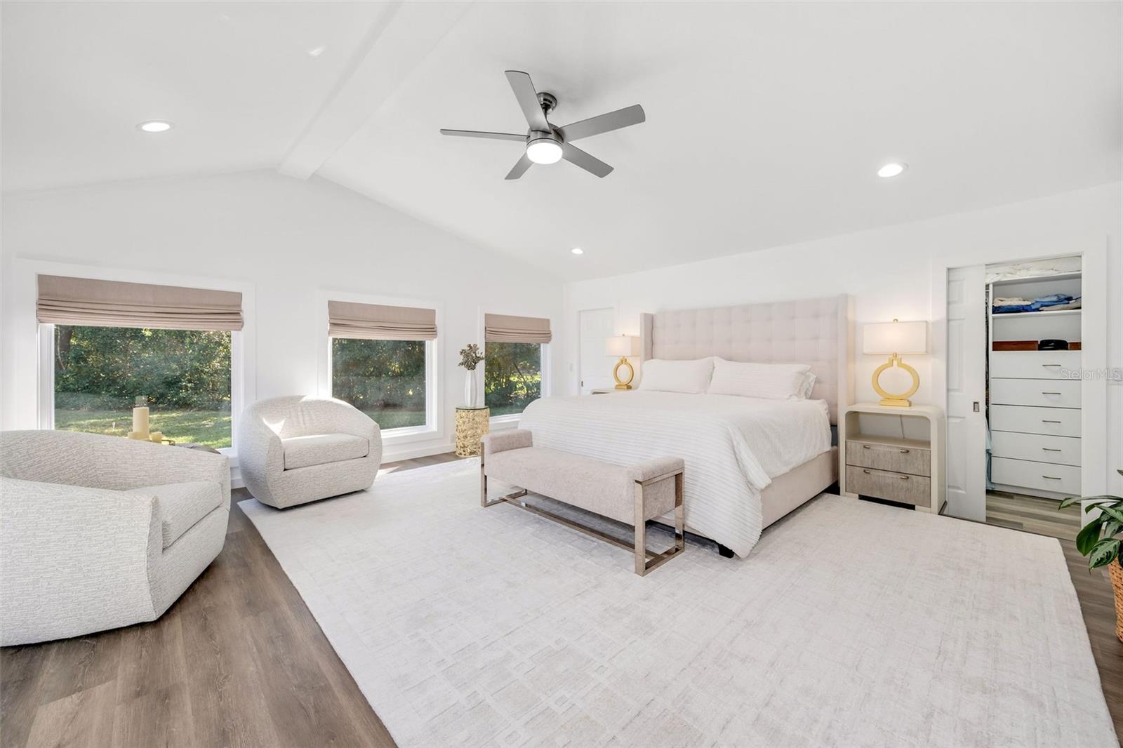 Newly renovated, this jewel on the Butler Chain of Lakes sits on over an acre within the golf cart zone of the sought-after Town of Windermere. In the mature community of Marina Bay Estates, this two-story home features a large circular driveway with a motor court, an oversized two-car garage, and a newly added golf cart garage for additional storage. The four-bedroom home spans almost 3,900 sqft, with ample room to expand on the 1.11-acre waterfront estate. Upon entering, you’re welcomed by a light, modern color palette and an abundance of natural light bouncing off the freshly painted interior and illuminating the new tile floors. The newly added master suite on the first floor enhances the home's appeal, providing convenience and luxury. Perfect for entertaining family and friends, the home has an excellent flow from the formal living room into the family room with its soaring, two-story ceiling, around the kitchen with casual dining, and a separate formal dining room. Both the formal living room and family room overlook the sparkling pool and covered lanai. With two bedrooms downstairs and two additional bedroom suites on the second floor, the property makes an attractive option as a vacation home. Listed among the numerous upgrades to the property, this home features a new metal roof, two new air conditioning units, all newly renovated bathrooms, all new flooring, a whole-house water softener system, and a private well. This property is a must-see!
