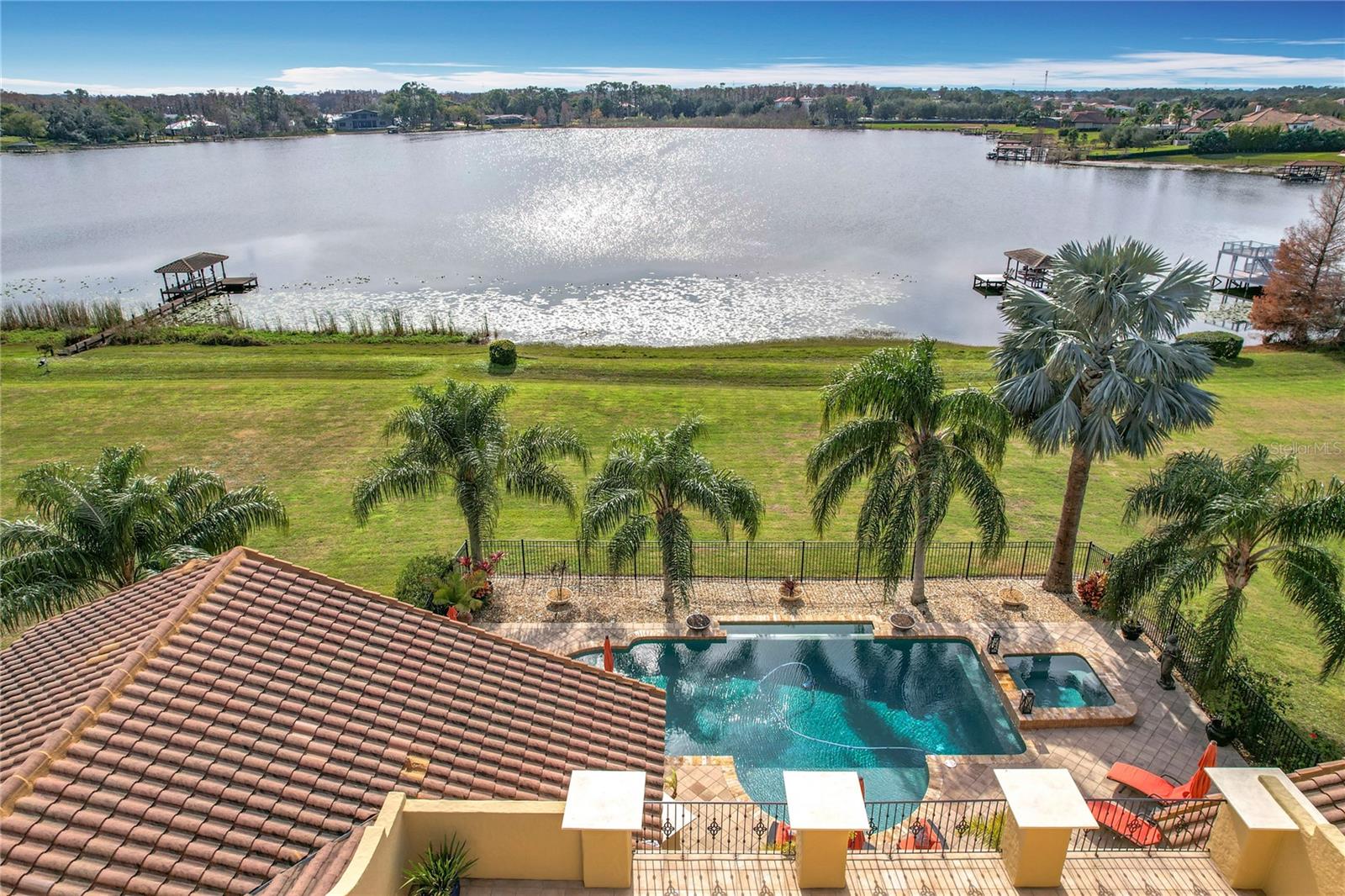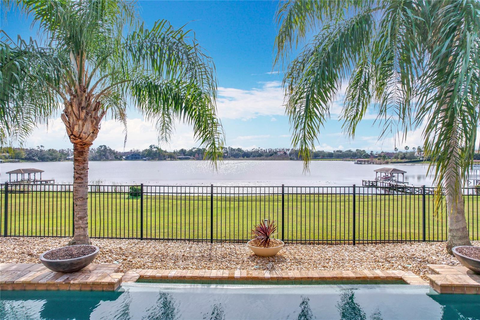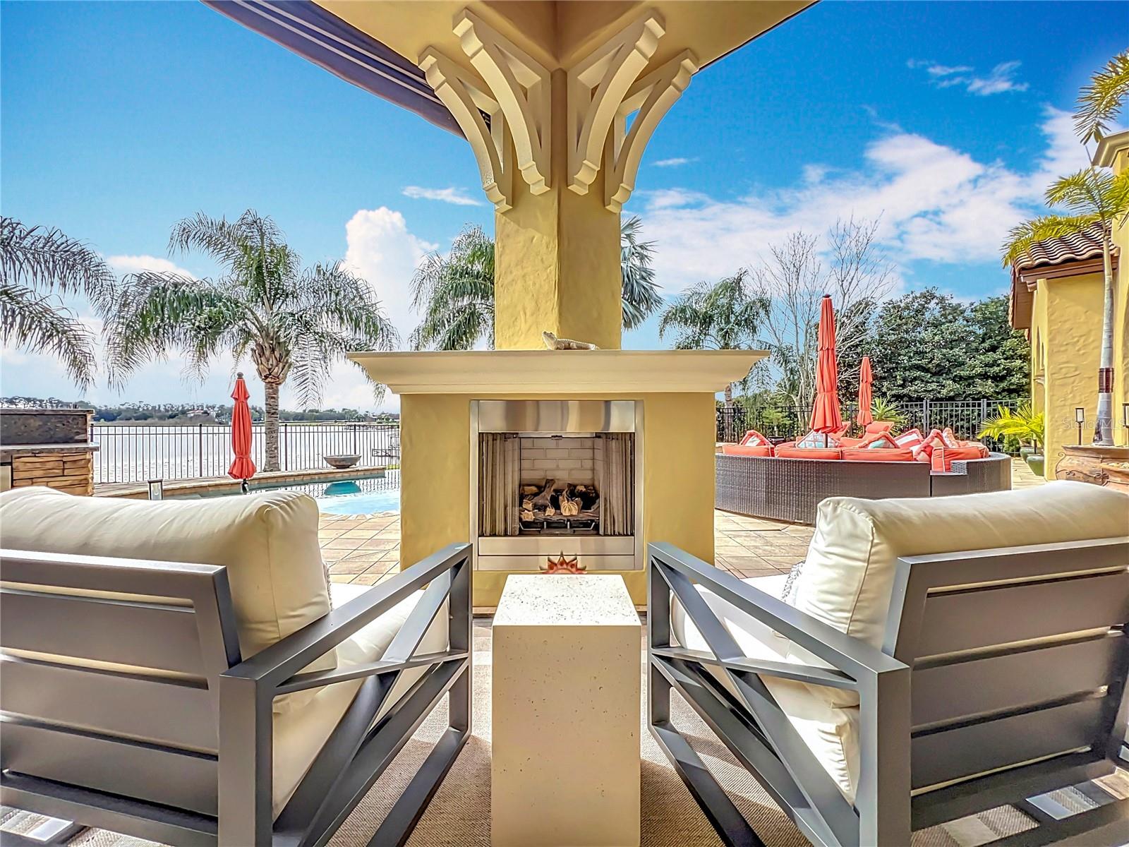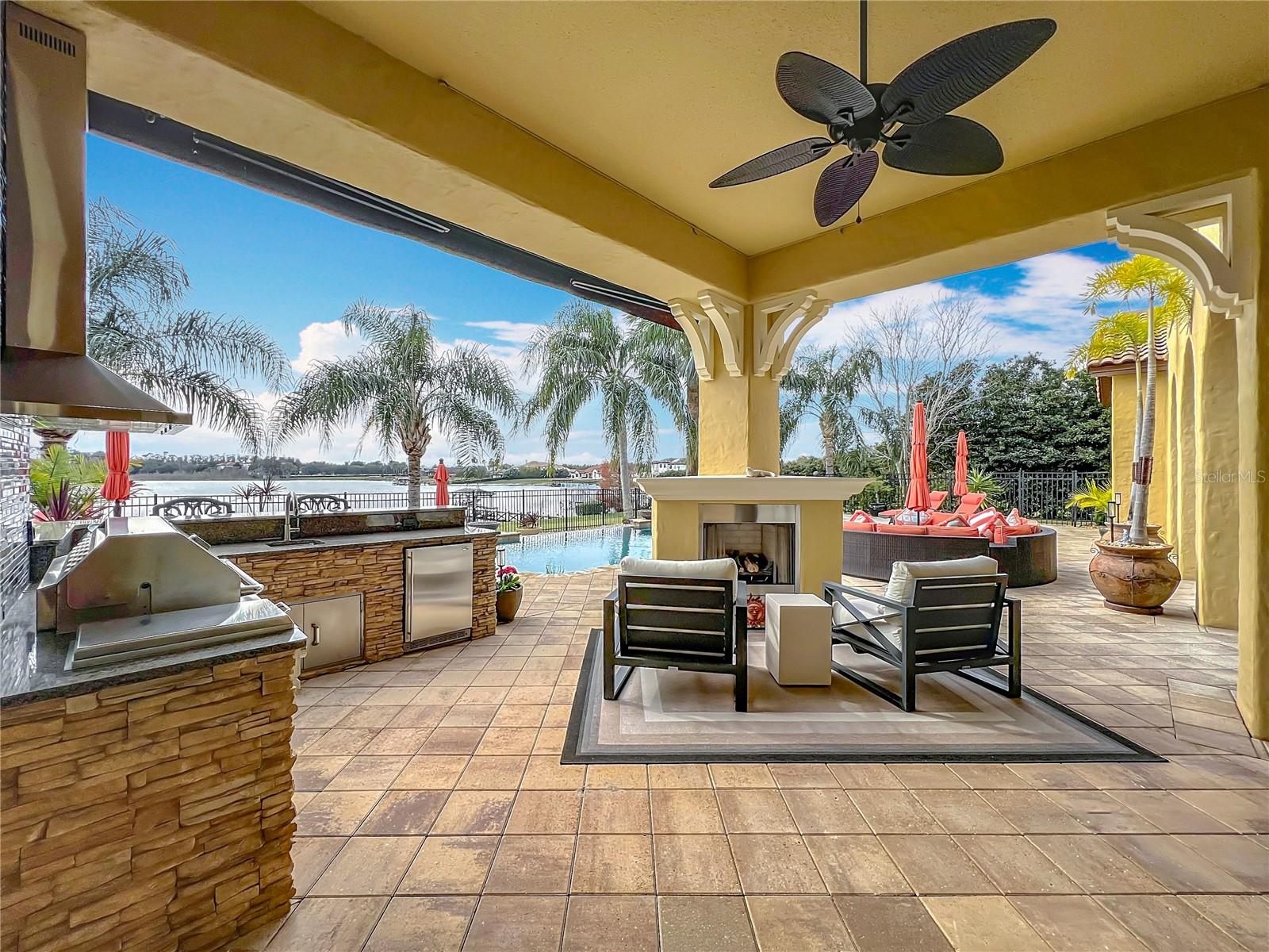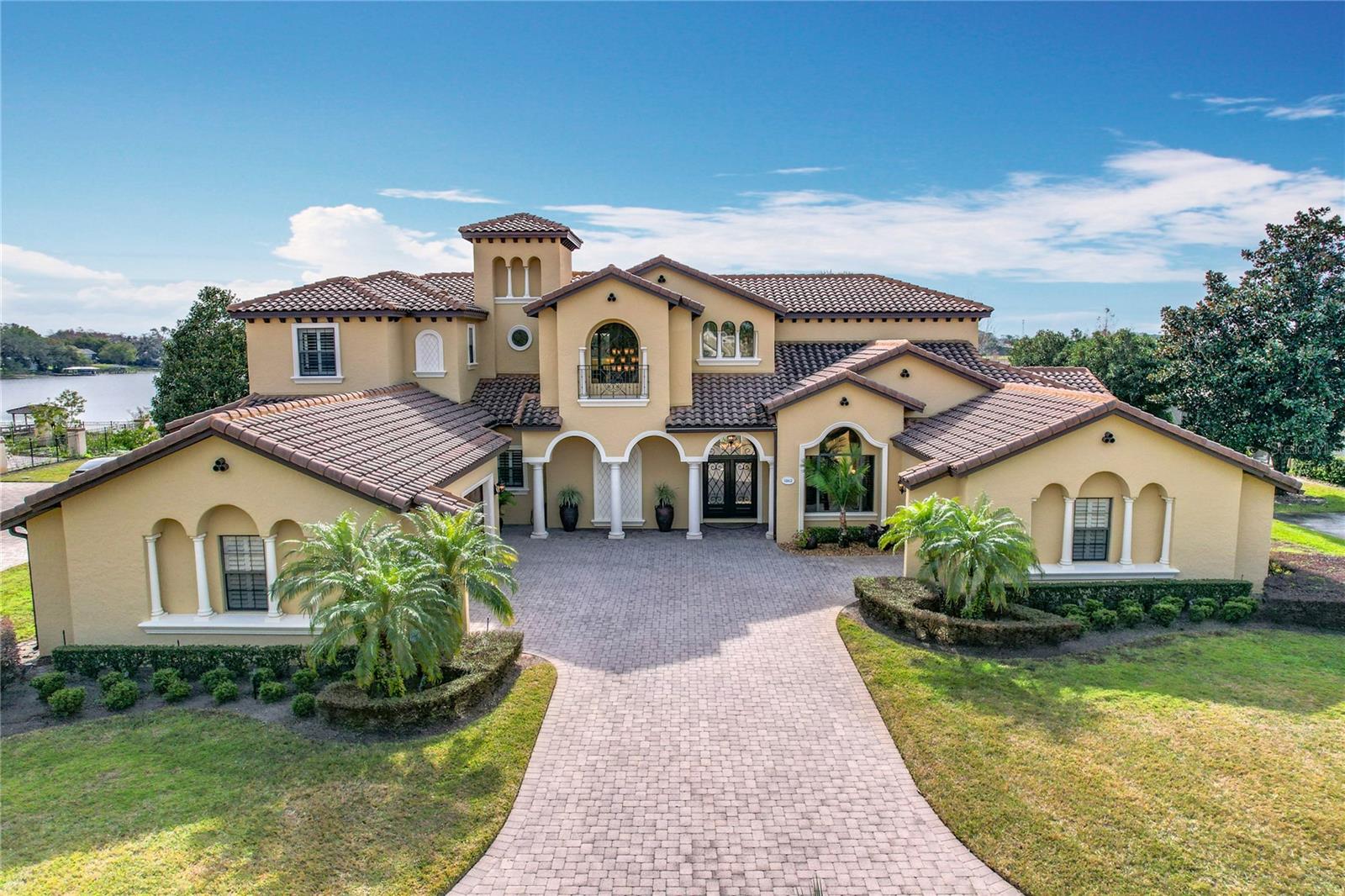 Discover unparalleled luxury and tranquility in this magnificent custom-built home, perfectly situated on a spacious lot within an exclusive guard-gated community. Boasting direct access to a pristine spring-fed lake that allows private boat docks, this property offers a lifestyle of relaxation and recreation. Step inside to a wonderfully designed open-concept family room and gourmet kitchen, featuring high-end appliances, a breakfast bar, an inviting eat-in space, and a convenient butler’s pantry. A nearby wine closet provides the perfect space to store your finest collection. Adjacent to the kitchen, a well-appointed guest room and laundry room add convenience to everyday living. The formal dining and living rooms share a cozy fireplace and breathtaking views of the lake, creating an elegant atmosphere for entertaining. A private office, a full pool bathroom, and a luxurious primary suite complete the first floor. The spacious primary suite includes an additional exercise room, while the spa-like en-suite bathroom features separate double sinks, dual walk-in closets, a garden tub, and a walk-through shower. A beautifully crafted wood and iron sweeping staircase leads to two generously sized bedrooms, each with its own private bathroom. The expansive game room provides direct access to a balcony with panoramic lake view. Movie nights will never be the same in the state-of-the-art home theater, complemented by a convenient half-bathroom nearby. Step outside to an entertainer’s dream, the expansive covered patio features a fireplace and a fully equipped outdoor kitchen. The sparkling pool, spa and open patio provide the perfect setting for hosting gatherings or simply unwinding in the serene surroundings and enjoying Disney's fireworks display. Completing this magnificent home is a spacious three-car garage, offering ample storage and parking for vehicles and recreational gear. Experience the ultimate in lakeside living with luxury, privacy, and breathtaking views. Schedule your private tour today!