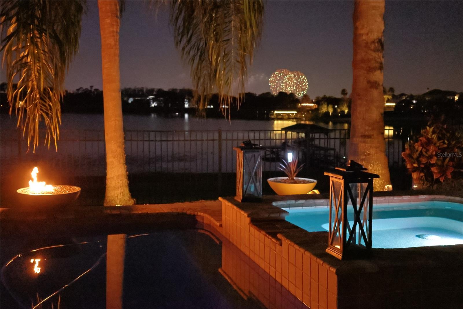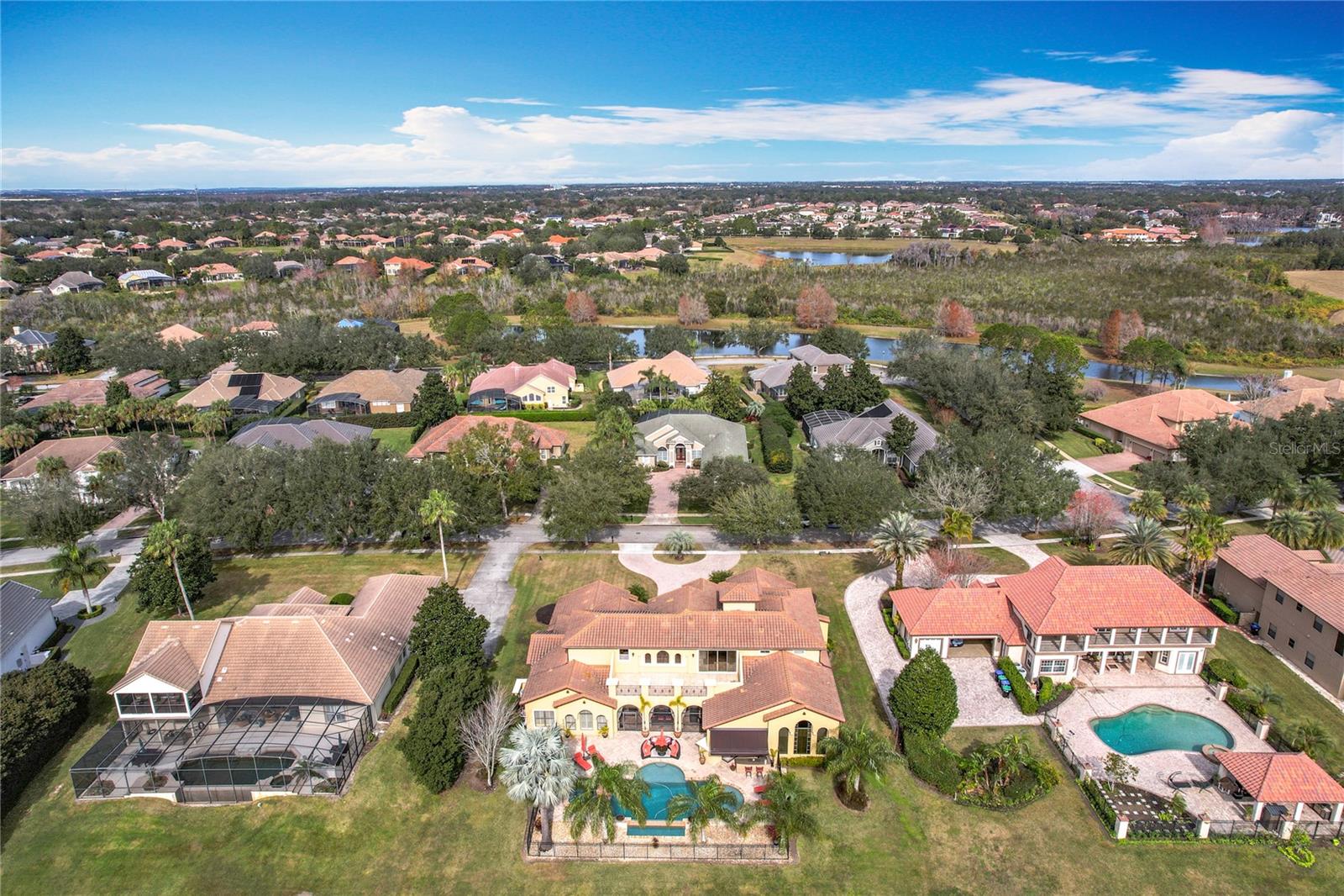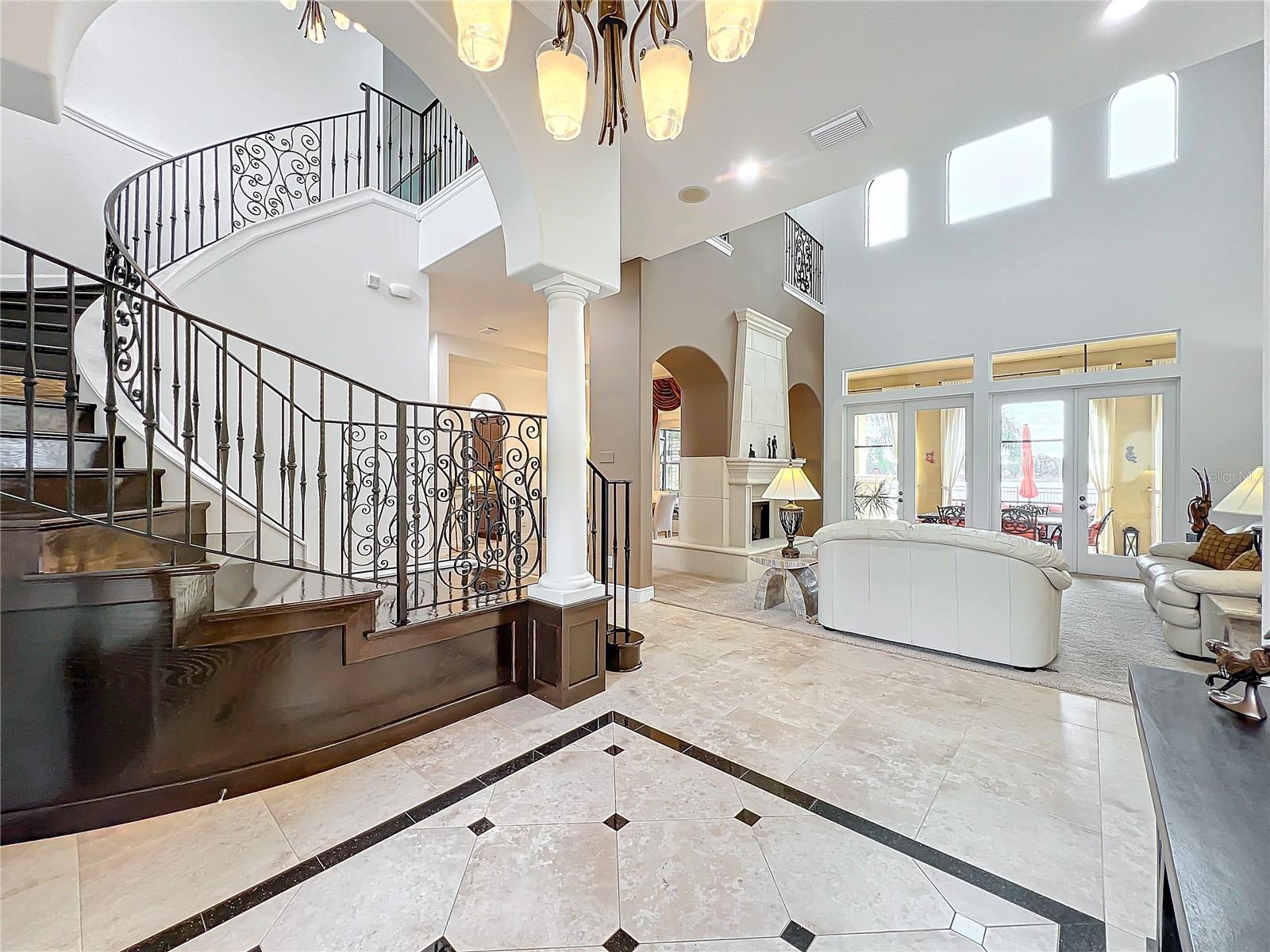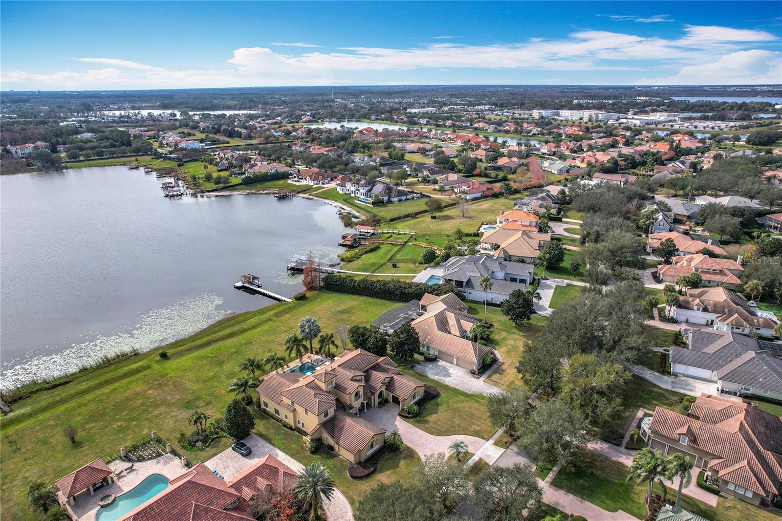 Discover unparalleled luxury and tranquility in this magnificent custom-built home, perfectly situated on a spacious lot within an exclusive guard-gated community. Boasting direct access to a pristine spring-fed lake that allows private boat docks, this property offers a lifestyle of relaxation and recreation. Step inside to a wonderfully designed open-concept family room and gourmet kitchen, featuring high-end appliances, a breakfast bar, an inviting eat-in space, and a convenient butler’s pantry. A nearby wine closet provides the perfect space to store your finest collection. Adjacent to the kitchen, a well-appointed guest room and laundry room add convenience to everyday living. The formal dining and living rooms share a cozy fireplace and breathtaking views of the lake, creating an elegant atmosphere for entertaining. A private office, a full pool bathroom, and a luxurious primary suite complete the first floor. The spacious primary suite includes an additional exercise room, while the spa-like en-suite bathroom features separate double sinks, dual walk-in closets, a garden tub, and a walk-through shower. A beautifully crafted wood and iron sweeping staircase leads to two generously sized bedrooms, each with its own private bathroom. The expansive game room provides direct access to a balcony with panoramic lake view. Movie nights will never be the same in the state-of-the-art home theater, complemented by a convenient half-bathroom nearby. Step outside to an entertainer’s dream, the expansive covered patio features a fireplace and a fully equipped outdoor kitchen. The sparkling pool, spa and open patio provide the perfect setting for hosting gatherings or simply unwinding in the serene surroundings and enjoying Disney's fireworks display. Completing this magnificent home is a spacious three-car garage, offering ample storage and parking for vehicles and recreational gear. Experience the ultimate in lakeside living with luxury, privacy, and breathtaking views. Schedule your private tour today!