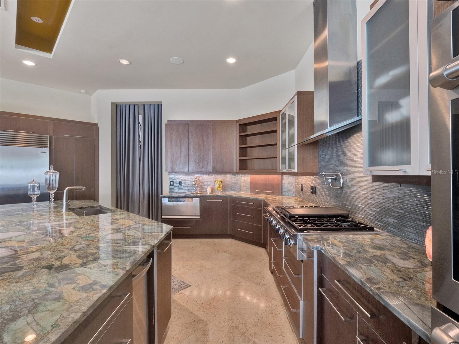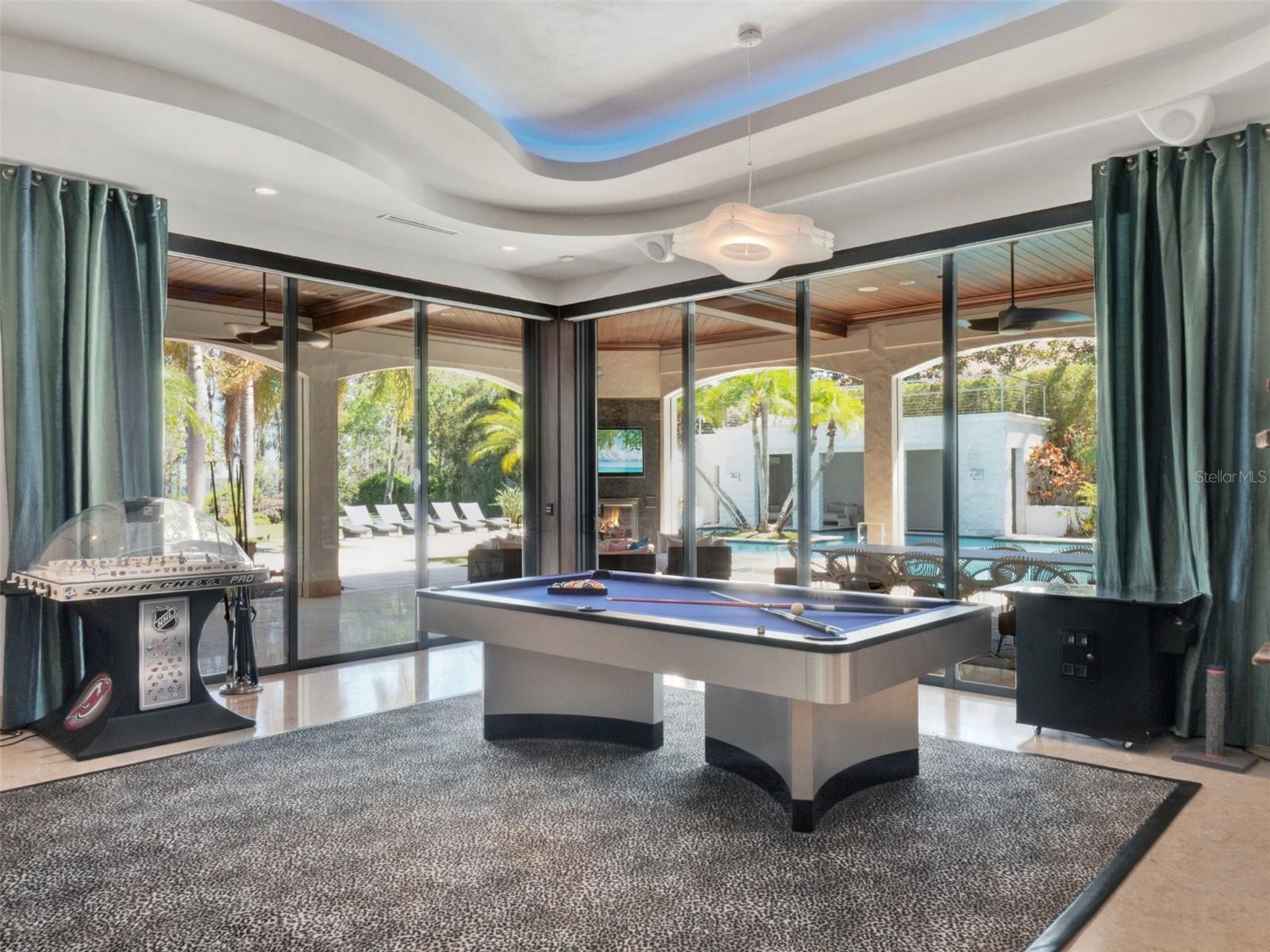 Experience luxury lakefront living on a grand scale in this custom-built Modern Mediterranean estate on Lake Tibet, part of the pristine Butler Chain of Lakes. The three-story residence spans 9,571 square feet of living space on over 2.2 acres in the guard-gated community of Keene’s Pointe in sought-after Windermere. Built by Goehring & Morgan, this architectural masterpiece offers refined craftsmanship, exquisite details and seamless indoor-outdoor living with stunning water views from almost every space. The 26-foot grand entry sets the tone for soaring handcrafted coffered ceilings, travertine marble and mahogany wood floors, custom cabinetry, designer interior and exterior finishes and an open floor plan. Inside you'll find six bedrooms, five en suite, nine baths, formal living and dining rooms, wine cellar, family room, captivating saltwater aquarium, game room, lounge/loft, two offices, a mudroom, and a home theater constructed of concrete block to also serve as a safe room. The chef’s kitchen is outfitted with Sub-Zero and Dacor appliances, Esmeralda Brazil granite countertops, LED lighting, a large walk-in pantry, a prep kitchen with additional appliances and a built-in Miele coffee station with beverage refrigerator. The owner’s retreat features a private sitting room, fireplace, wet bar, oversized custom closet, spa-like bath and a covered balcony with breathtaking lake views. A spiral staircase leads to the third floor, the highest elevation in Keene’s Pointe, where you’ll find a private study and an observation deck. Massive sliding doors open to a spectacular outdoor living space with retractable screens, tongue-and-groove ceilings, fireplace, TV and a full summer kitchen with Viking gas grill, sink and refrigerator. The resort-style saltwater pool features a Beadcrete finish, sun shelf, lazy river, slide, grotto, swim-up table and stools, island planter with palm trees, spa and dramatic water, fire and lighting effects. A putting green and built-in trampoline complete the backyard oasis. One of only two, two-story docks in Keene’s Pointe, the home's private boathouse includes two boat slips with lifts and touchless covers, plus a floating dock for jet skis. Additional features include an elevator, in-floor vacuum system, attached in-law suite with private entry plumbed for a future kitchen, two garages with room for five cars and a gated dog run. The barrel tile roof, stone entry columns, motor court with fountains and professionally designed landscaping further elevate the estate. Keene’s Pointe offers access to the Butler Chain of Lakes, a 250-acre Jack Nicklaus Signature golf course, the Golden Bear Club, resort-style pool, tennis courts, fitness center, multiple playgrounds and a clubhouse for private events. Windermere offers small-town charm with proximity to downtown Orlando, fine dining, world-class shopping, championship golf courses, top-rated schools, international and private airports, and theme parks.