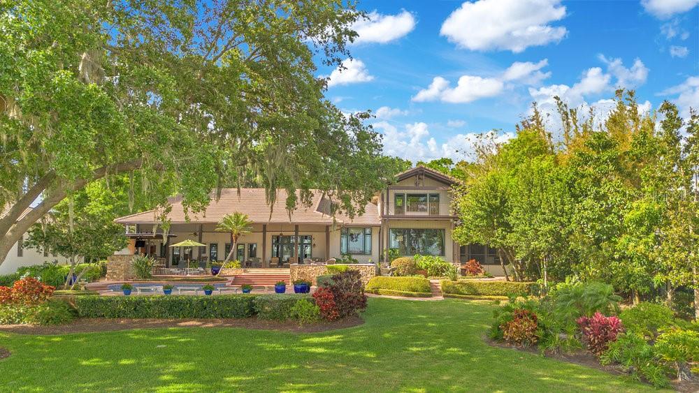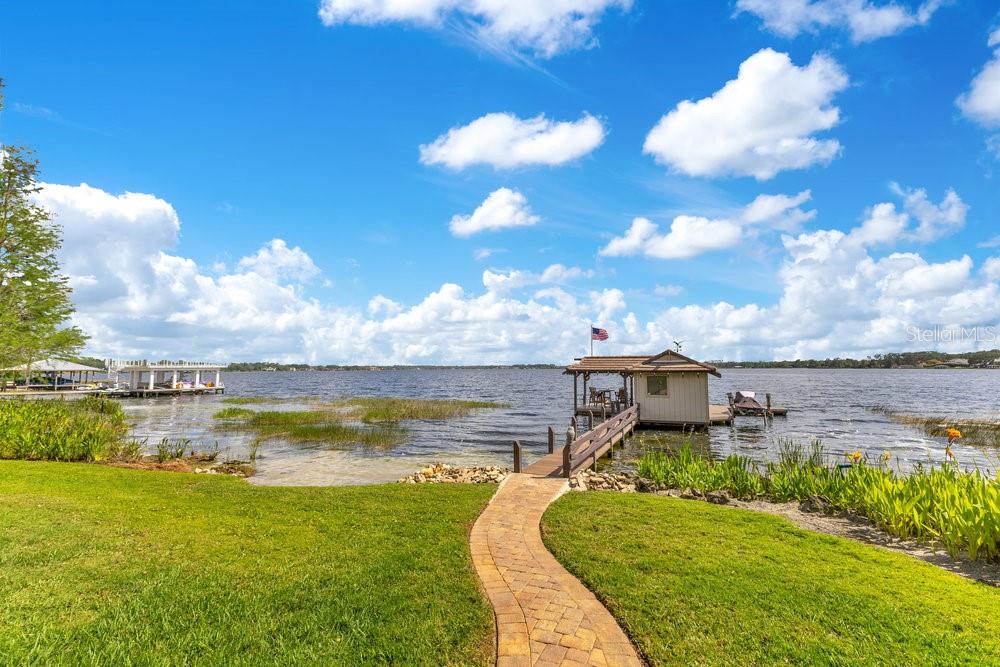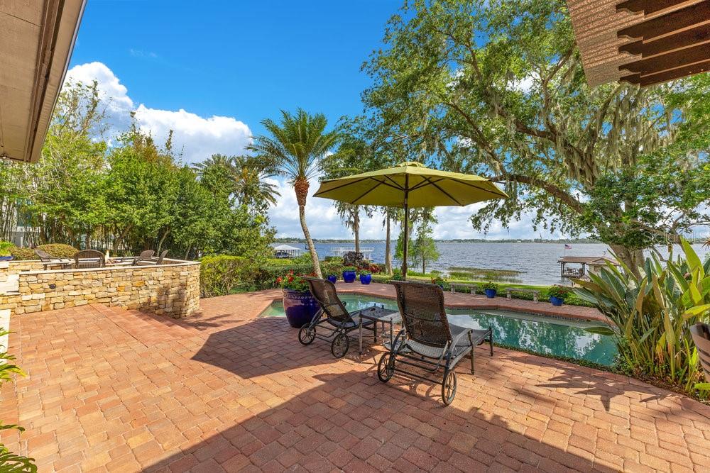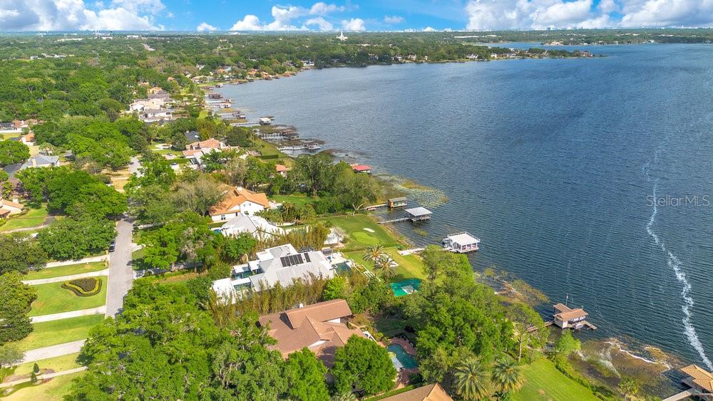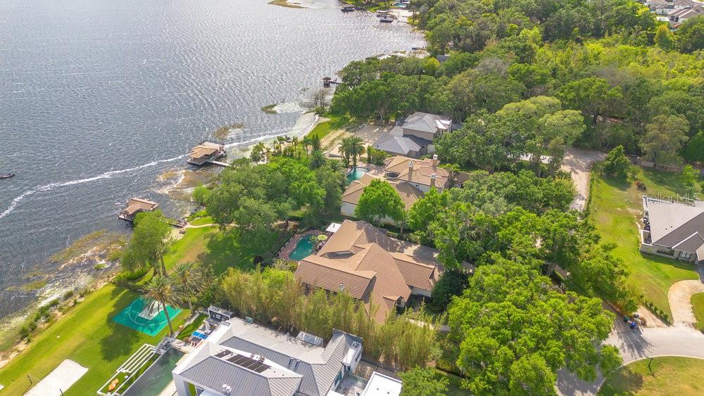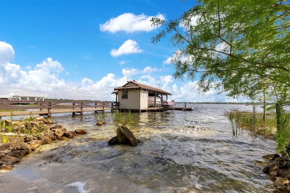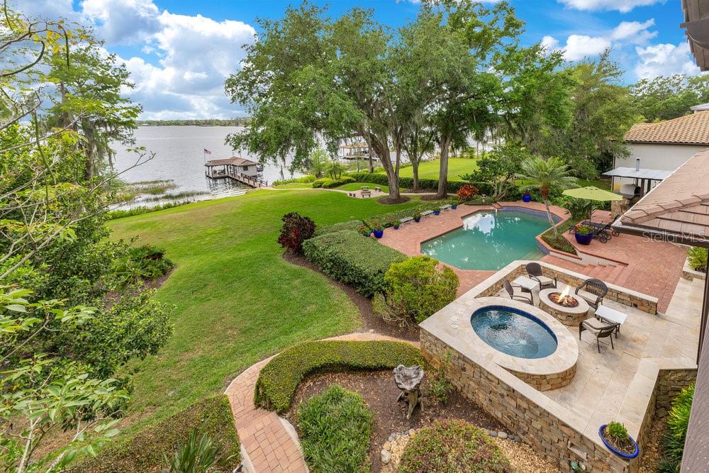 This exceptional lakefront home is located on The Butler Chain of Lakes with 137 feet of pristine shoreline and is situated on almost one dry acre. At first glance you will immediately fall in love with this beautiful custom home boasting amazing panoramic views and nightly Disney fireworks. The circular paved drive flanked with mature oak trees welcome you home to a covered porch and an 8-inch-thick solid cedar entry door with artisan leaded glass. The great room definitely adds to the “wow factor” with its soaring 23’ cathedral ceilings highlighted by a Tennessee river rock fireplace, and the crown jewel formal dining room with large, picturesque windows overlooking the stunning vistas. The majority of the living space, including all the bedrooms, are conveniently located on the main level. Your fully equipped kitchen includes solid wood cabinetry, granite countertops, Sub Zero refrigerator, Thermador gas cooktop with exhaust, Bosch double ovens, wet bar, walk-in pantry, and breakfast area with spectacular views. Primary suite is spacious with its own screened in lanai, spa like bath including a shower, jetted tub, dual vanities, and three walk-in closets. Secondary bedrooms are all generously sized with ample closet space and bathrooms including a steam shower. The backyard space is extraordinary with mature landscaping, flowers, and its own motorized screened in lanai including a summer kitchen fit for any chef with a pizza oven, prep area, grill, refrigerator, TV, pool, heated spa, and gas firepit. The southern position of the backyard gives you the freedom to enjoy all those memorable get-togethers and cool lake breezes without the strong afternoon sun. The custom floor plan accentuates the lake lifestyle with most of the home taking full advantage of the lakeview. The partially enclosed boat dock with a boat lift and side jet-ski lift is a rare gem itself since it is grandfathered in. Other notable upgrades include newer doors & windows and a tile roof. Adding to the home’s appeal, the Lakes neighborhood has its own community boat ramp and tennis courts. You get to live in Windermere on the famed Butler Chain of Lakes without the traffic. Major roads, highways, great schools, shopping, and restaurants are just a five-to-ten-minute drive from the property. This rare well-built custom lakefront home is waiting for you! Be sure to click on the virtual tour links.
