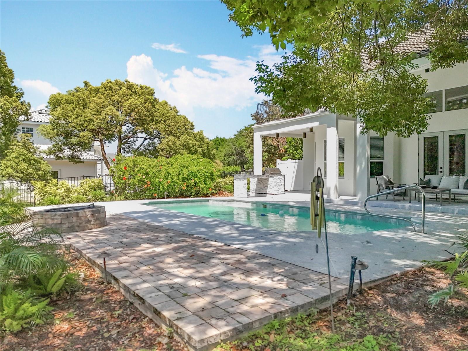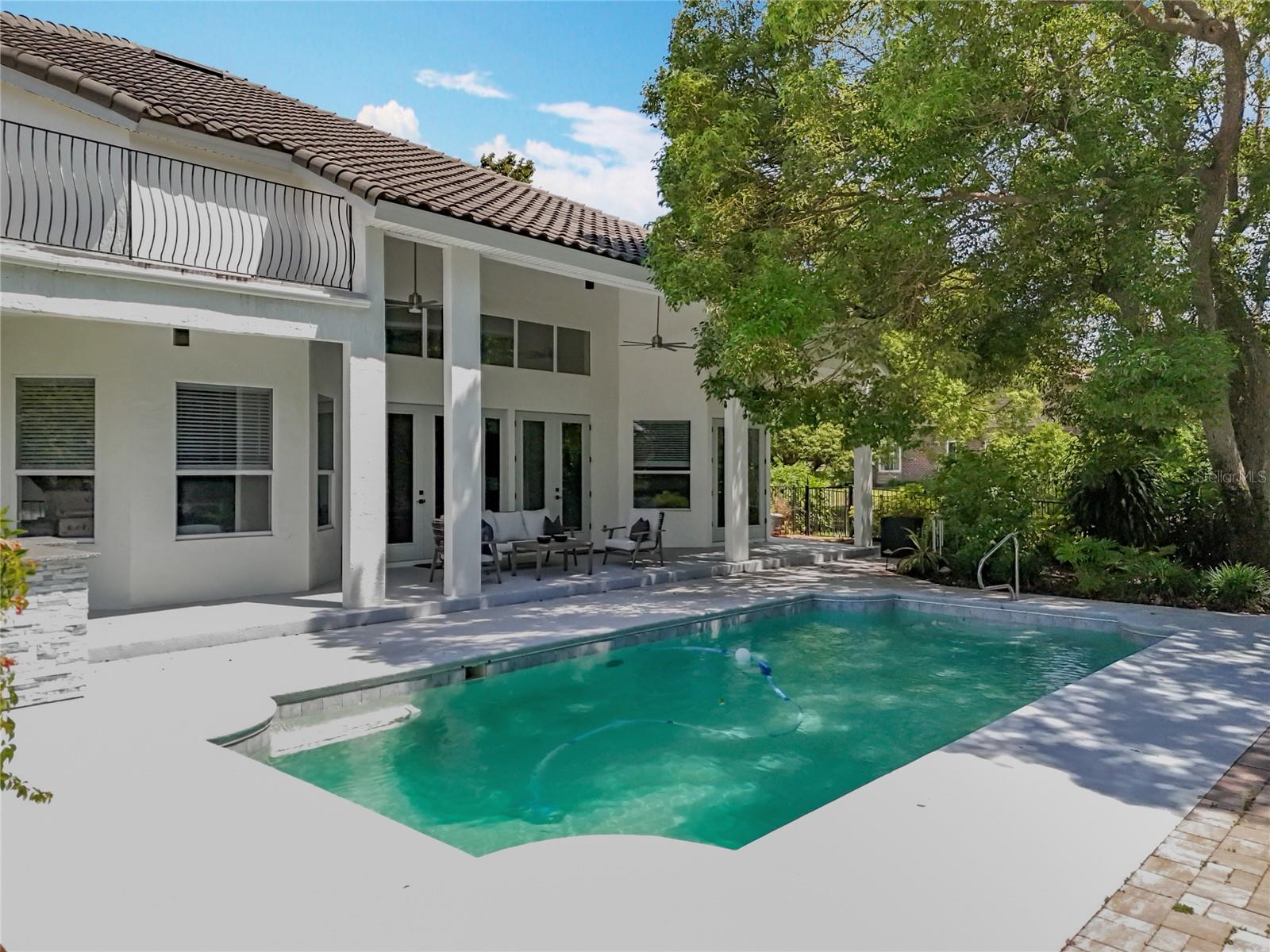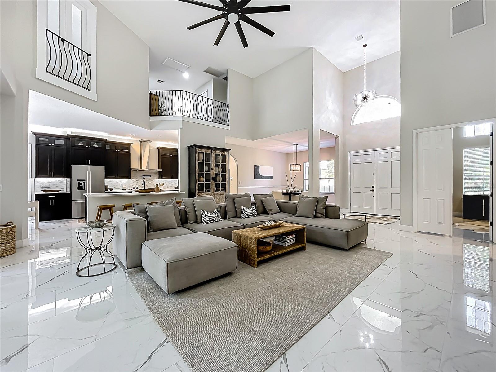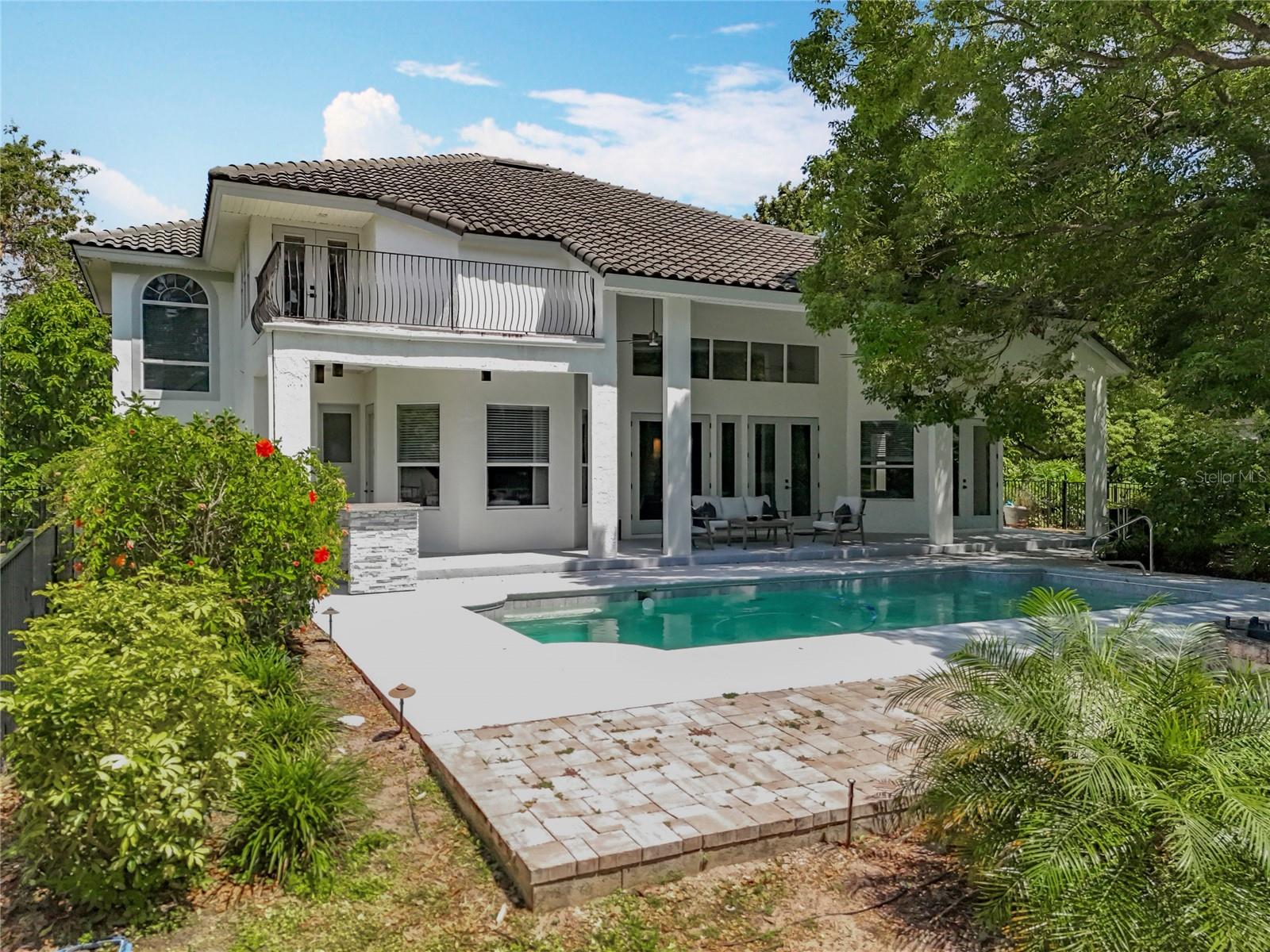 Stunning Renovation on 1 Acre in Lake Down Cove. Located at the end of a quiet cul-de-sac, this beautifully renovated home offers a peaceful, park-like setting on a full acre in sought-after Lake Down Cove. A grand double-door entry welcomes you into a bright, modern interior where 24”x48” marble-style porcelain tile flows throughout. Sunlight fills the two-story great room, anchored by an electric fireplace and overlooked by a loft and Juliet balcony with custom wrought iron railings.The reimagined kitchen features soft-close shaker cabinets, stainless steel appliances, a six-burner cooktop with griddle, double ovens, a pot filler, and a cozy eat-in area overlooking the pool. Work from home in a stunning two-story office with illuminated wall coves and a wall of windows. The primary suite offers pool views, dual walk-in closets, high ceilings with crown molding, and a spa-like bathroom with full-height porcelain tile, a freestanding tub, and frameless glass shower. Upstairs, two additional bedrooms await, one with its own private balcony. The dedicated theater room, complete with stylish sconces, creates the ultimate movie night experience. Outside, enjoy a sparkling pool, outdoor kitchen and bar, expanded paver patio, fire pit, and mature landscaping that ensures privacy. Recent upgrades include a new water heater, 2 new Bosch AC units, a new Culligan water softener system, propane tank, built-in generator, well, irrigation system, and a brand-new septic drainfield. Minutes from top-rated dining, shopping, and attractions, this move-in ready home offers luxury, privacy, and convenience. Schedule your private tour today!