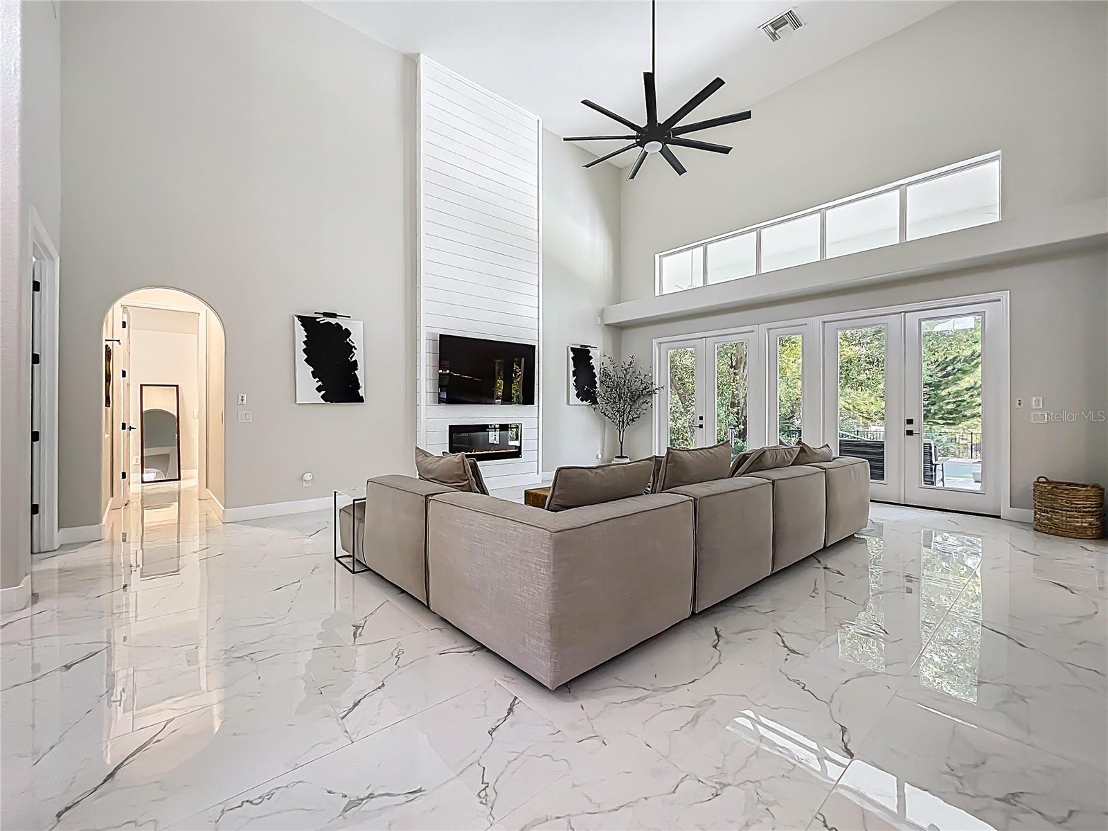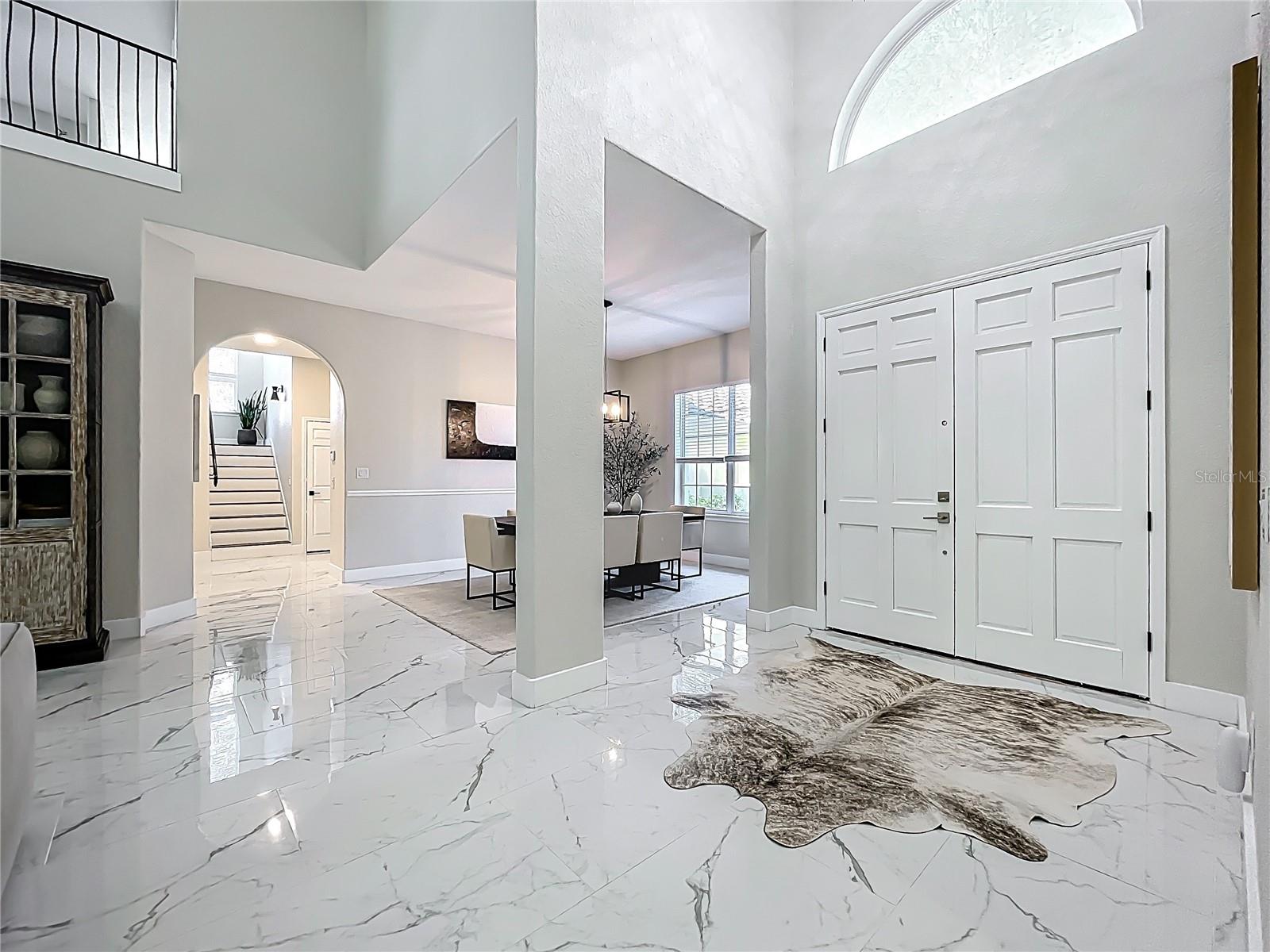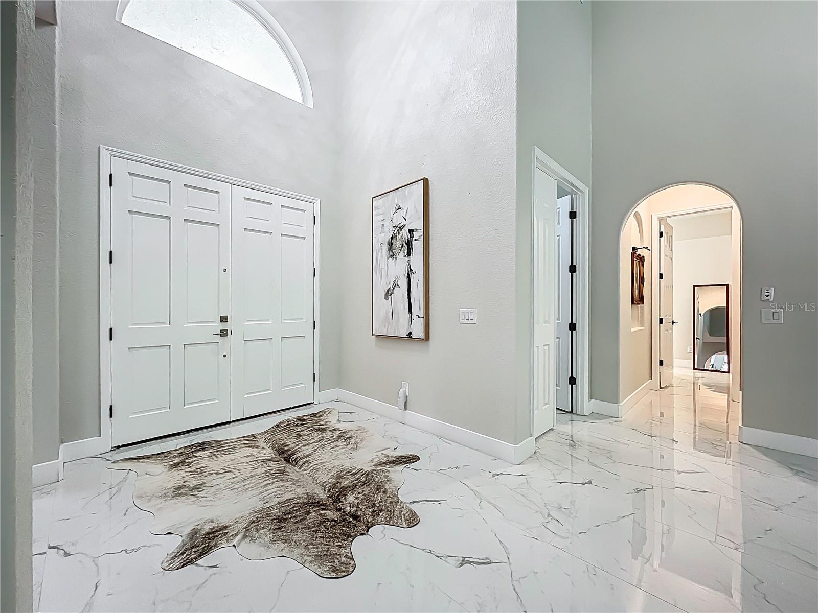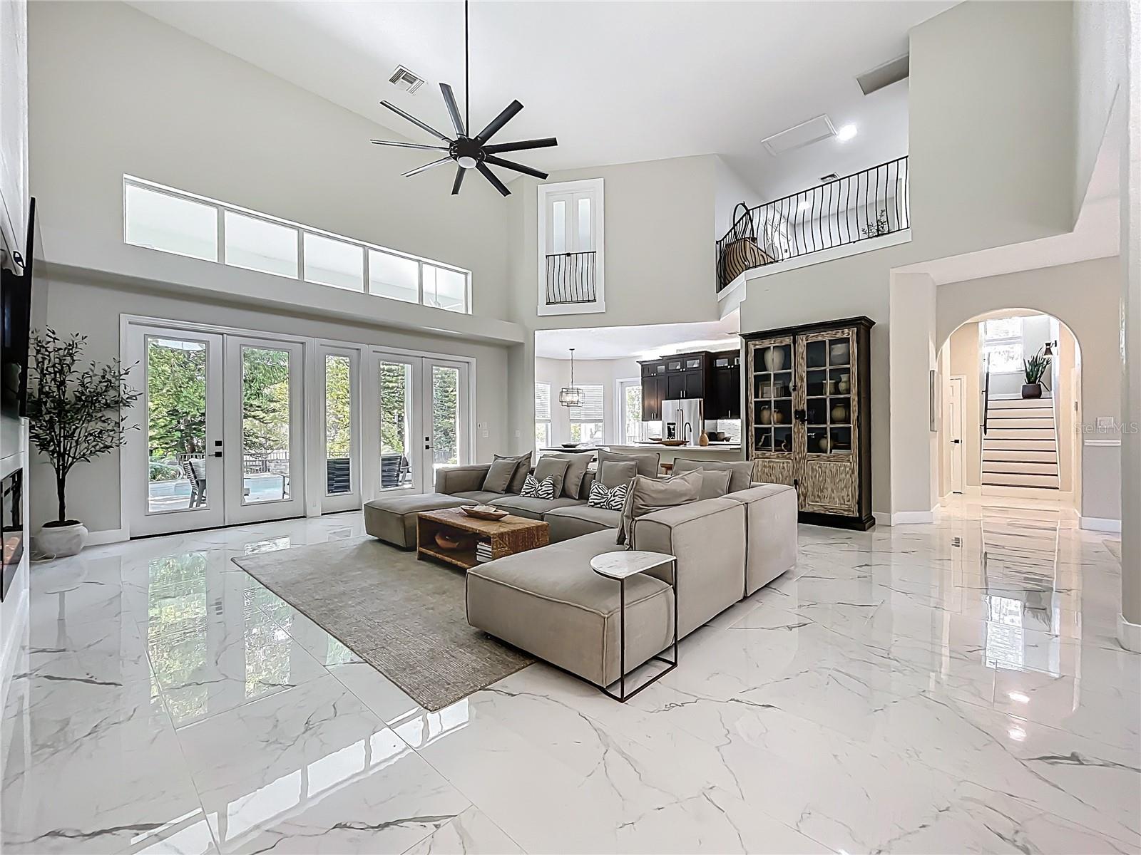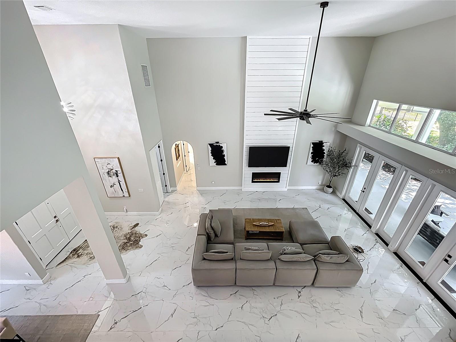 Stunning Renovation on 1 Acre in Lake Down Cove. Located at the end of a quiet cul-de-sac, this beautifully renovated home offers a peaceful, park-like setting on a full acre in sought-after Lake Down Cove. A grand double-door entry welcomes you into a bright, modern interior where 24”x48” marble-style porcelain tile flows throughout. Sunlight fills the two-story great room, anchored by an electric fireplace and overlooked by a loft and Juliet balcony with custom wrought iron railings.The reimagined kitchen features soft-close shaker cabinets, stainless steel appliances, a six-burner cooktop with griddle, double ovens, a pot filler, and a cozy eat-in area overlooking the pool. Work from home in a stunning two-story office with illuminated wall coves and a wall of windows. The primary suite offers pool views, dual walk-in closets, high ceilings with crown molding, and a spa-like bathroom with full-height porcelain tile, a freestanding tub, and frameless glass shower. Upstairs, two additional bedrooms await, one with its own private balcony. The dedicated theater room, complete with stylish sconces, creates the ultimate movie night experience. Outside, enjoy a sparkling pool, outdoor kitchen and bar, expanded paver patio, fire pit, and mature landscaping that ensures privacy. Recent upgrades include a new water heater, 2 new Bosch AC units, a new Culligan water softener system, propane tank, built-in generator, well, irrigation system, and a brand-new septic drainfield. Minutes from top-rated dining, shopping, and attractions, this move-in ready home offers luxury, privacy, and convenience. Schedule your private tour today!