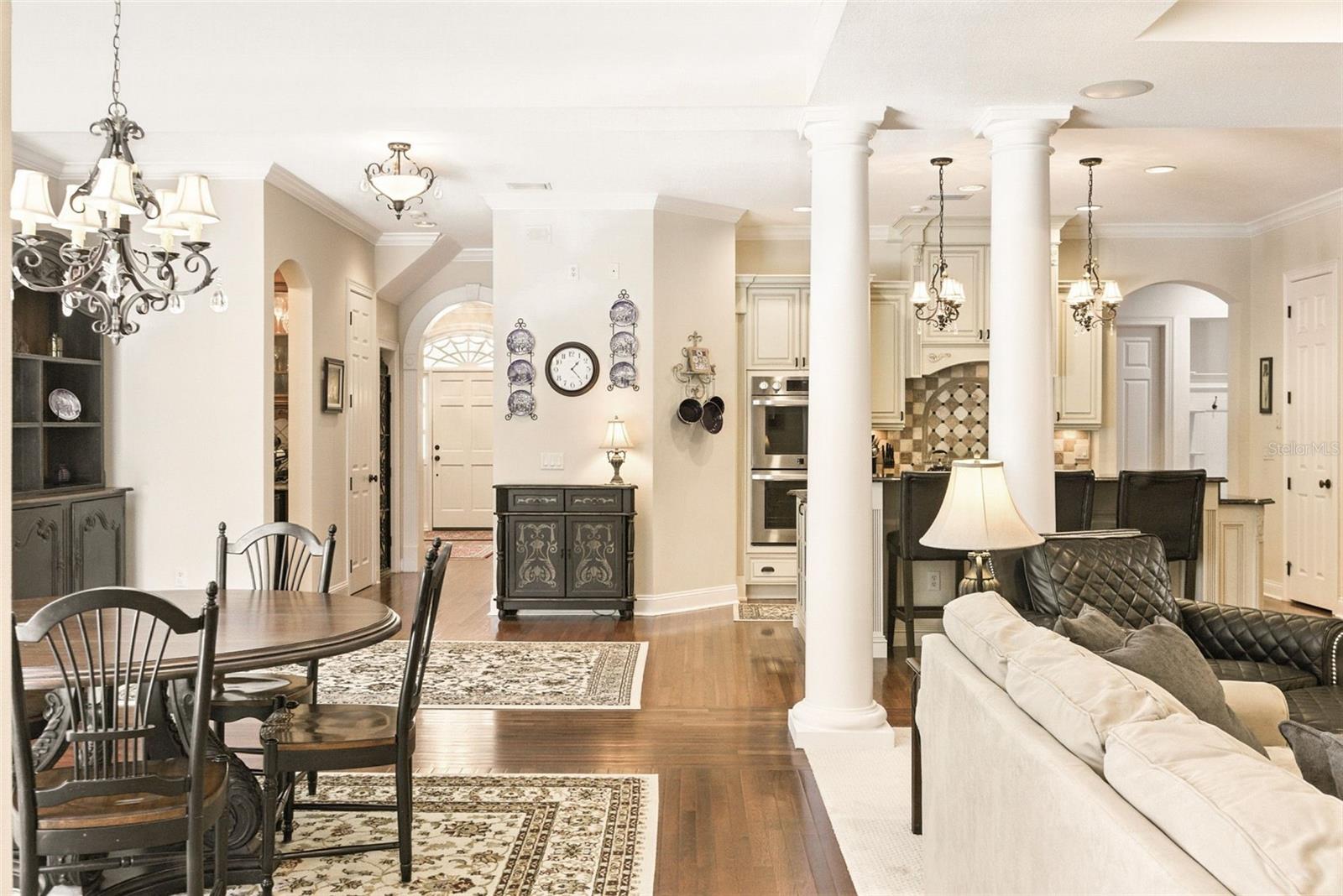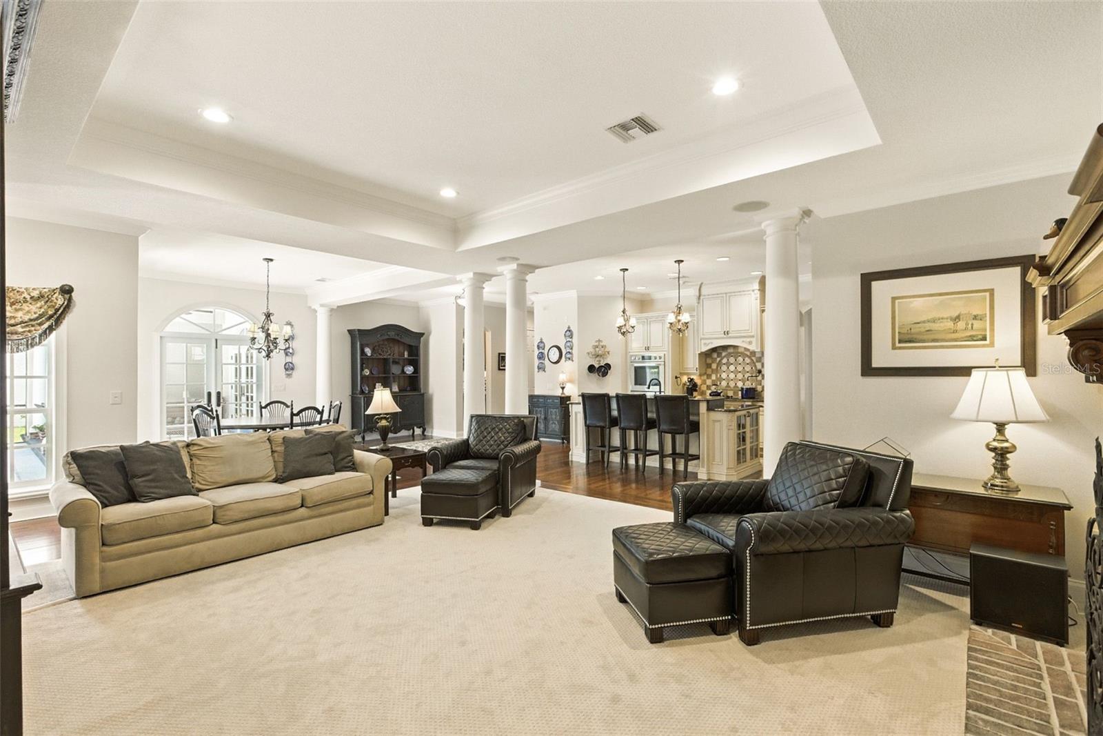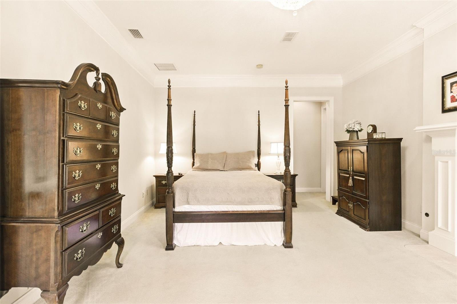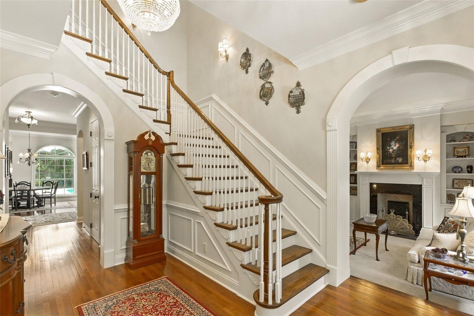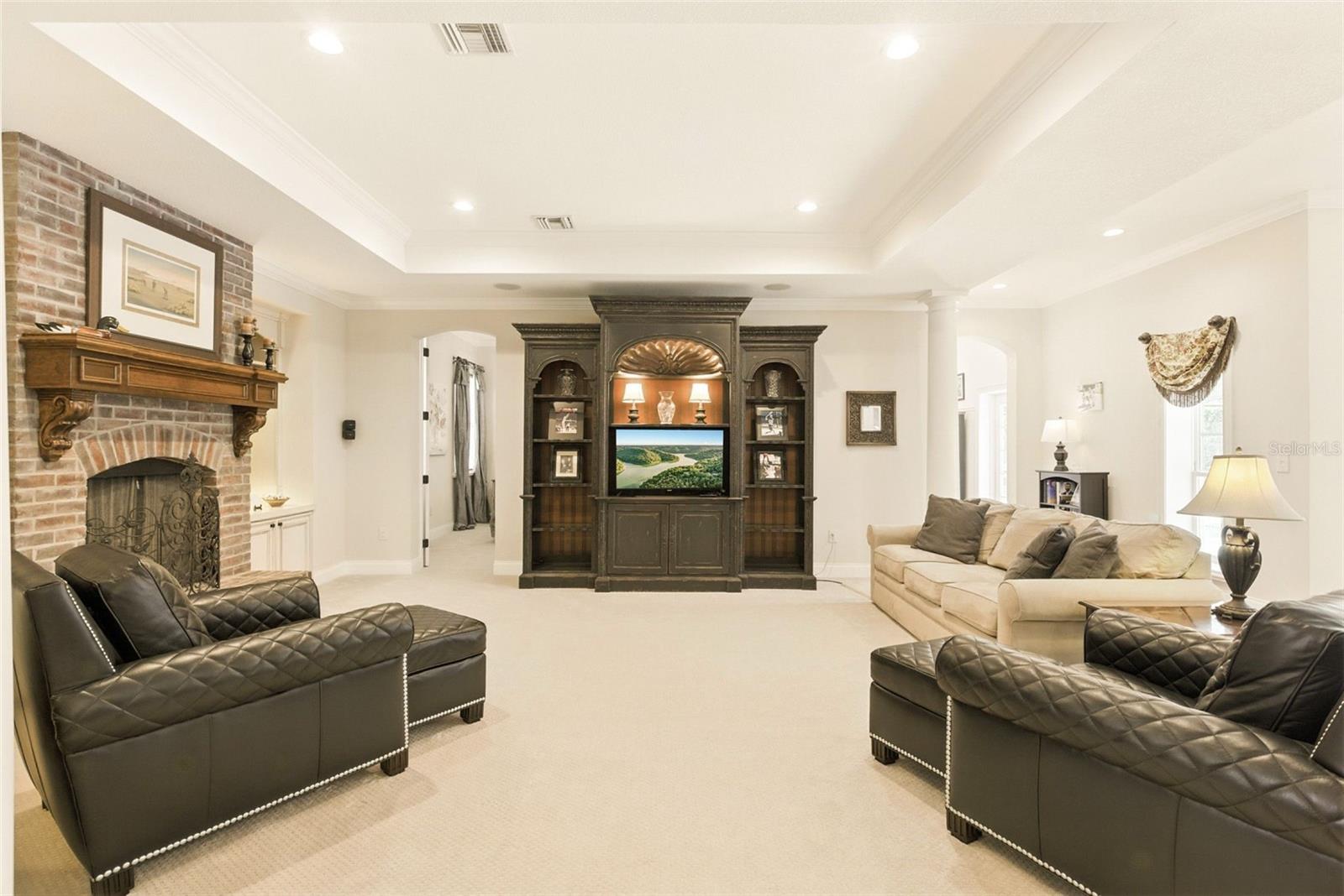 Experience the classic beauty and effortless living of this stately Southern 5-bedroom, 4.5-bathroom home designed for entertaining in the serene Northshore Village of Keene’s Pointe—a guard-gated golf and country club community. Set among lakefront estates, this traditional Georgian Colonial-style residence, built by Stonebridge Homes, sits on a generous half-acre lot and exudes grandeur from the moment you arrive. A welcoming columned front porch leads into a gracious foyer, flanked by a refined library to the left and a formal living room with fireplace to the right. Continue through to discover a stunning music room large enough for a grand piano and an elegant dining room with French doors that open to a sparkling pool oasis. Natural light pours in through Palladian windows, highlighting handcrafted woodwork, hardwood floors, and crystal chandeliers throughout. The butler’s pantry—with wine cooler and ice maker—connects seamlessly to an open kitchen that encompasses a spacious family room anchored by a brick fireplace. Nearby is the secondary staircase that leads to the upstairs media room/Pub-style Bar and the additional 4 bedrooms, while you will see the main floor guest ensuite (BR#5) located off the Family Room in its own wing for maximum privacy. A large bright breakfast area keeps everyone connected and offers direct access to the expansive screened pool and lanai. Perfect for year-round entertaining, the outdoor living space features a covered sitting area, fireplace, and mounted TV—all under roof and adjacent to the enormous pool. Upstairs, you’ll find four bedrooms including a luxurious primary retreat complete with its own fireplace, as well as a versatile media room everyone can enjoy. Additional highlights include two oversized garages—one single bay ideal for a boat or large truck, and a separate two-car garage—both accessible from the rear of the home. A rare combination of classic elegance, flexible space, and value, this home has been meticulously maintained by current original owners and a new roof installed in 2022. A recent remodel/expansion of the home added some 600 sq ft of AC living space to the original plan. Public records are currently being updated to reflect that new amount.