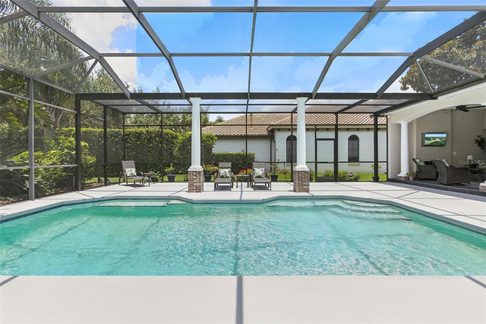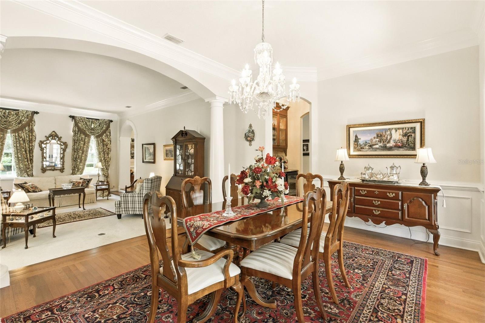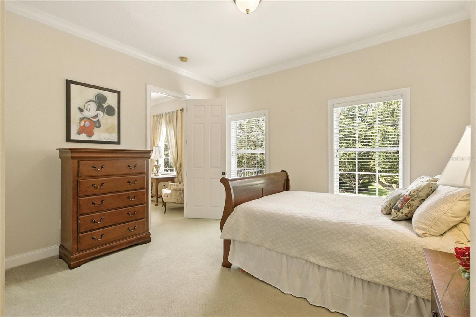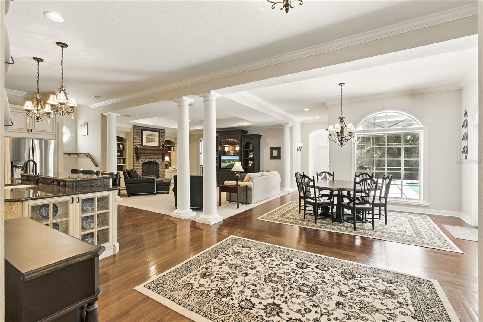 Experience the classic beauty and effortless living of this stately Southern 5-bedroom, 4.5-bathroom home designed for entertaining in the serene Northshore Village of Keene’s Pointe—a guard-gated golf and country club community. Set among lakefront estates, this traditional Georgian Colonial-style residence, built by Stonebridge Homes, sits on a generous half-acre lot and exudes grandeur from the moment you arrive. A welcoming columned front porch leads into a gracious foyer, flanked by a refined library to the left and a formal living room with fireplace to the right. Continue through to discover a stunning music room large enough for a grand piano and an elegant dining room with French doors that open to a sparkling pool oasis. Natural light pours in through Palladian windows, highlighting handcrafted woodwork, hardwood floors, and crystal chandeliers throughout. The butler’s pantry—with wine cooler and ice maker—connects seamlessly to an open kitchen that encompasses a spacious family room anchored by a brick fireplace. Nearby is the secondary staircase that leads to the upstairs media room/Pub-style Bar and the additional 4 bedrooms, while you will see the main floor guest ensuite (BR#5) located off the Family Room in its own wing for maximum privacy. A large bright breakfast area keeps everyone connected and offers direct access to the expansive screened pool and lanai. Perfect for year-round entertaining, the outdoor living space features a covered sitting area, fireplace, and mounted TV—all under roof and adjacent to the enormous pool. Upstairs, you’ll find four bedrooms including a luxurious primary retreat complete with its own fireplace, as well as a versatile media room everyone can enjoy. Additional highlights include two oversized garages—one single bay ideal for a boat or large truck, and a separate two-car garage—both accessible from the rear of the home. A rare combination of classic elegance, flexible space, and value, this home has been meticulously maintained by current original owners and a new roof installed in 2022. A recent remodel/expansion of the home added some 600 sq ft of AC living space to the original plan. Public records are currently being updated to reflect that new amount.
