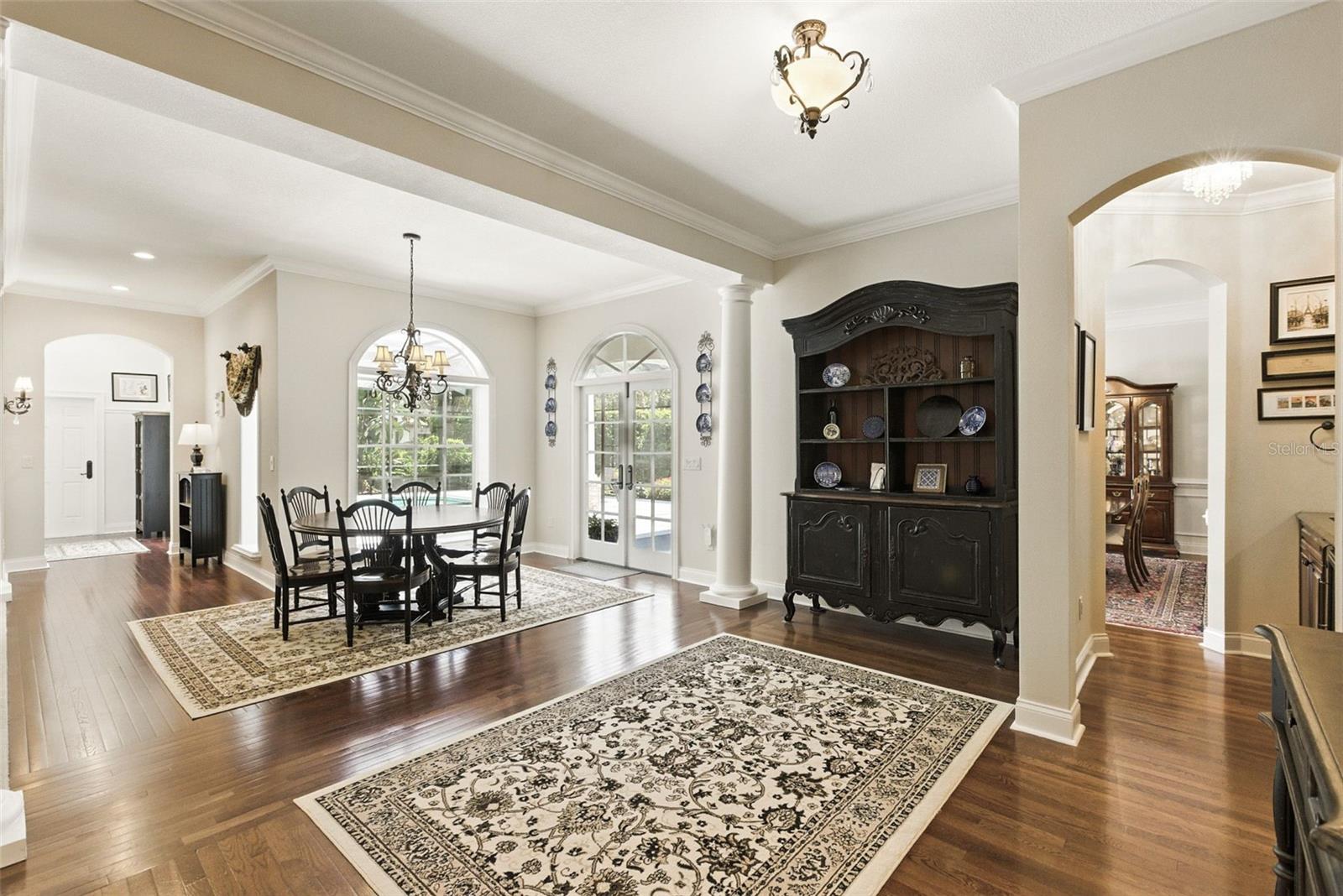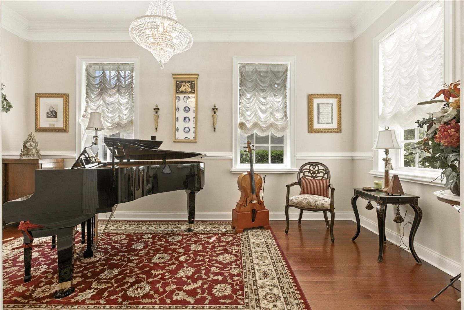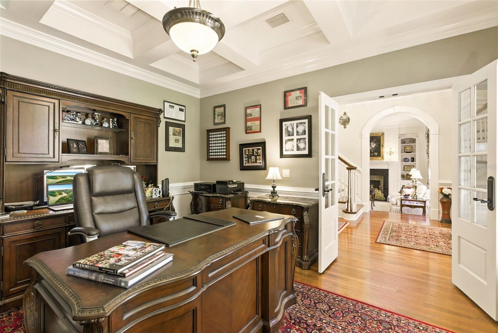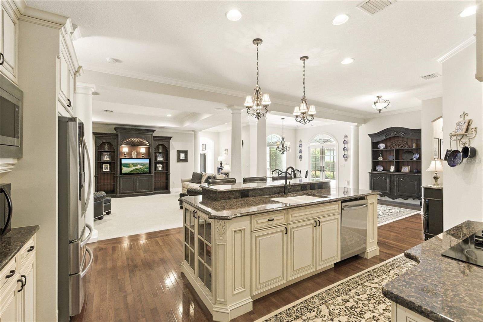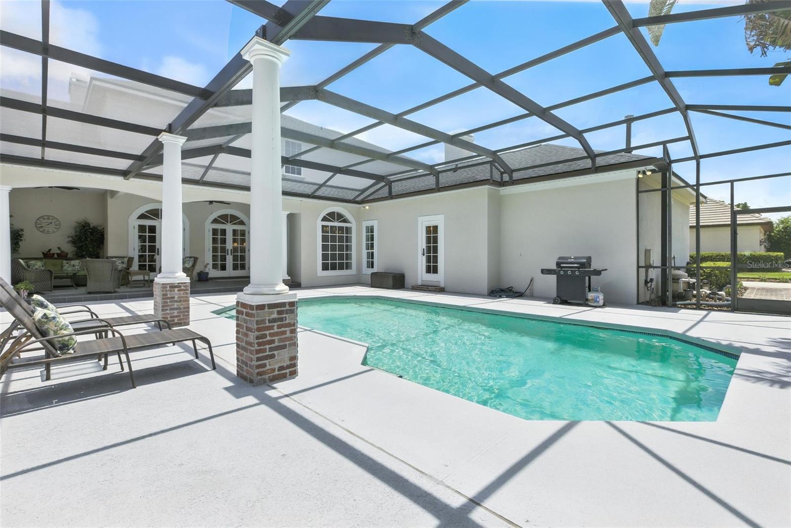 Experience the classic beauty and effortless living of this stately Southern 5-bedroom, 4.5-bathroom home designed for entertaining in the serene Northshore Village of Keene’s Pointe—a guard-gated golf and country club community. Set among lakefront estates, this traditional Georgian Colonial-style residence, built by Stonebridge Homes, sits on a generous half-acre lot and exudes grandeur from the moment you arrive. A welcoming columned front porch leads into a gracious foyer, flanked by a refined library to the left and a formal living room with fireplace to the right. Continue through to discover a stunning music room large enough for a grand piano and an elegant dining room with French doors that open to a sparkling pool oasis. Natural light pours in through Palladian windows, highlighting handcrafted woodwork, hardwood floors, and crystal chandeliers throughout. The butler’s pantry—with wine cooler and ice maker—connects seamlessly to an open kitchen that encompasses a spacious family room anchored by a brick fireplace. Nearby is the secondary staircase that leads to the upstairs media room/Pub-style Bar and the additional 4 bedrooms, while you will see the main floor guest ensuite (BR#5) located off the Family Room in its own wing for maximum privacy. A large bright breakfast area keeps everyone connected and offers direct access to the expansive screened pool and lanai. Perfect for year-round entertaining, the outdoor living space features a covered sitting area, fireplace, and mounted TV—all under roof and adjacent to the enormous pool. Upstairs, you’ll find four bedrooms including a luxurious primary retreat complete with its own fireplace, as well as a versatile media room everyone can enjoy. Additional highlights include two oversized garages—one single bay ideal for a boat or large truck, and a separate two-car garage—both accessible from the rear of the home. A rare combination of classic elegance, flexible space, and value, this home has been meticulously maintained by current original owners and a new roof installed in 2022. A recent remodel/expansion of the home added some 600 sq ft of AC living space to the original plan. Public records are currently being updated to reflect that new amount.