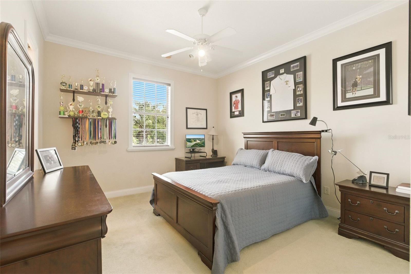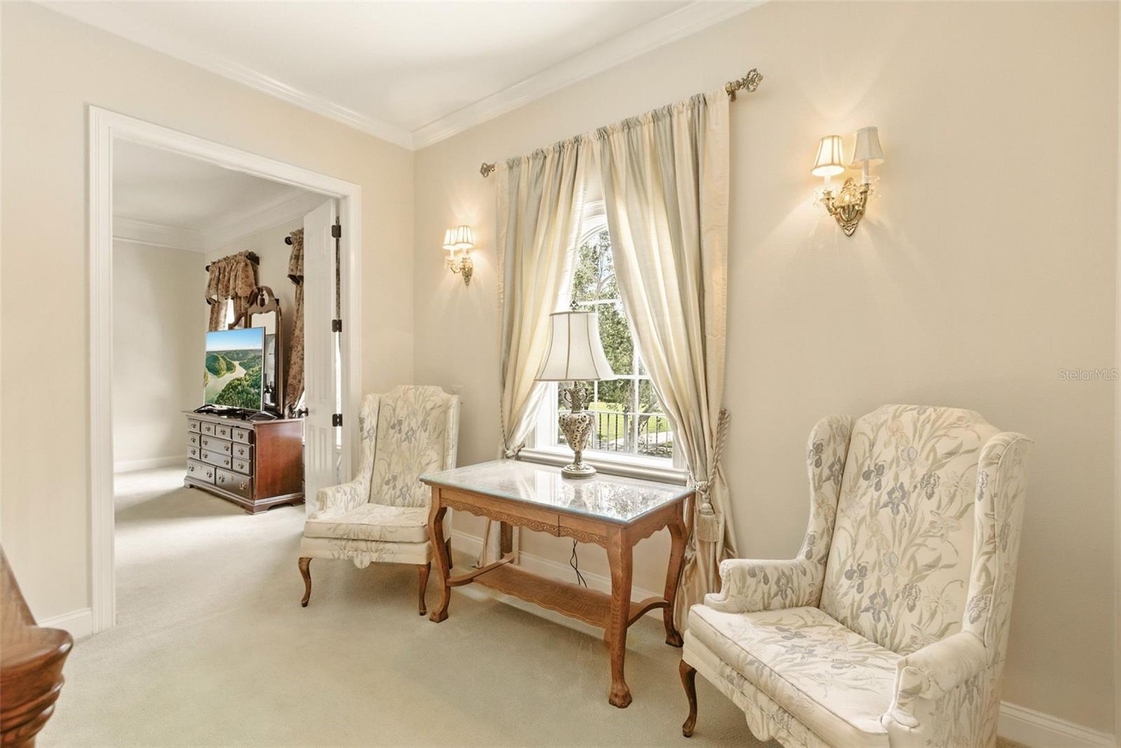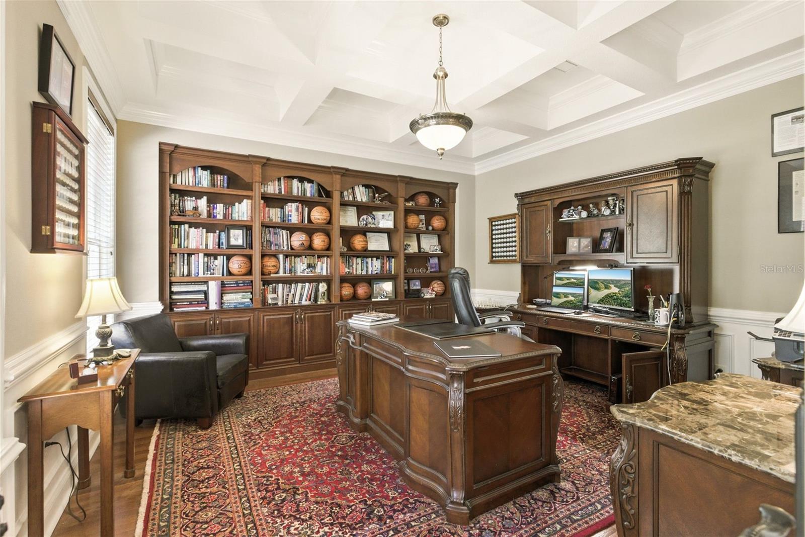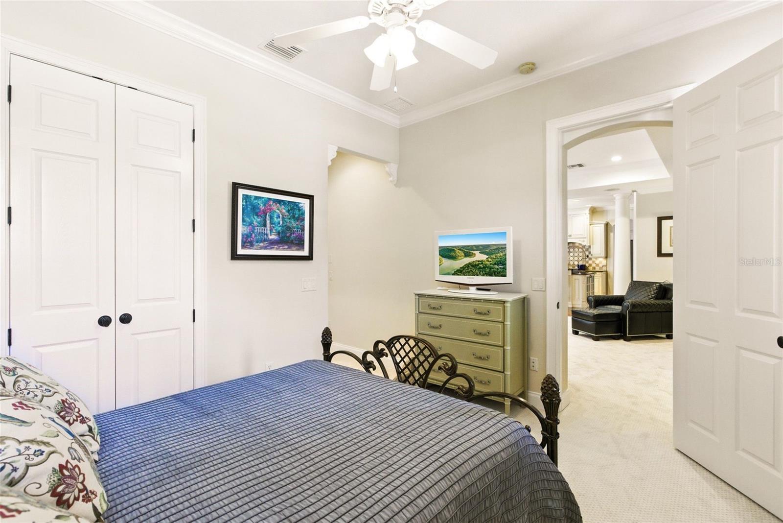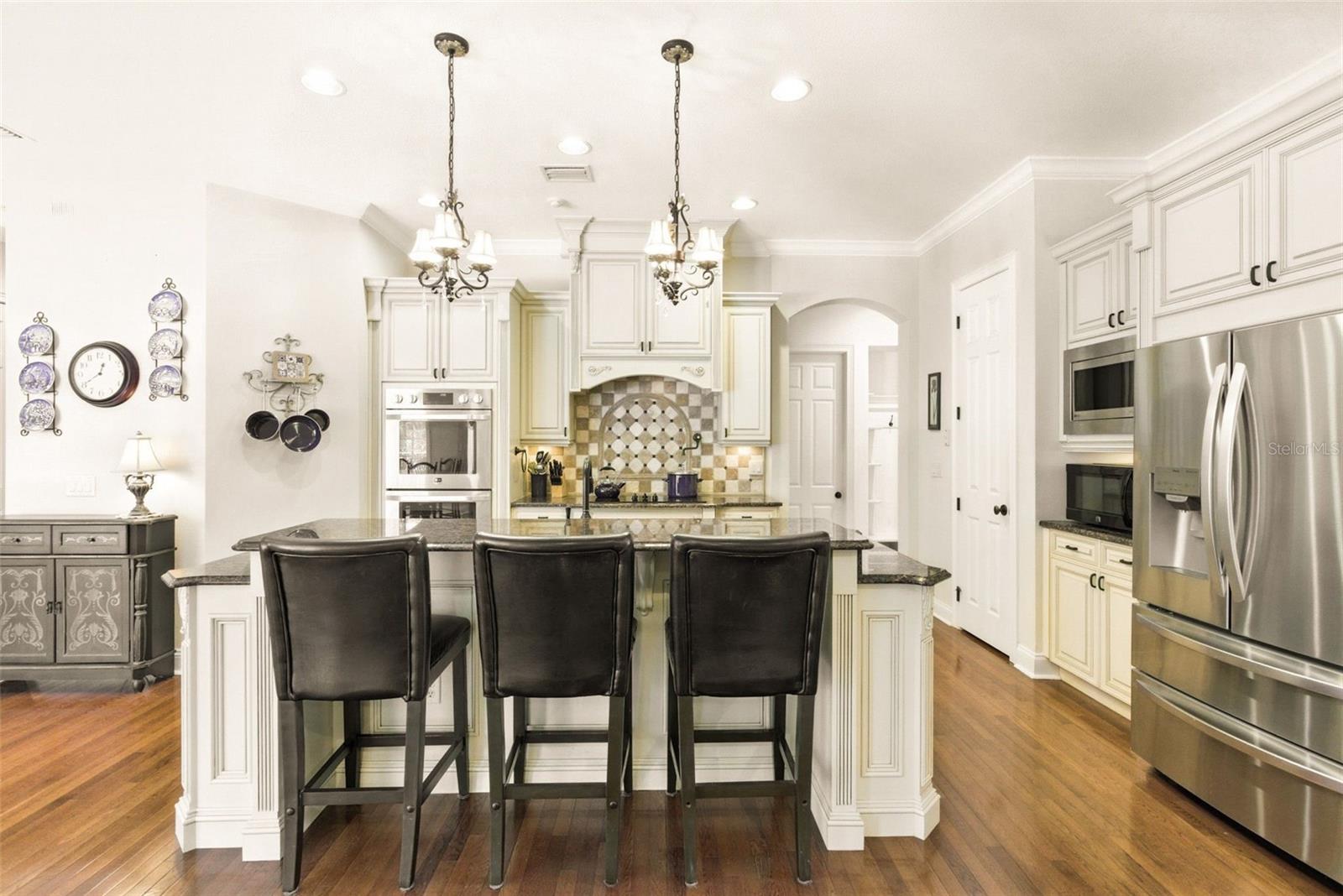Experience the classic beauty and effortless living of this stately Southern 5-bedroom, 4.5-bathroom home designed for entertaining in the serene Northshore Village of Keene’s Pointe—a guard-gated golf and country club community. Set among lakefront estates, this traditional Georgian Colonial-style residence, built by Stonebridge Homes, sits on a generous half-acre lot and exudes grandeur from the moment you arrive. A welcoming columned front porch leads into a gracious foyer, flanked by a refined library to the left and a formal living room with fireplace to the right. Continue through to discover a stunning music room large enough for a grand piano and an elegant dining room with French doors that open to a sparkling pool oasis. Natural light pours in through Palladian windows, highlighting handcrafted woodwork, hardwood floors, and crystal chandeliers throughout. The butler’s pantry—with wine cooler and ice maker—connects seamlessly to an open kitchen that encompasses a spacious family room anchored by a brick fireplace. Nearby is the secondary staircase that leads to the upstairs media room/Pub-style Bar and the additional 4 bedrooms, while you will see the main floor guest ensuite (BR#5) located off the Family Room in its own wing for maximum privacy. A large bright breakfast area keeps everyone connected and offers direct access to the expansive screened pool and lanai. Perfect for year-round entertaining, the outdoor living space features a covered sitting area, fireplace, and mounted TV—all under roof and adjacent to the enormous pool. Upstairs, you’ll find four bedrooms including a luxurious primary retreat complete with its own fireplace, as well as a versatile media room everyone can enjoy. Additional highlights include two oversized garages—one single bay ideal for a boat or large truck, and a separate two-car garage—both accessible from the rear of the home. A rare combination of classic elegance, flexible space, and value, this home has been meticulously maintained by current original owners and a new roof installed in 2022. A recent remodel/expansion of the home added some 600 sq ft of AC living space to the original plan. Public records are currently being updated to reflect that new amount.