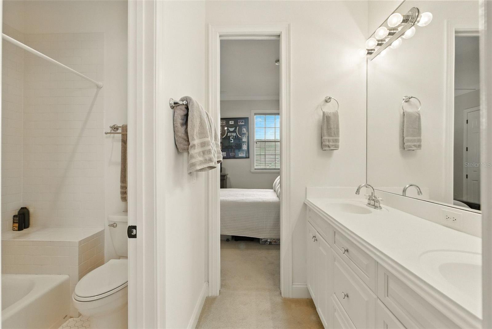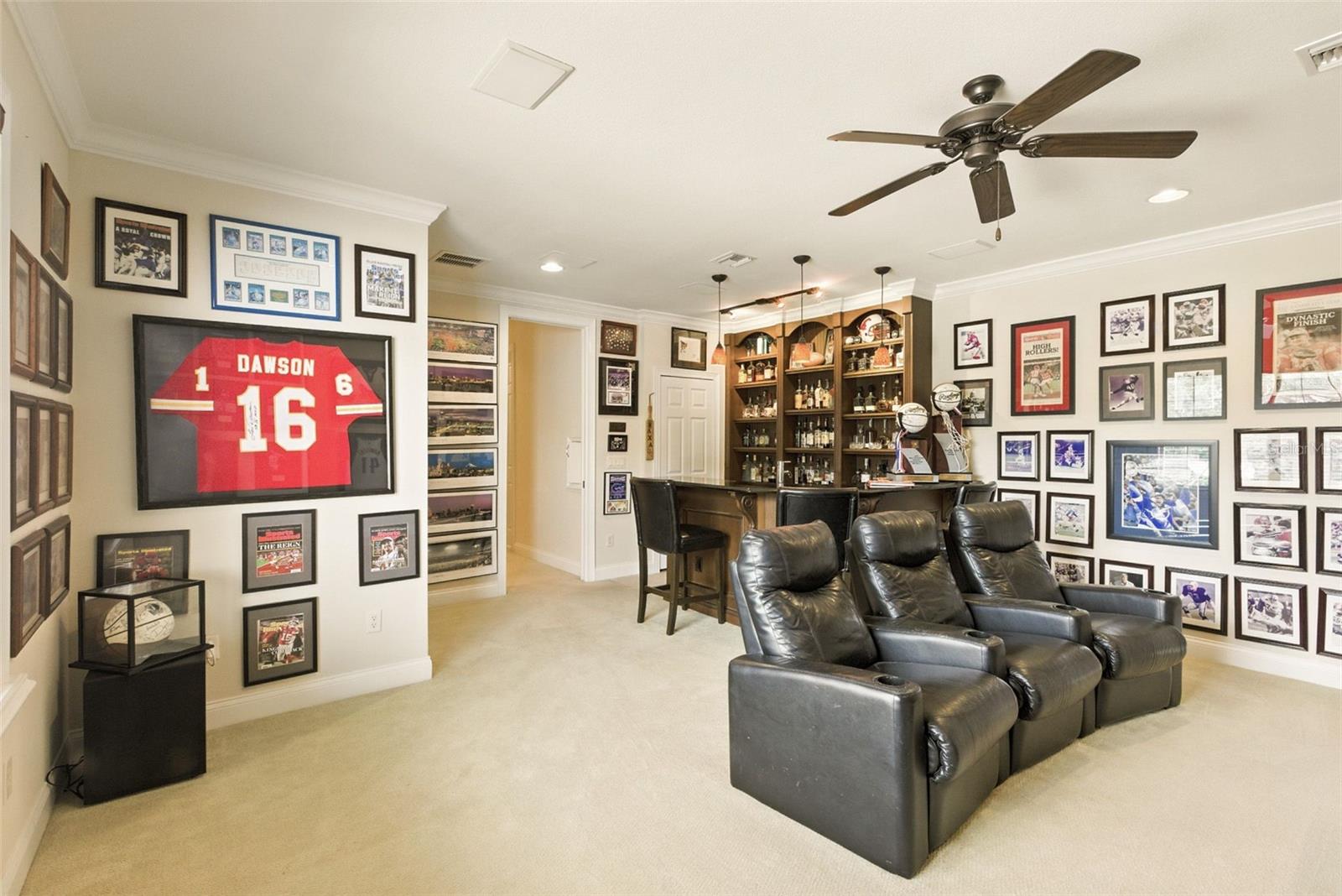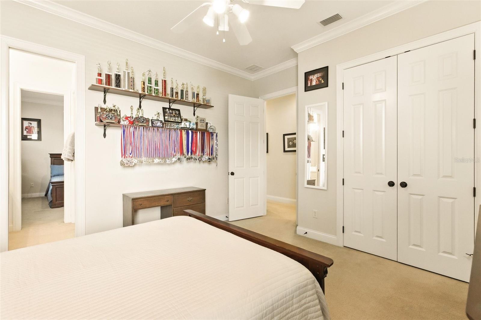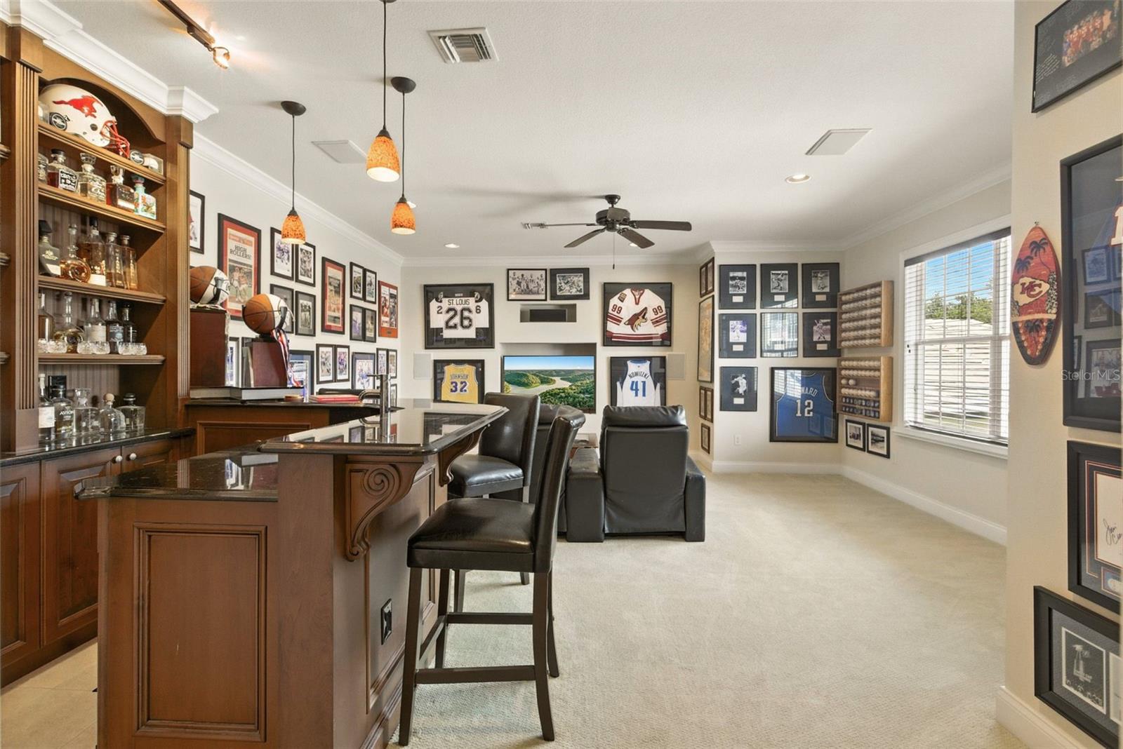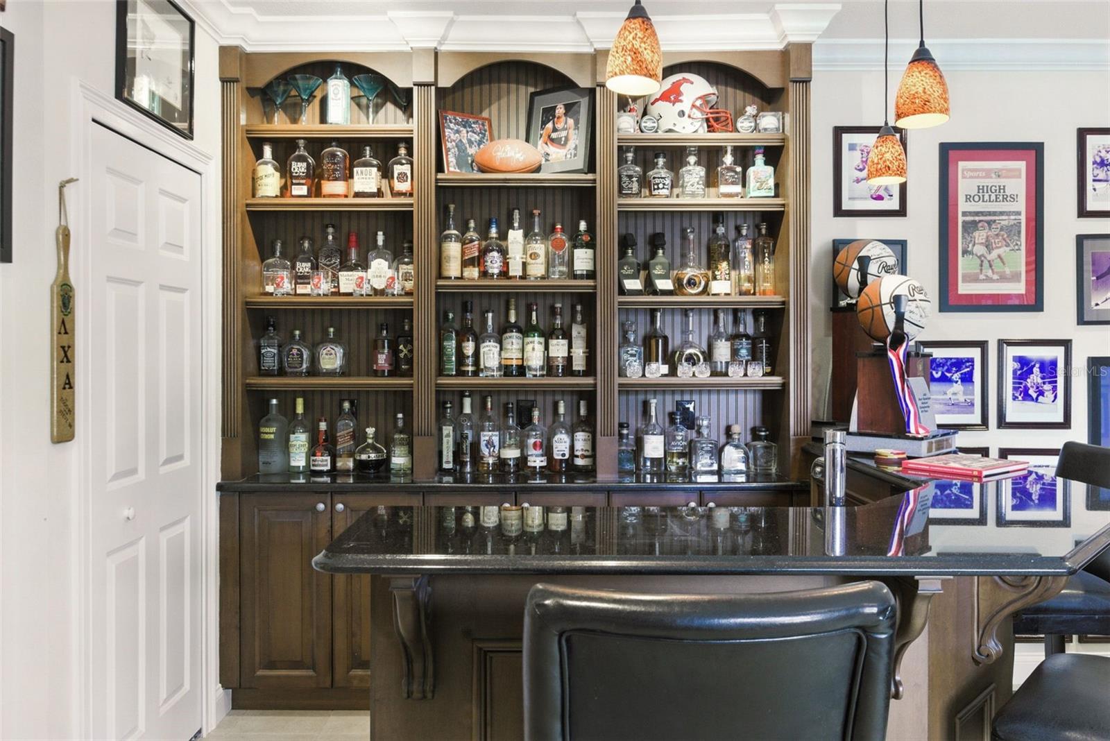 Experience the classic beauty and effortless living of this stately Southern 5-bedroom, 4.5-bathroom home designed for entertaining in the serene Northshore Village of Keene’s Pointe—a guard-gated golf and country club community. Set among lakefront estates, this traditional Georgian Colonial-style residence, built by Stonebridge Homes, sits on a generous half-acre lot and exudes grandeur from the moment you arrive. A welcoming columned front porch leads into a gracious foyer, flanked by a refined library to the left and a formal living room with fireplace to the right. Continue through to discover a stunning music room large enough for a grand piano and an elegant dining room with French doors that open to a sparkling pool oasis. Natural light pours in through Palladian windows, highlighting handcrafted woodwork, hardwood floors, and crystal chandeliers throughout. The butler’s pantry—with wine cooler and ice maker—connects seamlessly to an open kitchen that encompasses a spacious family room anchored by a brick fireplace. Nearby is the secondary staircase that leads to the upstairs media room/Pub-style Bar and the additional 4 bedrooms, while you will see the main floor guest ensuite (BR#5) located off the Family Room in its own wing for maximum privacy. A large bright breakfast area keeps everyone connected and offers direct access to the expansive screened pool and lanai. Perfect for year-round entertaining, the outdoor living space features a covered sitting area, fireplace, and mounted TV—all under roof and adjacent to the enormous pool. Upstairs, you’ll find four bedrooms including a luxurious primary retreat complete with its own fireplace, as well as a versatile media room everyone can enjoy. Additional highlights include two oversized garages—one single bay ideal for a boat or large truck, and a separate two-car garage—both accessible from the rear of the home. A rare combination of classic elegance, flexible space, and value, this home has been meticulously maintained by current original owners and a new roof installed in 2022. A recent remodel/expansion of the home added some 600 sq ft of AC living space to the original plan. Public records are currently being updated to reflect that new amount.