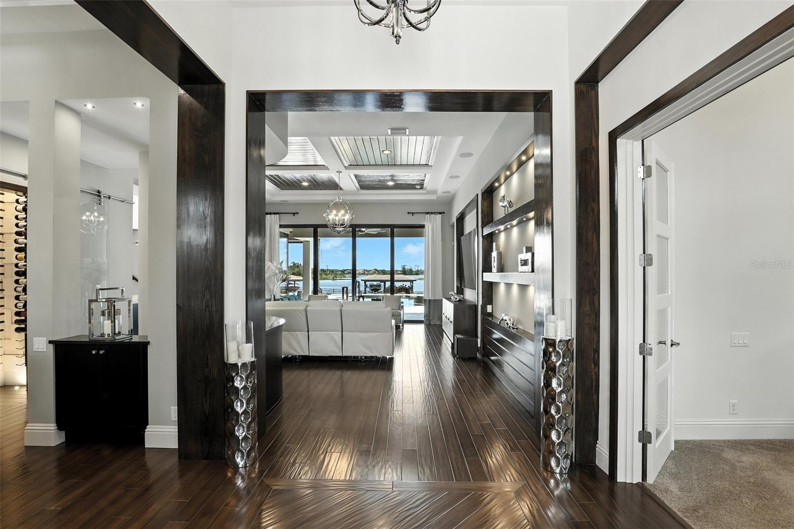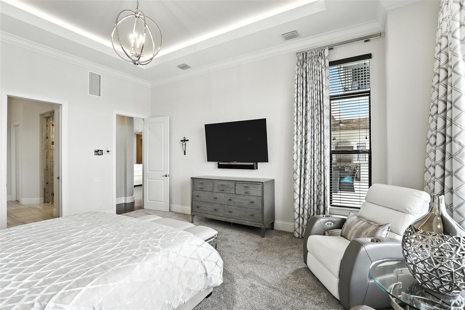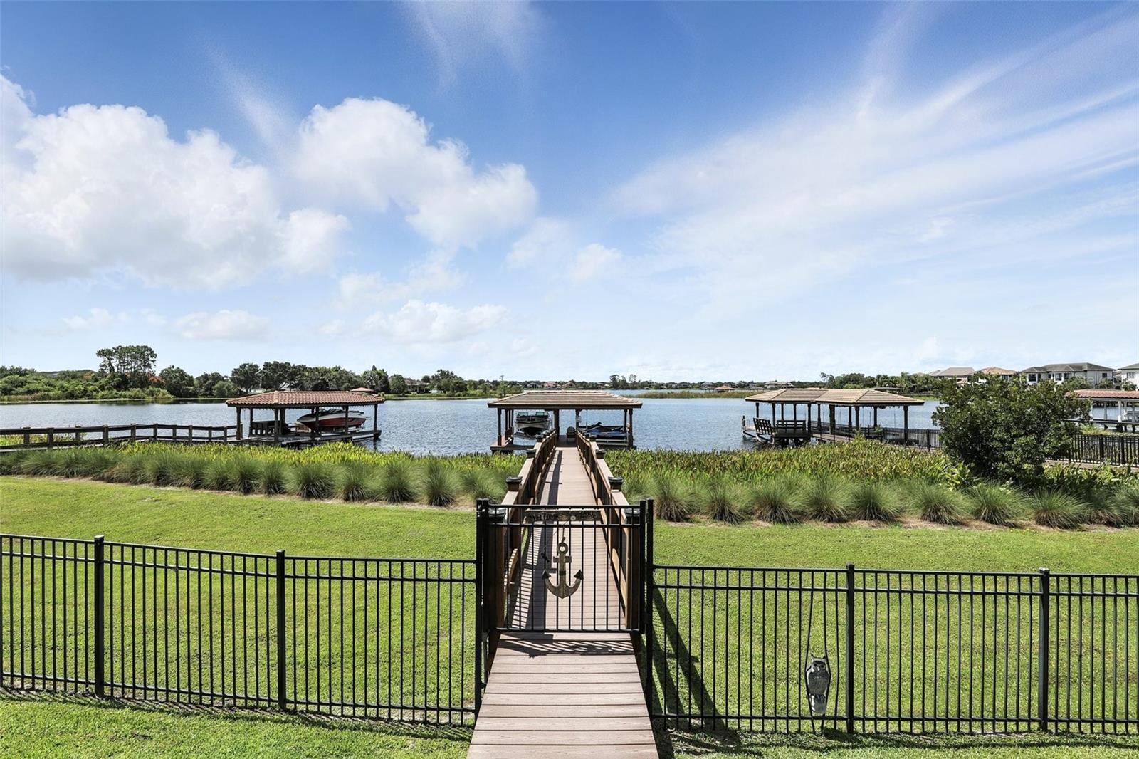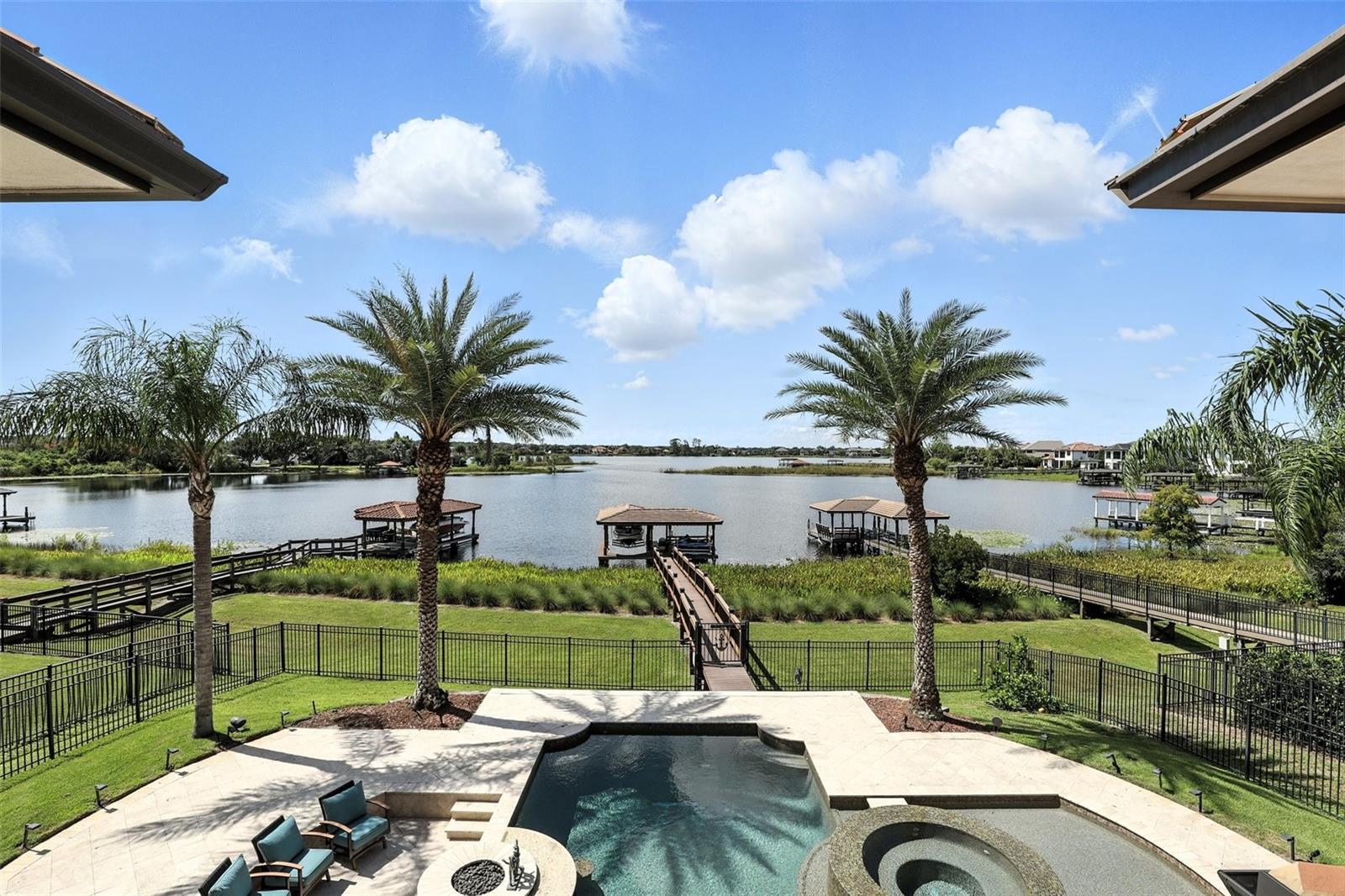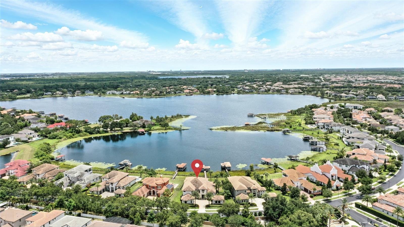 Experience the essence of luxury lakefront living in this stunning contemporary Mediterranean estate, ideally positioned on Lake Burden within the exclusive gated community of Casa Del Lago in Windermere. This elegant two-story residence combines refined design, functionality, and breathtaking panoramic lake views throughout. The gourmet kitchen features custom dark cabinetry, quartz countertops, a designer mosaic backsplash, pendant lighting, and top-of-the-line stainless-steel appliances. The primary suite is a serene retreat showcasing peaceful lake views, a spa-inspired bathroom with a freestanding soaking tub, dual vanities, and a custom-designed walk-in closet. This remarkable home also includes a fully equipped theater room, a complete gym setup, multiple TVs, and select designer furniture pieces in the dining room, living room, and office, along with all chandeliers and lighting fixtures. Outdoors, enjoy a resort-style pool, spacious travertine patio, and a private dock with lifts for both a Yamaha boat and Jet Ski, which are included in the sale for your convenience. With its three-car garage, lush landscaping, and proximity to fine dining, golf, and top-rated schools, this residence exemplifies modern sophistication and lakefront elegance in Windermere.