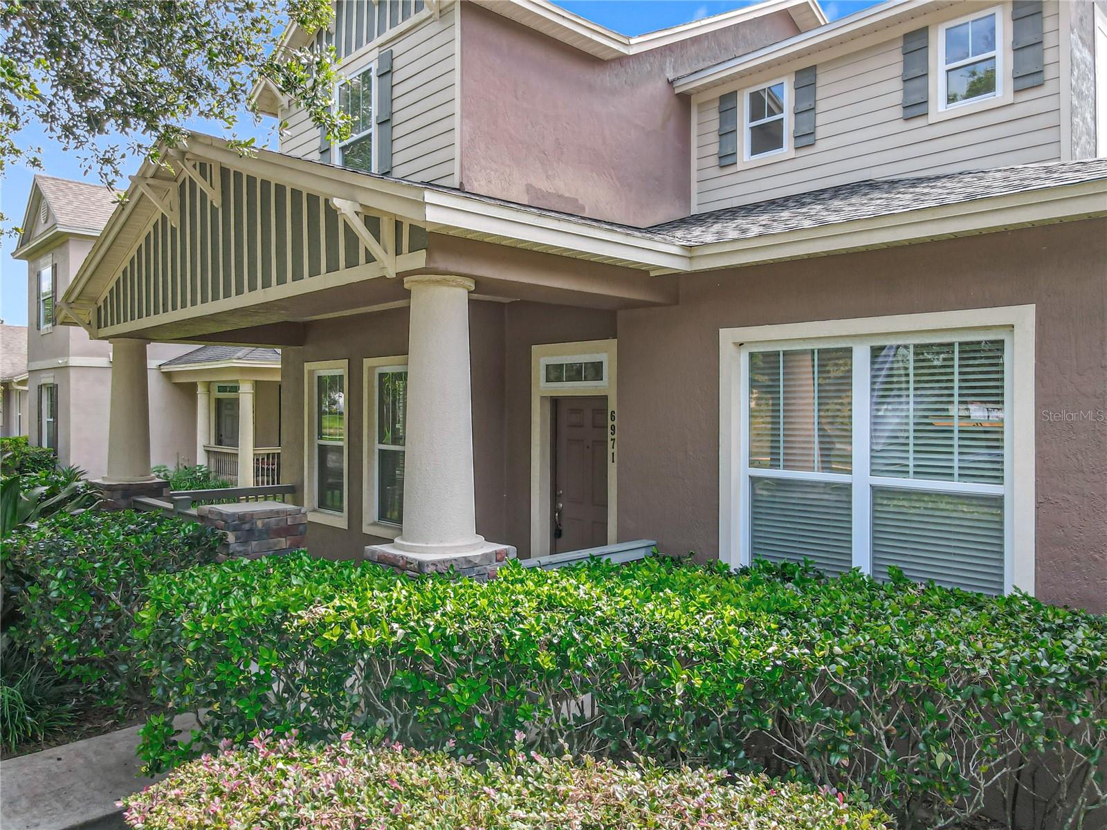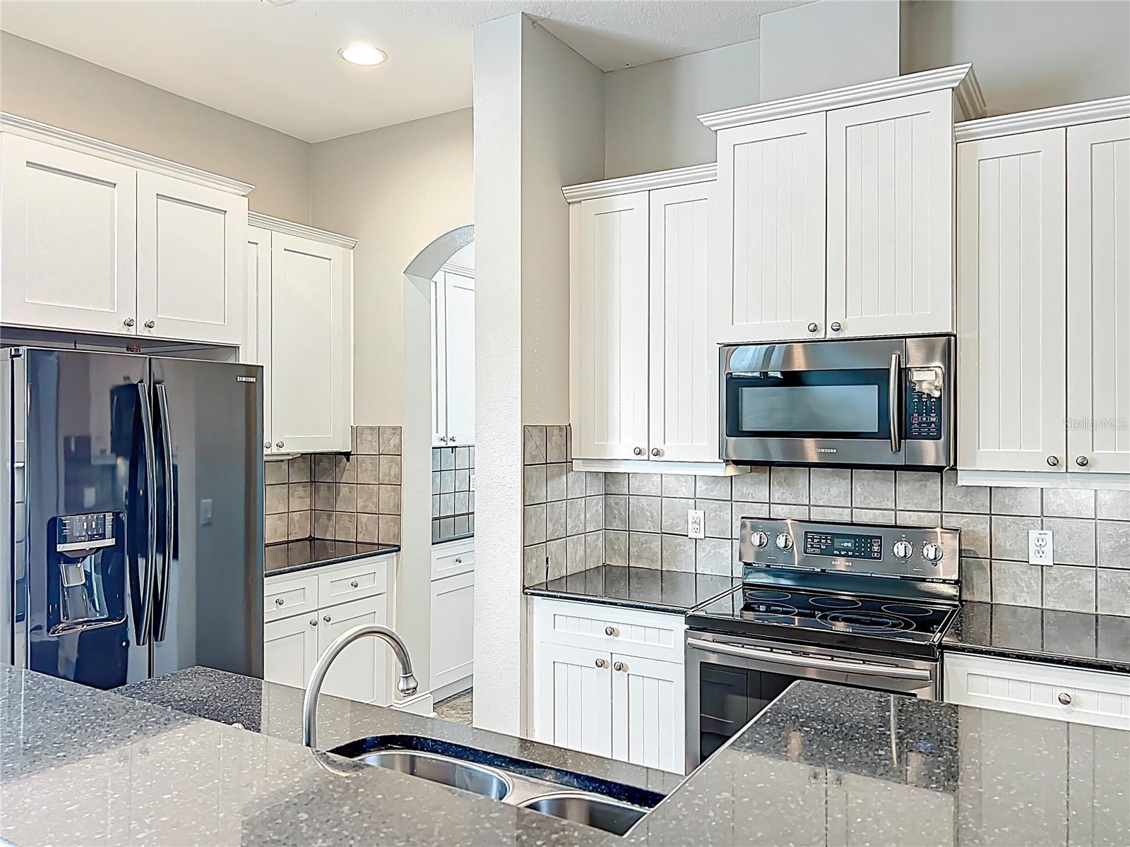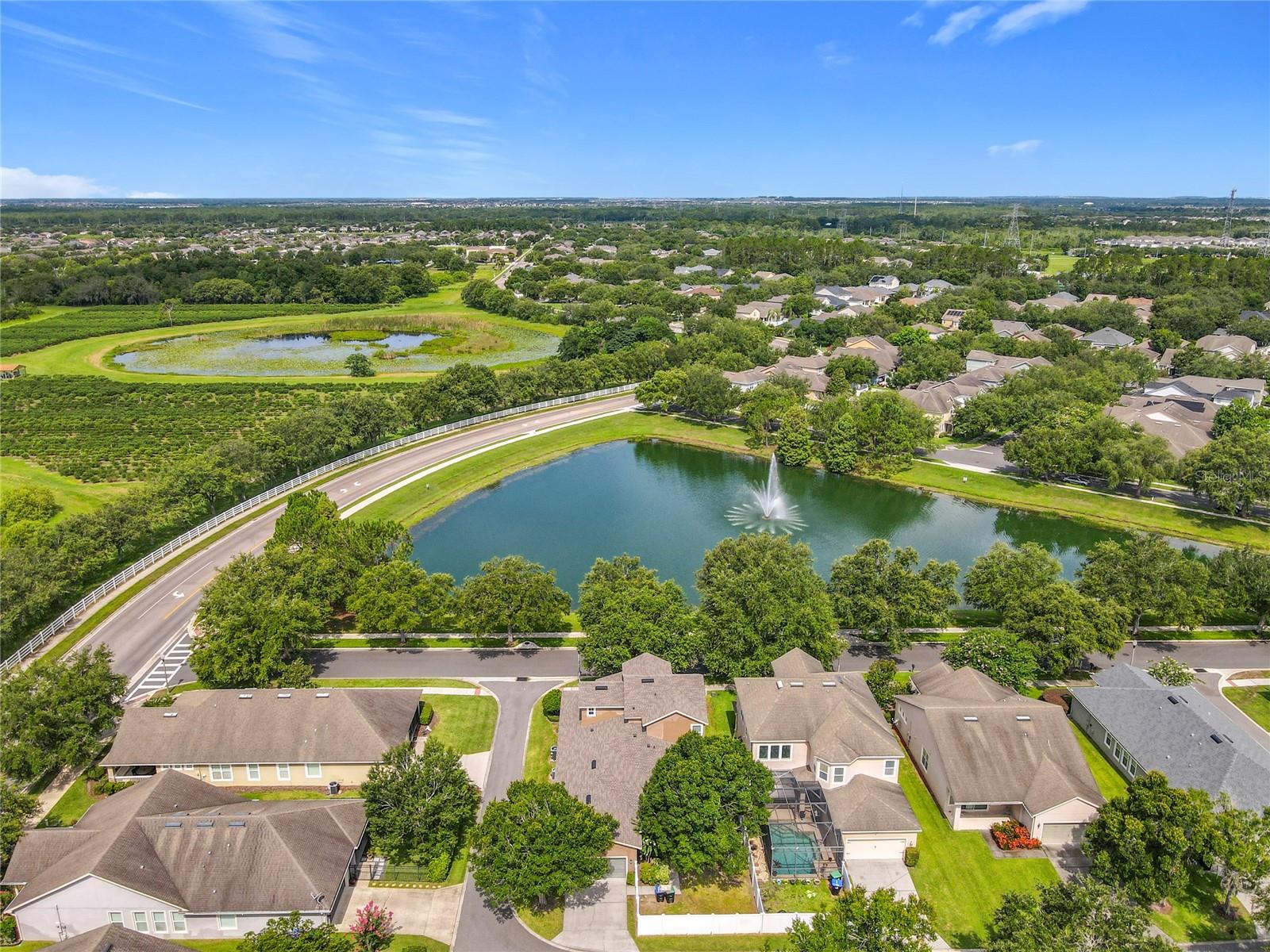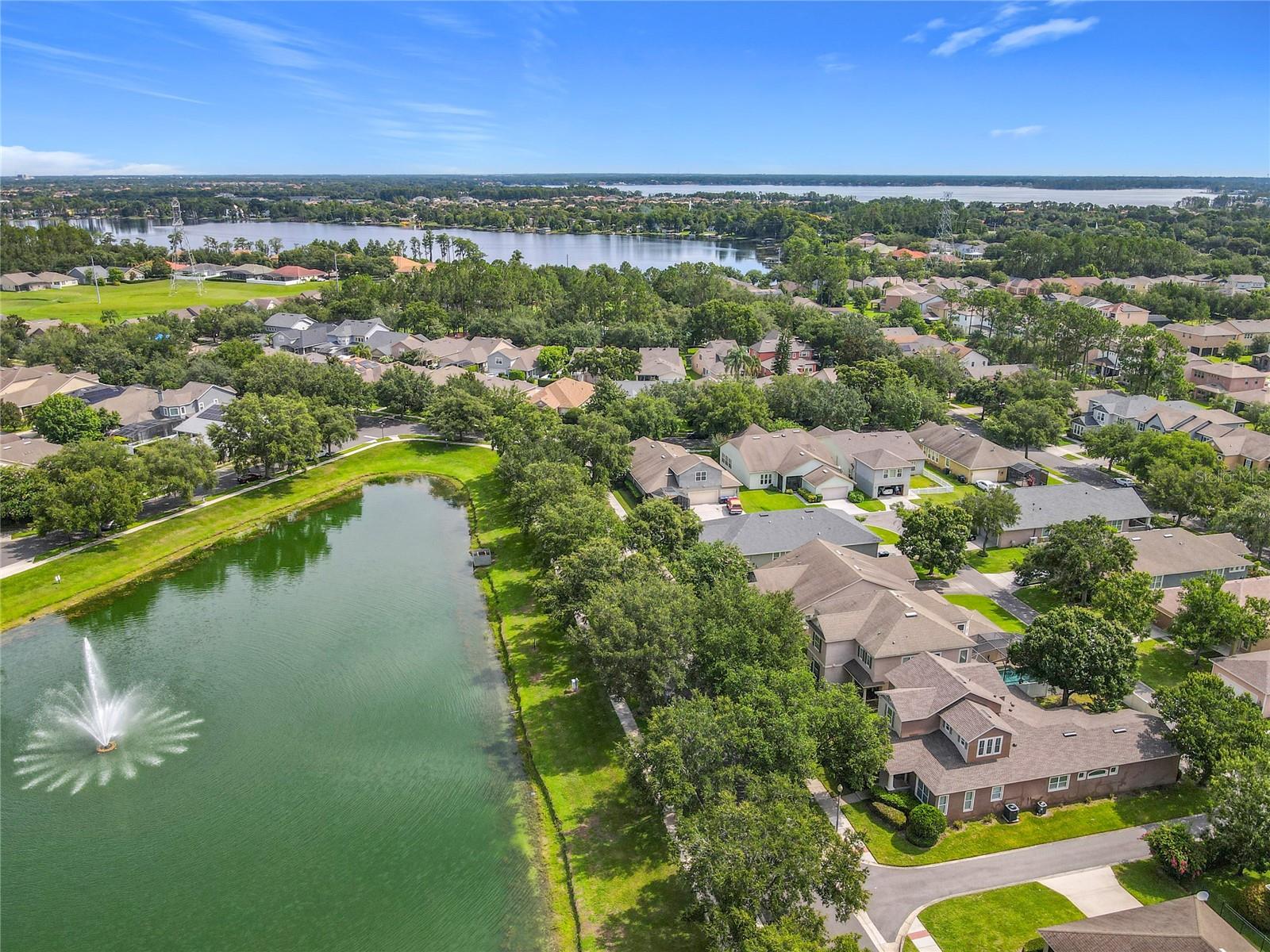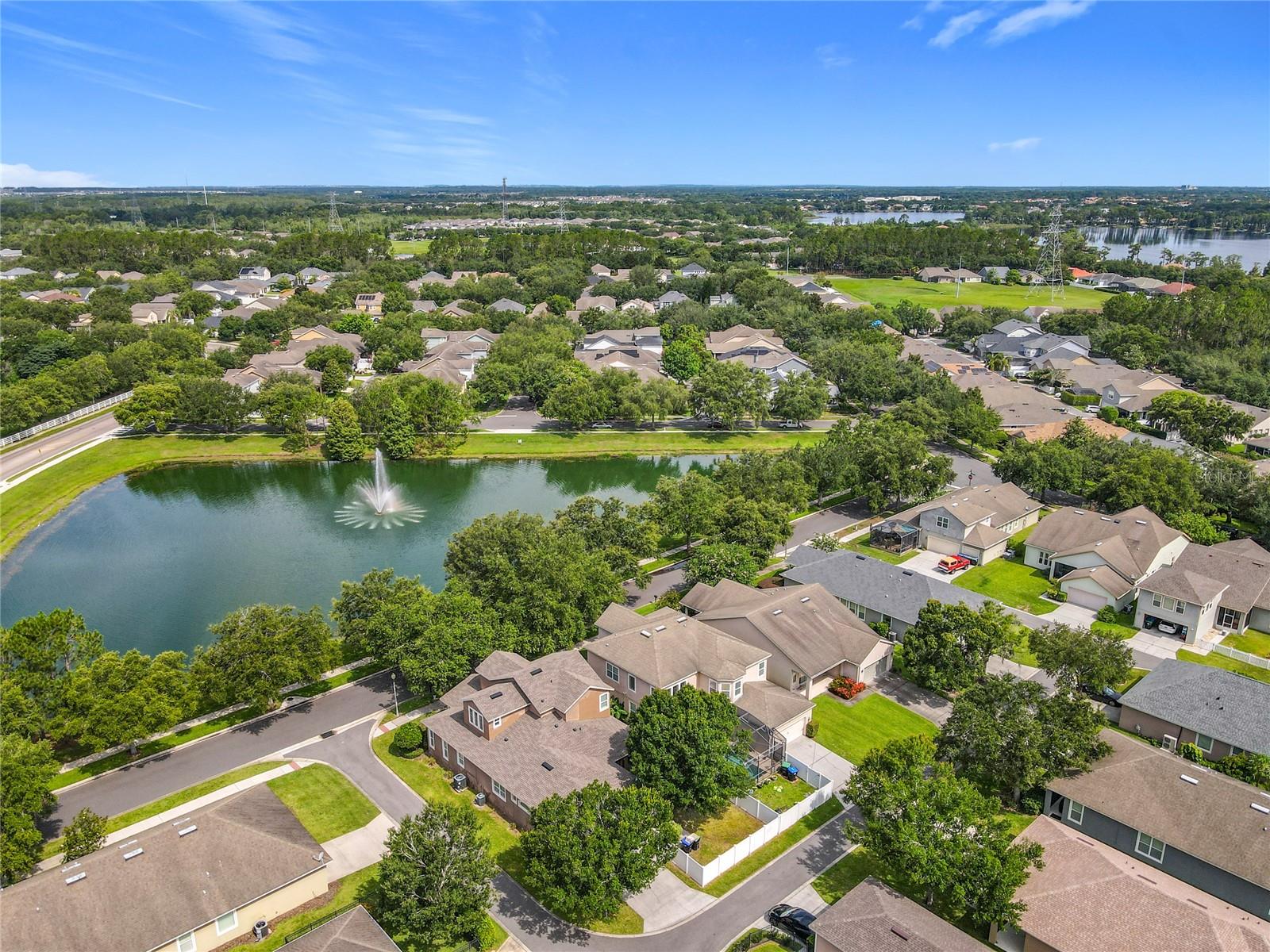 Discover this stunning 2-story, 4-bedroom, 3-bathroom home. Enjoy breathtaking views of the fountain pond from the covered front lanai, beautifully accented with stacked stone columns. Step inside to be welcomed by arched walkways, wood-paneled walls, and elegant wood laminate flooring. The home boasts a separate formal dining room with a tray ceiling across from the formal living room, creating a perfect space for entertaining. The open-concept kitchen and living room provide a warm and inviting atmosphere, featuring white crown cabinetry, black Silestone granite countertops, an island sink and bar, extended counter space, and a walk-in butlers pantry with a prep area. With ample cabinet storage and counter space galore. The black and stainless appliances include a dishwasher, microwave, and convection oven. The spacious master suite, located downstairs, features a large walk-in closet and an ensuite bathroom with double sinks, a walk-in shower, and a garden tub. Upstairs, you'll find generously sized guest bedrooms with walk-in closets and a double-sink guest bathroom. A full guest bathroom with a walk-in shower is conveniently located downstairs. The screened-in back patio, private white vinyl fencing, and a rear entrance garage. This home is loaded with extra features and is nestled in a vibrant community offering a pool, playground, tennis courts and 4 hole-putting green.