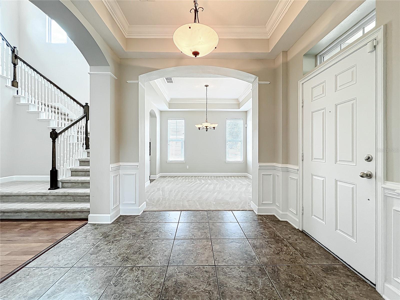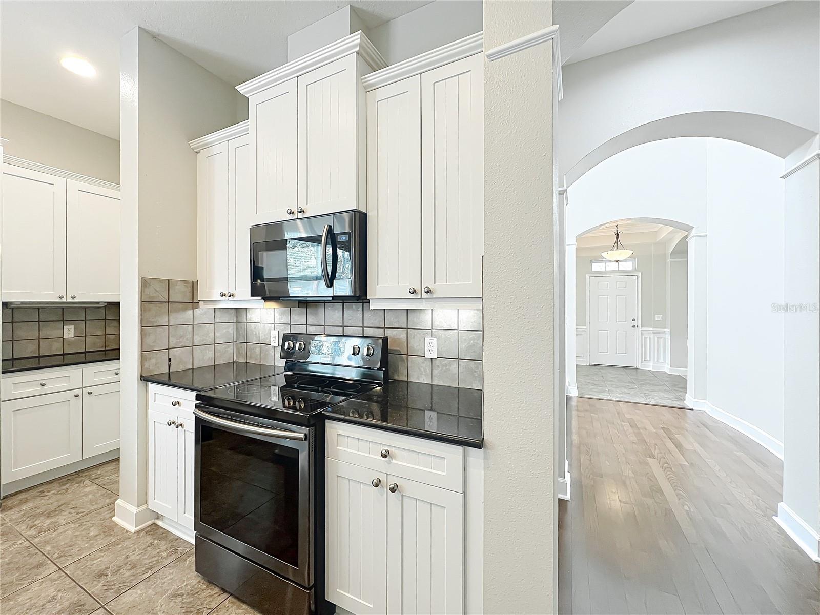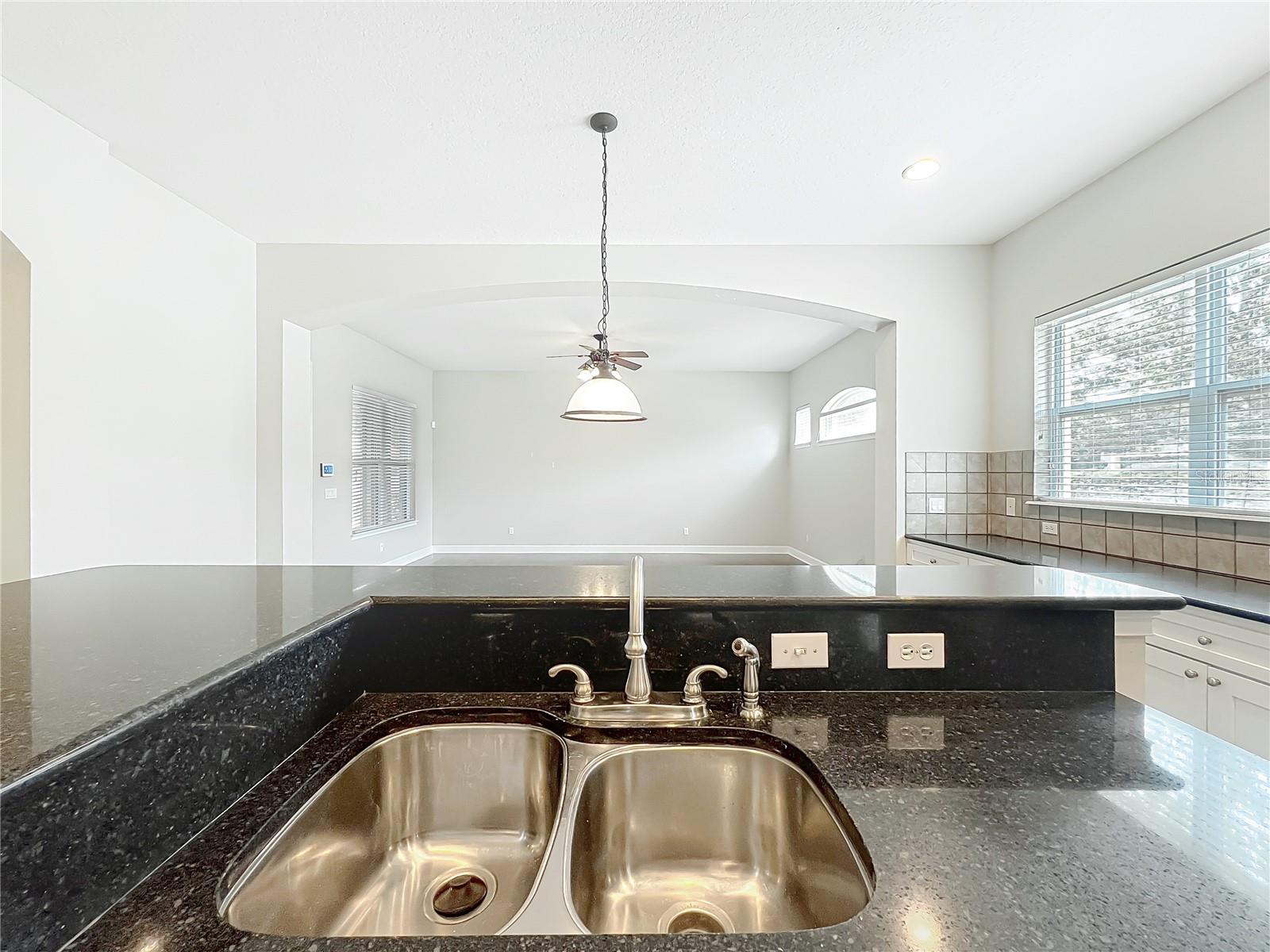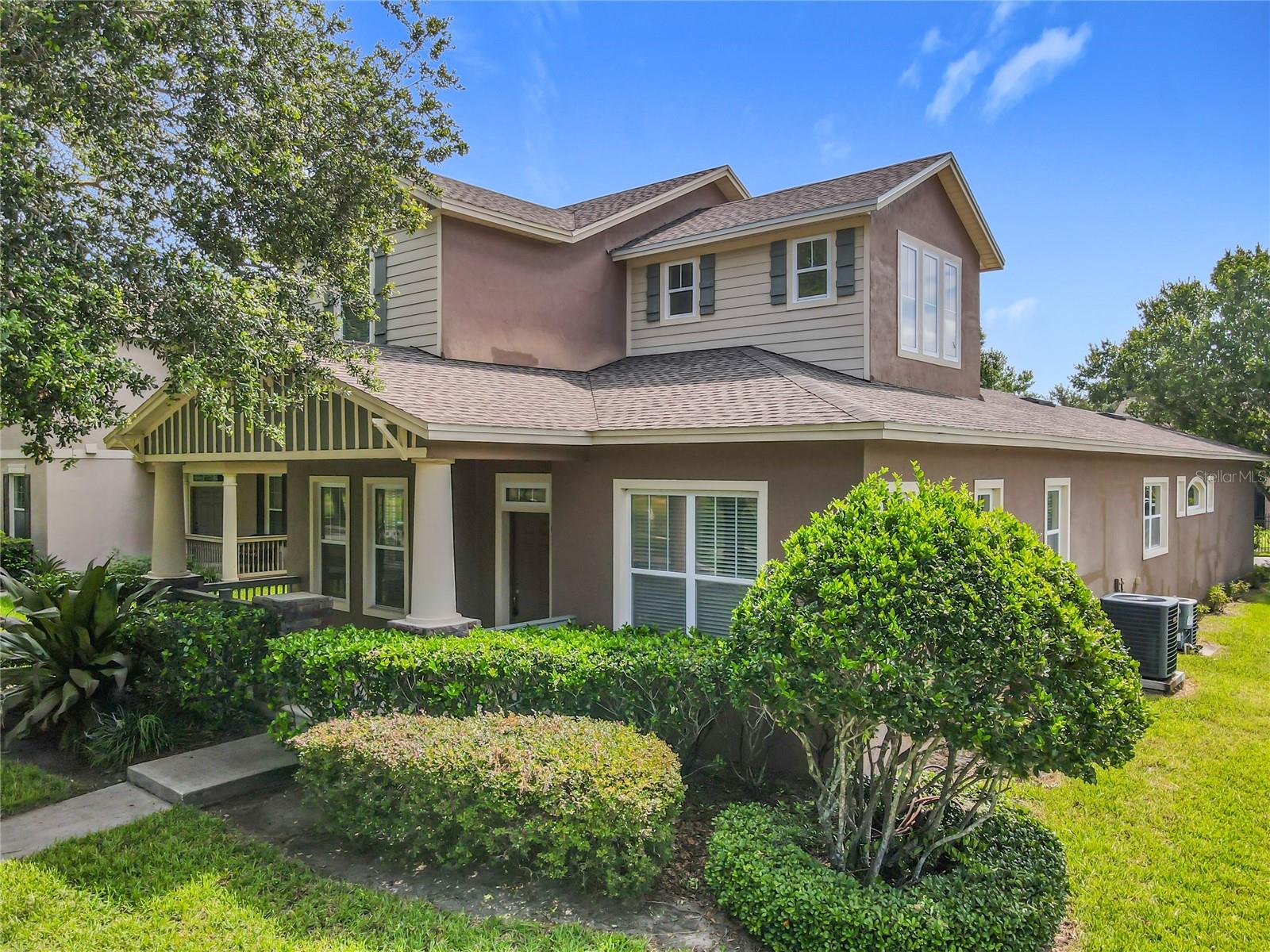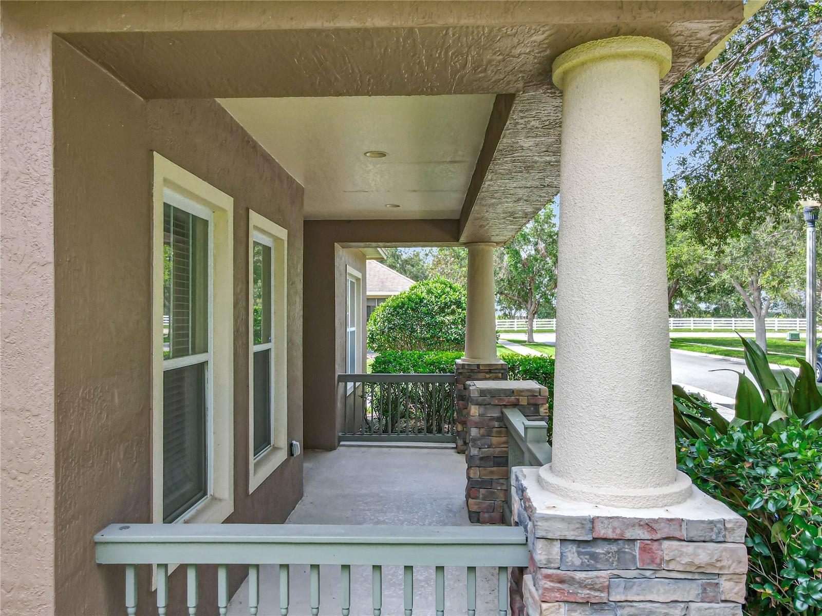 Discover this stunning 2-story, 4-bedroom, 3-bathroom home. Enjoy breathtaking views of the fountain pond from the covered front lanai, beautifully accented with stacked stone columns. Step inside to be welcomed by arched walkways, wood-paneled walls, and elegant wood laminate flooring. The home boasts a separate formal dining room with a tray ceiling across from the formal living room, creating a perfect space for entertaining. The open-concept kitchen and living room provide a warm and inviting atmosphere, featuring white crown cabinetry, black Silestone granite countertops, an island sink and bar, extended counter space, and a walk-in butlers pantry with a prep area. With ample cabinet storage and counter space galore. The black and stainless appliances include a dishwasher, microwave, and convection oven. The spacious master suite, located downstairs, features a large walk-in closet and an ensuite bathroom with double sinks, a walk-in shower, and a garden tub. Upstairs, you'll find generously sized guest bedrooms with walk-in closets and a double-sink guest bathroom. A full guest bathroom with a walk-in shower is conveniently located downstairs. The screened-in back patio, private white vinyl fencing, and a rear entrance garage. This home is loaded with extra features and is nestled in a vibrant community offering a pool, playground, tennis courts and 4 hole-putting green.