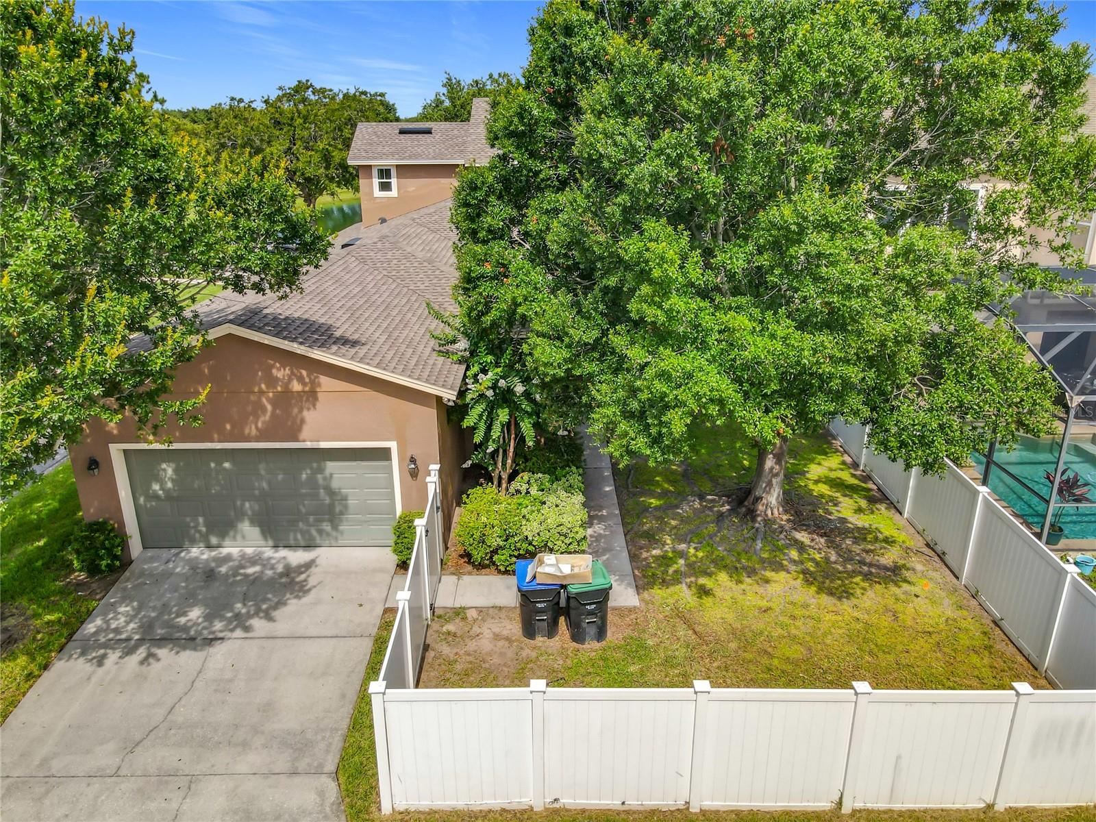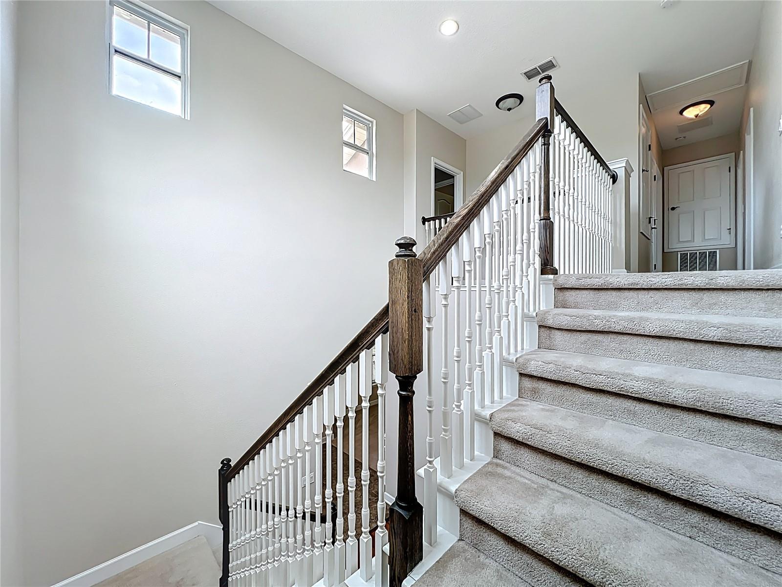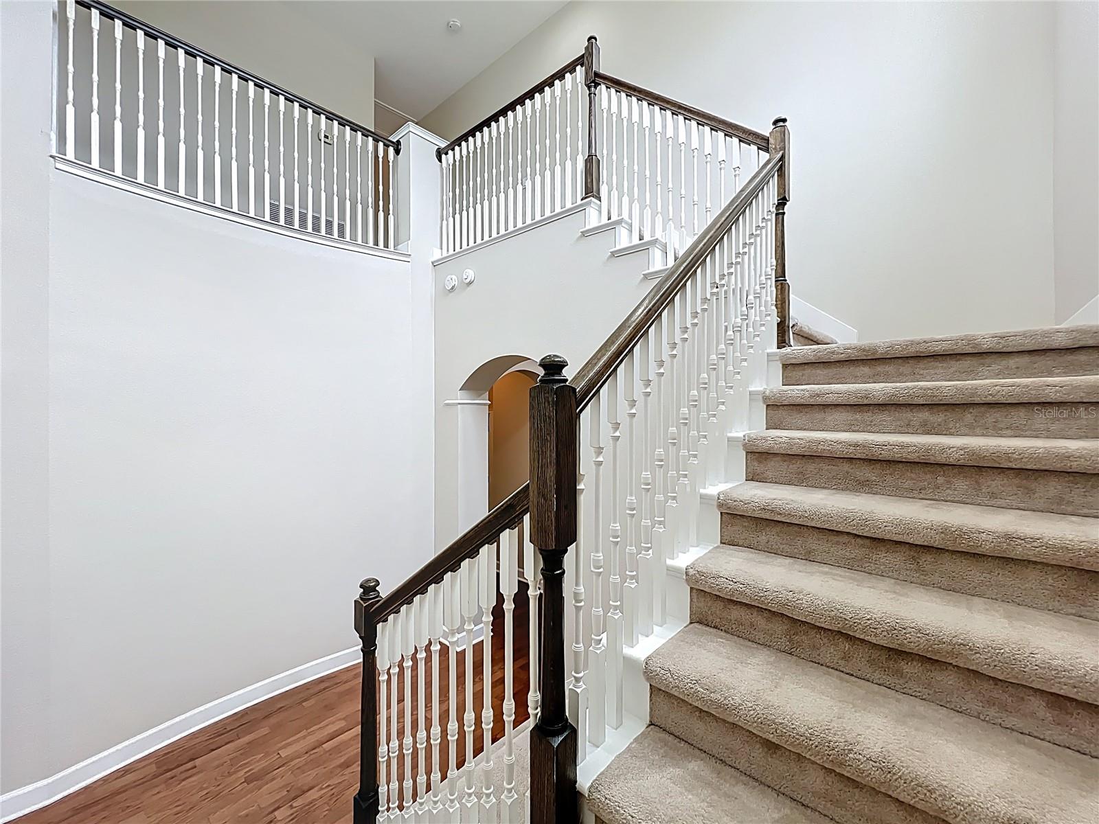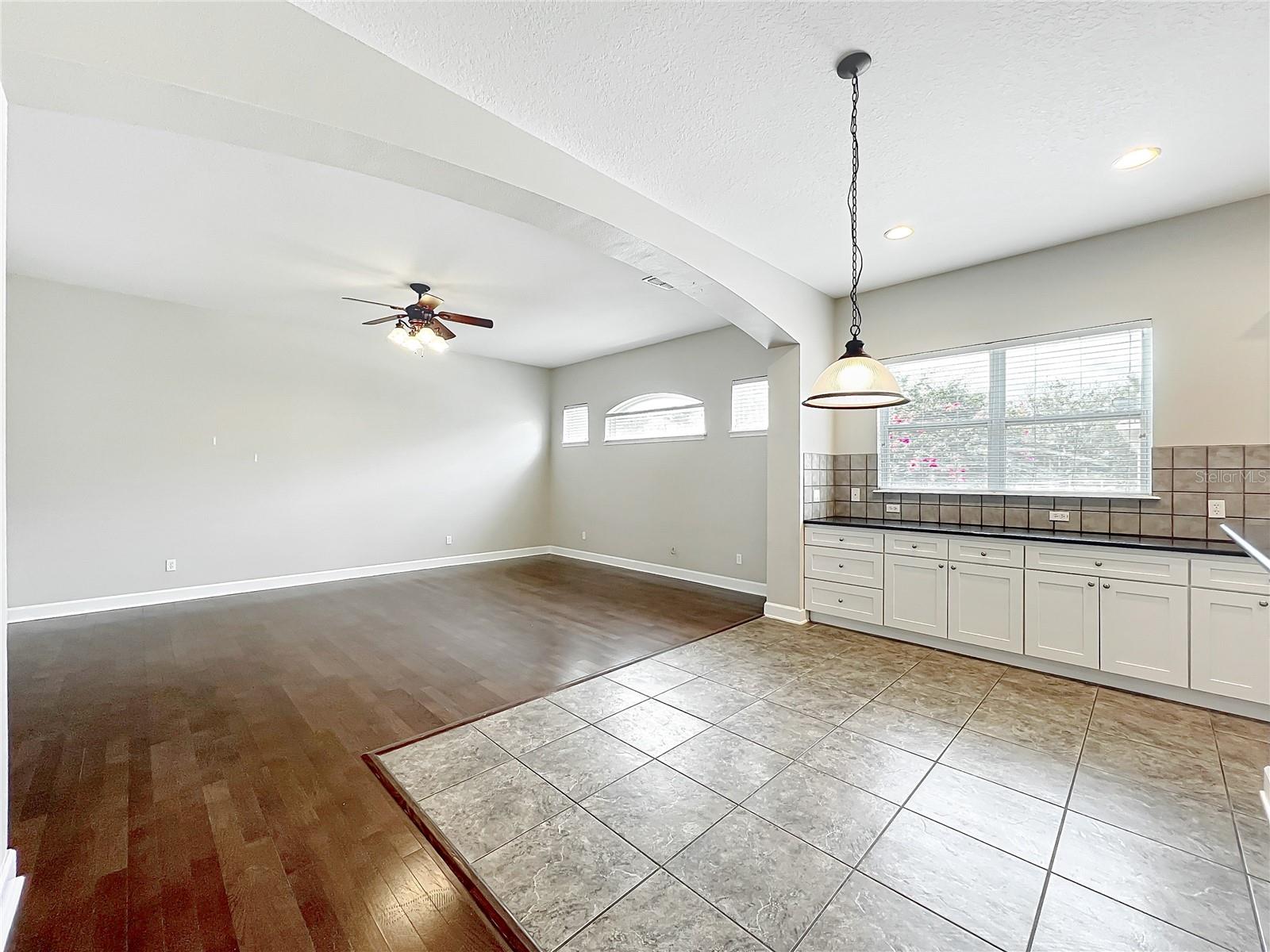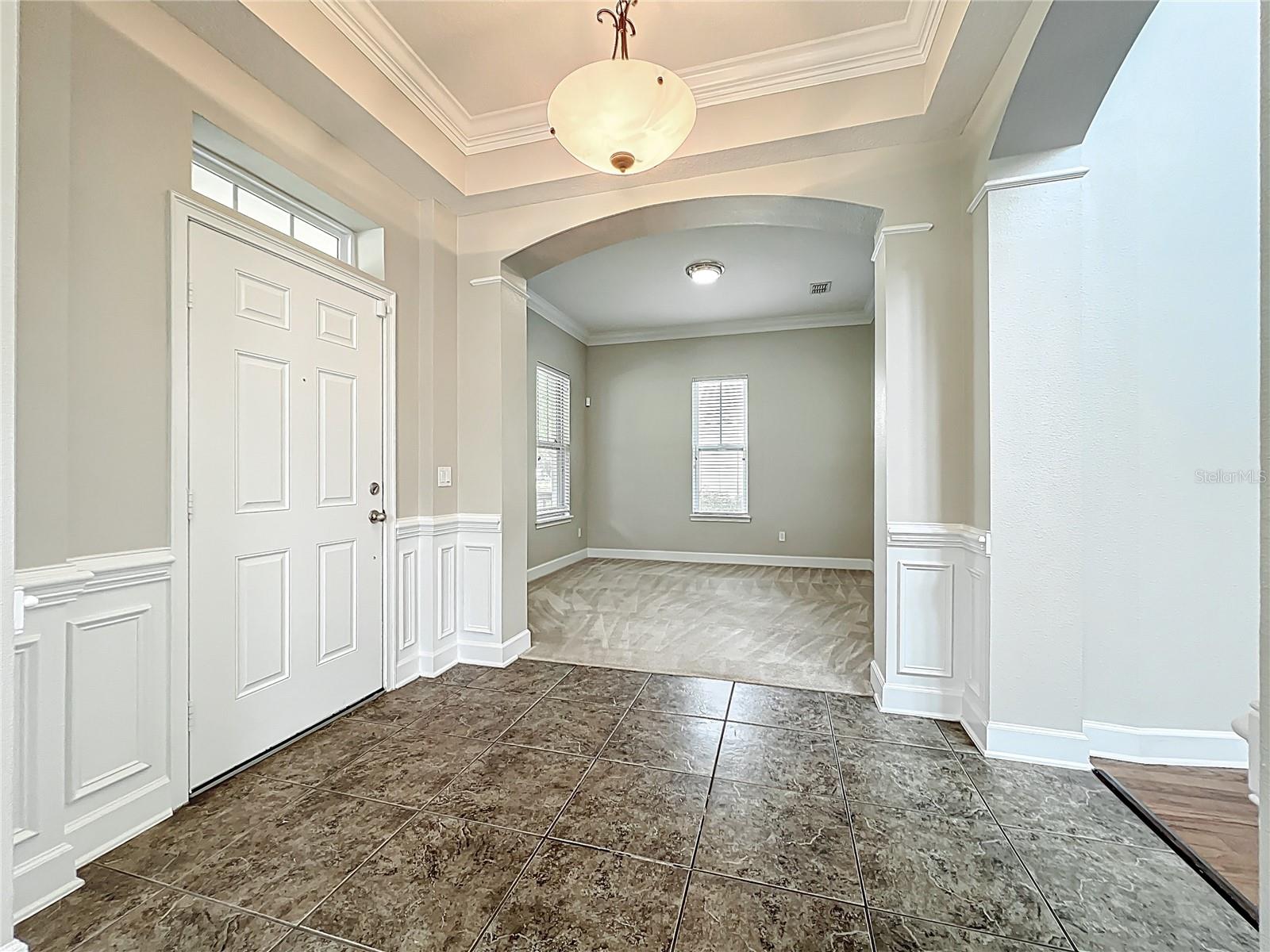 Discover this stunning 2-story, 4-bedroom, 3-bathroom home. Enjoy breathtaking views of the fountain pond from the covered front lanai, beautifully accented with stacked stone columns. Step inside to be welcomed by arched walkways, wood-paneled walls, and elegant wood laminate flooring. The home boasts a separate formal dining room with a tray ceiling across from the formal living room, creating a perfect space for entertaining. The open-concept kitchen and living room provide a warm and inviting atmosphere, featuring white crown cabinetry, black Silestone granite countertops, an island sink and bar, extended counter space, and a walk-in butlers pantry with a prep area. With ample cabinet storage and counter space galore. The black and stainless appliances include a dishwasher, microwave, and convection oven. The spacious master suite, located downstairs, features a large walk-in closet and an ensuite bathroom with double sinks, a walk-in shower, and a garden tub. Upstairs, you'll find generously sized guest bedrooms with walk-in closets and a double-sink guest bathroom. A full guest bathroom with a walk-in shower is conveniently located downstairs. The screened-in back patio, private white vinyl fencing, and a rear entrance garage. This home is loaded with extra features and is nestled in a vibrant community offering a pool, playground, tennis courts and 4 hole-putting green.