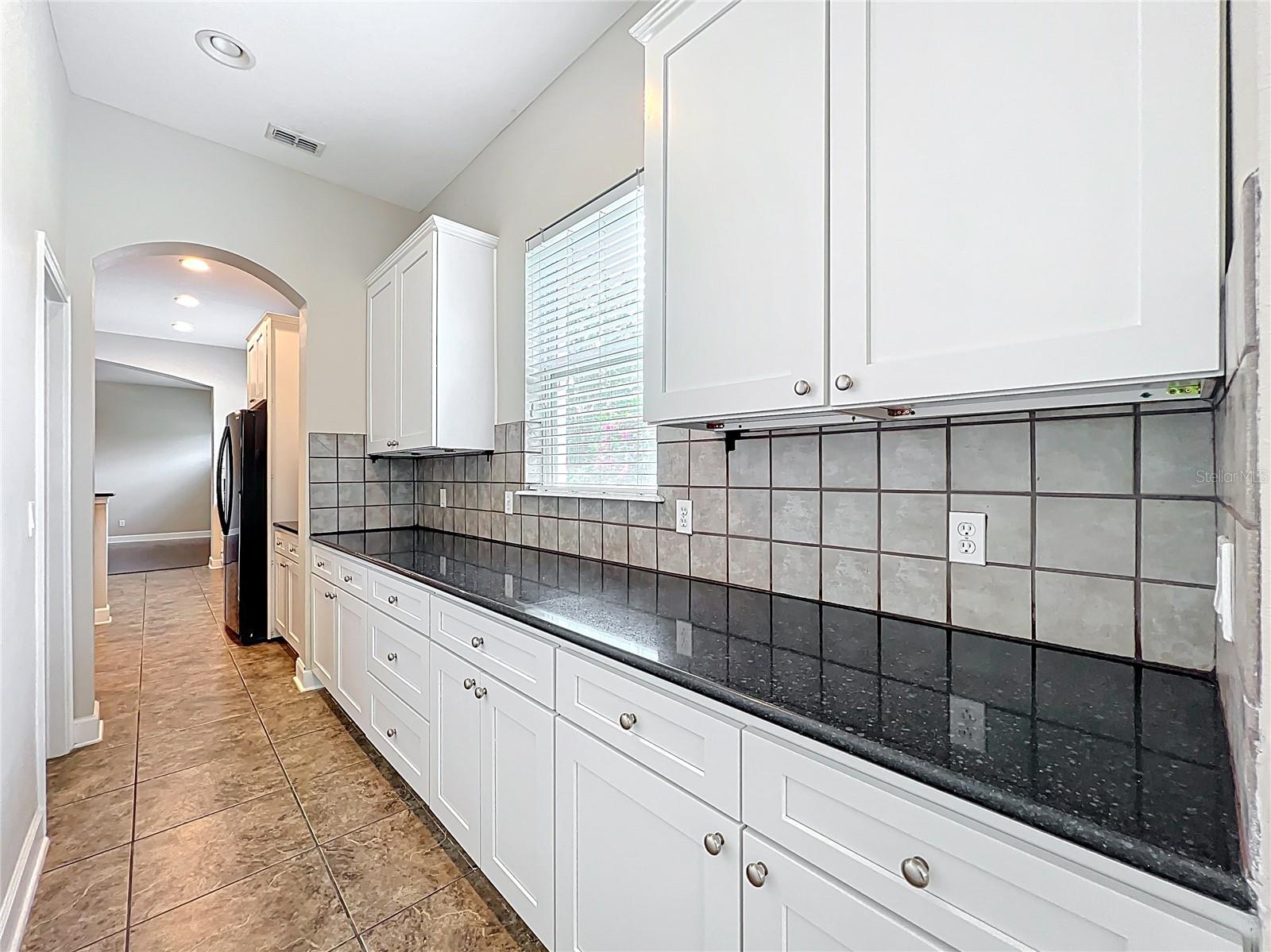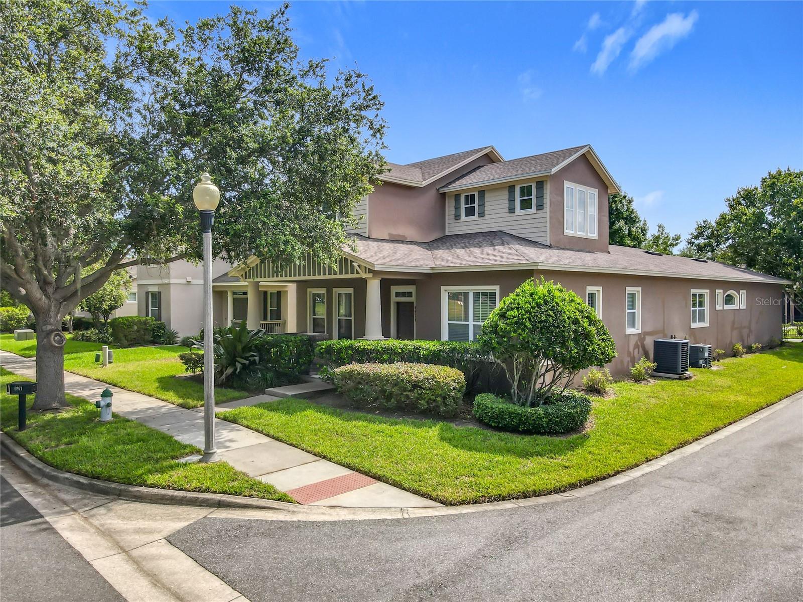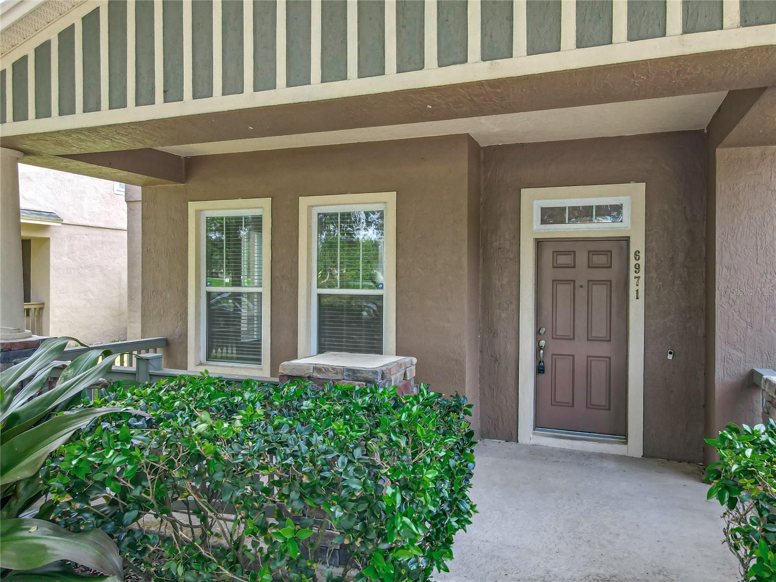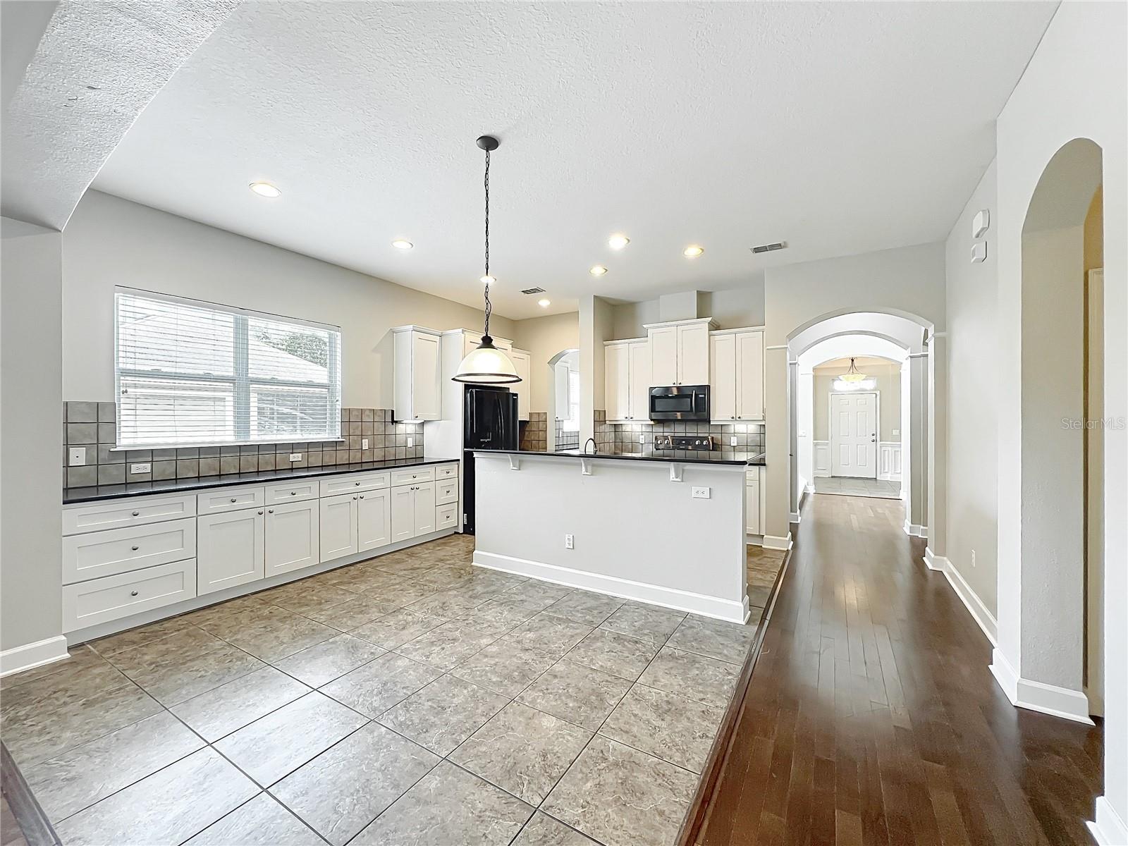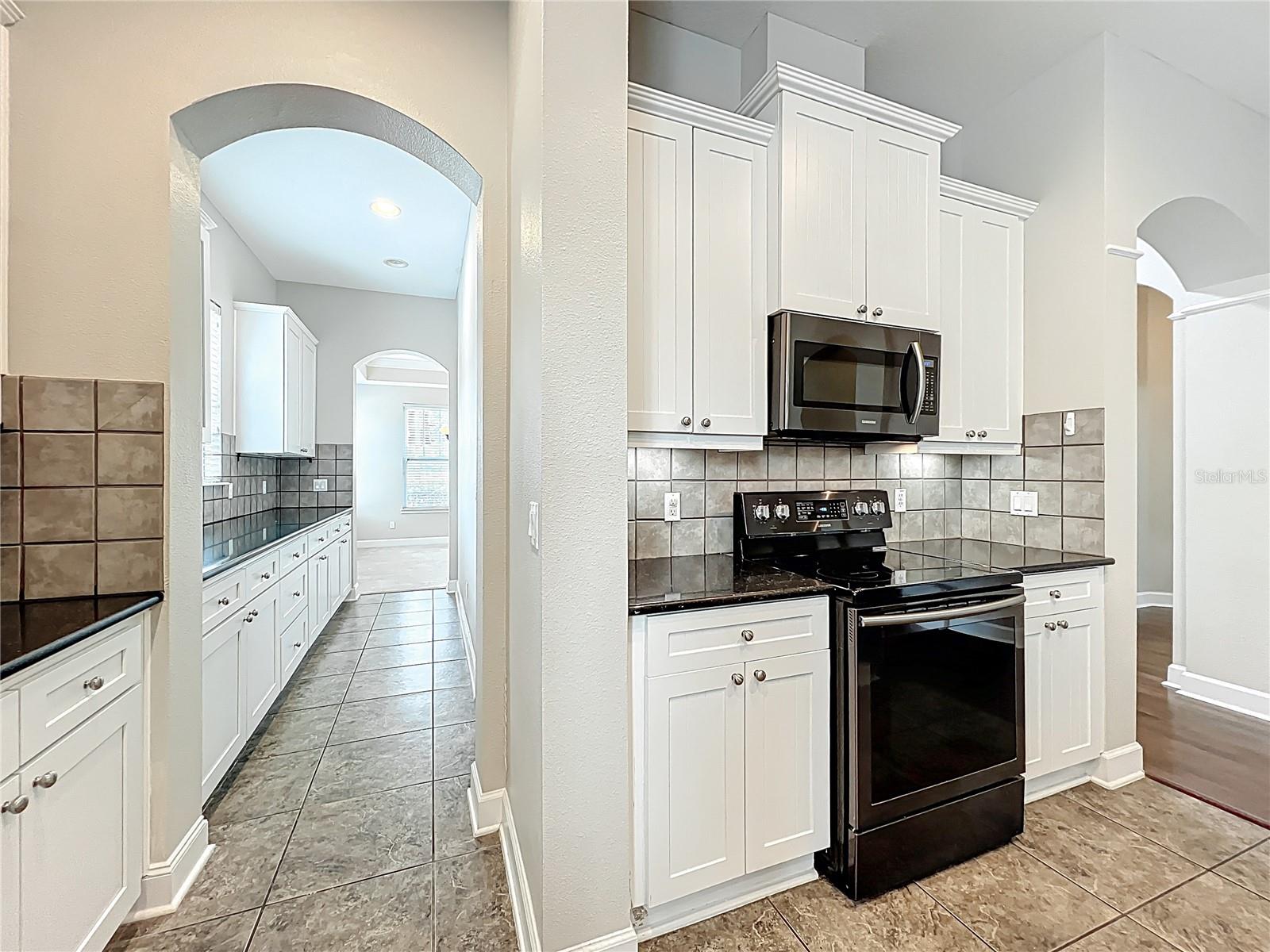 Discover this stunning 2-story, 4-bedroom, 3-bathroom home. Enjoy breathtaking views of the fountain pond from the covered front lanai, beautifully accented with stacked stone columns. Step inside to be welcomed by arched walkways, wood-paneled walls, and elegant wood laminate flooring. The home boasts a separate formal dining room with a tray ceiling across from the formal living room, creating a perfect space for entertaining. The open-concept kitchen and living room provide a warm and inviting atmosphere, featuring white crown cabinetry, black Silestone granite countertops, an island sink and bar, extended counter space, and a walk-in butlers pantry with a prep area. With ample cabinet storage and counter space galore. The black and stainless appliances include a dishwasher, microwave, and convection oven. The spacious master suite, located downstairs, features a large walk-in closet and an ensuite bathroom with double sinks, a walk-in shower, and a garden tub. Upstairs, you'll find generously sized guest bedrooms with walk-in closets and a double-sink guest bathroom. A full guest bathroom with a walk-in shower is conveniently located downstairs. The screened-in back patio, private white vinyl fencing, and a rear entrance garage. This home is loaded with extra features and is nestled in a vibrant community offering a pool, playground, tennis courts and 4 hole-putting green.