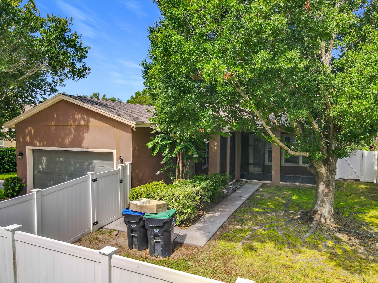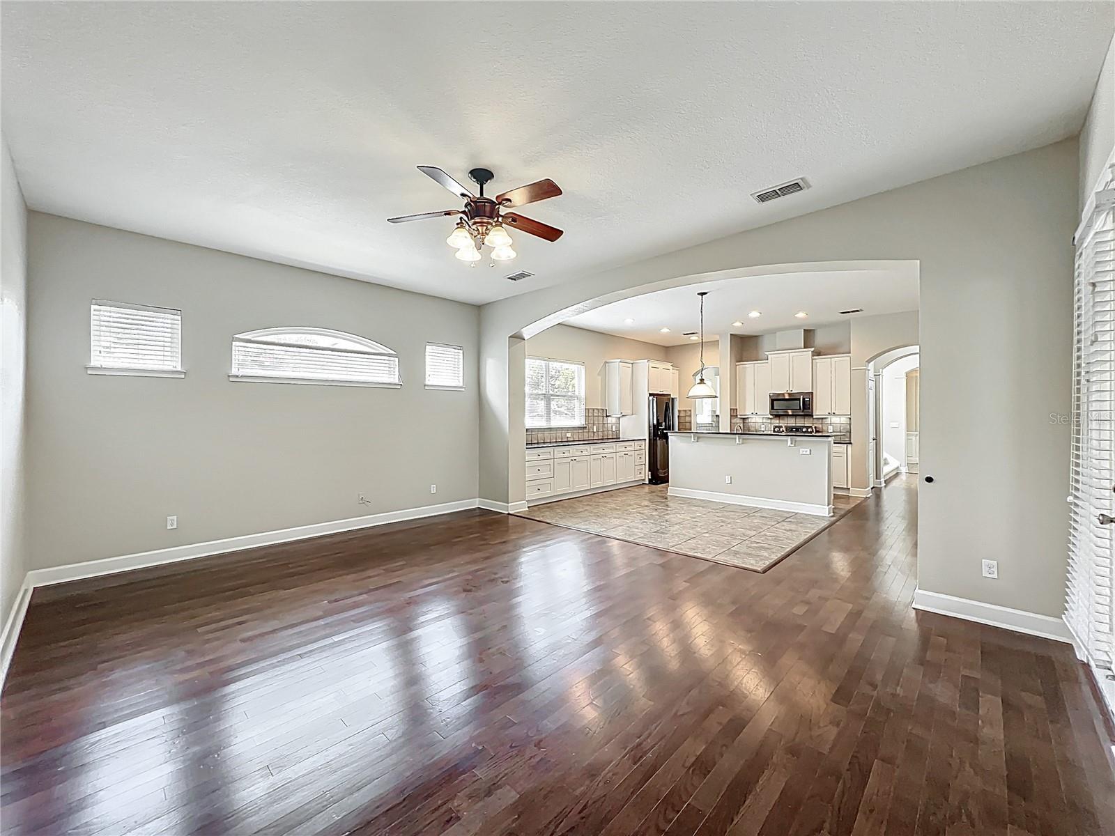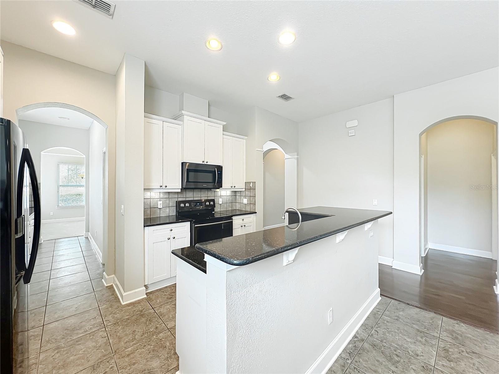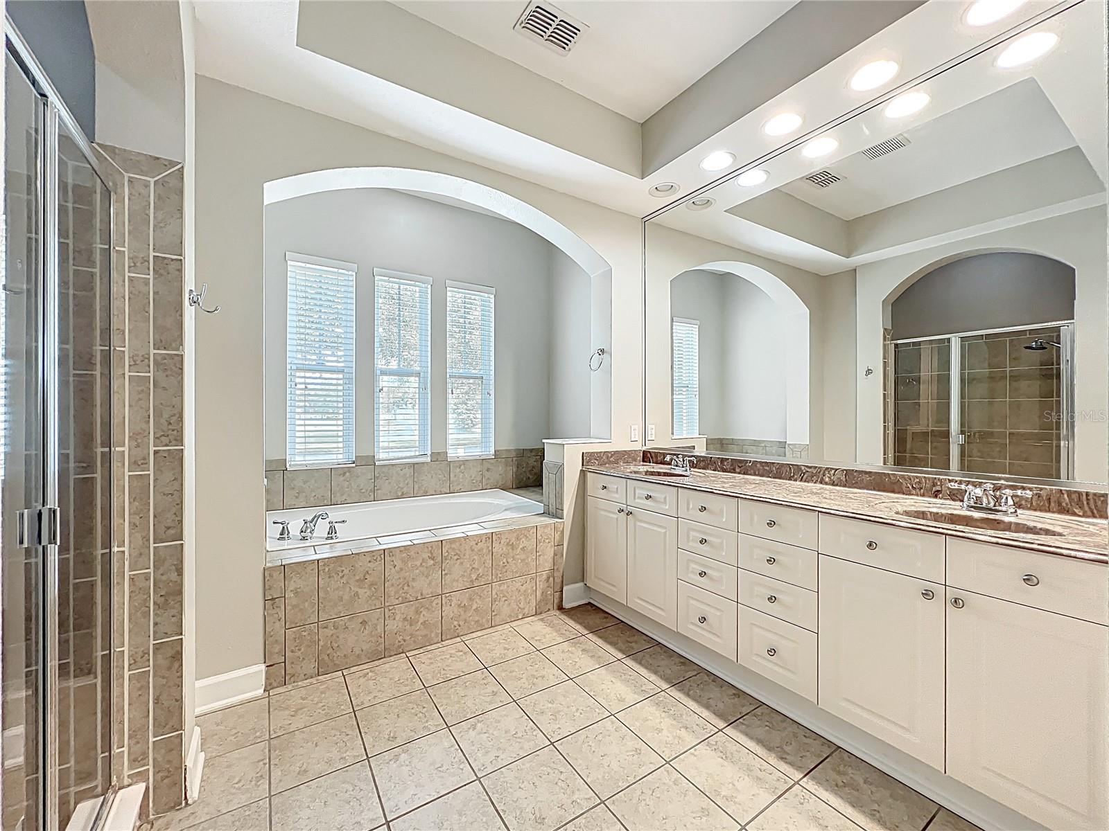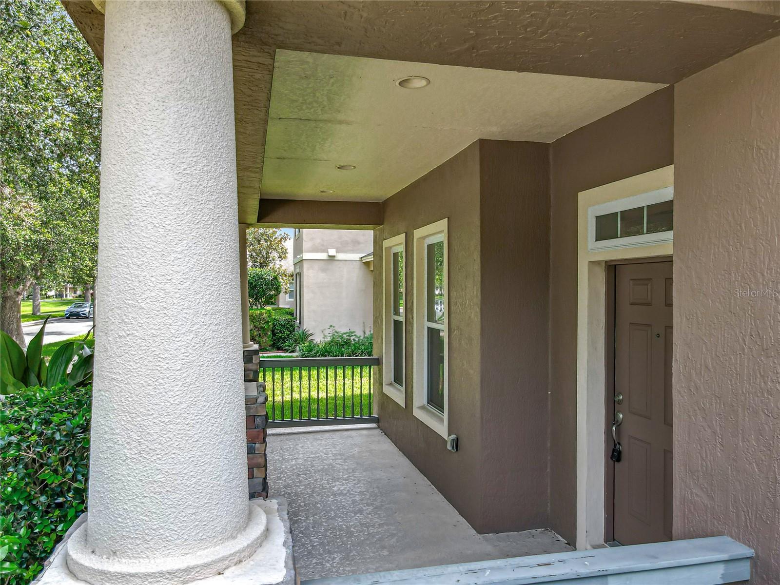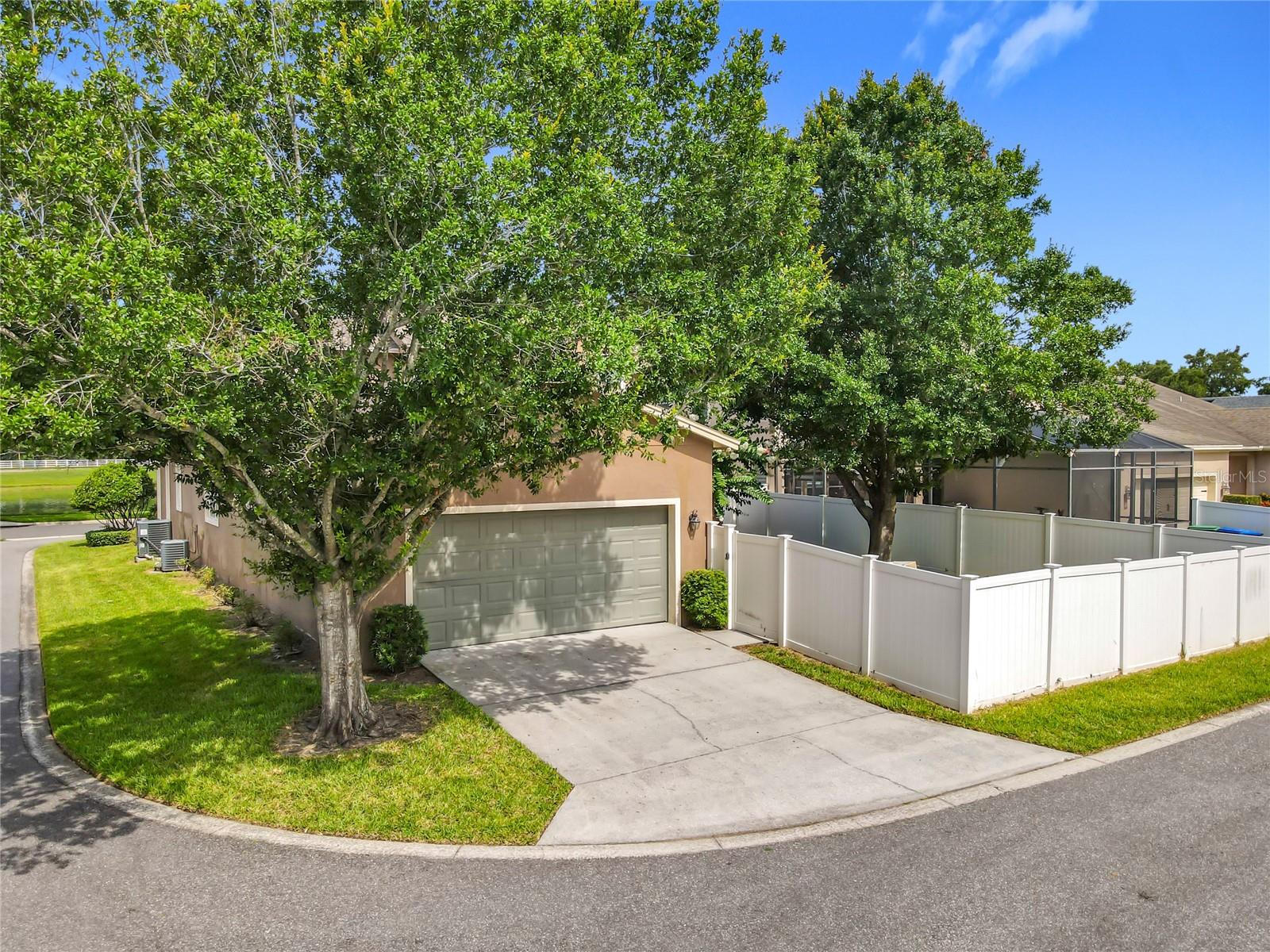 Discover this stunning 2-story, 4-bedroom, 3-bathroom home. Enjoy breathtaking views of the fountain pond from the covered front lanai, beautifully accented with stacked stone columns. Step inside to be welcomed by arched walkways, wood-paneled walls, and elegant wood laminate flooring. The home boasts a separate formal dining room with a tray ceiling across from the formal living room, creating a perfect space for entertaining. The open-concept kitchen and living room provide a warm and inviting atmosphere, featuring white crown cabinetry, black Silestone granite countertops, an island sink and bar, extended counter space, and a walk-in butlers pantry with a prep area. With ample cabinet storage and counter space galore. The black and stainless appliances include a dishwasher, microwave, and convection oven. The spacious master suite, located downstairs, features a large walk-in closet and an ensuite bathroom with double sinks, a walk-in shower, and a garden tub. Upstairs, you'll find generously sized guest bedrooms with walk-in closets and a double-sink guest bathroom. A full guest bathroom with a walk-in shower is conveniently located downstairs. The screened-in back patio, private white vinyl fencing, and a rear entrance garage. This home is loaded with extra features and is nestled in a vibrant community offering a pool, playground, tennis courts and 4 hole-putting green.
