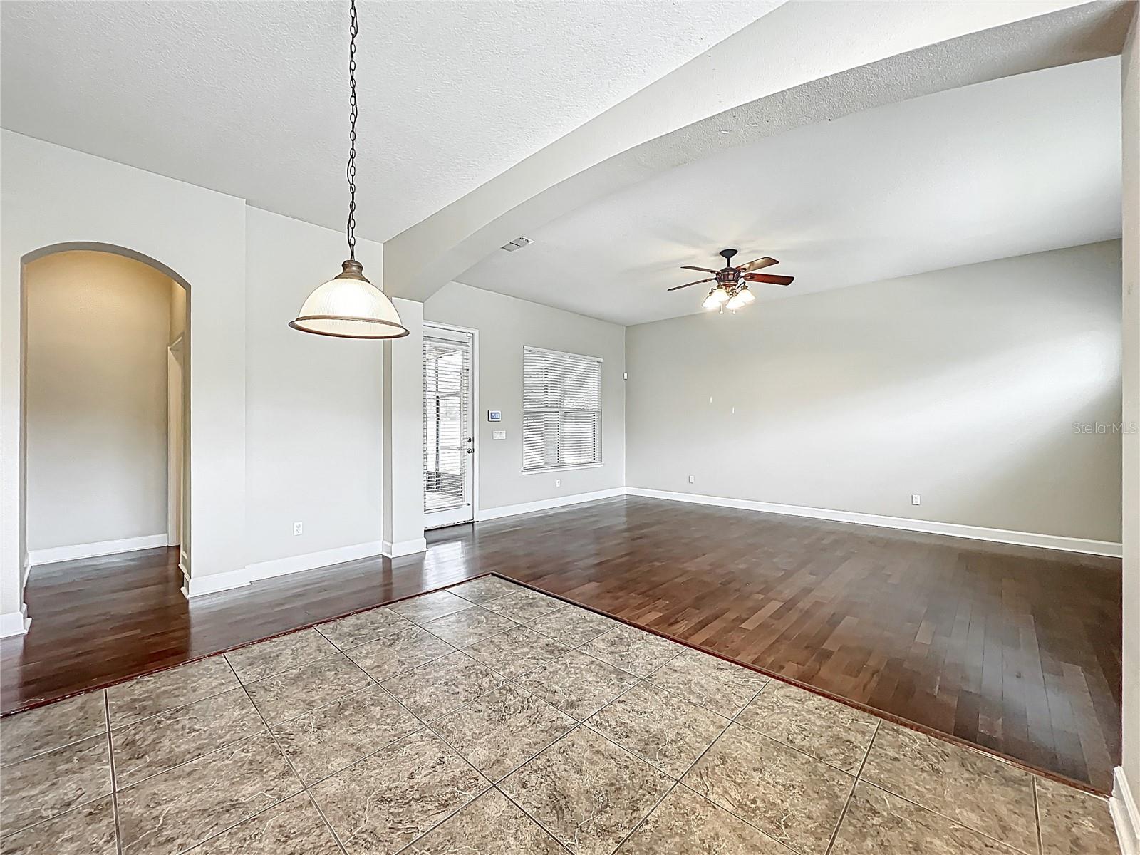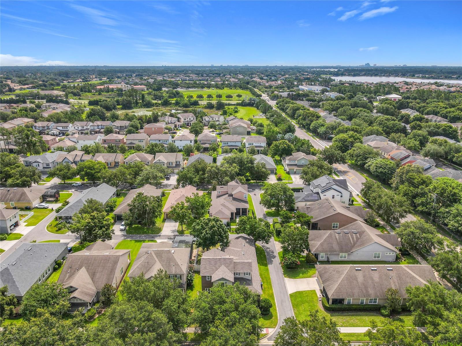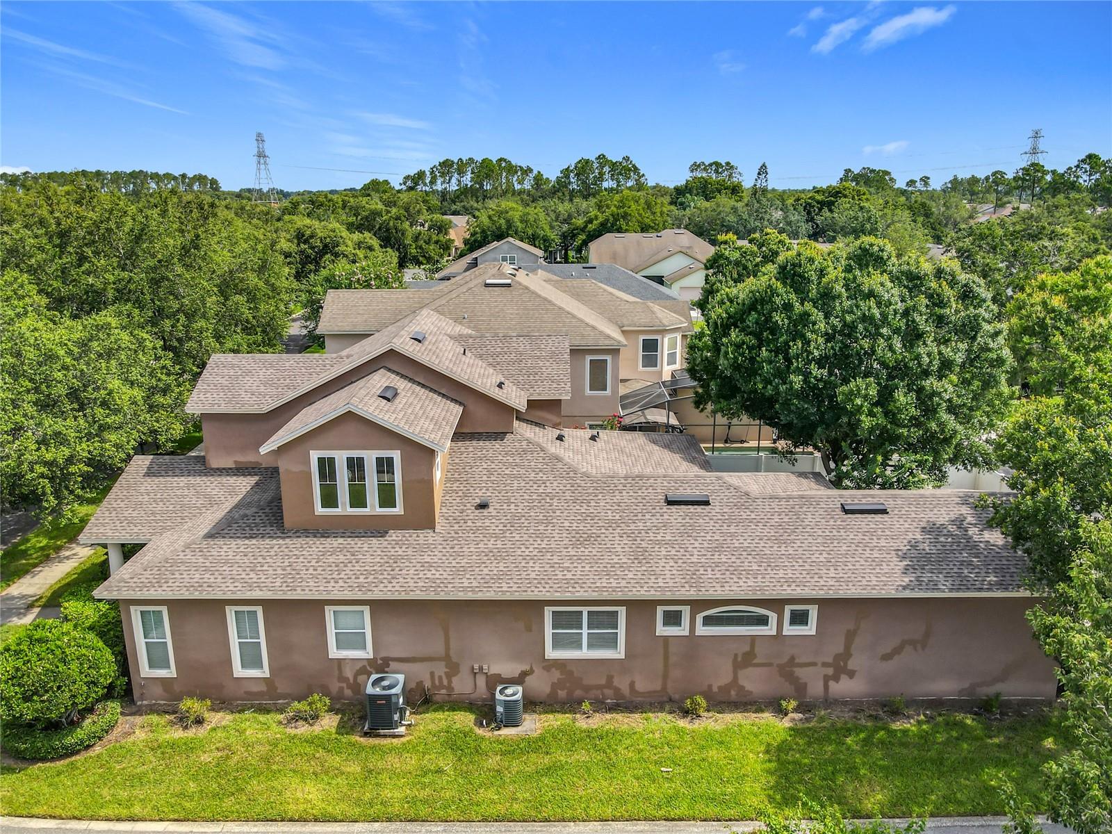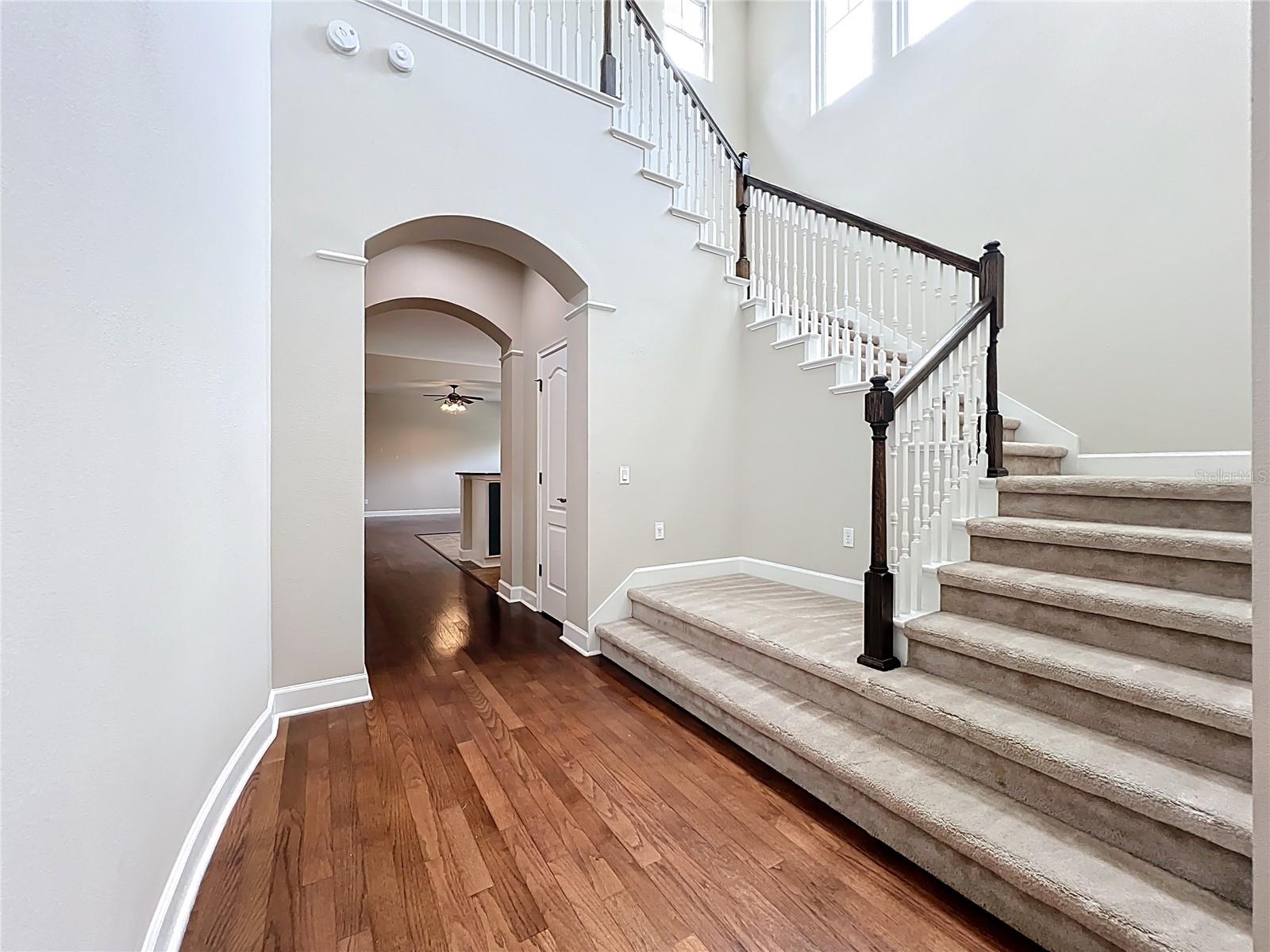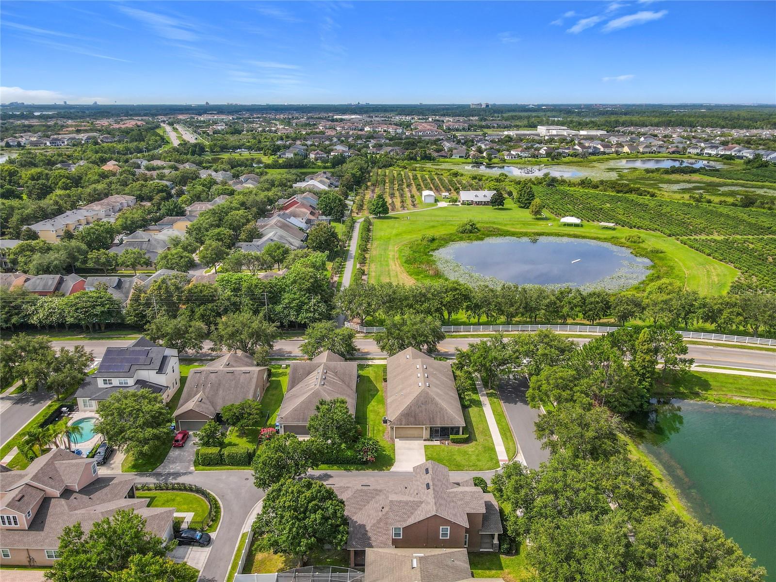 Discover this stunning 2-story, 4-bedroom, 3-bathroom home. Enjoy breathtaking views of the fountain pond from the covered front lanai, beautifully accented with stacked stone columns. Step inside to be welcomed by arched walkways, wood-paneled walls, and elegant wood laminate flooring. The home boasts a separate formal dining room with a tray ceiling across from the formal living room, creating a perfect space for entertaining. The open-concept kitchen and living room provide a warm and inviting atmosphere, featuring white crown cabinetry, black Silestone granite countertops, an island sink and bar, extended counter space, and a walk-in butlers pantry with a prep area. With ample cabinet storage and counter space galore. The black and stainless appliances include a dishwasher, microwave, and convection oven. The spacious master suite, located downstairs, features a large walk-in closet and an ensuite bathroom with double sinks, a walk-in shower, and a garden tub. Upstairs, you'll find generously sized guest bedrooms with walk-in closets and a double-sink guest bathroom. A full guest bathroom with a walk-in shower is conveniently located downstairs. The screened-in back patio, private white vinyl fencing, and a rear entrance garage. This home is loaded with extra features and is nestled in a vibrant community offering a pool, playground, tennis courts and 4 hole-putting green.