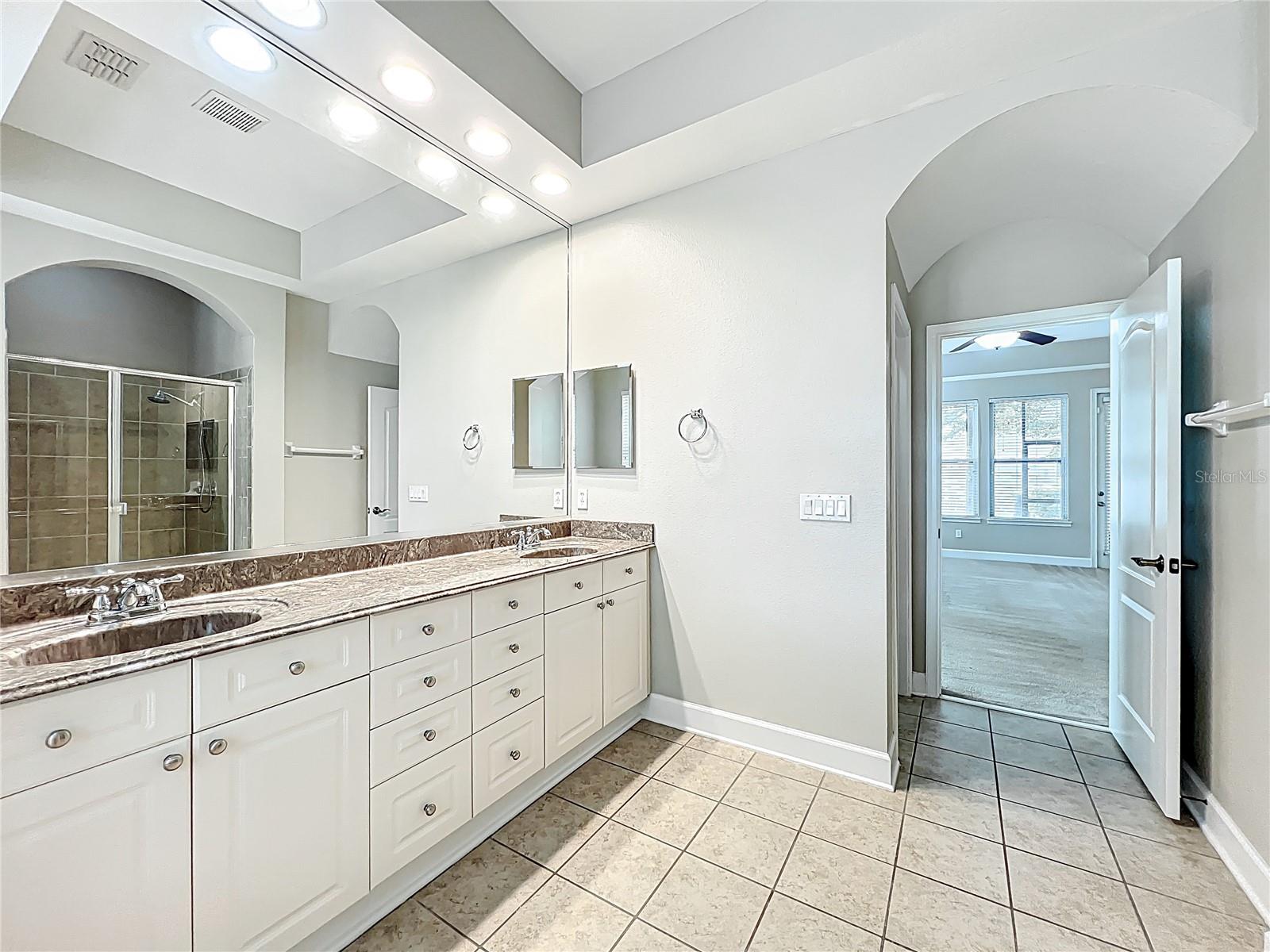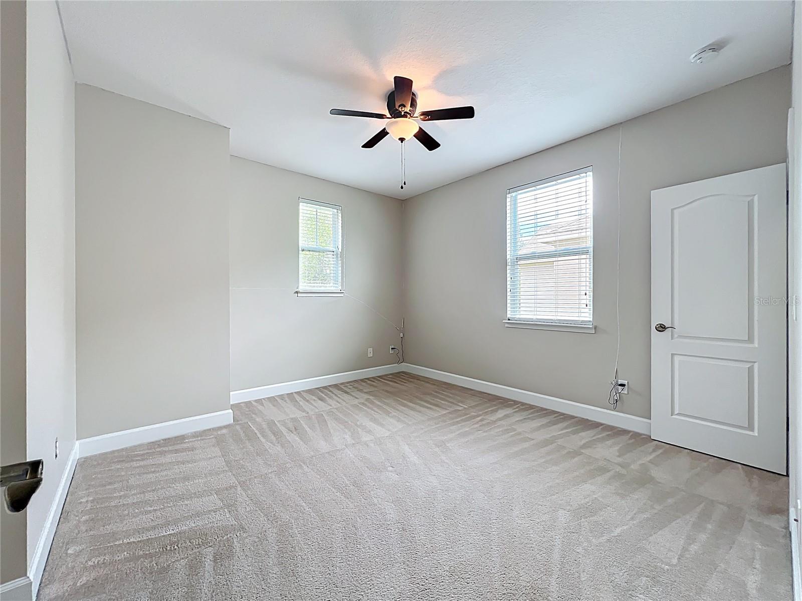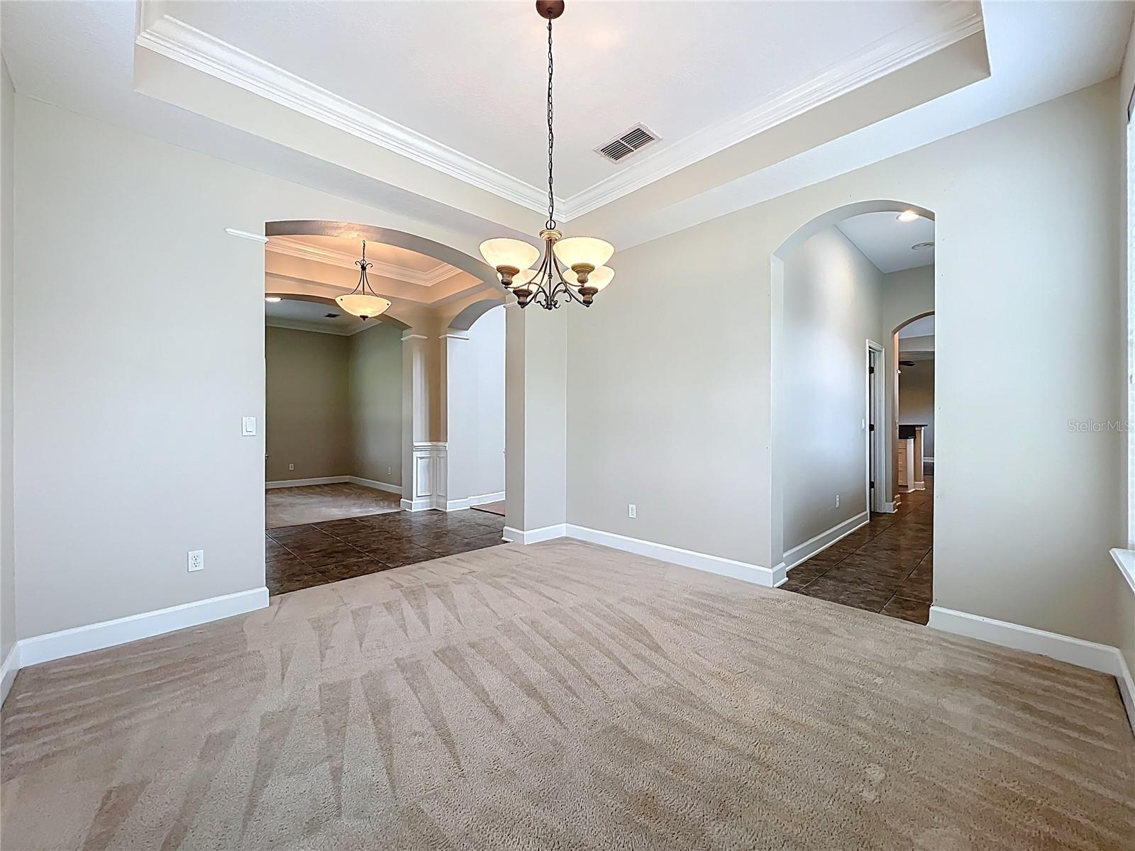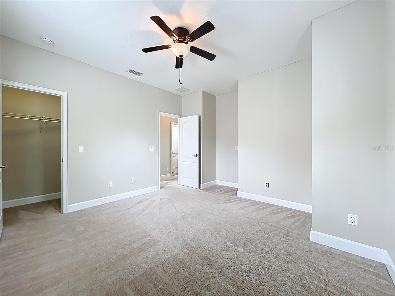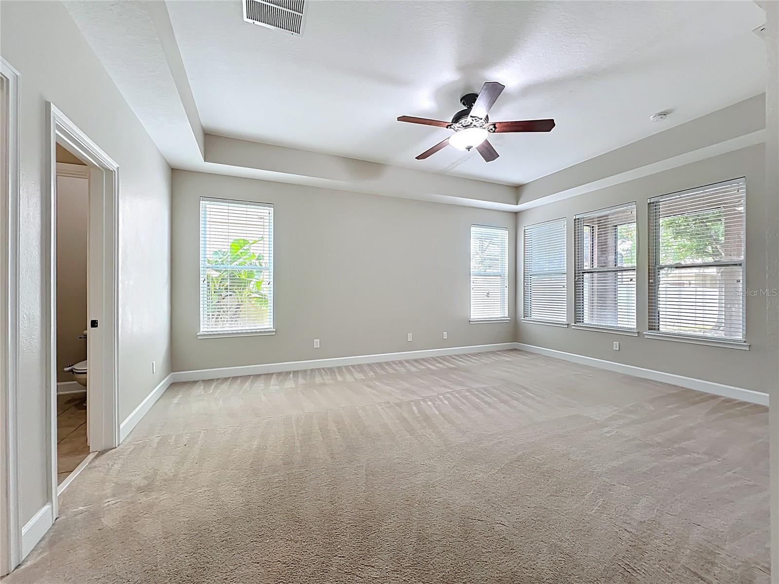 Discover this stunning 2-story, 4-bedroom, 3-bathroom home. Enjoy breathtaking views of the fountain pond from the covered front lanai, beautifully accented with stacked stone columns. Step inside to be welcomed by arched walkways, wood-paneled walls, and elegant wood laminate flooring. The home boasts a separate formal dining room with a tray ceiling across from the formal living room, creating a perfect space for entertaining. The open-concept kitchen and living room provide a warm and inviting atmosphere, featuring white crown cabinetry, black Silestone granite countertops, an island sink and bar, extended counter space, and a walk-in butlers pantry with a prep area. With ample cabinet storage and counter space galore. The black and stainless appliances include a dishwasher, microwave, and convection oven. The spacious master suite, located downstairs, features a large walk-in closet and an ensuite bathroom with double sinks, a walk-in shower, and a garden tub. Upstairs, you'll find generously sized guest bedrooms with walk-in closets and a double-sink guest bathroom. A full guest bathroom with a walk-in shower is conveniently located downstairs. The screened-in back patio, private white vinyl fencing, and a rear entrance garage. This home is loaded with extra features and is nestled in a vibrant community offering a pool, playground, tennis courts and 4 hole-putting green.