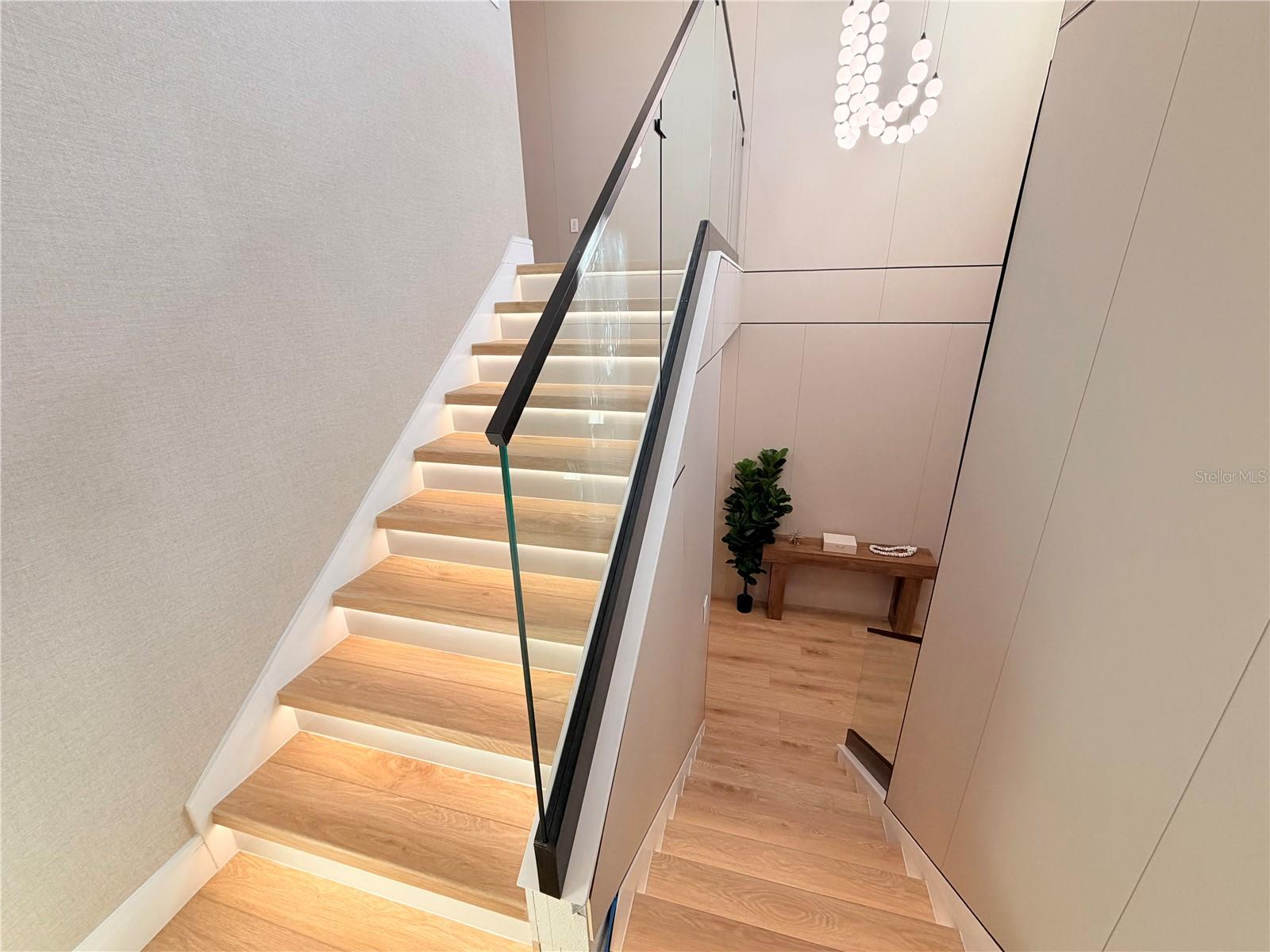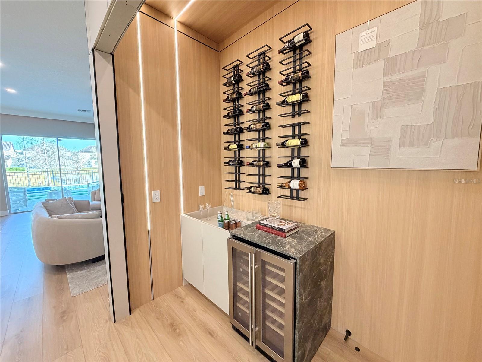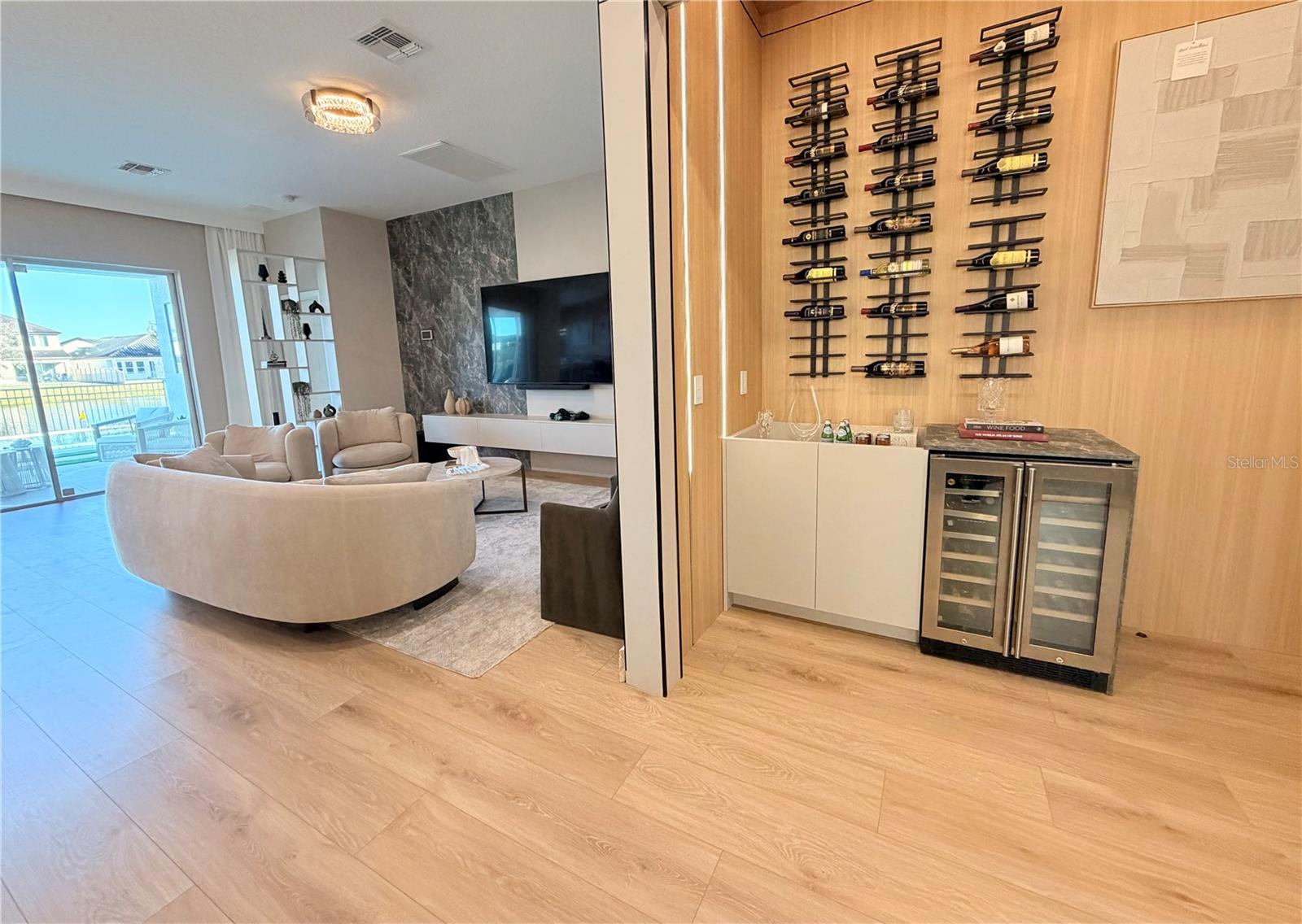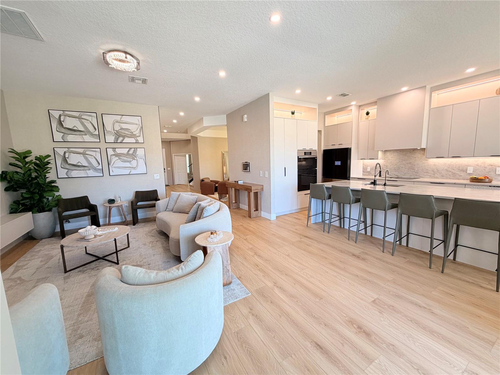This exceptional residence offers a rare combination of contemporary design, smart technology, functionality, and lifestyle. Fully renovated and thoughtfully planned with meticulous attention to detail, the home showcases a high level of craftsmanship and a cohesive modern aesthetic throughout. Luxury vinyl flooring extends throughout the entire home, providing durability, comfort, and a refined contemporary look. Custom millwork is a defining feature of the property, present in the fully planned kitchen, custom bathroom vanities, TV feature wall, and architectural wood paneling that adds warmth, texture, and visual continuity across all living spaces. Imported Italian wallpaper enhances every room, elevating the interior with a sophisticated and curated finish. The gourmet kitchen is professionally designed with bespoke cabinetry, a spacious waterfall island, premium stone countertops and backsplash, and a complete Samsung appliance package, seamlessly blending performance, technology, and modern design. Custom window treatments are installed throughout the home and integrated with smart home automation, offering voice control via Alexa for effortless daily living. The functional and highly desirable layout features five bedrooms, with the primary suite conveniently located on the main level, providing privacy and ease of access. All bedrooms include custom-designed walk-in closets, fully built out with tailored cabinetry for optimal storage, organization, and functionality. Bathrooms offer a spa-inspired experience with custom millwork vanities, large-format tile, frameless glass showers, rainfall showerheads, body jets, and modern matte-black fixtures. A striking custom staircase serves as both a design statement and architectural feature, enhanced with motion-activated LED lighting that illuminates each step. The dramatic double-height entry is highlighted by a contemporary chandelier and glass railing, allowing natural light to flow seamlessly between levels and creating a strong first impression. Designed for entertaining and elevated living, the home includes a dedicated wine bar, complete with built-in wine storage, wall-mounted racks, custom cabinetry, and a temperature-controlled wine refrigerator perfect for hosting guests or enjoying intimate gatherings. The outdoor living area completes the lifestyle experience with a heated pool, clean architectural lines, and low-maintenance landscaping. A private patio features a custom mini putting green, offering a resort-style atmosphere ideal for relaxation and entertainment, complemented by tranquil water views. Located in the desirable Town of Windermere, the home is situated within one of Central Florida’s most sought-after communities, known for its scenic lakes, family-friendly environment, and convenient access to shopping, dining, and major roadways. The area is served by highly regarded public schools and is close to prestigious private institutions such as Windermere Preparatory School. This move-in-ready residence stands out for its design, quality, technology, and location—an exceptional opportunity for buyers seeking a refined and thoughtfully curated home.