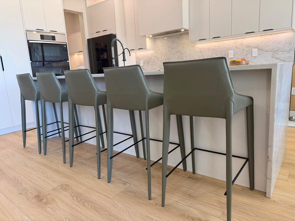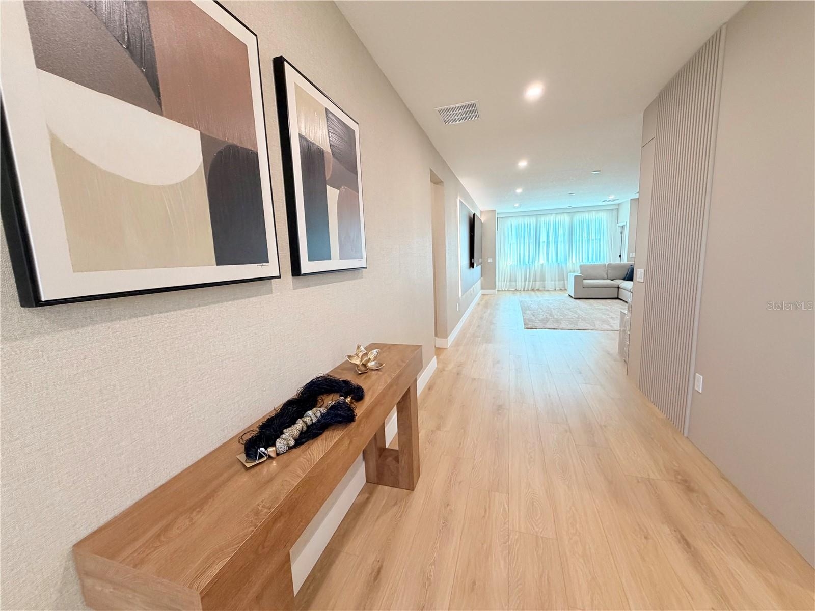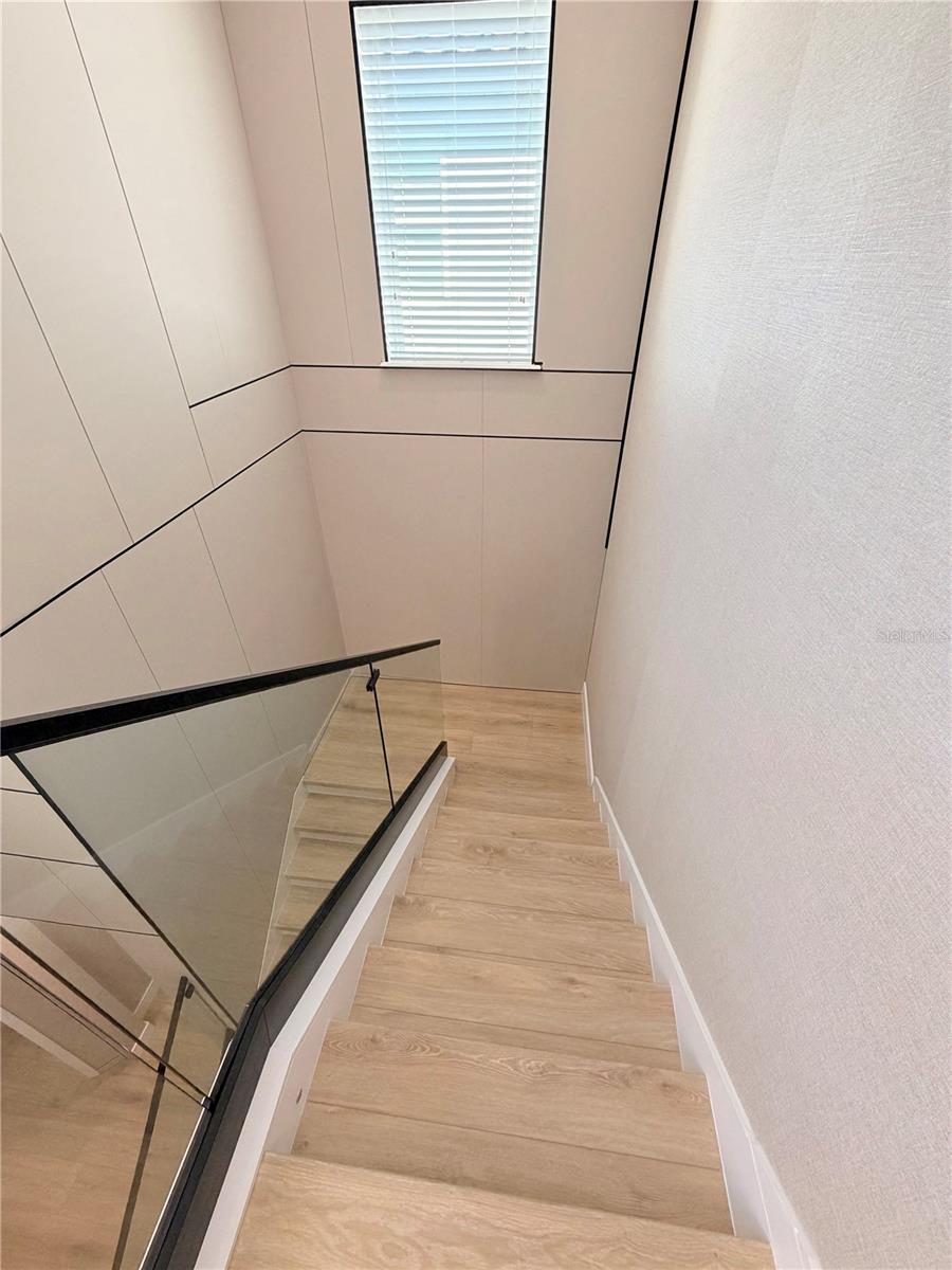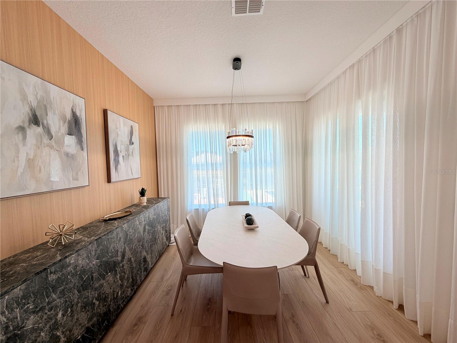 This exceptional residence offers a rare combination of contemporary design, smart technology, functionality, and lifestyle. Fully renovated and thoughtfully planned with meticulous attention to detail, the home showcases a high level of craftsmanship and a cohesive modern aesthetic throughout. Luxury vinyl flooring extends throughout the entire home, providing durability, comfort, and a refined contemporary look. Custom millwork is a defining feature of the property, present in the fully planned kitchen, custom bathroom vanities, TV feature wall, and architectural wood paneling that adds warmth, texture, and visual continuity across all living spaces. Imported Italian wallpaper enhances every room, elevating the interior with a sophisticated and curated finish. The gourmet kitchen is professionally designed with bespoke cabinetry, a spacious waterfall island, premium stone countertops and backsplash, and a complete Samsung appliance package, seamlessly blending performance, technology, and modern design. Custom window treatments are installed throughout the home and integrated with smart home automation, offering voice control via Alexa for effortless daily living. The functional and highly desirable layout features five bedrooms, with the primary suite conveniently located on the main level, providing privacy and ease of access. All bedrooms include custom-designed walk-in closets, fully built out with tailored cabinetry for optimal storage, organization, and functionality. Bathrooms offer a spa-inspired experience with custom millwork vanities, large-format tile, frameless glass showers, rainfall showerheads, body jets, and modern matte-black fixtures. A striking custom staircase serves as both a design statement and architectural feature, enhanced with motion-activated LED lighting that illuminates each step. The dramatic double-height entry is highlighted by a contemporary chandelier and glass railing, allowing natural light to flow seamlessly between levels and creating a strong first impression. Designed for entertaining and elevated living, the home includes a dedicated wine bar, complete with built-in wine storage, wall-mounted racks, custom cabinetry, and a temperature-controlled wine refrigerator perfect for hosting guests or enjoying intimate gatherings. The outdoor living area completes the lifestyle experience with a heated pool, clean architectural lines, and low-maintenance landscaping. A private patio features a custom mini putting green, offering a resort-style atmosphere ideal for relaxation and entertainment, complemented by tranquil water views. Located in the desirable Town of Windermere, the home is situated within one of Central Florida’s most sought-after communities, known for its scenic lakes, family-friendly environment, and convenient access to shopping, dining, and major roadways. The area is served by highly regarded public schools and is close to prestigious private institutions such as Windermere Preparatory School. This move-in-ready residence stands out for its design, quality, technology, and location—an exceptional opportunity for buyers seeking a refined and thoughtfully curated home.