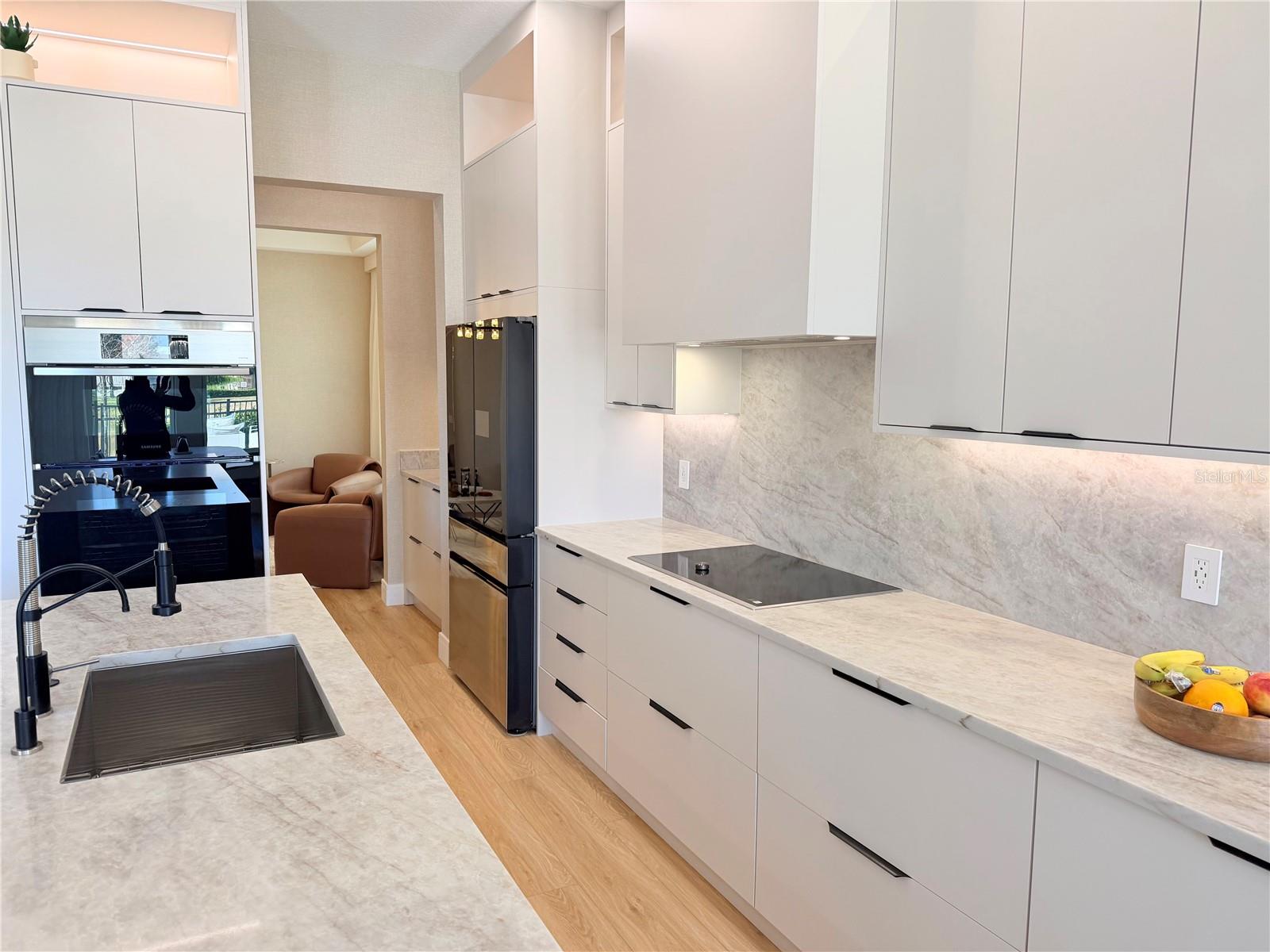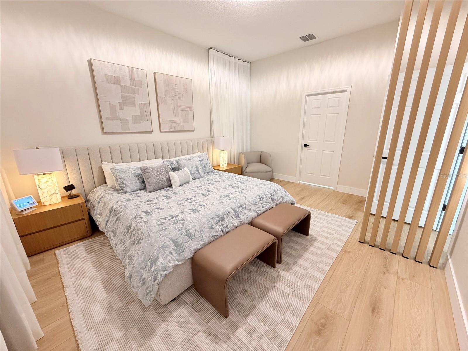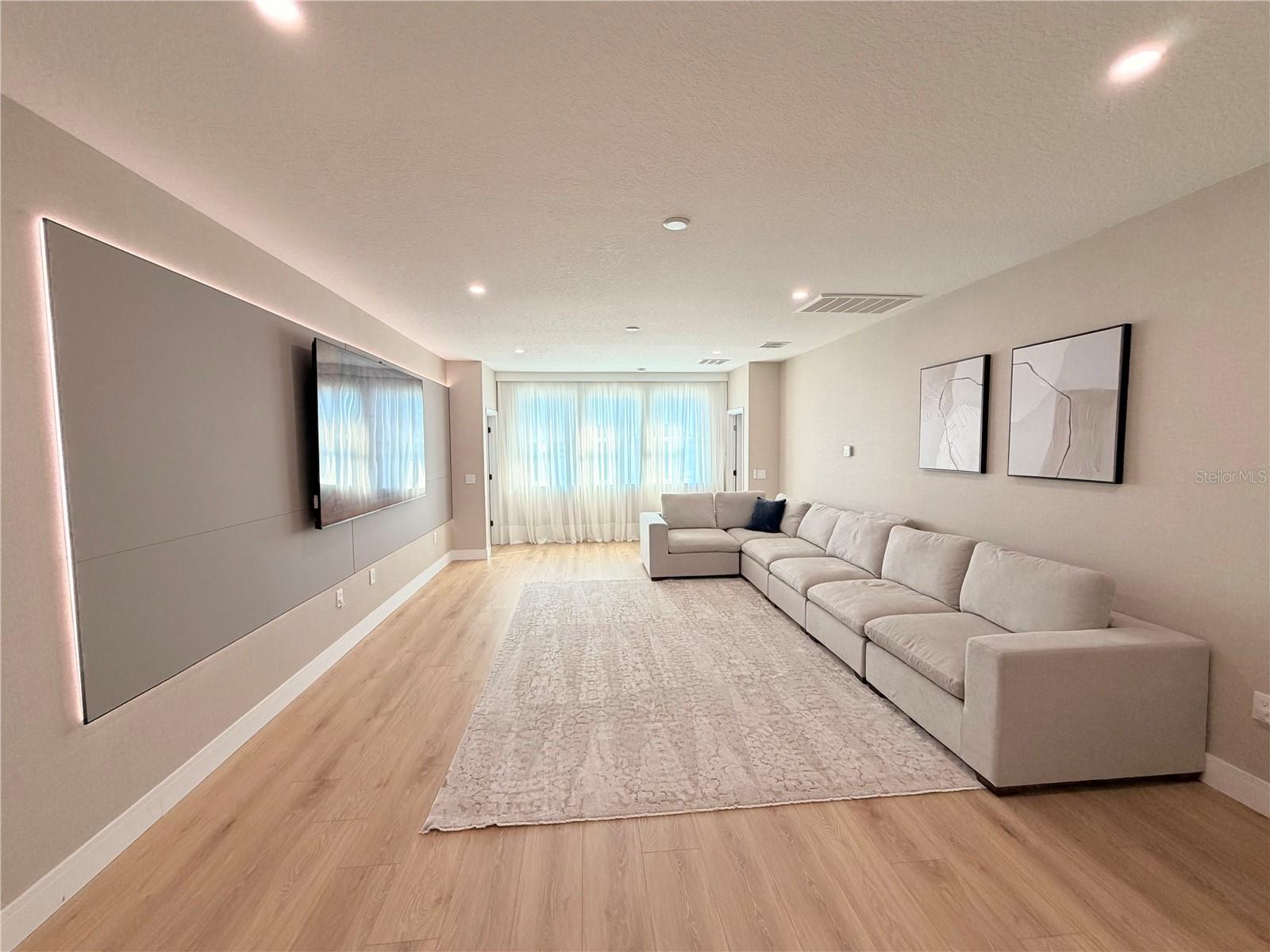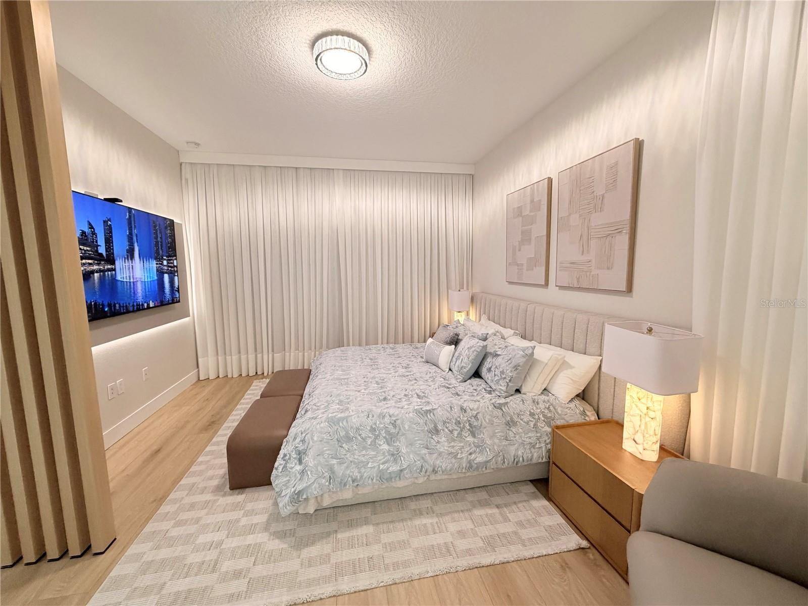 This exceptional residence offers a rare combination of contemporary design, smart technology, functionality, and lifestyle. Fully renovated and thoughtfully planned with meticulous attention to detail, the home showcases a high level of craftsmanship and a cohesive modern aesthetic throughout. Luxury vinyl flooring extends throughout the entire home, providing durability, comfort, and a refined contemporary look. Custom millwork is a defining feature of the property, present in the fully planned kitchen, custom bathroom vanities, TV feature wall, and architectural wood paneling that adds warmth, texture, and visual continuity across all living spaces. Imported Italian wallpaper enhances every room, elevating the interior with a sophisticated and curated finish. The gourmet kitchen is professionally designed with bespoke cabinetry, a spacious waterfall island, premium stone countertops and backsplash, and a complete Samsung appliance package, seamlessly blending performance, technology, and modern design. Custom window treatments are installed throughout the home and integrated with smart home automation, offering voice control via Alexa for effortless daily living. The functional and highly desirable layout features five bedrooms, with the primary suite conveniently located on the main level, providing privacy and ease of access. All bedrooms include custom-designed walk-in closets, fully built out with tailored cabinetry for optimal storage, organization, and functionality. Bathrooms offer a spa-inspired experience with custom millwork vanities, large-format tile, frameless glass showers, rainfall showerheads, body jets, and modern matte-black fixtures. A striking custom staircase serves as both a design statement and architectural feature, enhanced with motion-activated LED lighting that illuminates each step. The dramatic double-height entry is highlighted by a contemporary chandelier and glass railing, allowing natural light to flow seamlessly between levels and creating a strong first impression. Designed for entertaining and elevated living, the home includes a dedicated wine bar, complete with built-in wine storage, wall-mounted racks, custom cabinetry, and a temperature-controlled wine refrigerator perfect for hosting guests or enjoying intimate gatherings. The outdoor living area completes the lifestyle experience with a heated pool, clean architectural lines, and low-maintenance landscaping. A private patio features a custom mini putting green, offering a resort-style atmosphere ideal for relaxation and entertainment, complemented by tranquil water views. Located in the desirable Town of Windermere, the home is situated within one of Central Florida’s most sought-after communities, known for its scenic lakes, family-friendly environment, and convenient access to shopping, dining, and major roadways. The area is served by highly regarded public schools and is close to prestigious private institutions such as Windermere Preparatory School. This move-in-ready residence stands out for its design, quality, technology, and location—an exceptional opportunity for buyers seeking a refined and thoughtfully curated home.