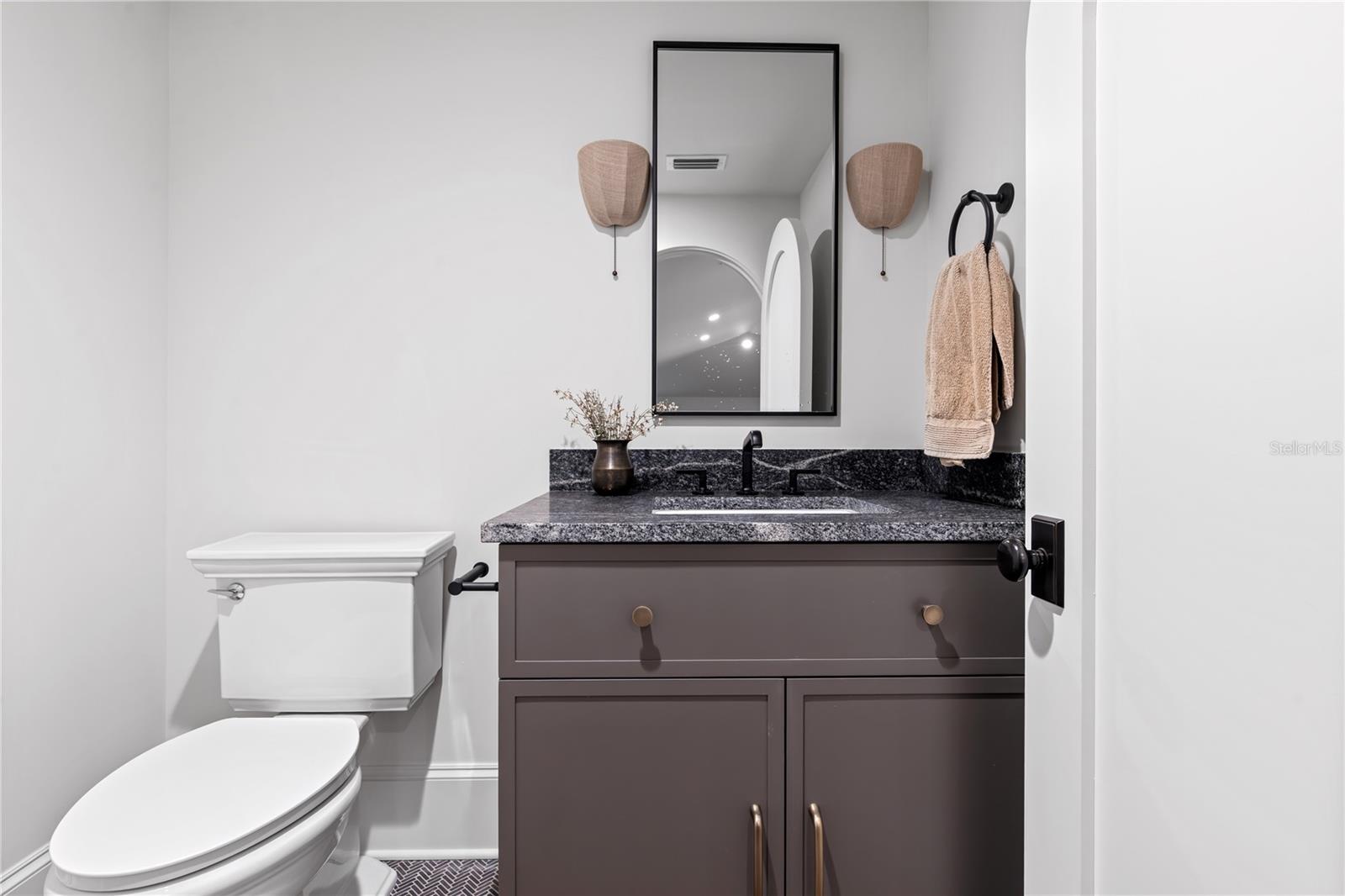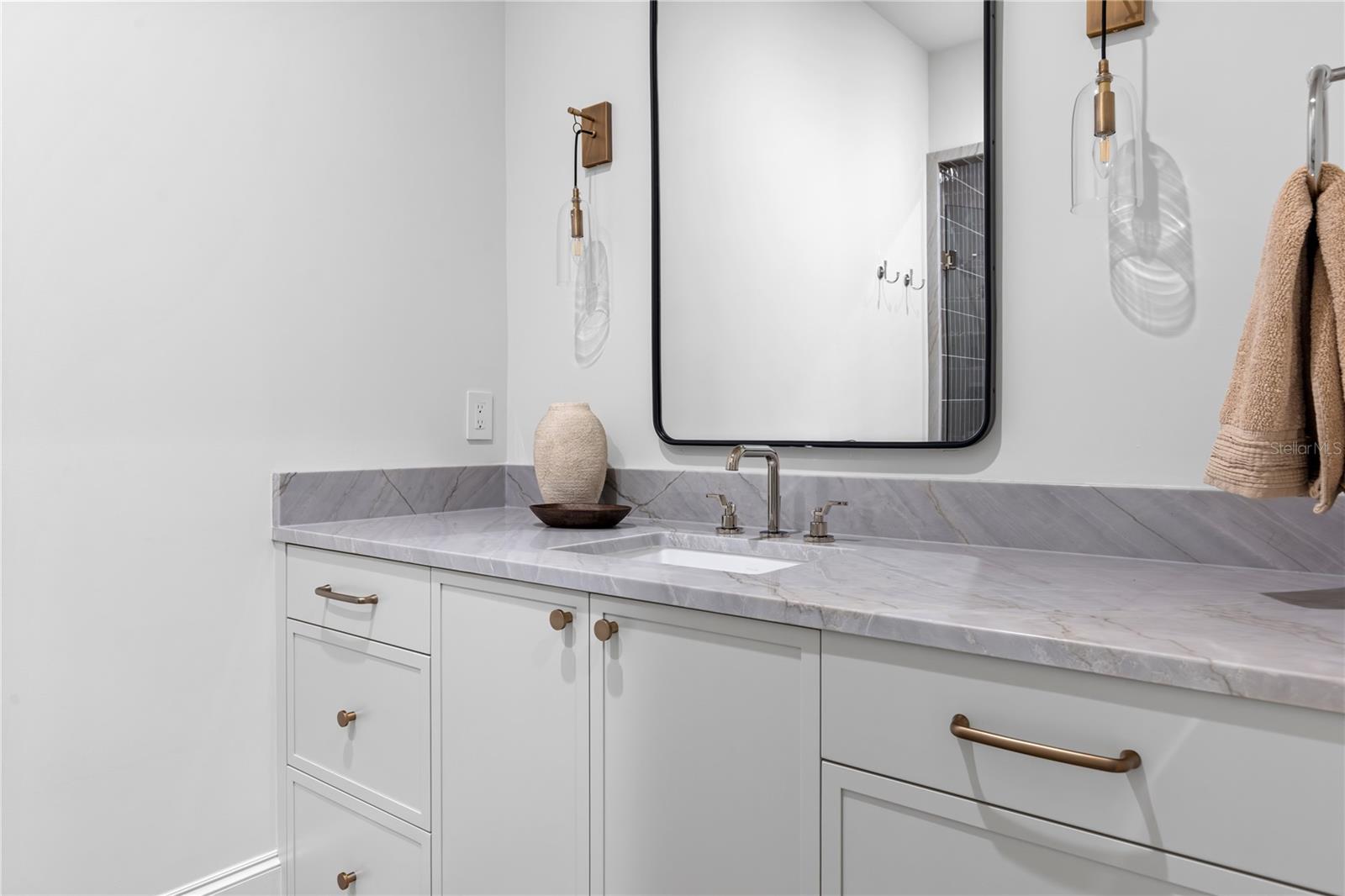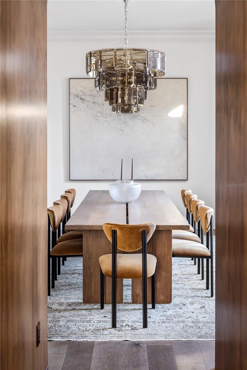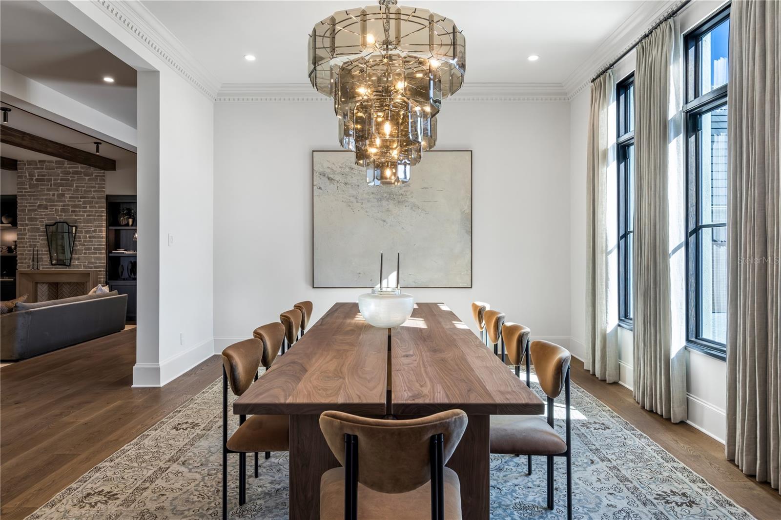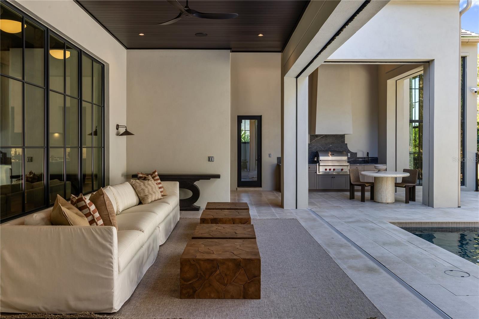 Brand new construction and fully furnished! Architecturally refined and intentionally designed by Ashley Martin Home, this custom estate is a masterclass in proportion, craftsmanship, and quiet luxury. European-inspired stonework, dramatic gabled rooflines, and a custom metal arched front door set a tone of understated elegance from the moment of arrival. Concrete tile roofing, four-car garage plus golf cart garage, and a friends-and-family entry with covered parking. Inside, discover Sierra Pacific casement windows with stained interior mullions flood the home with natural light, highlighting warm beams, wide-plank floors, and curated details. Lutron lighting, Sonos audio, and powered draperies enhance modern comfort without compromising design. The formal dining room features a stained white oak arched opening, classic dentil molding, and built-in wine display. The living room is anchored by a gas Isokern fireplace with precast surround, custom built-ins, stained beams, and sculptural custom one off lighting, while an interior glass breezeway subtly defines the transition to the private primary wing. The primary suite offers a serene retreat with custom arch detailing, a nickel joint ceiling, and stained beams. The spa-inspired bath includes a marble soaking tub and a dramatic solid limestone staircase leading to a hidden upper-level flex space, ideal for an office or gym, complete with beverage refrigeration and powered Roman shade. The boutique-style closet features dual islands and an integrated wash tower. At the heart of the home, the chef’s kitchen stuns with soaring 18-foot ceilings, exposed beams, a curved reeded island, and custom Urban Electric pendants designed specifically for the residence. Sub-Zero refrigeration, freezer, and wine column, a 60-inch Wolf range, dual integrated dishwashers, and a fully equipped back kitchen ensure effortless entertaining. Indoor and outdoor living connect seamlessly to a private courtyard-style retreat featuring a resort-inspired pool with copper scupper water features, a summer kitchen with Wolf grill, powered screens, and multiple lounging areas designed for year-round enjoyment. Additional highlights include four upstairs en-suite bedrooms, including a secondary primary suite, an upstairs laundry with linen towers and folding station, a third-level bonus floor with theater, bar, powder bath, and storage, elevator-ready construction, and an advanced security system with AI-enabled cameras and window vibration sensors. Designed with architectural intention, this home pairs refined craftsmanship with warmth, creating spaces that feel both elevated and deeply livable.