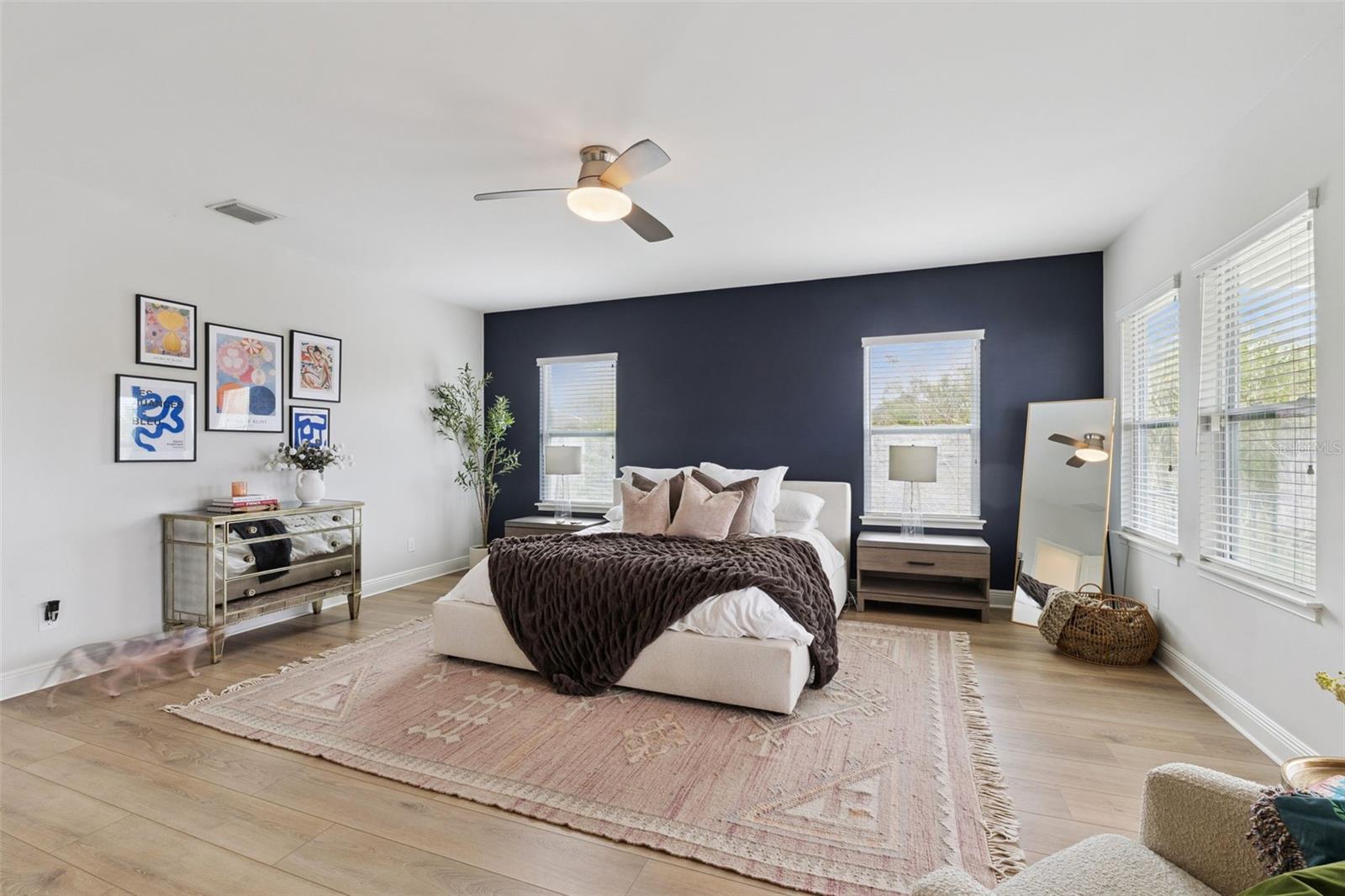 This meticulously maintained contemporary home is ideally situated on a premium FENCED corner lot just steps from the resort style community pool and clubhouse in sought after Ashlin Park in Windermere. Your family will enjoy the private and large fenced yard! This home is like new and features a long list of amazing upgrades - including recently installed luxury vinyl plank flooring and designer lighting. The entire home has a clean and contemporary design aesthetic with smooth walls and ceilings in serene colors, quartz countertops, flat panel 42” cabinets, tumbled marble and glass backsplash, and designer lighting. Tons of windows and double French doors provide abundant natural light for a bright and airy ambience. The kitchen is the heart of every home and this one offers a large island with seating, stainless appliances and an open flow into the family room, dining room and large screened lanai offering the ultimate space to entertain family and friends. The screened lanai is plumbed for a summer kitchen and offers a tranquil space to enjoy your outdoor oasis. The FENCED yard has mature privacy landscaping with room for your family and pets to run and play. Professionally landscaped with a well manicured lawn, the property is the envy of the neighborhood. Upstairs, the master suite is a harmonious retreat with French doors to a private balcony, a huge walk-in closet and a luxurious bath suite featuring a rain shower and jetted tub. The additional bedrooms are ample and elegantly appointed and ALL bedrooms feature luxury vinyl plank floors. The bathrooms are upgraded with premium cabinetry and quartz countertops. Ashlin Park is conveniently located for easy access to highways, theme parks, dining and shopping. The community pool and clubhouse are an easy walk from your front door and there are walking trails and park space throughout this tranquil neighborhood for exercise and leisurely strolls. Enjoy the charm of Windermere with easy access to the Butler Chain of Lakes, world class dining and entertainment, golfing, boating, fishing and more. Known for top-rated schools, Windermere truly offers a wonderful quality of life! This house is truly a MUST SEE! All information intended to be accurate but BUYER SHOULD VERIFY ALL MEASUREMENTS, SQ. FOOTAGE, HOA RESTRICTIONS AND FEES.