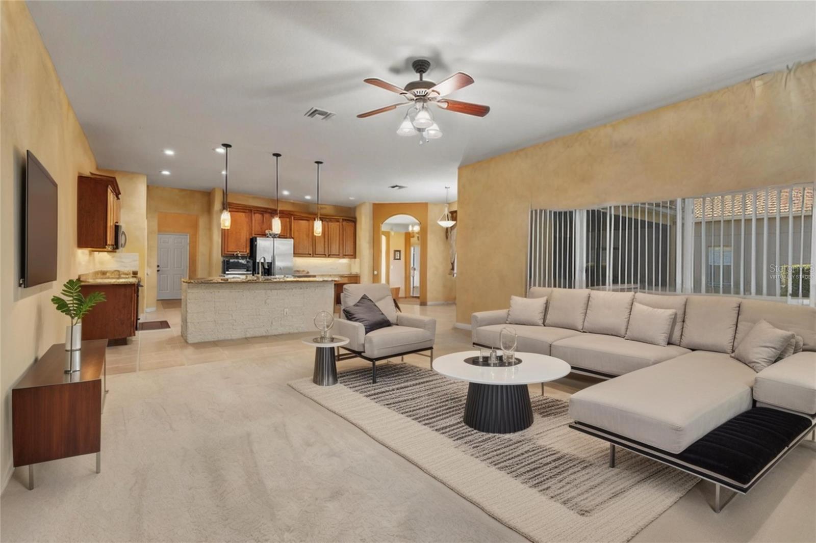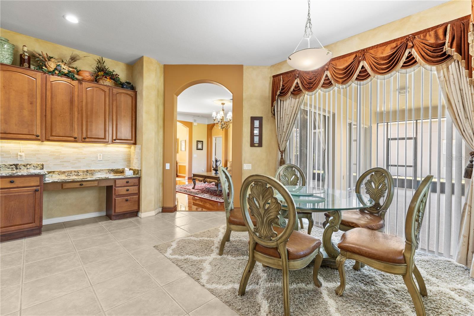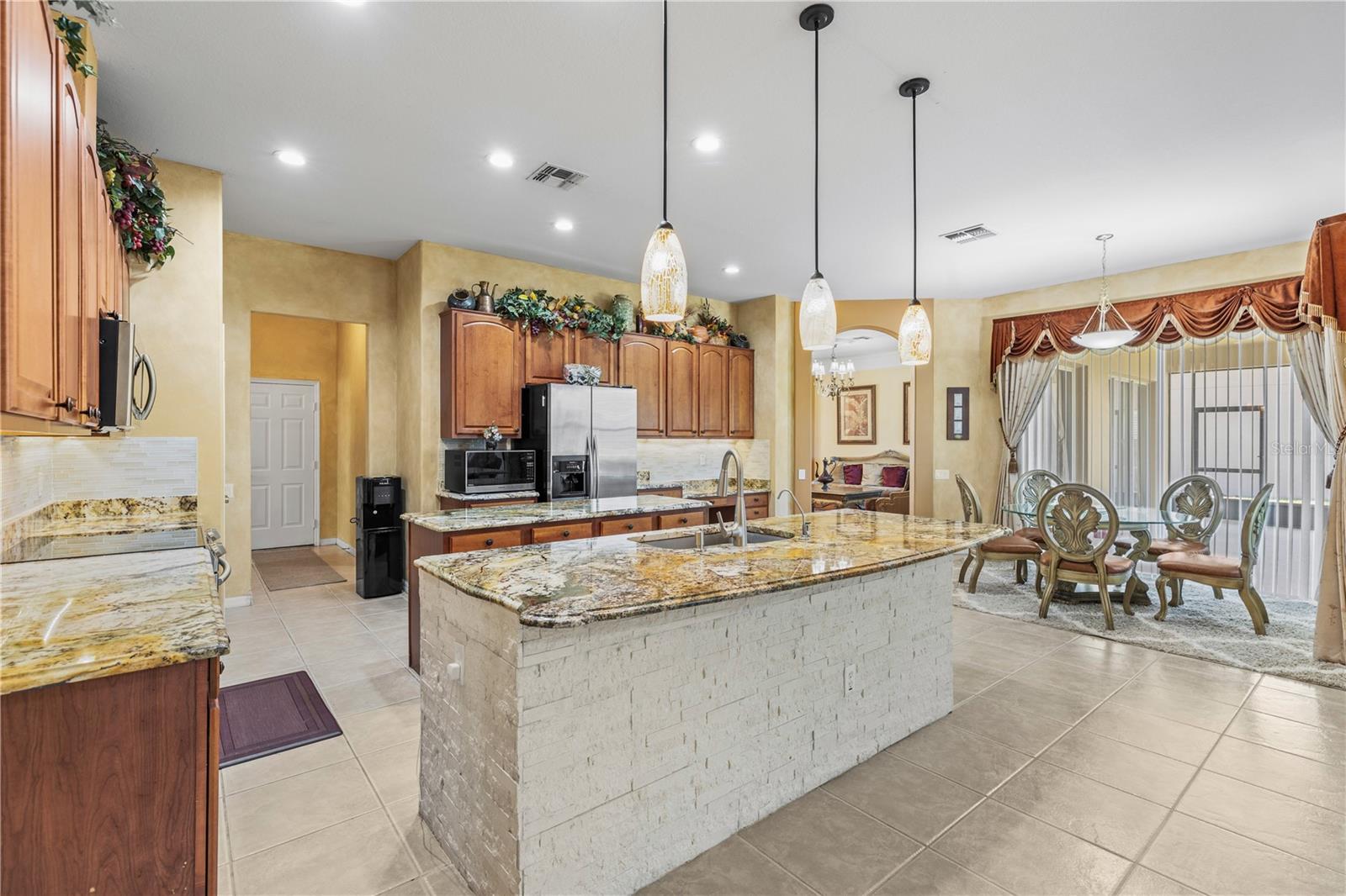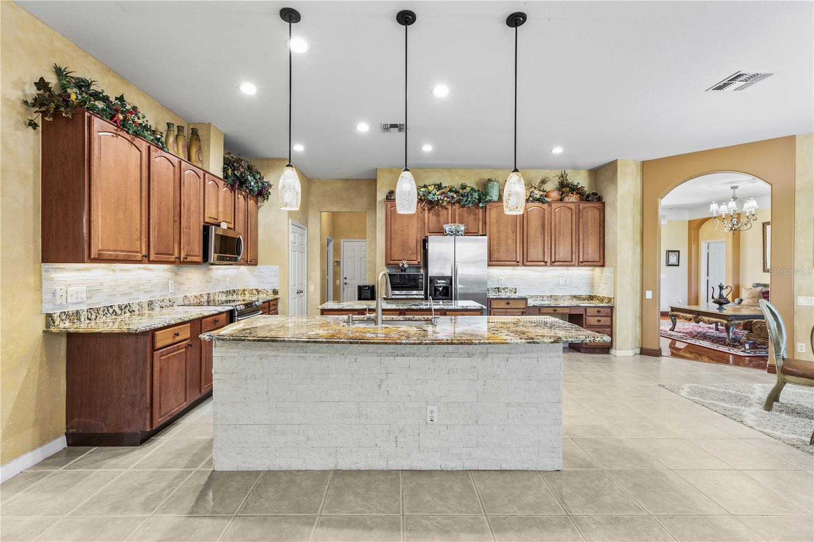 HUGE PRICE IMPROVEMENT!! SELLER MOTIVATED! Welcome to Glenmuir, one of Windermere’s most sought-after communities, where an elegant entrance sets the tone for this stunning tile-roof ranch home on an oversized 0.37-acre lot. Located within the zone of top-rated public schools and just minutes from Windermere Preparatory School, this home offers an excellent educational environment alongside luxury and convenience. Spanning 3,080 sq. ft., this thoughtfully designed 4-bedroom + den, 3.5-bathroom home boasts a spacious 3-car garage and an oversized driveway that can accommodate up to 9 vehicles. The open split-floor plan invites natural light and seamless flow throughout. Step through the elegant glass double doors into a welcoming foyer, where the custom-painted living and dining rooms create a refined ambiance. Adjacent to the dining area, a butler's pantry and half bath add both functionality and charm. To the right, a private den/office with French doors and an uplift standing desk provides the perfect space to work from home. The primary suite is generously sized and features a spa-like ensuite with a walk-in shower, soaking tub, double vanity, and large walk-in closet. The recently remodeled gourmet kitchen is a true showstopper, featuring exotic granite countertops, an island, 42” Cherrywood cabinets, ample storage, and stainless steel appliances. The breakfast nook seamlessly connects to the spacious family room, enhanced by a Samsung 75” wall-mounted TV and a sectional leather sofa, both included in the sale. A thoughtfully designed layout ensures privacy, with a guest suite offering an en-suite bath with pool access, while the remaining two bedrooms share a well-appointed third full bath. Additional highlights include a large laundry room with a Whirlpool Duet washer & dryer, cabinet storage, and a cooking range hookup, plus a whole-house water softener, reverse osmosis water filter, and rain gutters. Step outside to your backyard oasis, where a spacious screened-in patio overlooks two serene ponds, creating a tranquil setting with ample room to build your dream pool. The lush landscaping is a gardener’s paradise, featuring 3 mature mango trees, a jackfruit tree, banana trees, persimmon, lychee, fig, Hass avocado, sugar apple, and vegetable beds—a rare find! Additional upgrades include two A/C units (one replaced last year) and two Ring security cameras for added peace of mind. Majority of the furniture is negotiable if the buyer is interested (see the attached list for details). MOVE-IN READY—No stairs to climb, just plenty of space to spread out and enjoy! Don’t miss this incredible opportunity—schedule your private showing today!