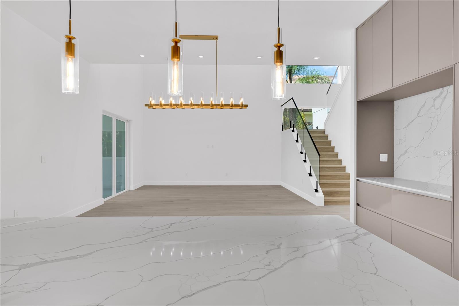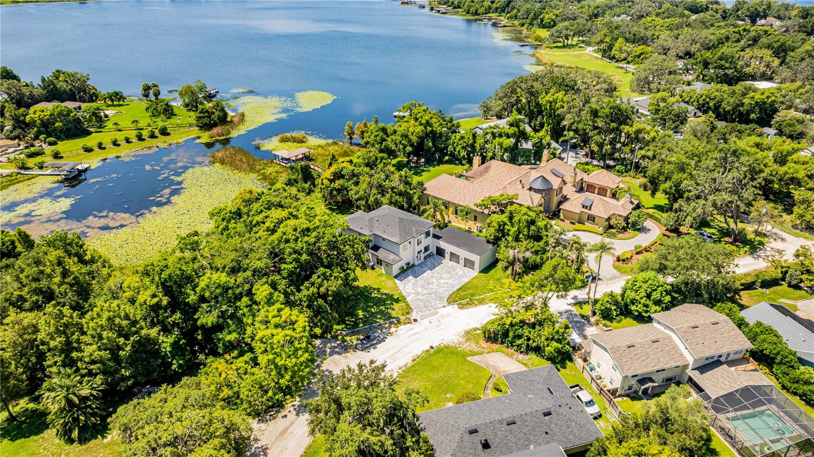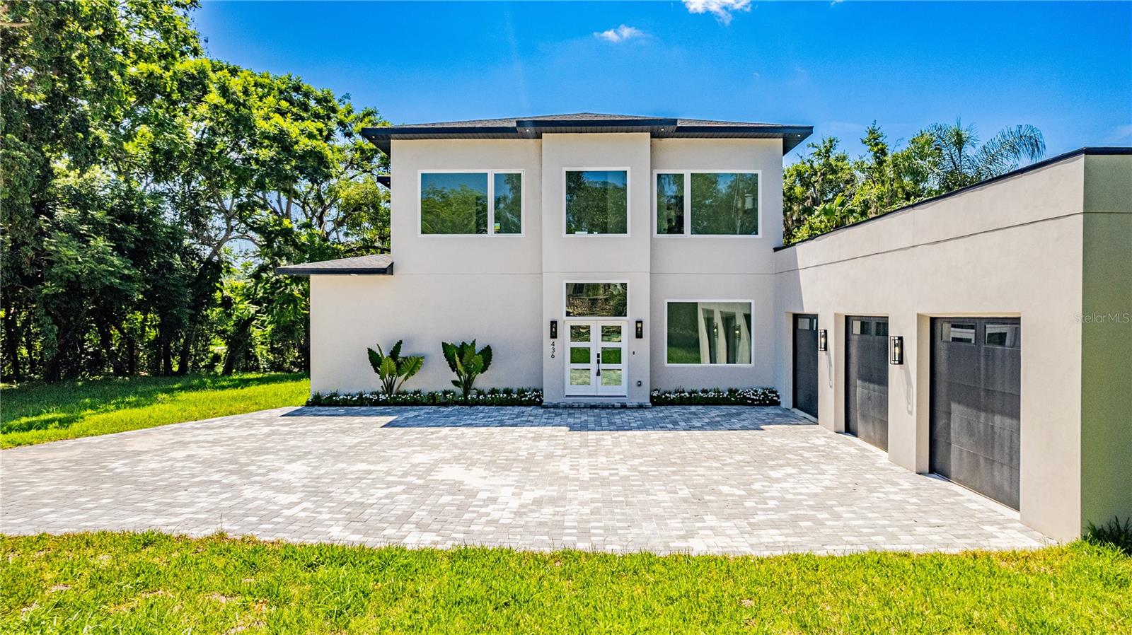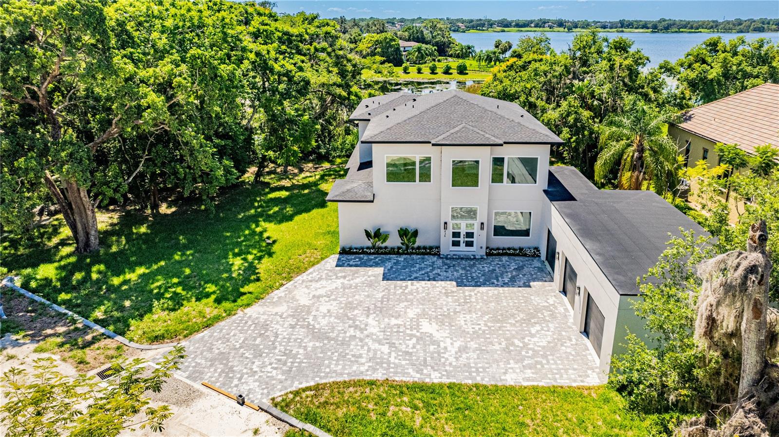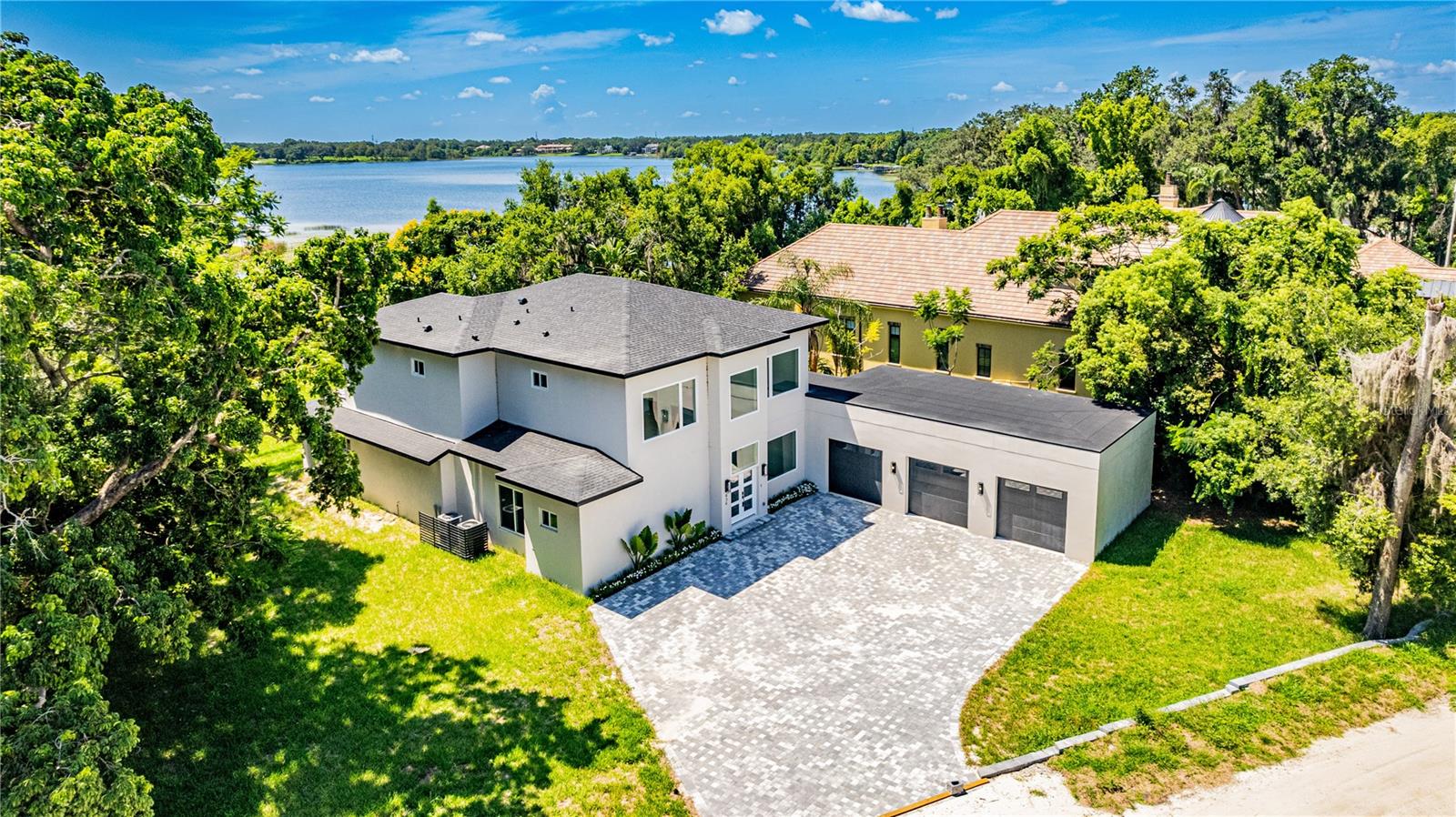 Under Construction. Luxury new construction lakefront home in Windermere, newly completed. Situated on Lake Bessie, this modern custom residence delivers architectural elegance, premium finishes, and a prime location just steps from the Town Center. The home offers 3,136 sq ft of air-conditioned space, featuring 4 en-suite bedrooms, a dedicated office at the entry, 5 full bathrooms, an outdoor shower, and an oversized 3-car garage. A dramatic two-story living area sets the tone with clean lines, expansive glass, and natural light throughout. The chef’s kitchen pairs performance and elegance, with a waterfall-edge quartz island, full-height book-matched backsplash, custom cabinetry, and high-end appliances including a Sub-Zero refrigerator, Wolf vent hood, and a full Thermador suite with double ovens and microwave drawer. A hidden walk-in pantry blends seamlessly into the design for added utility and clean aesthetics.Upstairs, the owner’s suite offers lake views, a spacious layout, and a sleek en-suite bath with a large walk-in shower and dual vanity. Secondary bedrooms include en-suite baths and reach-in closets. The home is finished with oversized rectangular porcelain tile throughout the entire main level including the expansive covered lanai and wide plank engineered wood flooring from the staircase through the second floor. Additional highlights include a glass-framed staircase and an abundance of natural light in every space. Located just blocks from Downtown Windermere, this home places you at the center of a highly coveted lakefront lifestyle. Enjoy tennis courts, playgrounds, boat ramps on both Lake Bessie and the Butler Chain, plus a vibrant local culture with weekly farmers markets, food truck nights, and seasonal events in Town Square. Cruise oak-lined sandy streets by golf cart, or explore nearby dining, shops, and fitness at The Grove and along Restaurant Row. World-class golf, theme parks, and the airport are all within easy reach and with the hard work already done, all that’s left is to move in and enjoy. Private showings by appointment only.
