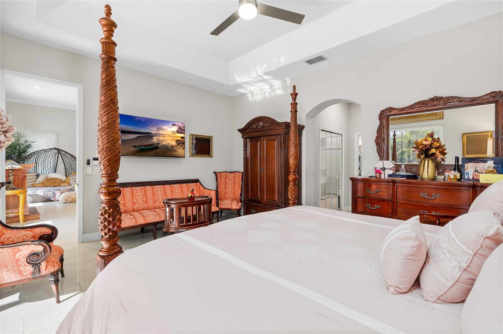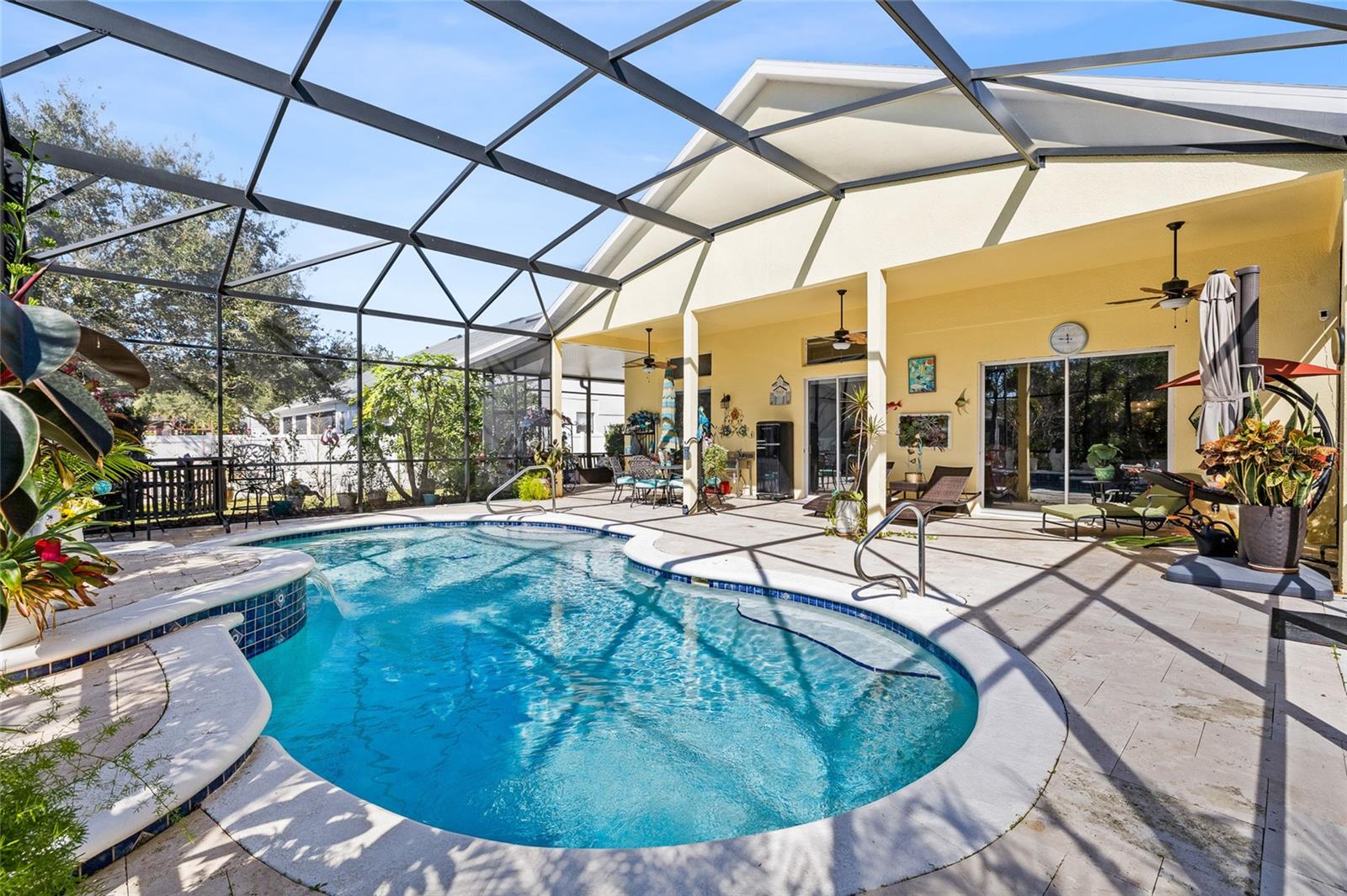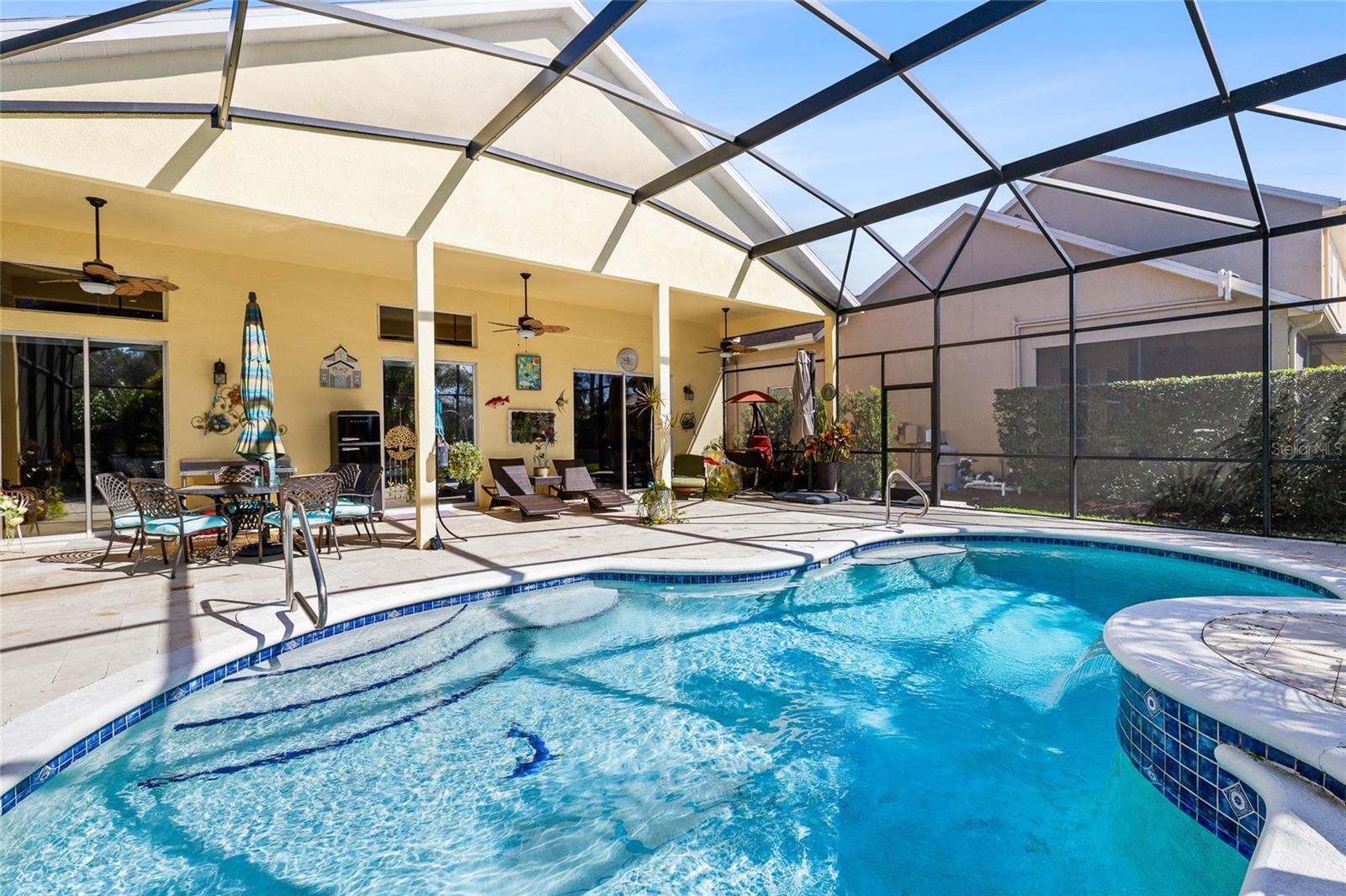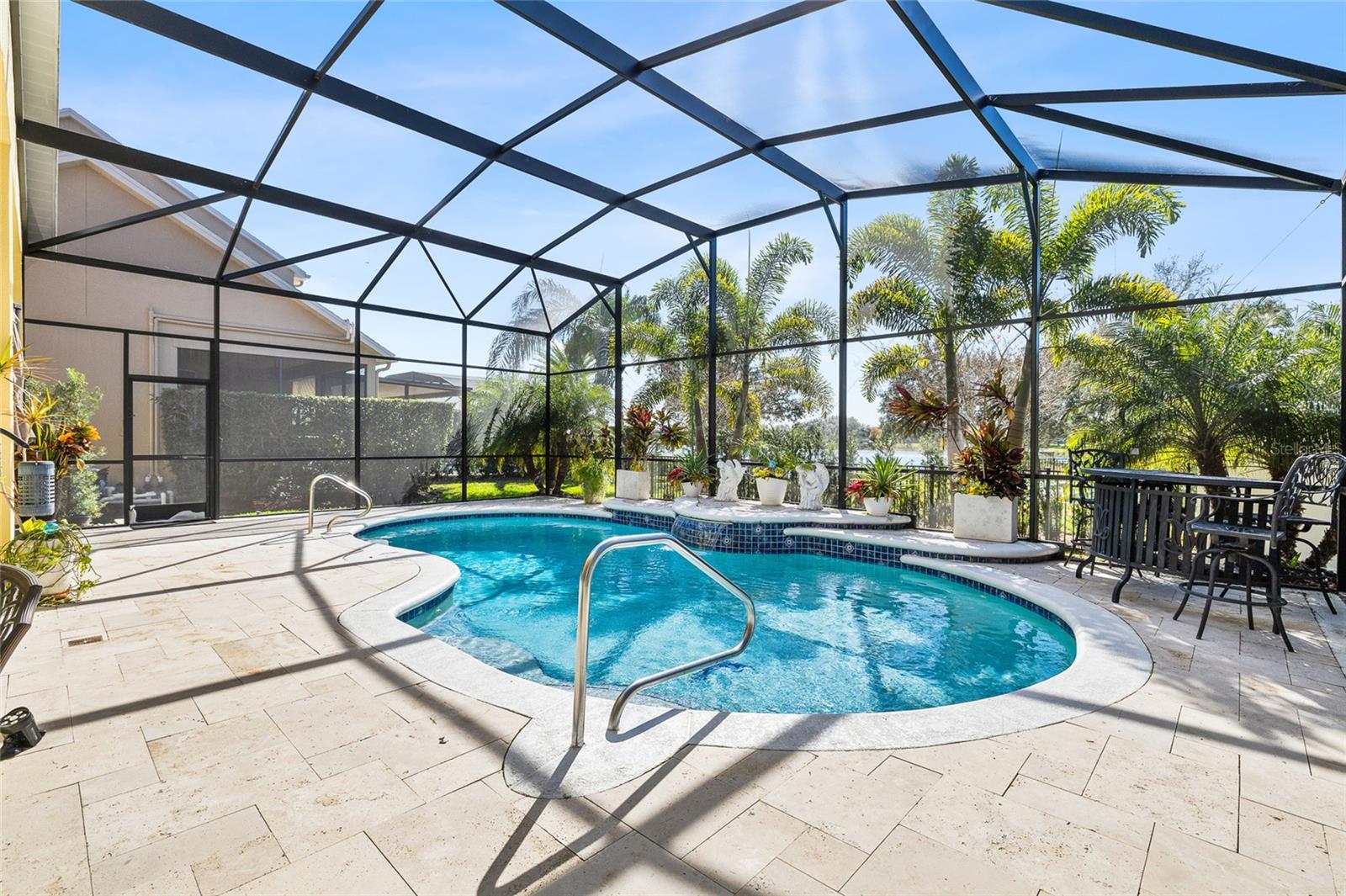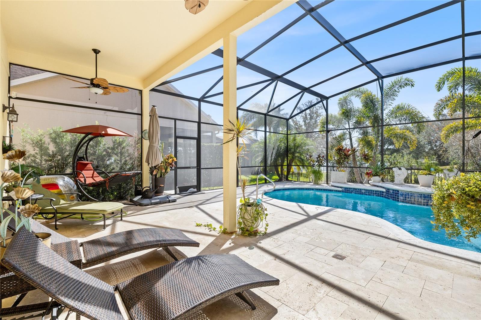 Welcome to 5018 River Gem Avenue, an exceptional one-story pool estate with serene pond views in the prestigious Summerport community of Windermere, perfectly positioned for luxury living, convenience, and resort-style enjoyment — only 20 minutes from the Disney Theme Parks, Disney Springs, premier shopping, dining, and major roadways. This 3-bedroom, 2.5-bath, 2,379 sq ft showpiece features a refined split floor plan with 10- and 12-foot ceilings, abundant natural light, and new tile and marble flooring throughout (no carpet). Custom interior finishes elevate the living spaces, while tranquil water views grace multiple rooms. Recent high-end improvements include a new pool screen enclosure (Jan 2025), vinyl/iron fencing (2023), roof (2018), tankless water heater (2017), HVAC (2017), and Kinetico water softener & reverse osmosis system (2023). A natural gas line is in place for future chef-ready upgrades. The gourmet kitchen boasts granite countertops, stainless steel appliances, wood cabinetry, a raised breakfast bar, and a cozy nook overlooking the great room and pool. Designed for effortless entertaining, the interior flows to the travertine-finished, screen-enclosed lanai, extended patio, and solar-heated saltwater pool with a new pool pump (2025) and salt cell (2024, with warranty) — all framed by calming pond vistas. The primary suite is a private sanctuary with a tray ceiling, dual walk-in closets, garden tub, electronic window treatments, and direct access to outdoor living. Additional highlights include a pool-access half bath, oversized split garage with high ceilings and deep storage, and impeccably landscaped, low-maintenance grounds with mature fruit trees (lemon, lime, avocado, guava and papaya). Living in Summerport means enjoying an unparalleled lifestyle. Residents have access to the community’s exclusive clubhouse and pool complex with fitness center and social spaces at Summerport Residential POA Clubhouse. Meandering walking and biking trails, parks, and green spaces provide daily opportunities for outdoor recreation just steps from home. The nearby Summerport Neighborhood Park offers playgrounds, picnic areas, and scenic paths for all ages. For everyday convenience, Cornerstone at Summerport village-style shopping is just around the corner, providing groceries, cafés, services, and more. Downtown Windermere and Winter Garden’s vibrant boutiques, specialty dining, and lifestyle retail are also moments away, with premier destinations like Winter Garden Village and The Grove reachable in under 15–20 minutes. This remarkable home blends luxury, comfort, and lifestyle — ideal as a primary residence, second home, or Florida retreat with everything you want just minutes away.