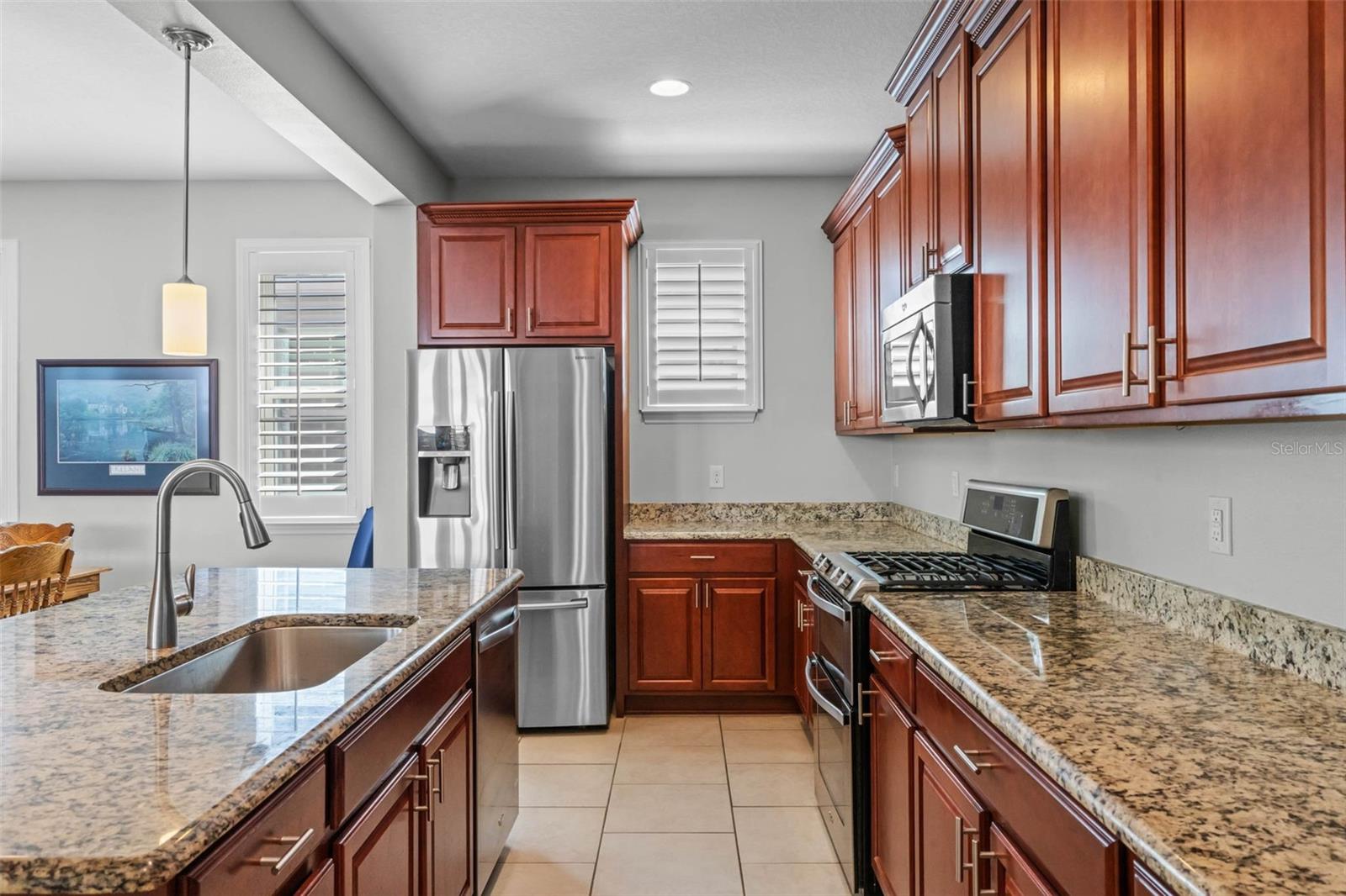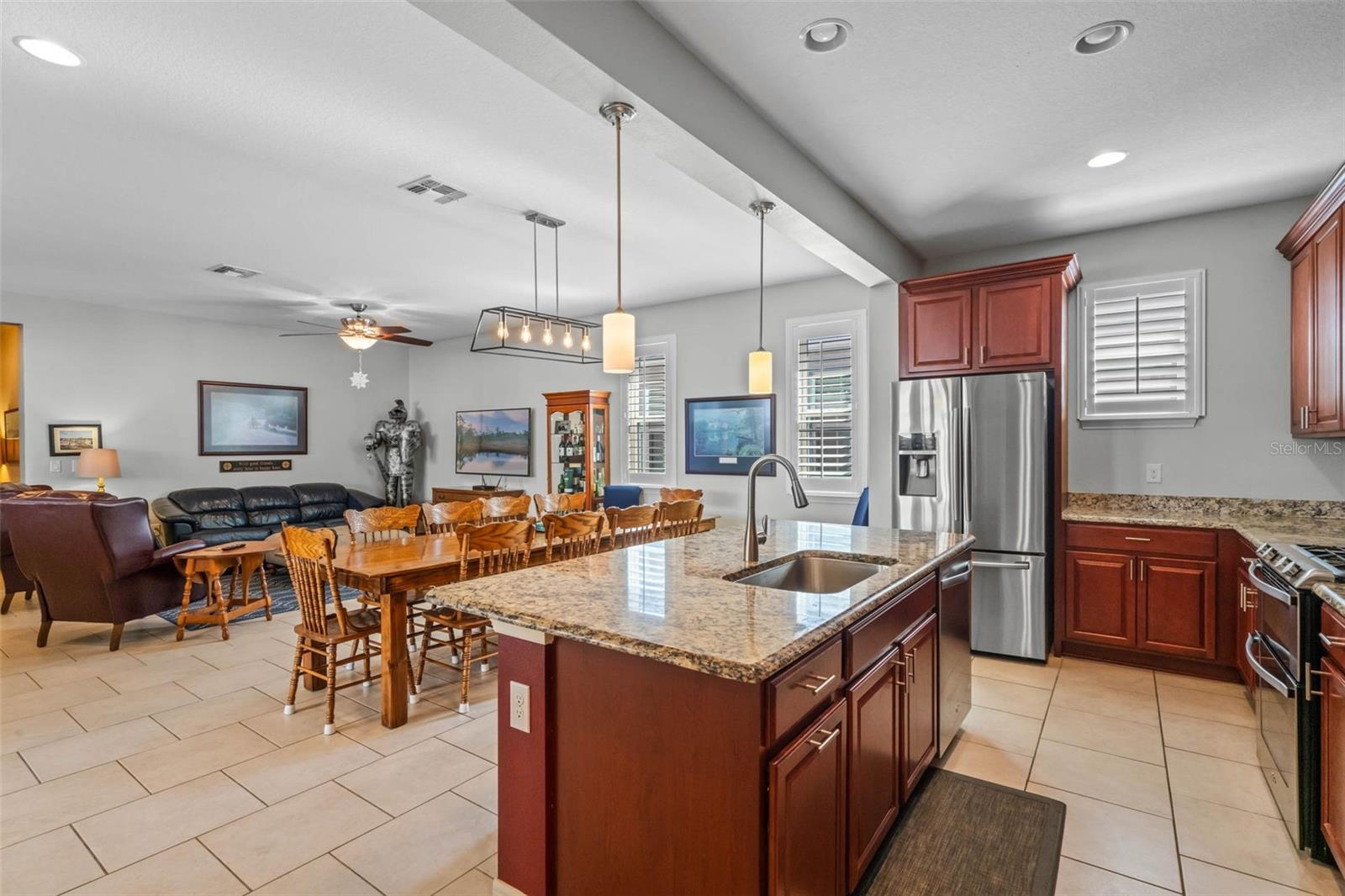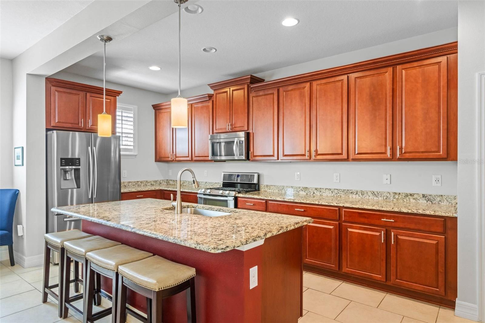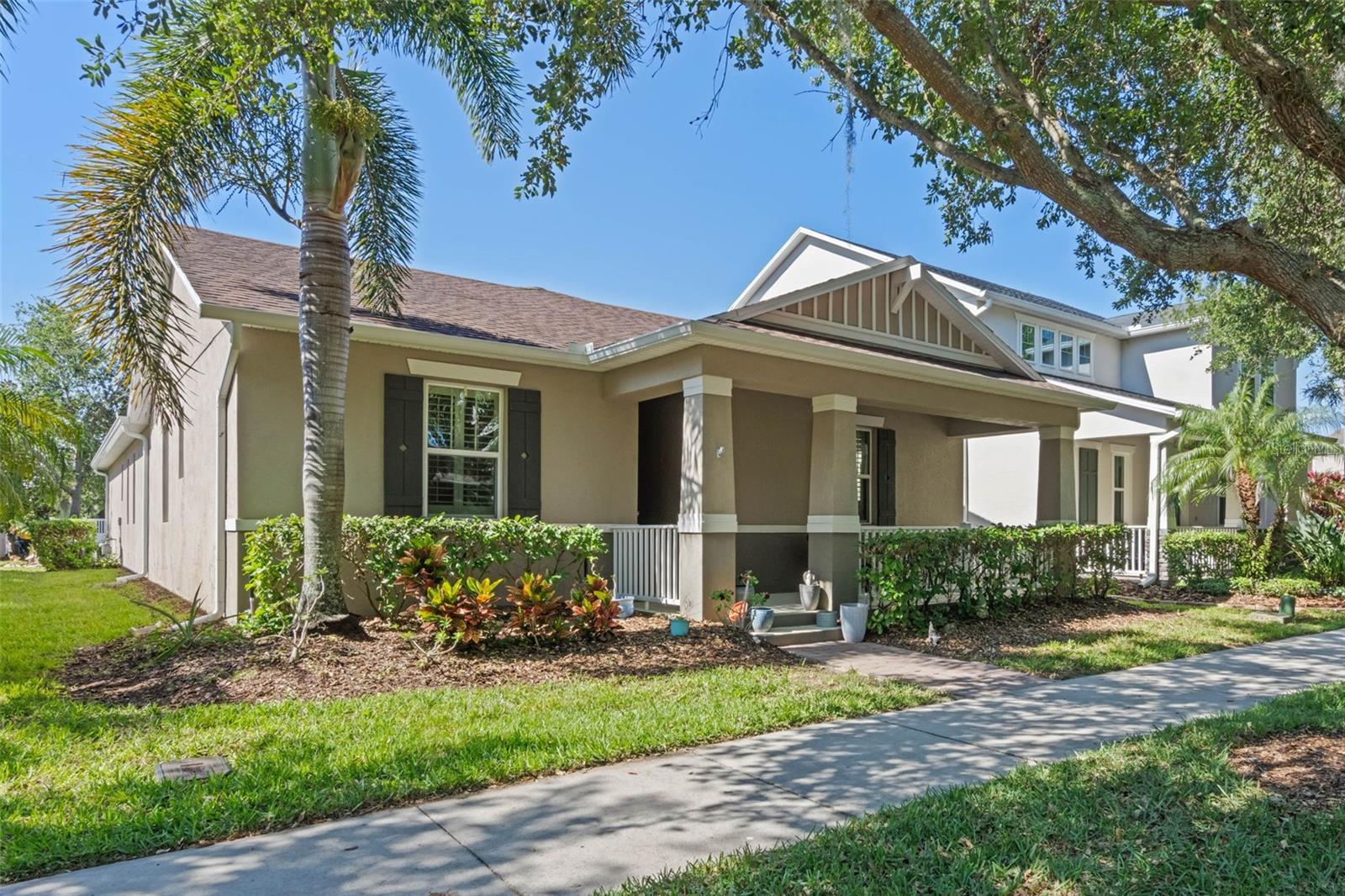 Welcome home to this beautiful residence in the highly desirable Summerlake community of Winter Garden! This charming single-story home features an open floor plan with 4 bedrooms, 2 bathrooms, and an oversized garage that accommodates two cars plus a golf cart. The spacious front porch invites you to relax and enjoy the friendly neighborhood vibe, with plenty of room for seating. Inside, you'll find extended tile flooring throughout the main living areas, elegant plantation shutters, and craftsman-style interior doors that add a touch of timeless character. At the heart of the home, the chef’s kitchen features a large granite island overlooking the family room, complete with a single basin sink and stylish pendant lighting. The kitchen is equipped with a gas range with double ovens, ample cabinetry with built-in trash cabinet and rollout drawers, and generous counter space—perfect for both everyday living and entertaining. Whether you're a passionate home cook or simply enjoy hosting family and friends, you’ll love the thoughtful features of this kitchen. The kitchen flows seamlessly into the dining area and spacious family room, creating an inviting and open atmosphere. A sliding glass door leads to the oversized, covered, and screened lanai—ideal for outdoor living. You'll enjoy the built-in grill area with a beverage refrigerator, perfect for weekend barbecues or evening relaxation. The fully fenced backyard adds privacy and charm, making it a cozy retreat. The primary suite is a true sanctuary, filled with natural light and designed for comfort. The ensuite bathroom features a walk-in shower, soaking tub, and a spacious walk-in closet. Additional bedrooms are well-sized, with the fourth bedroom also offering a walk-in closet. The secondary bathroom is finished with granite countertops and modern fixtures. The laundry room is generously sized, with space for a second refrigerator, and comes equipped with a washer and dryer. One of the standout features of this home is the added garage bay—perfect for storing a golf cart, bikes, workshop tools, or additional storage. The extended driveway also provides extra parking space. The Summerlake community offers resort-style amenities, including a pool with splash pad, clubhouse, fitness center, tennis courts, dog park, playgrounds, and a half basketball court. The HOA covers lawn maintenance, allowing for low-maintenance living. The home is zoned for A-rated schools, and Summerlake Elementary is conveniently located within the community. You’ll also love the convenience of being near the Hamlin retail center, with shops, dining, a hospital, theater, and more—all just minutes away from the 429 Expressway. Plus, you’re a short drive from Disney and other world-famous Orlando attractions. This home has been lovingly cared for and is ready for new owners to make lasting memories. Don’t miss the opportunity to make it yours—schedule your private showing today!