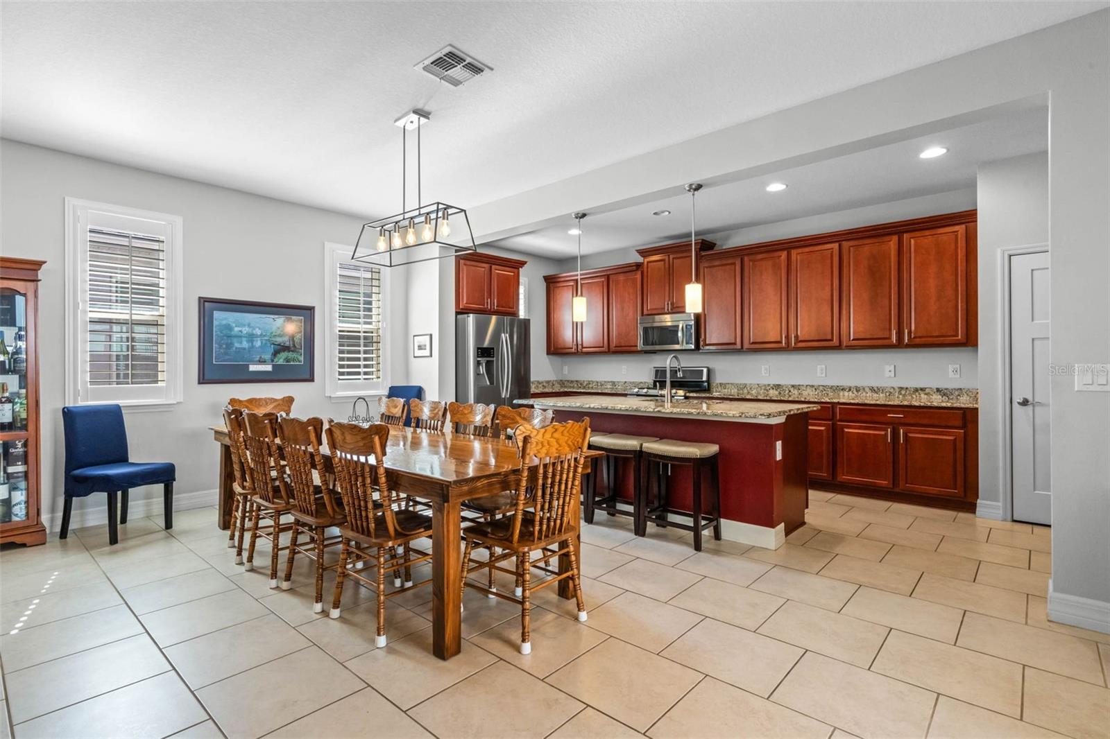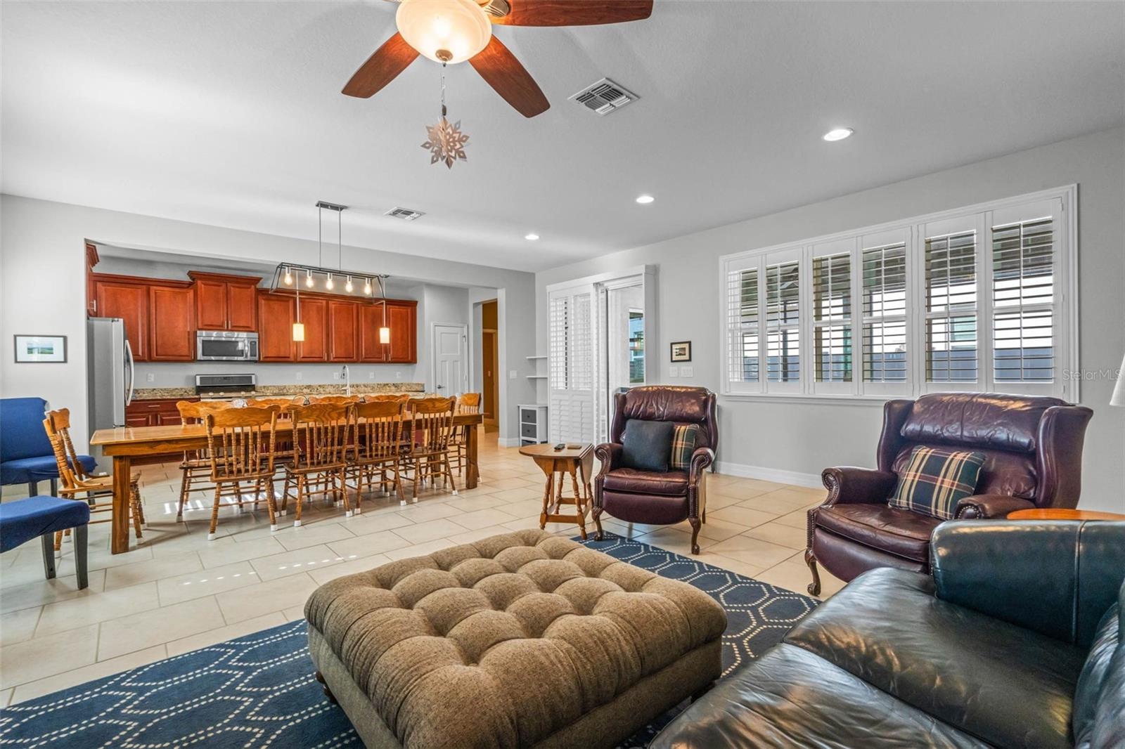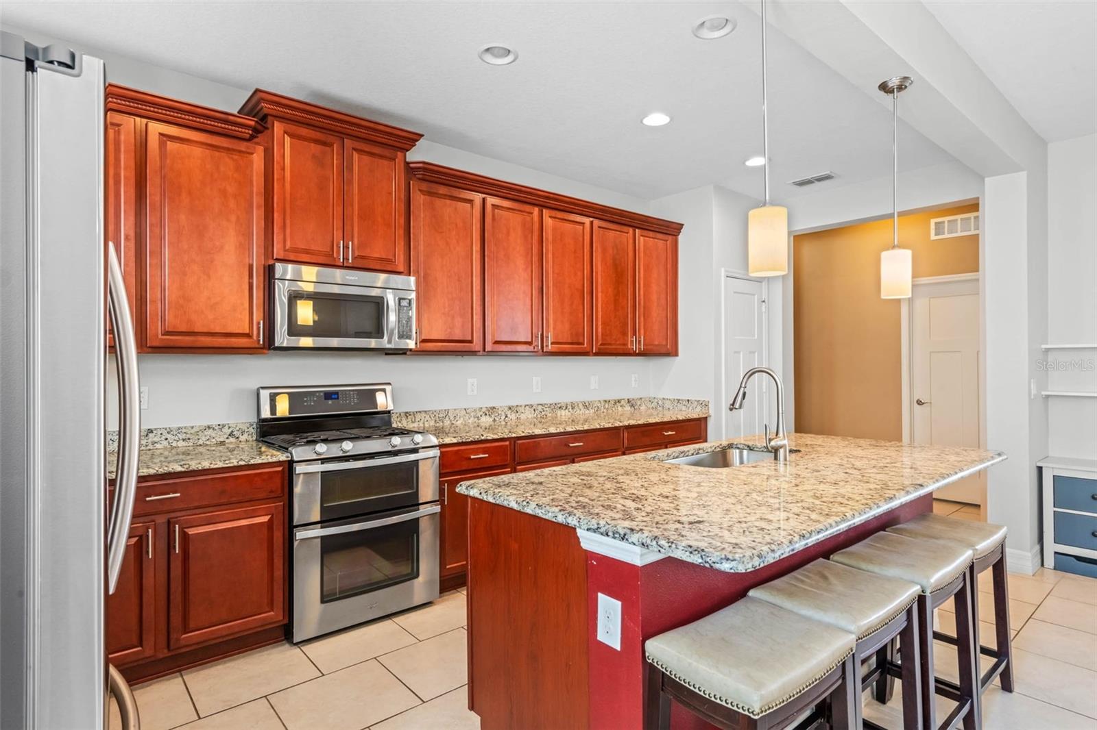 Welcome home to this beautiful residence in the highly desirable Summerlake community of Winter Garden! This charming single-story home features an open floor plan with 4 bedrooms, 2 bathrooms, and an oversized garage that accommodates two cars plus a golf cart. The spacious front porch invites you to relax and enjoy the friendly neighborhood vibe, with plenty of room for seating. Inside, you'll find extended tile flooring throughout the main living areas, elegant plantation shutters, and craftsman-style interior doors that add a touch of timeless character. At the heart of the home, the chef’s kitchen features a large granite island overlooking the family room, complete with a single basin sink and stylish pendant lighting. The kitchen is equipped with a gas range with double ovens, ample cabinetry with built-in trash cabinet and rollout drawers, and generous counter space—perfect for both everyday living and entertaining. Whether you're a passionate home cook or simply enjoy hosting family and friends, you’ll love the thoughtful features of this kitchen. The kitchen flows seamlessly into the dining area and spacious family room, creating an inviting and open atmosphere. A sliding glass door leads to the oversized, covered, and screened lanai—ideal for outdoor living. You'll enjoy the built-in grill area with a beverage refrigerator, perfect for weekend barbecues or evening relaxation. The fully fenced backyard adds privacy and charm, making it a cozy retreat. The primary suite is a true sanctuary, filled with natural light and designed for comfort. The ensuite bathroom features a walk-in shower, soaking tub, and a spacious walk-in closet. Additional bedrooms are well-sized, with the fourth bedroom also offering a walk-in closet. The secondary bathroom is finished with granite countertops and modern fixtures. The laundry room is generously sized, with space for a second refrigerator, and comes equipped with a washer and dryer. One of the standout features of this home is the added garage bay—perfect for storing a golf cart, bikes, workshop tools, or additional storage. The extended driveway also provides extra parking space. The Summerlake community offers resort-style amenities, including a pool with splash pad, clubhouse, fitness center, tennis courts, dog park, playgrounds, and a half basketball court. The HOA covers lawn maintenance, allowing for low-maintenance living. The home is zoned for A-rated schools, and Summerlake Elementary is conveniently located within the community. You’ll also love the convenience of being near the Hamlin retail center, with shops, dining, a hospital, theater, and more—all just minutes away from the 429 Expressway. Plus, you’re a short drive from Disney and other world-famous Orlando attractions. This home has been lovingly cared for and is ready for new owners to make lasting memories. Don’t miss the opportunity to make it yours—schedule your private showing today!