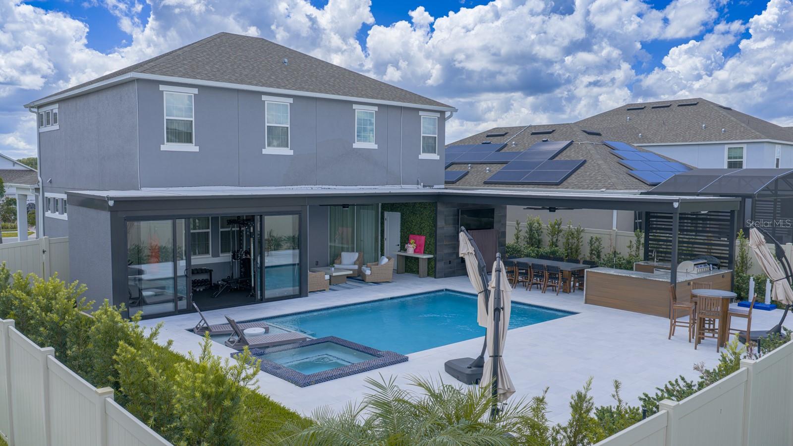 Luxury Living in Tilden Place – An Exclusive Offering in Winter Garden Welcome to a home where sophistication meets smart design in one of Winter Garden’s most desirable gated communities, Tilden Place. This impeccably curated 5-bedroom, 4-bath residence offers the perfect balance of elegance, comfort, and functionality. On the main floor, a private guest room and a full bath provides an ideal space for visitors or extended family. The open-concept design effortlessly connects the living room, kitchen with gas cooktop, and expansive outdoor area creating a seamless indoor-outdoor lifestyle perfect for everyday living and entertaining. Upstairs, three additional bedrooms each include spacious walk-in closets. A large bonus loft provides the flexibility for a family room, game area, home theater, or a fifth bedroom complete with its own walk-in closet. Luxury vinyl plank flooring throughout the second level and stairs adds both durability and elegance, while custom closets and built-in cabinetry speak to the home’s exceptional attention to detail. Over $50,000 has been invested in high-end custom cabinetry and flooring, with an additional $10,000 in designer curtains enhancing the ambiance. Step outside into your private $280,000 outdoor retreat a true showpiece featuring a resort-style pool, fully equipped summer kitchen with built-in BBQ, full bathroom, and a covered outdoor gym, all under a sleek pergola designed for shade and privacy. Summer kitchen features granite countertops, premium stainless steel appliances including refrigerator, dishwasher, and built-in ice maker, along with custom cabinetry for ample storage. Additional Features:? ?? 2-car garage? ?? Prime corner lot for added privacy? ?? Upscale finishes? ?? Smart floorplan with abundant storage throughout