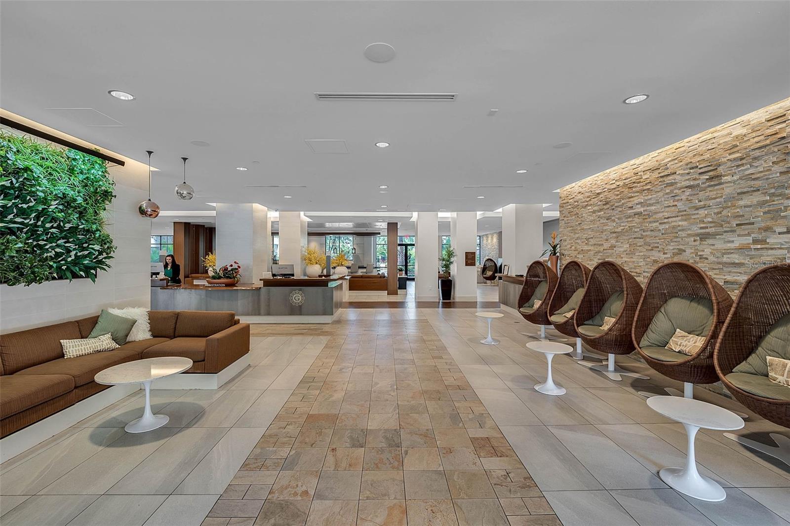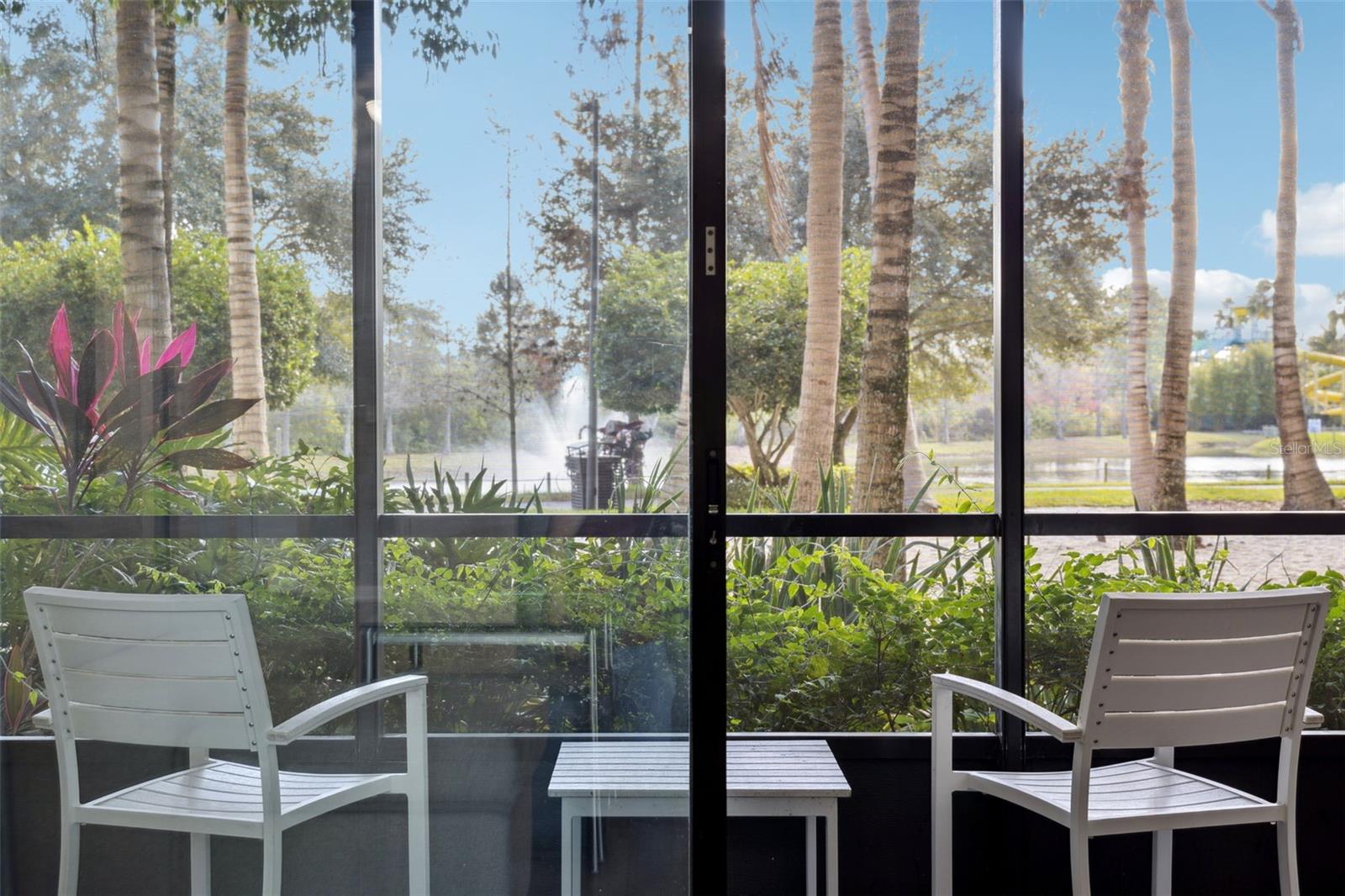 Ground Floor Unit | Pond and Fountain Views | Aggressively Priced Ground floor residence featuring 14 foot ceilings exclusive to first floor units, creating an open and spacious main living area. Ideally positioned within the community, the unit offers quick access to nearby resort amenities. Ground level units are often favored for vacation use due to convenient access without stairs or elevators. The screened private lanai overlooks a courtyard with pond and fountain views, framed by lush landscaping and mature palm trees. Interior features include stainless steel appliances, granite countertops, and a full size washer and dryer. The well designed split floor plan includes two bedrooms plus a pull out sofa, accommodating up to six guests. The community is professionally managed as a Condo Hotel, offering owners participation in an on-site rental program to help offset ownership costs when the unit is not in use. HOA fees conveniently covers all utilities as well as pest control, sewer, trash, and common-area insurance. Located within The Grove Resort & Water Park, a Disney World® Good Neighbor Hotel, owners and guests enjoy Surfari Water Park, FlowRider® surf simulator, fitness center, on site dining, walking trails, covered parking, lake access, and shuttle service to the Walt Disney World® Resort. ________________________________________