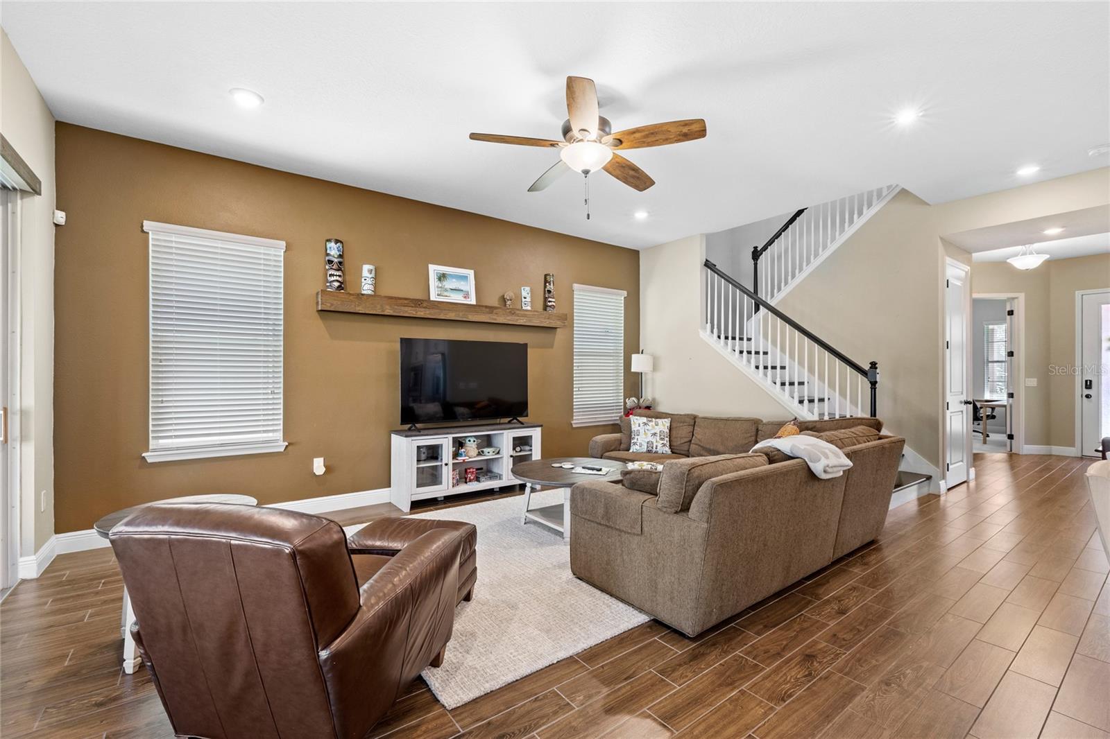 With glimpses of Magic Kingdom fireworks from the front porch, this five bedroom, three bath home is just a ten minute drive from Disney property. Within a ten minute walk, you will find Starbucks, Huey Magoo’s, New York Beer Project, AdventHealth, Walgreens, and everything The Mark shopping complex has to offer. Few areas provide this balance of residential privacy and true walkability, with the added benefit of a community pool just moments away. Inside, the bright kitchen with light cabinetry and quartz counters anchors the main level. A first floor bedroom with a generous closet, paired with a full three piece bath, offers flexibility for guests, a home office, or a future pool bath with direct outdoor access. Storage is thoughtfully integrated throughout the home, a true commodity in Central Florida. Under stair storage and an upstairs storage closet provide ample space for everything from sports equipment to holiday decorations. The backyard is larger than many in the neighborhood, offering a rare sense of openness with space for evenings around the firepit, room to add a future pool, and plenty of lawn for pets or outdoor living. Set within an A rated school district and one of the most connected pockets near Disney, this home offers a blend of location, livability, and long term value for anyone seeking space without sacrificing convenience.