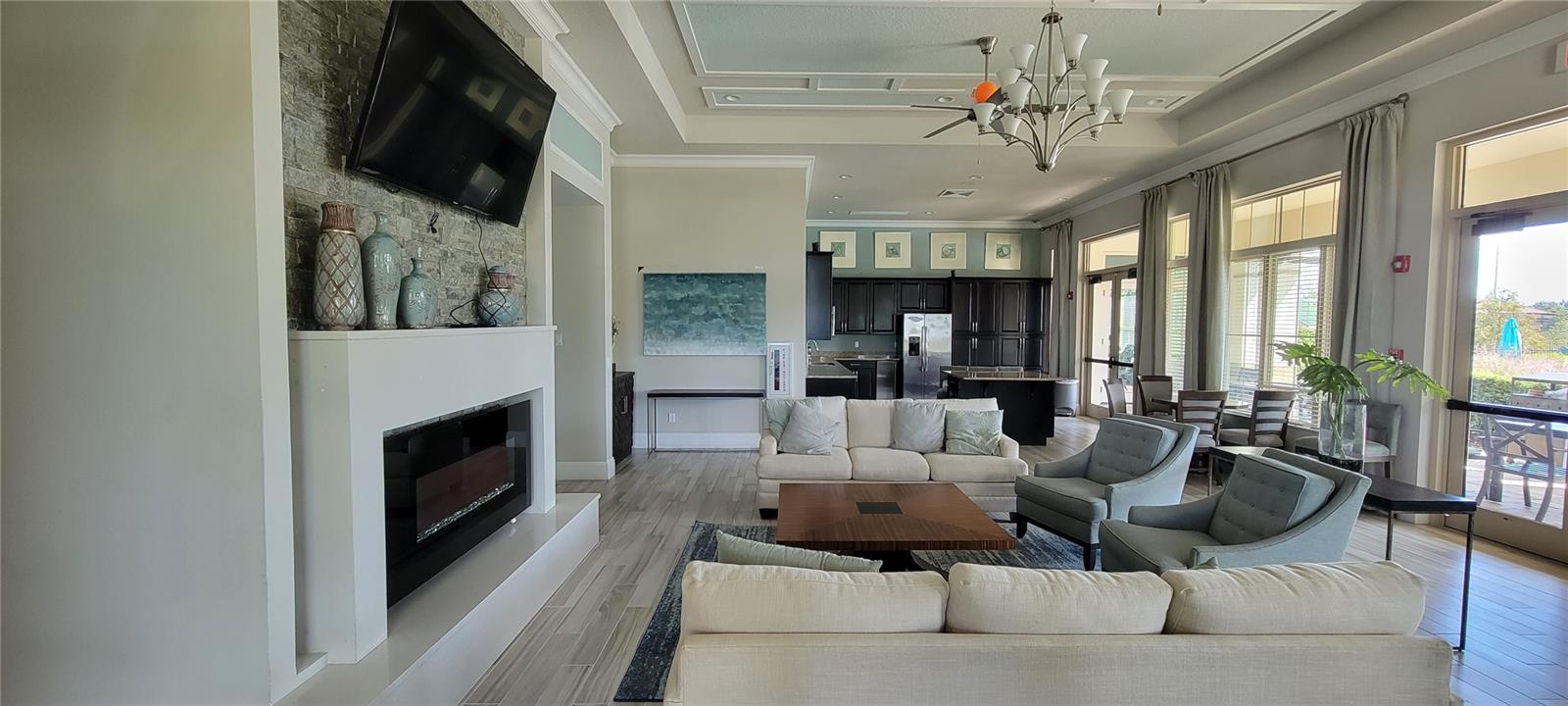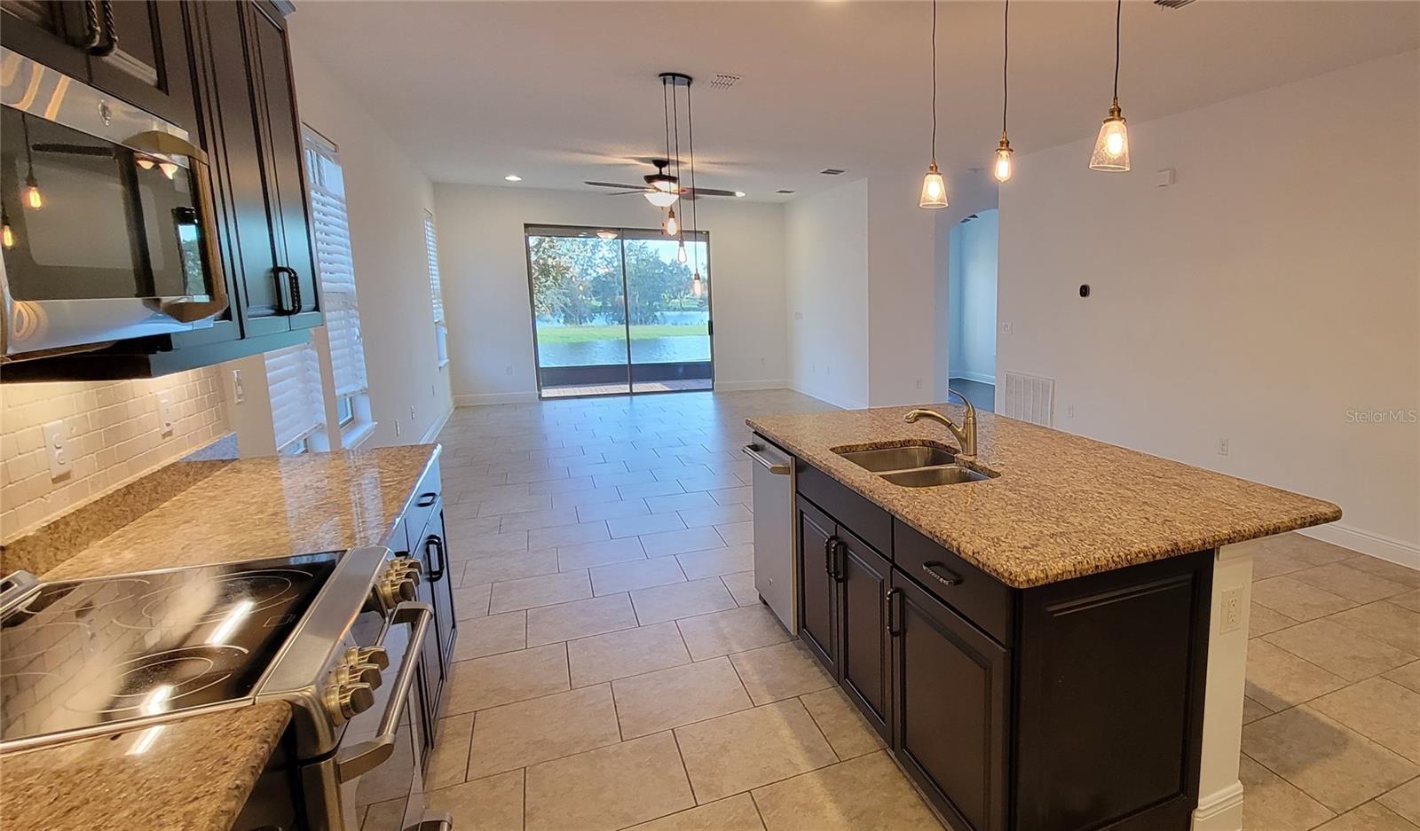Beautiful Waterfront 4-3 home in Waterleigh with large green space in front of the home and INCREDIBLE pond and lake views in back. This desirable Calder model is a 1 story home and offers 4 bedroom, 3 baths, plus a den/office with many upgrades and great views. The front drive and walkway are paved and lead up to a large porch with a peaceful view of a wide green space with mature trees. The home is detailed with tall ceilings and 8-foot, 6 panel decor doors throughout, recessed tray ceilings, elegant arches, and a tasteful light beige-colored walls throughout. Décor tile floor through the main home, and beautiful wood floor style plank tile in all bedrooms. The Designer kitchen has moco-colored, tiered, 42-inch cabinets with crown molding and under cabinet lights to accent the tumbled marbled backsplash, café` series kitchen stainless-steel appliances, and accented by gorgeous granite counters. It offers a glass top stove, French door fridge with bottom freezer, large walk-in pantry, and large sink island with breakfast bar, lite with pendant lights overlooking the family and dining area. The family room sliding door leads out to a covered and screened lanai with incredible serene water views. A second patio is outside for the cooler days to soak up the sun. The Primary Bedroom has water views, tray ceiling with fan and recessed lighting. The Primary bathroom has a walk-in shower with glass enclosure, a large 8x9 ft walk-in closet, separate linen closet, separate toilet room and dual sink vanity with extra storage. The floor plan splits the primary bedroom away from the secondary bedrooms for privacy. Two bedrooms share a jack and jill bath with dual sinks and separate toilet and tub room for more efficient use. The 4th bedroom shares a hall bath near the laundry. The laundry room provides a washer and dryer installed and many cabinets and granite counters for storage. The office/den/flex room also faces the back with the awesome water views. All bedrooms, living room, and den/office/flex room all have ceiling fans. Lawn care is included in the HOA fees. This amazing home is in the highly desirable community “Waterleigh.” Located just off the 429 west of Disney, This community amenities include 3 resort style pools, 2 fitness gyms, club houses, putt-putt golf, dog park, huge sports fields, playground, beach volleyball, Tennis, lake dock and view BBQ/picnic area, with walking paths and exercise stations that wind around the scenic lakes, nature, and community for a relaxing and enjoyable lifestyle. Fast and easy access anywhere. Hospitals, restaurants and shopping are all close and many more are being built nearby. Great schools; Water Spring Elementary, Water Spring Middle, and Horizon Highschool. All information here is deemed reliable but not guaranteed. Please email for more information or to get started in making this incredible home, YOUR home.
