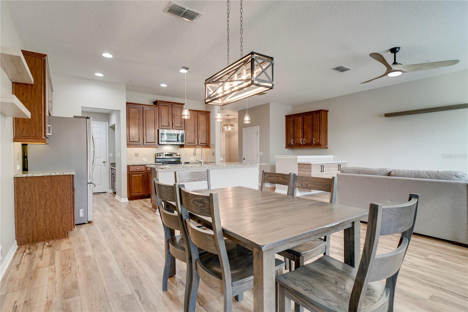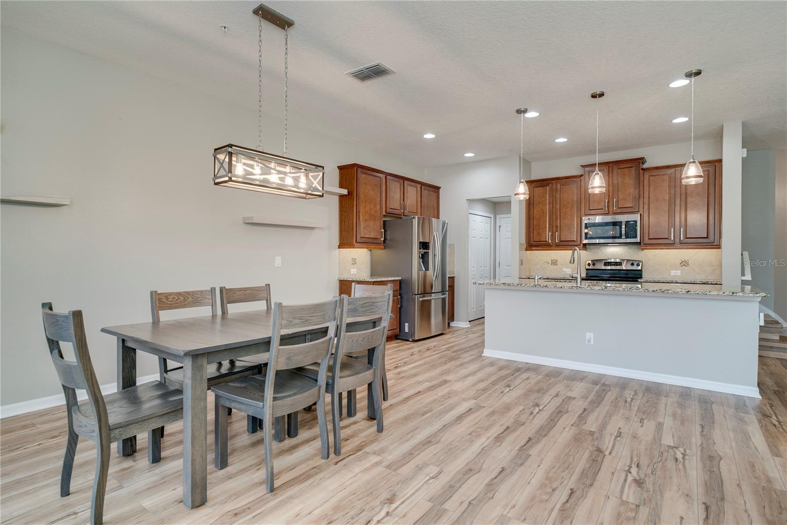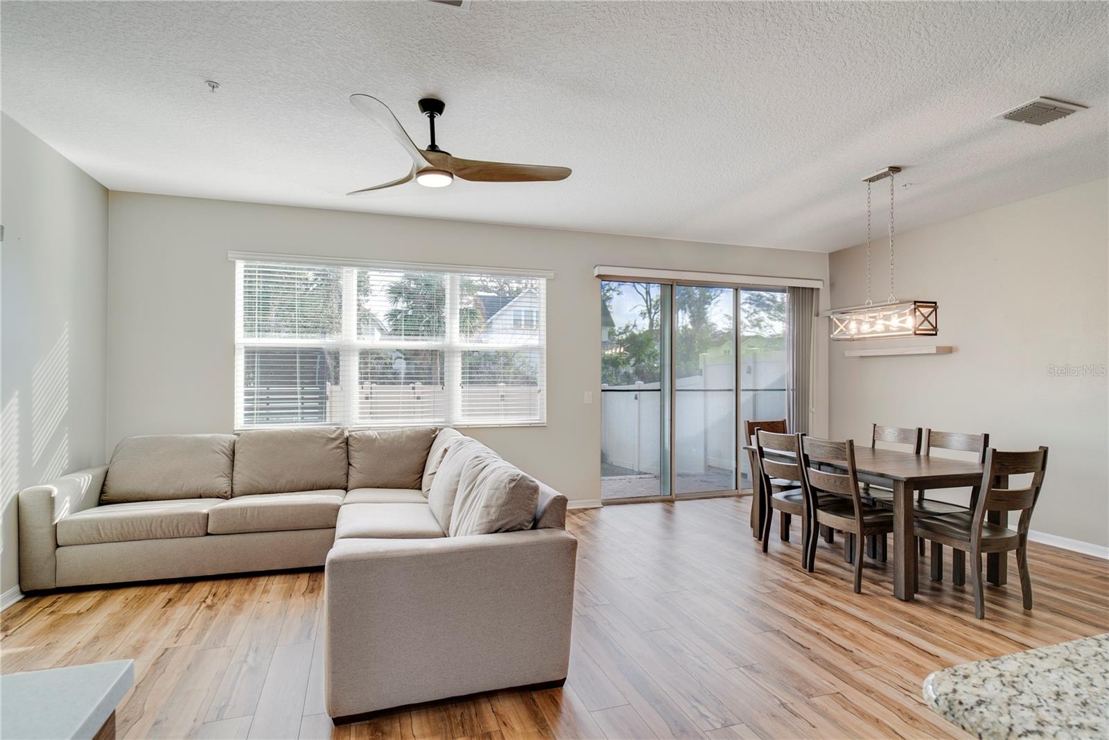 LIVE IN HISTORIC DOWNTOWN WINTER GARDEN just minutes from the weekly Winter Garden Farmers Market, Plant Street, Crooked Can Brewery, top-rated restaurants, bars, theater, and local shopping. Welcome to this luxury 3 bedroom / 2.5 bathroom townhome in the highly desired Walkers Grove community, featuring an open-concept layout and tons of natural light throughout. Pull into your paver driveway and step into a private foyer entry that opens to a spacious living and dining area with upgraded luxury vinyl plank flooring, modern ceiling fans, and updated fixtures. The kitchen is both stylish and functional with 42” wood cabinetry, granite countertops, stainless steel appliances, an eat-in space, and a built-in desk area perfect for working from home. From the dining room, triple sliding glass doors lead out to a large brick patio with low-maintenance turf and a fenced backyard area, ideal for entertaining, pets, or just enjoying Florida evenings. Upstairs you’ll find all three bedrooms plus a loft, along with a convenient second-floor laundry room. The oversized primary suite features a tray ceiling and a large walk-in closet, while the ensuite bath includes dual sinks, a separate shower, and a relaxing garden tub. Community perks include a resort-style pool and a playground, and you’re just steps from the West Orange Trail for biking, running, and weekend strolls. If you’ve been searching for a home that blends walkable downtown vibes with low-maintenance living, this one checks all the boxes.