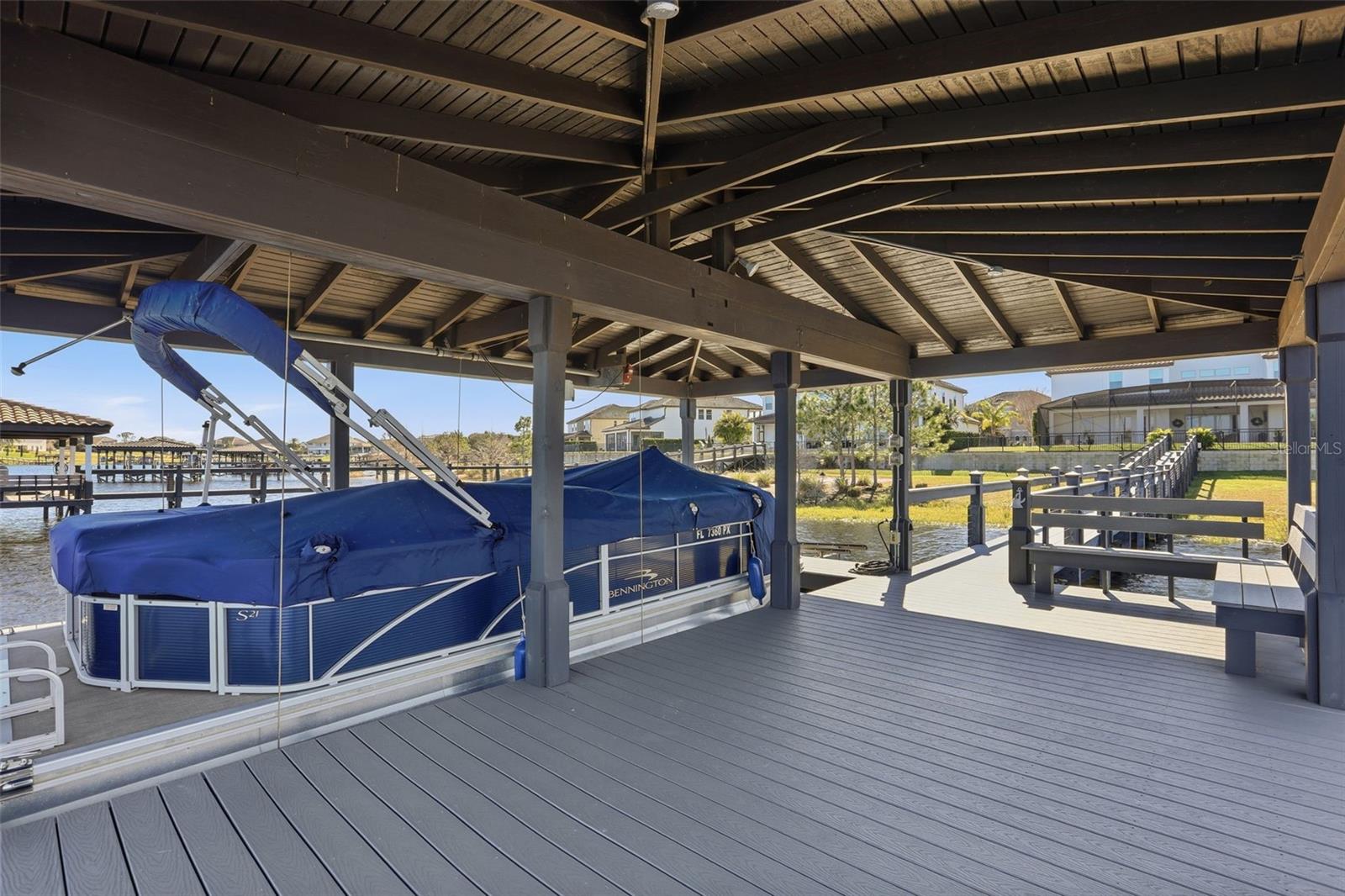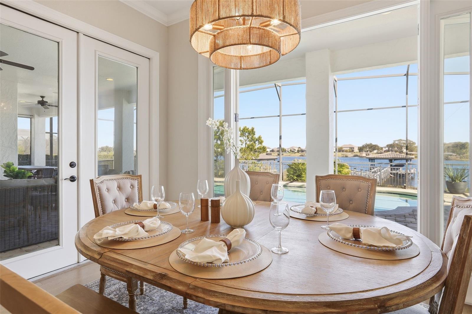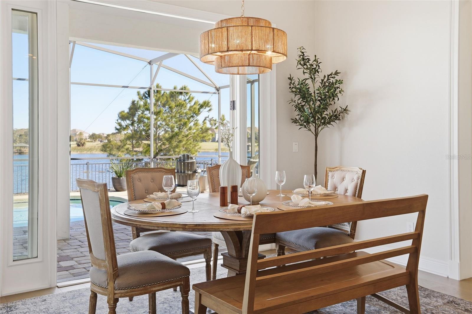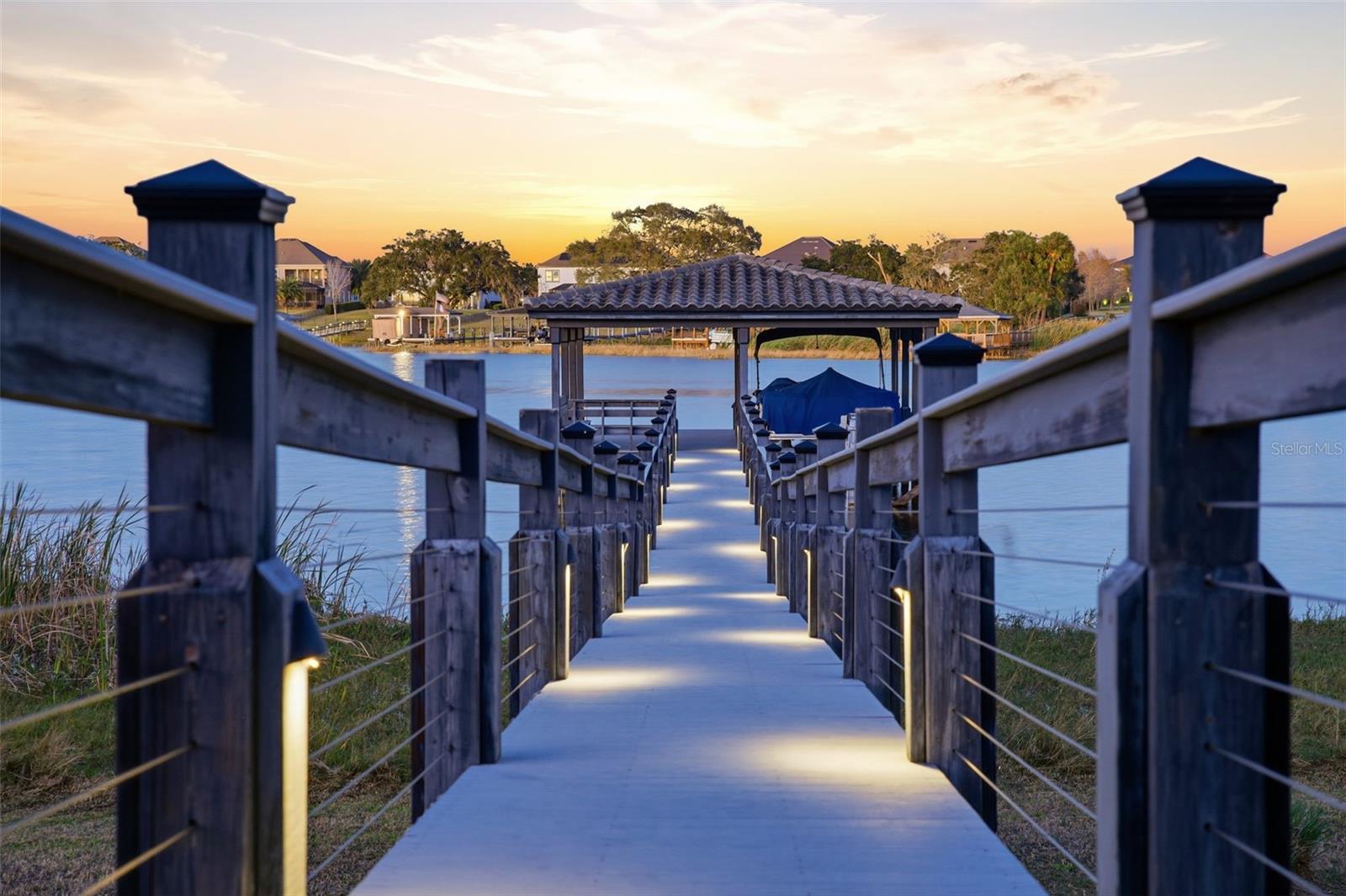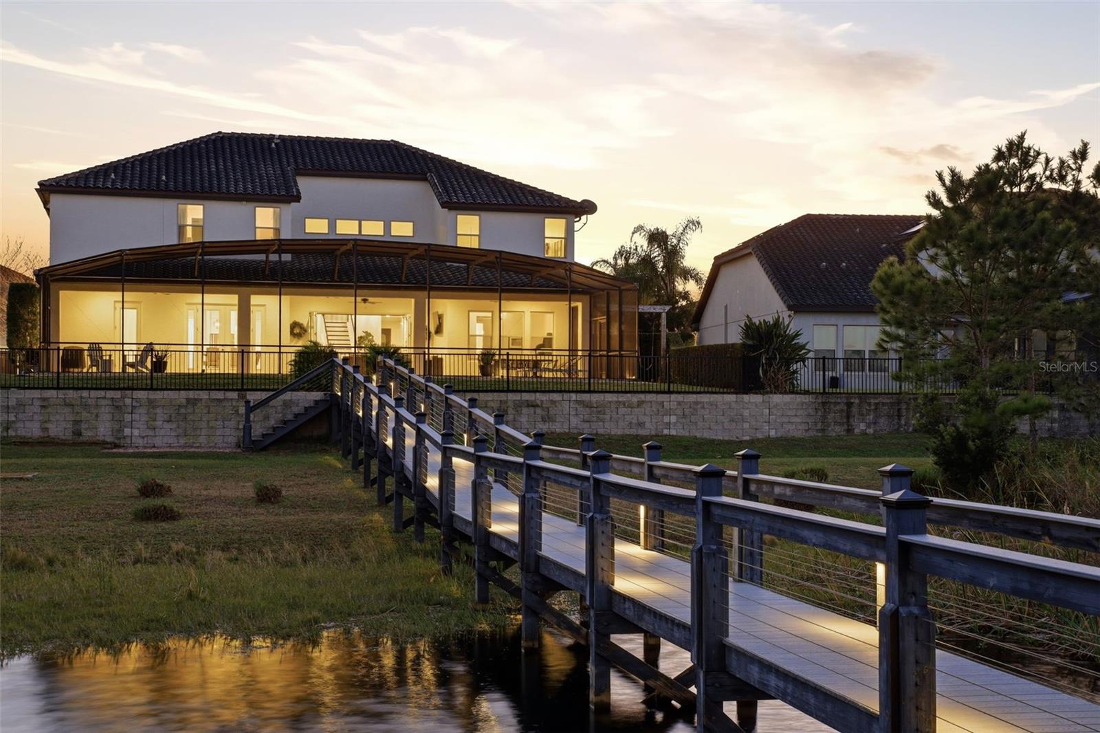 There are homes built to impress—and then there are homes built to be remembered. Set along a peaceful cove on Johns Lake, this lakefront estate offers a lifestyle that feels both refined and effortless. Spanning over 5,100 square feet, the home features seven bedrooms, five-and-a-half baths, and sweeping water views, with spaces thoughtfully designed for everyday living and unforgettable gatherings. Natural light fills the interior, highlighting tailored millwork, warm hardwood flooring, and a striking staircase that makes an immediate architectural statement. The layout flows seamlessly toward the heart of the home, where the lake becomes a constant backdrop. The main living area is both dramatic and inviting, anchored by a sleek electric fireplace and expansive glass doors that open to the outdoors, creating a true indoor-outdoor connection. The kitchen is elevated yet highly functional, centered around a statement island with a porcelain farmhouse sink and quartz countertops. Double-stacked cabinetry, a flat cooktop with pot filler, premium appliances, and generous pantry space support effortless entertaining. Just beyond, an eat-in breakfast area framed by French doors on two sides opens directly to the lanai with views of the pool and lake. A flexible main-level office or den offers versatility for a home office, gym, or additional bedroom, ideal for multigenerational living. The primary suite on the main floor is a private retreat, featuring a separate sitting area overlooking the pool and lake, a spa-inspired bath, and a custom walk-in closet—designed for comfort, flexibility, and quiet relaxation. Upstairs, a spacious loft provides room for media or gathering, surrounded by six additional bedrooms. Two bedrooms feature private baths, while two others share a well-designed Jack-and-Jill bath, offering comfort and privacy for family and guests alike. Outdoors, the lifestyle truly comes alive. A covered and screened lanai overlooks the heated pool and paver terrace, perfect for year-round enjoyment, while the backyard includes an in-ground trampoline seamlessly integrated into the landscape. The experience continues beyond the pool with a thoughtfully designed dock that comes alive at night with ambient lighting. At the end, a boathouse awaits with a covered boat lift, lifts for two jet skis, power, water, and generous deck space—ideal for fishing, entertaining, or simply enjoying sunset views across Johns Lake. Additional highlights include a four-car garage, plantation shutters, security system, dual laundry rooms, and recent interior and exterior updates. Located in the Twinwaters community, residents enjoy a neighborhood pool, playground, and walking trail, just minutes from Winter Garden Village, Historic Downtown Winter Garden, top-rated schools, major highways, and Orlando’s iconic destinations. This is more than a lakefront home—it’s a place where architecture, lifestyle, and water come together beautifully.