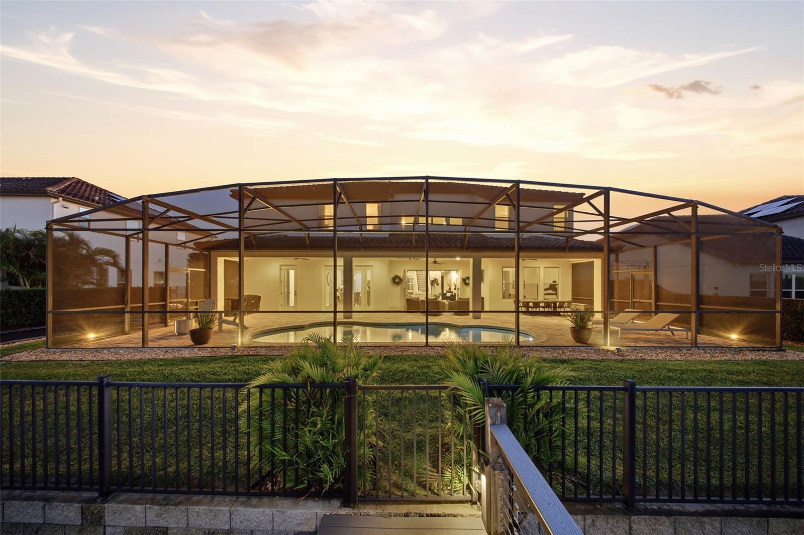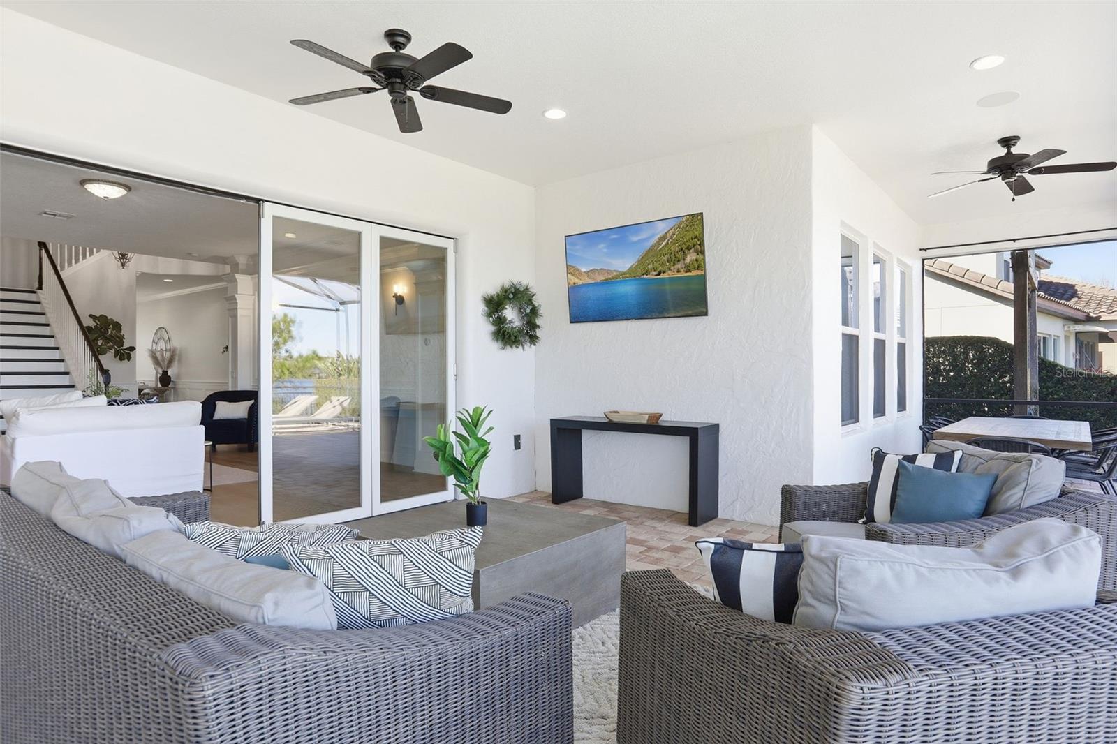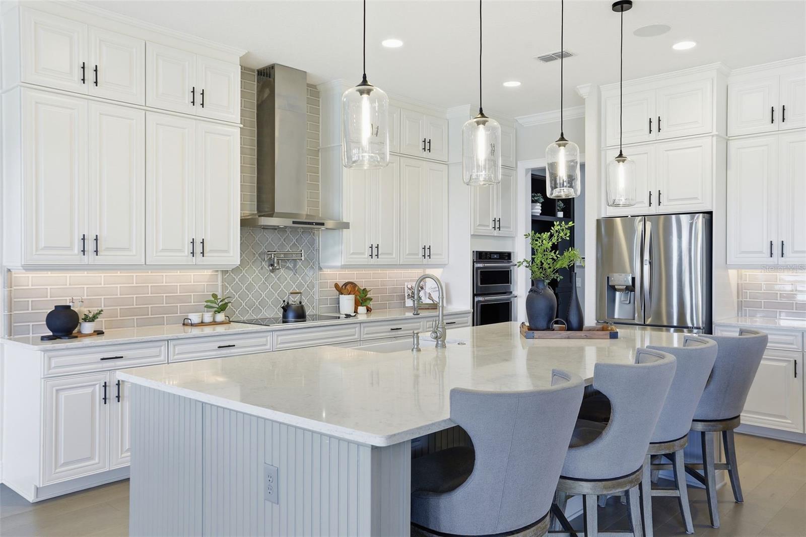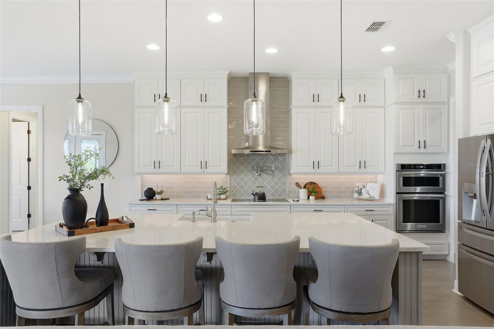 There are homes built to impress—and then there are homes built to be remembered. Set along a peaceful cove on Johns Lake, this lakefront estate offers a lifestyle that feels both refined and effortless. Spanning over 5,100 square feet, the home features seven bedrooms, five-and-a-half baths, and sweeping water views, with spaces thoughtfully designed for everyday living and unforgettable gatherings. Natural light fills the interior, highlighting tailored millwork, warm hardwood flooring, and a striking staircase that makes an immediate architectural statement. The layout flows seamlessly toward the heart of the home, where the lake becomes a constant backdrop. The main living area is both dramatic and inviting, anchored by a sleek electric fireplace and expansive glass doors that open to the outdoors, creating a true indoor-outdoor connection. The kitchen is elevated yet highly functional, centered around a statement island with a porcelain farmhouse sink and quartz countertops. Double-stacked cabinetry, a flat cooktop with pot filler, premium appliances, and generous pantry space support effortless entertaining. Just beyond, an eat-in breakfast area framed by French doors on two sides opens directly to the lanai with views of the pool and lake. A flexible main-level office or den offers versatility for a home office, gym, or additional bedroom, ideal for multigenerational living. The primary suite on the main floor is a private retreat, featuring a separate sitting area overlooking the pool and lake, a spa-inspired bath, and a custom walk-in closet—designed for comfort, flexibility, and quiet relaxation. Upstairs, a spacious loft provides room for media or gathering, surrounded by six additional bedrooms. Two bedrooms feature private baths, while two others share a well-designed Jack-and-Jill bath, offering comfort and privacy for family and guests alike. Outdoors, the lifestyle truly comes alive. A covered and screened lanai overlooks the heated pool and paver terrace, perfect for year-round enjoyment, while the backyard includes an in-ground trampoline seamlessly integrated into the landscape. The experience continues beyond the pool with a thoughtfully designed dock that comes alive at night with ambient lighting. At the end, a boathouse awaits with a covered boat lift, lifts for two jet skis, power, water, and generous deck space—ideal for fishing, entertaining, or simply enjoying sunset views across Johns Lake. Additional highlights include a four-car garage, plantation shutters, security system, dual laundry rooms, and recent interior and exterior updates. Located in the Twinwaters community, residents enjoy a neighborhood pool, playground, and walking trail, just minutes from Winter Garden Village, Historic Downtown Winter Garden, top-rated schools, major highways, and Orlando’s iconic destinations. This is more than a lakefront home—it’s a place where architecture, lifestyle, and water come together beautifully.