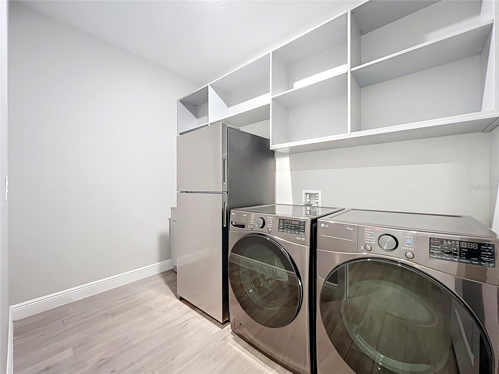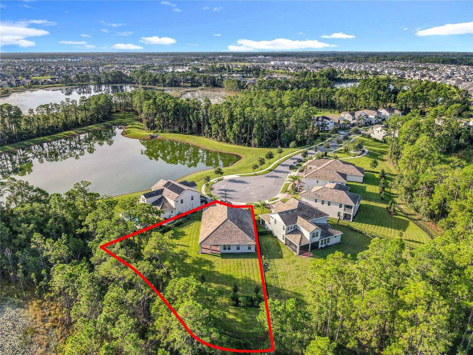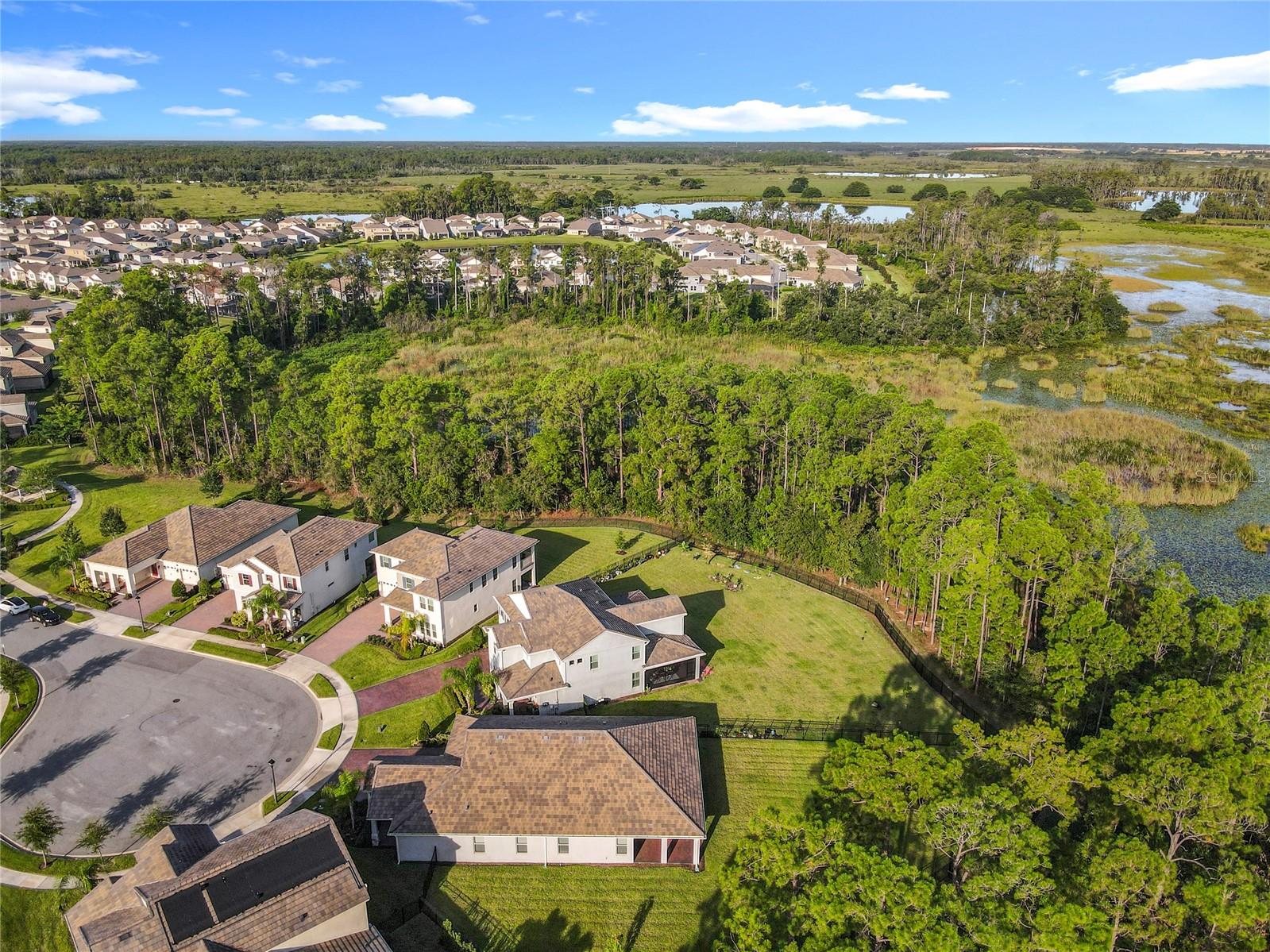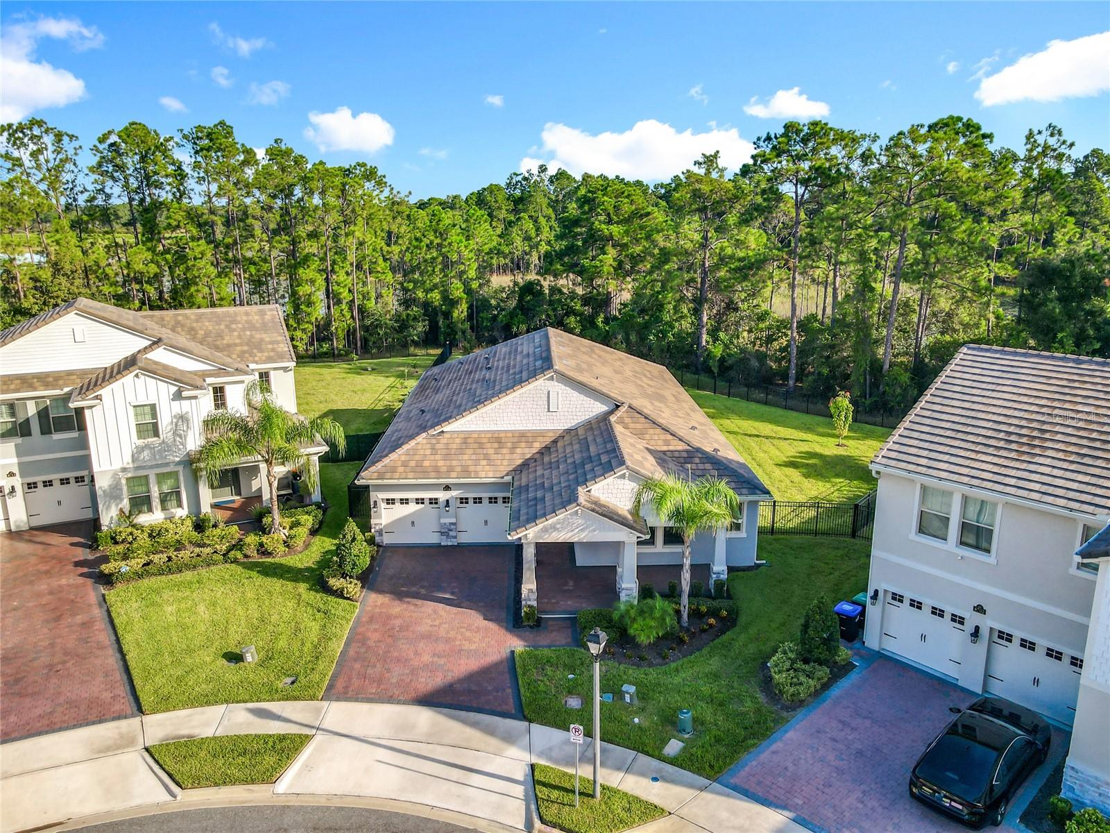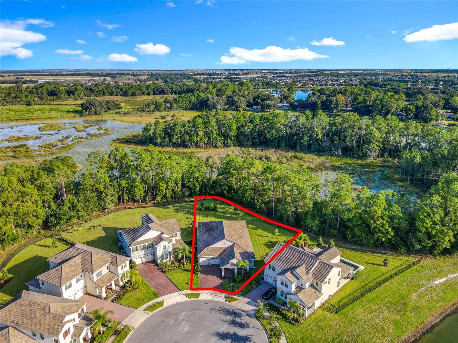 Nestled in Phase 3 of Waterleigh in Horizon West, this stunning single-story home offers 4 bedrooms and 3.5 bathrooms on a premium .41-acre lot with no rear neighbors, providing both privacy and tranquility. Situated on a quiet cul-de-sac, the home features beautiful views and a peaceful setting, just a short stroll from a charming community green space with a pavilion and picnic area. Inside, you’ll find wood-look tile flooring throughout the main living areas, and bedrooms with new engineered wood flooring recently added. The spacious master suite boasts a large walk-in closet, dual vanities, a soaking tub, and a glass-enclosed shower. A second bedroom at the front of the home offers its own private bathroom and walk-in closet, ideal for guests or multigenerational living. The chef’s kitchen features sleek quartz countertops, stainless steel appliances, and a functional layout perfect for entertaining. The laundry room has been upgraded with a new washer, dryer, refrigerator, sink, and added shelving for extra storage. Additional highlights include a 3-car garage with new epoxy flooring and Tesla EV charger outlet, recently sealed driveway and lanai, and newly installed rain gutters. Enjoy low-maintenance living with lawn and shrub care included in the HOA. Waterleigh offers a wide range of resort-style amenities, including three pools, fitness centers, community clubhouses, mini golf, dog parks, and scenic walking trails. Conveniently located near Publix and just a short drive to many restaurants and Disney World. This home combines luxury, comfort, and convenience.