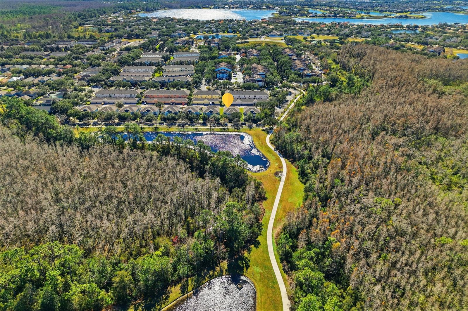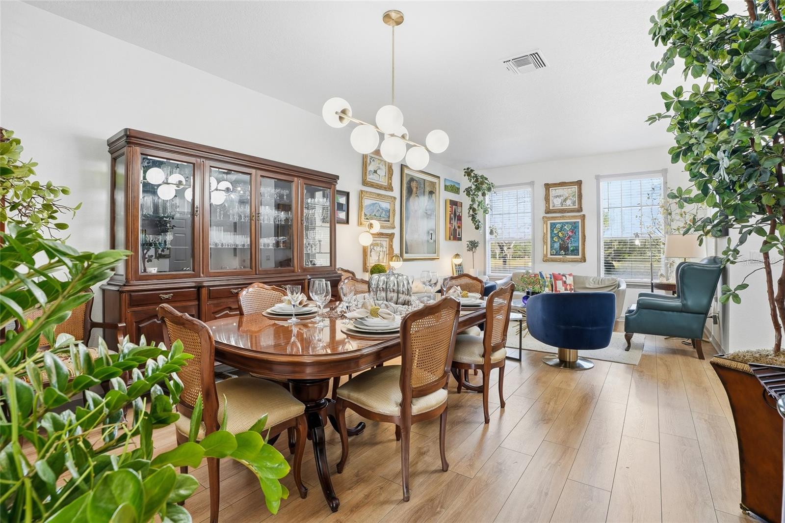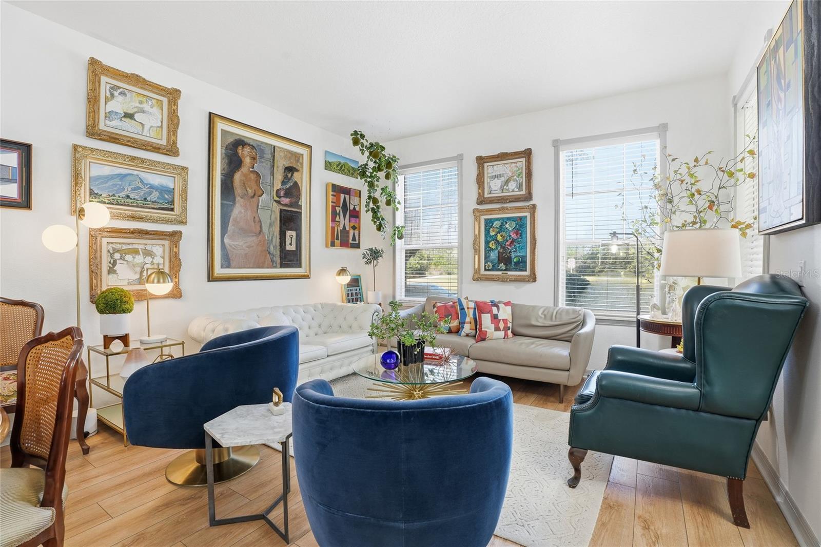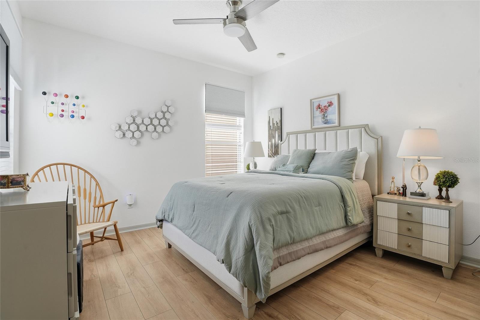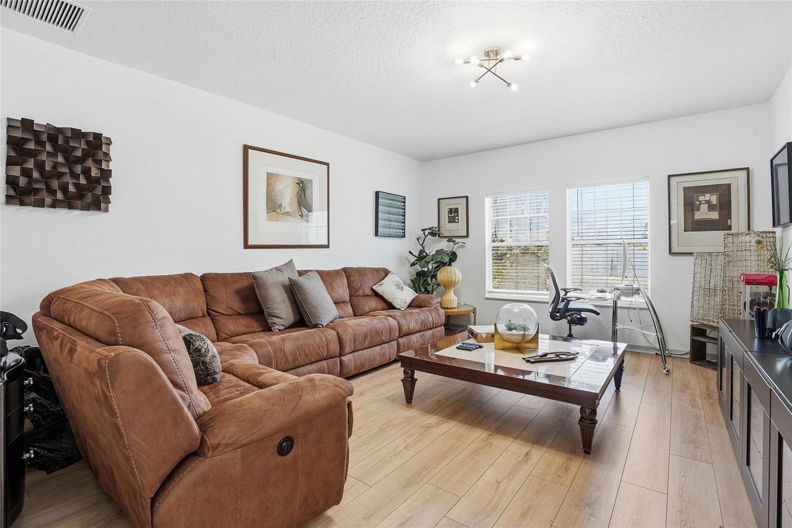 This townhome is located in a highly desirable community offering exceptional amenities and long-term value. Featuring 4 bedrooms and 3 full bathrooms, this beautifully upgraded residence stands out with a spacious first-floor bedroom and full bath, providing convenience, accessibility, and privacy ideal for guests, multigenerational living, or those who prefer to avoid stairs. From the moment you arrive, the charming front porch invites you to relax and enjoy peaceful water views. Inside, a spacious formal living and dining room combination showcases elegant wall moldings and refined window trim, creating a warm and beautiful atmosphere. Waterproof luxury laminate flooring flows throughout the home, offering both durability and style. The first-floor bathroom has been fully remodeled with a walk-in shower featuring a rain shower head, marble-look tile walls, glass enclosure, modern lighting, new toilet, and tile flooring. The open layout continues into the gourmet kitchen, equipped with high-end stainless steel appliances, a newer three-door refrigerator, granite countertops, updated lighting, ample cabinetry, and a convenient under-stair storage area. The kitchen also provides space for casual dining, perfect for everyday living. A modern laundry room nearby includes LG stainless steel washer and dryer with pedestal bases designed for added comfort and ease of use. The staircase makes a striking impression with elegant wood steps and a matching handrail, leading to the second level where French doors open to a generously sized primary suite filled with natural light. The spa-inspired primary bathroom features a walk-in shower, separate soaking tub, and abundant space. Two additional bedrooms and a full bathroom complete the upper floor. Recent updates include fresh interior paint and a new roof installed in 2024. The rear-entry two-car garage is complemented by a patio area that can easily be fenced to create added privacy or a secure outdoor space for you or your furry friends. The well-managed HOA includes cable, high-speed internet, ground maintenance, with exterior painting of the townhomes scheduled soon. Residents enjoy an active, welcoming community with walking trails, a swimming pool, fitness center, and park, Ideally located near top-rated schools, shopping, dining, theme parks, and major attractions, this property offers an exceptional opportunity to own or invest in a location that continues to grow in demand. This home must be seen to be fully appreciated. Schedule your private showing today and take the next step toward securing a property that truly delivers on comfort, lifestyle, and value.