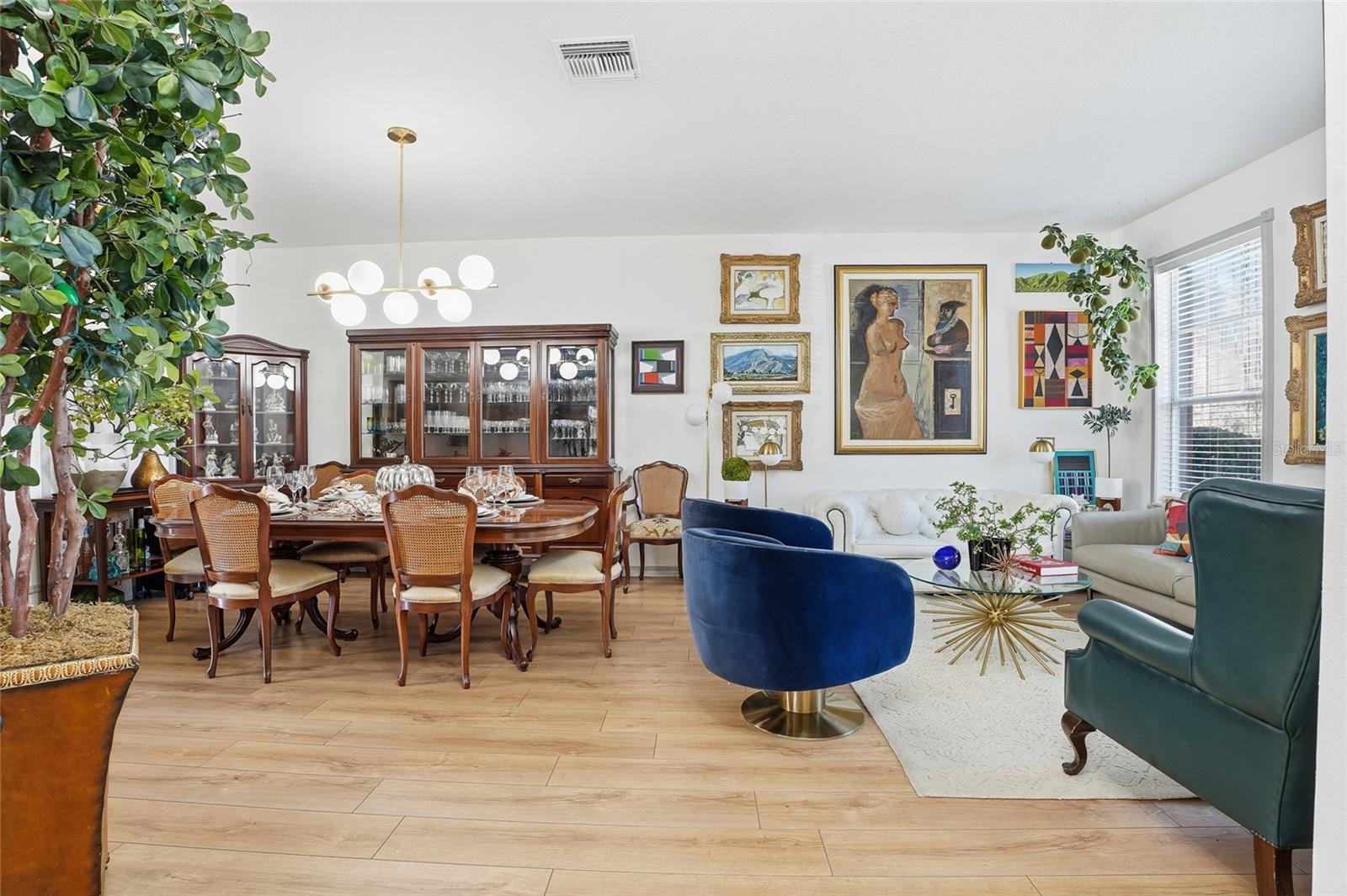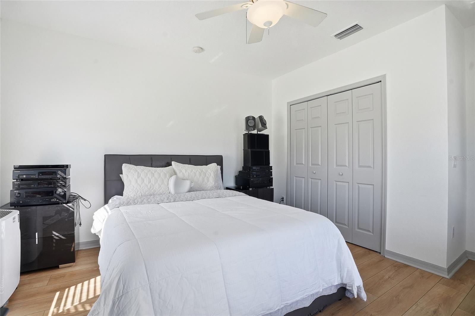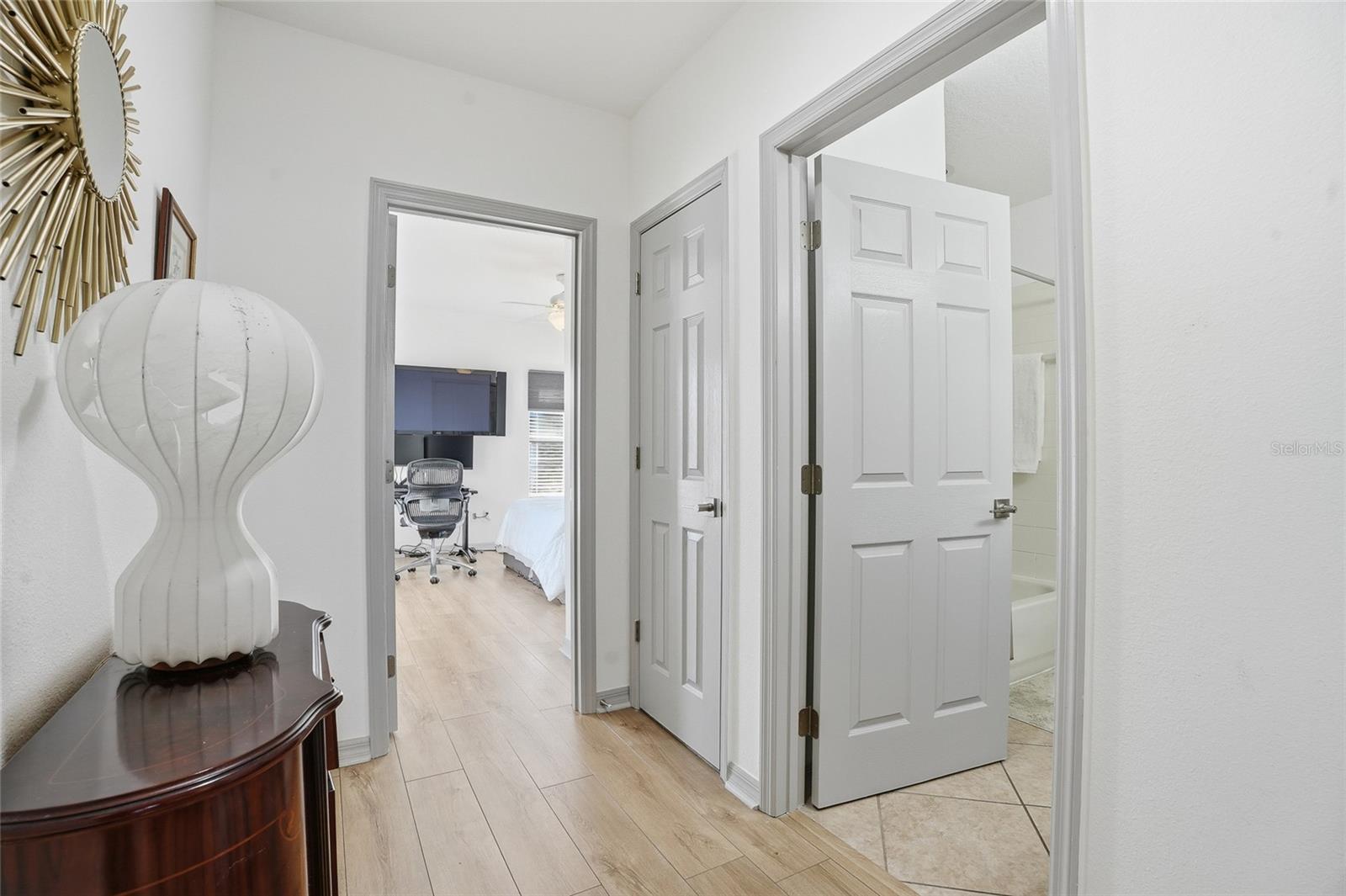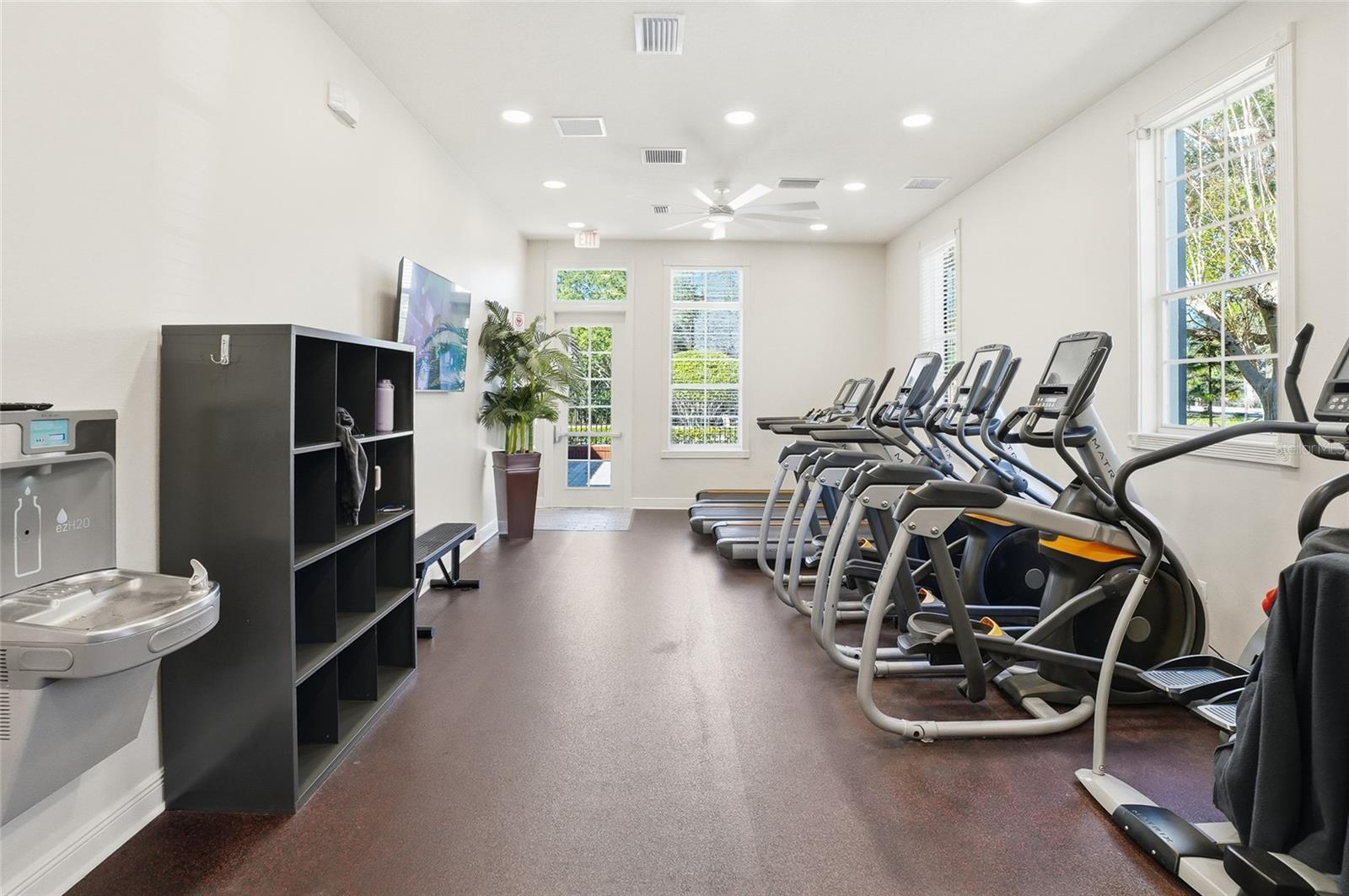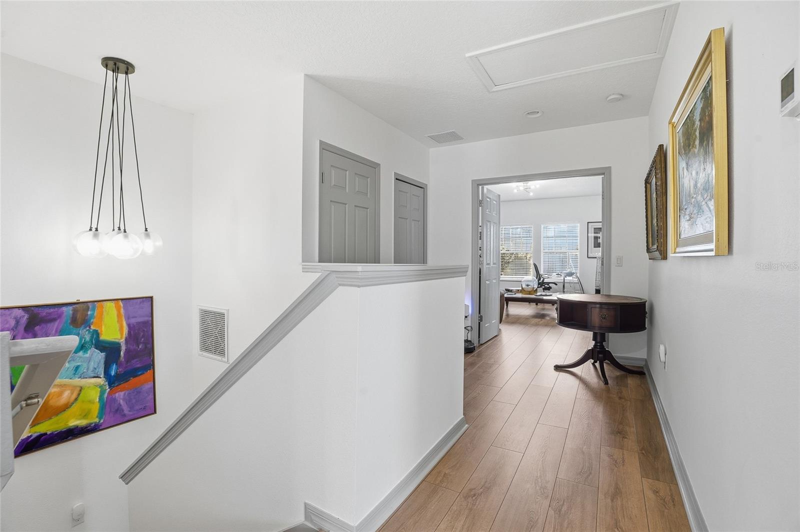 This townhome is located in a highly desirable community offering exceptional amenities and long-term value. Featuring 4 bedrooms and 3 full bathrooms, this beautifully upgraded residence stands out with a spacious first-floor bedroom and full bath, providing convenience, accessibility, and privacy ideal for guests, multigenerational living, or those who prefer to avoid stairs. From the moment you arrive, the charming front porch invites you to relax and enjoy peaceful water views. Inside, a spacious formal living and dining room combination showcases elegant wall moldings and refined window trim, creating a warm and beautiful atmosphere. Waterproof luxury laminate flooring flows throughout the home, offering both durability and style. The first-floor bathroom has been fully remodeled with a walk-in shower featuring a rain shower head, marble-look tile walls, glass enclosure, modern lighting, new toilet, and tile flooring. The open layout continues into the gourmet kitchen, equipped with high-end stainless steel appliances, a newer three-door refrigerator, granite countertops, updated lighting, ample cabinetry, and a convenient under-stair storage area. The kitchen also provides space for casual dining, perfect for everyday living. A modern laundry room nearby includes LG stainless steel washer and dryer with pedestal bases designed for added comfort and ease of use. The staircase makes a striking impression with elegant wood steps and a matching handrail, leading to the second level where French doors open to a generously sized primary suite filled with natural light. The spa-inspired primary bathroom features a walk-in shower, separate soaking tub, and abundant space. Two additional bedrooms and a full bathroom complete the upper floor. Recent updates include fresh interior paint and a new roof installed in 2024. The rear-entry two-car garage is complemented by a patio area that can easily be fenced to create added privacy or a secure outdoor space for you or your furry friends. The well-managed HOA includes cable, high-speed internet, ground maintenance, with exterior painting of the townhomes scheduled soon. Residents enjoy an active, welcoming community with walking trails, a swimming pool, fitness center, and park, Ideally located near top-rated schools, shopping, dining, theme parks, and major attractions, this property offers an exceptional opportunity to own or invest in a location that continues to grow in demand. This home must be seen to be fully appreciated. Schedule your private showing today and take the next step toward securing a property that truly delivers on comfort, lifestyle, and value.