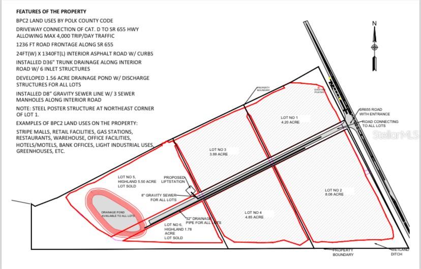 Introducing an exceptional opportunity for developers and investors in Polk County! This prime HIGHLAND PROPERTY is strategically located with 1236 ft. of road frontage along SR 655, offering a total of over 20 acres of vast potential. Boasting a BPC2 land use designation, the property allows for a variety of lucrative development options, including retail facilities, restaurants, hotels, gas station, light industrial and more. Featuring essential infrastructure such as a 24ft x 1340ft interior asphalt road, a 1.56-acre drainage pond, and a gravity sewer line, this property is ready for your vision to become a reality. With a central road connecting all lots and proximity to major traffic arteries like SR 655, the property ensures high visibility and accessibility for businesses. Invest in the future of Polk County today! Owner is in process of re-platting into four lots and bringing utilities to the lots. Lot 1 approx. 4.2 acres at $1,680,000 Lot 2 approx. 8.08 acres at $3,200,000 Lot 3 approx. 3.99 acres at $1,400,000 Lot 4 approx. 4.85 acres at $1,690,000.