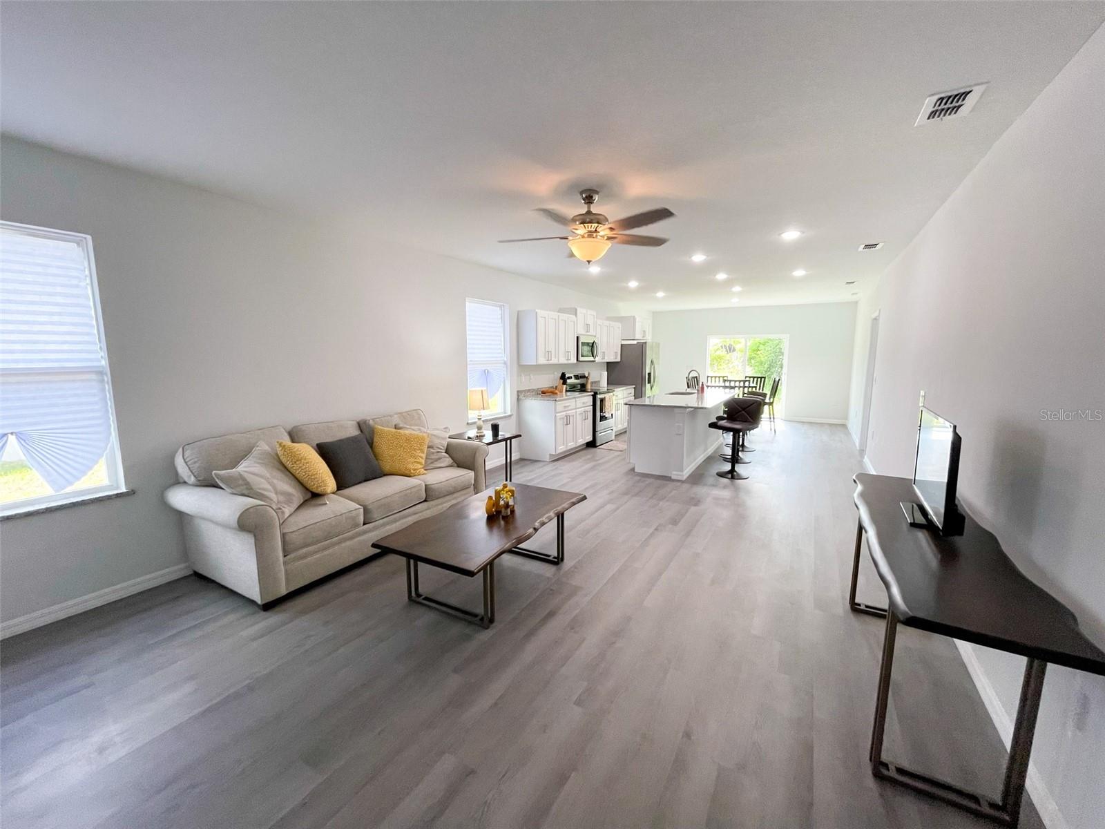 Your Dream Home Awaits in Lakeside Paradise! Move-in ready and brimming with upgrades, this brand new 3-bedroom, 2-bathroom home is your launching pad to lakeside living! This open-concept oasis includes a spacious living room, dining room, and kitchen that provides the perfect space for entertaining. Stainless steel appliances and granite countertops grace the gourmet kitchen.Soft-close cabinets and drawers add a touch of luxury. Luxury vinyl plank flooring throughout the main living areas provides easy maintenance and a cohesive look. Upgraded lighting creates a bright and inviting atmosphere including ceiling fans in each room to ensure year-round comfort. Relax in your master bedroom featuring a walk-in closet and a private en suite bathroom. Enjoy breathtaking views of Lake Conine, part of a stunning Chain of Lakes along with a canal view in your own backyard. Quiet cul-de-sac location offers peace and privacy. No HOA! Community provides a large public fishing pier just a short stroll away, perfect for casting a line or just enjoying the cool lake breeze. Prime location near shopping, hospitals, restaurants, and more! Includes 2-10 Home Buyers Warranty. Don't miss this opportunity to own a piece of paradise! Contact us today for a showing.