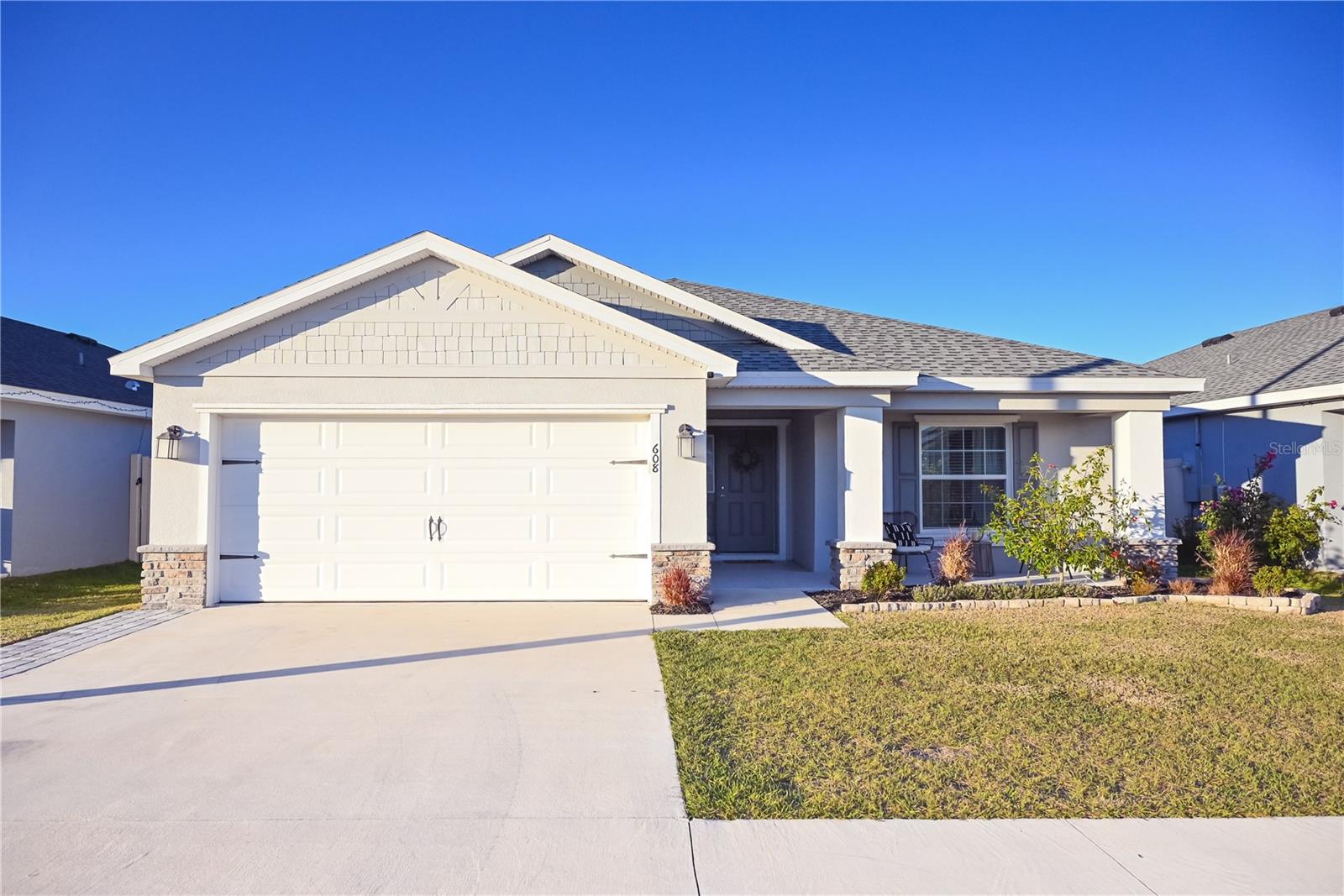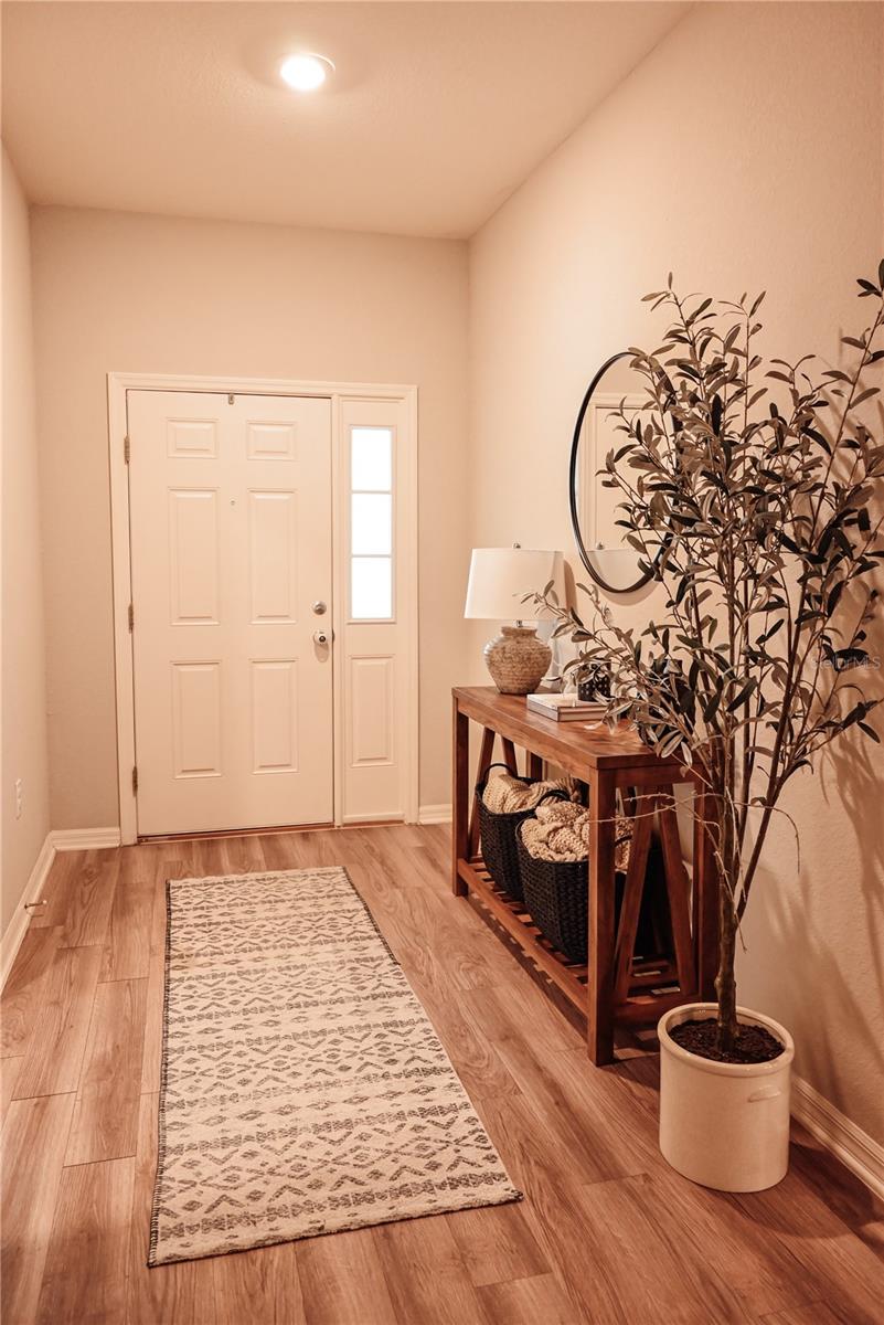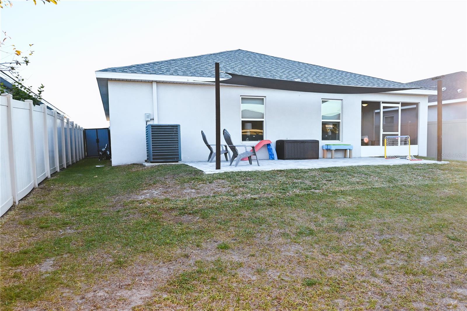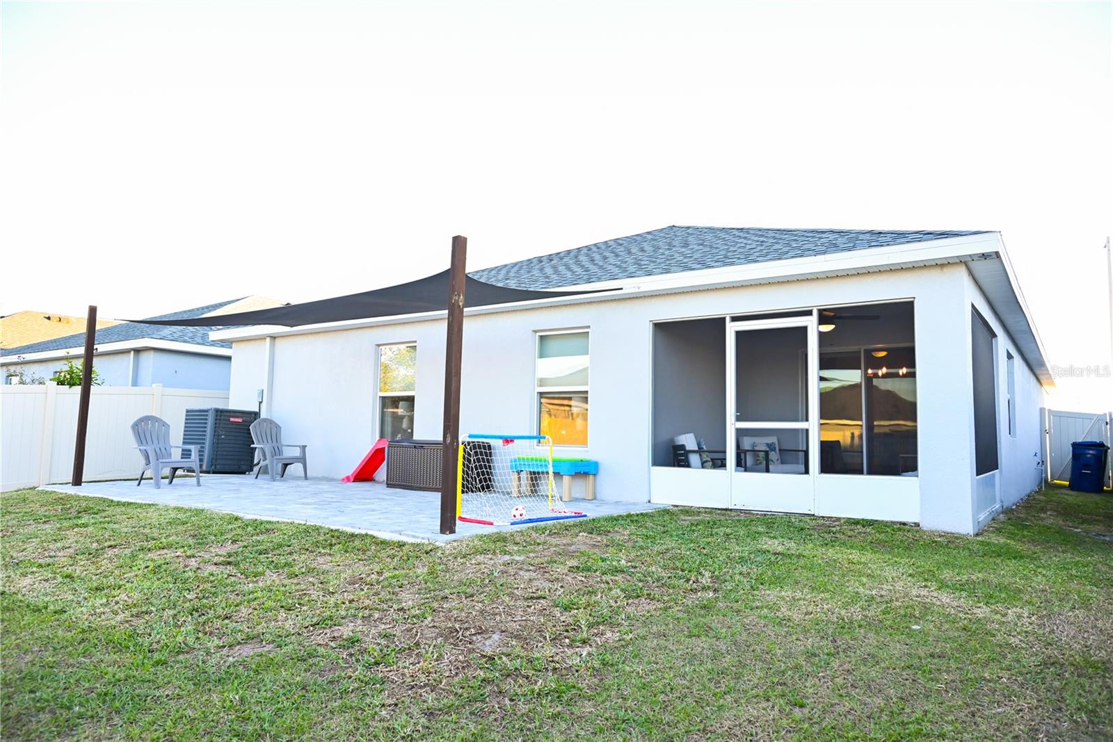 Why Wait to Build? Your Almost-New Dream Home is Ready! Step into this stunning 4-bedroom home that’s practically brand new and packed with features! Designed with an open floor plan and cathedral and tray ceilings, this home feels spacious, airy, and full of light. Gorgeous laminate flooring flows throughout, adding a touch of modern elegance. The kitchen is a showstopper with wood cabinets, a super-large island perfect for entertaining, and a walk-in pantry for all your storage needs. Ceiling fans throughout the home keep every room cool and comfortable. The expansive master suite features a luxurious bathroom, a large walk-in closet, and plenty of space to unwind. Convenience meets style with an inside laundry room equipped with a built-in desk and a large garage with attic storage. Outdoor living is a dream here, thanks to a screened lanai, a spacious patio with a sunshade, and a large backyard complete with new vinyl privacy fencing. Blinds are installed throughout the home, making it move-in ready. Located close to shopping and offering an easy commute to Orlando and Tampa, this home truly has it all. Why wait? Schedule your showing today and make this gorgeous home yours!